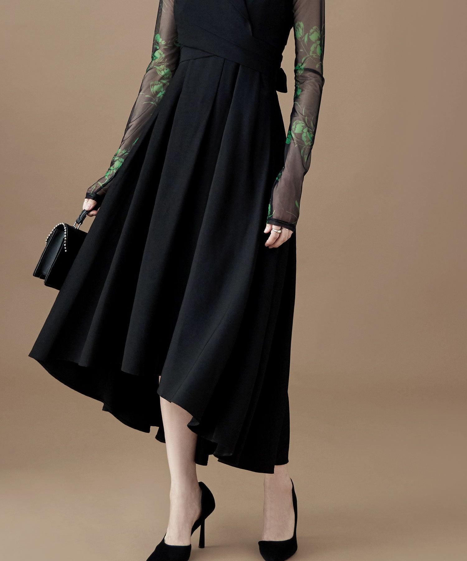 女性らしい長くゆったりとしたフレアスカートをフラットなままにせず前後差を。