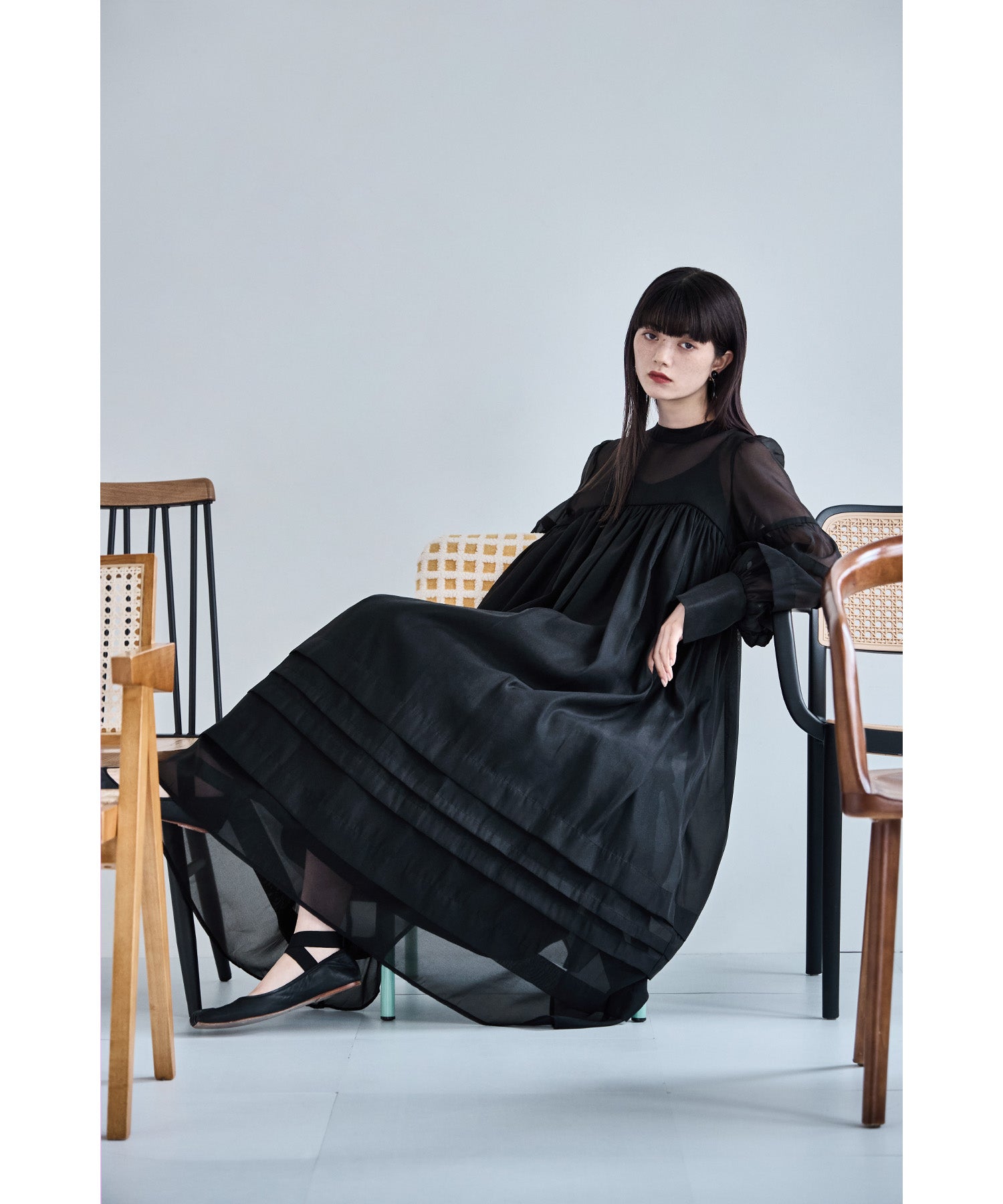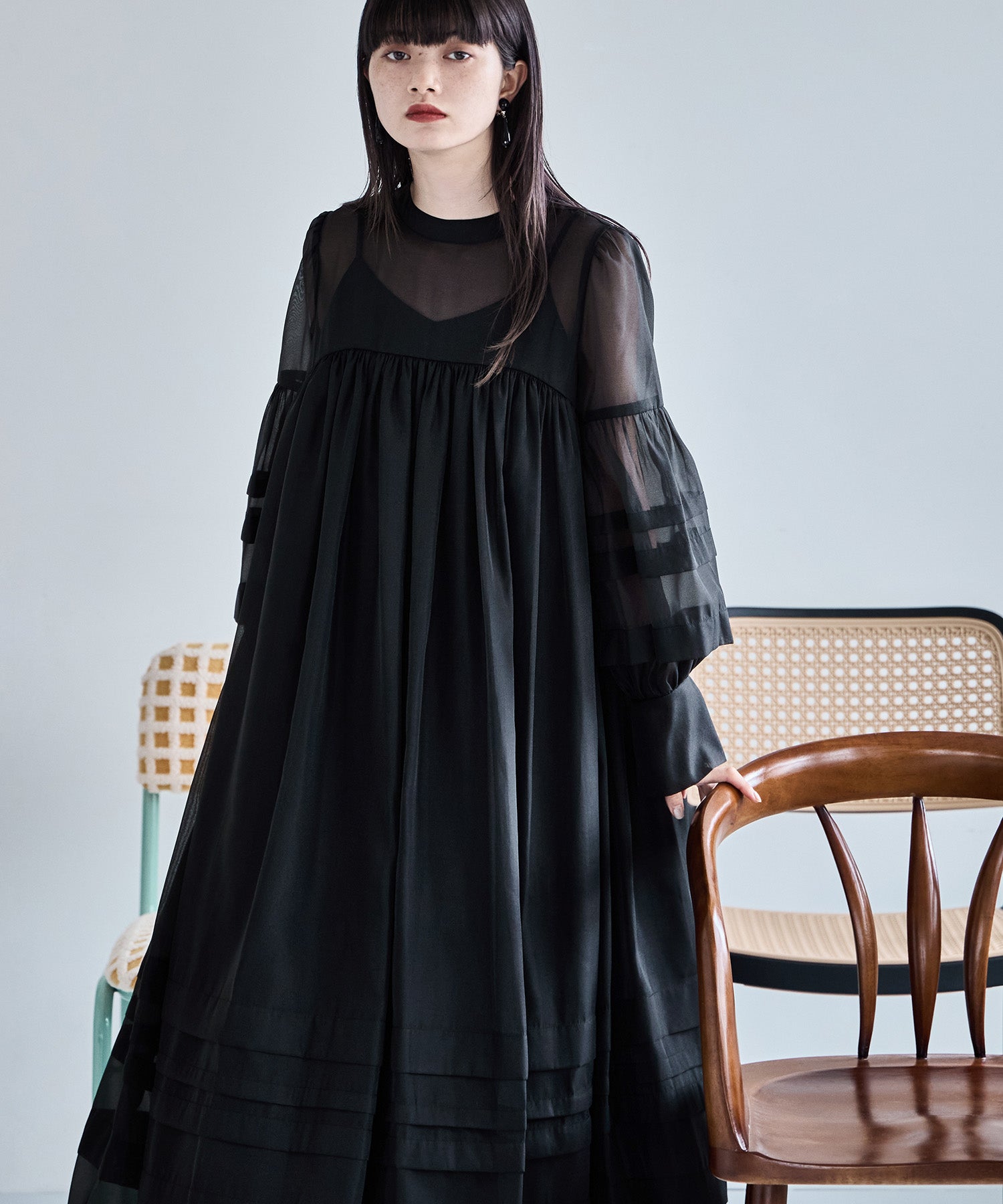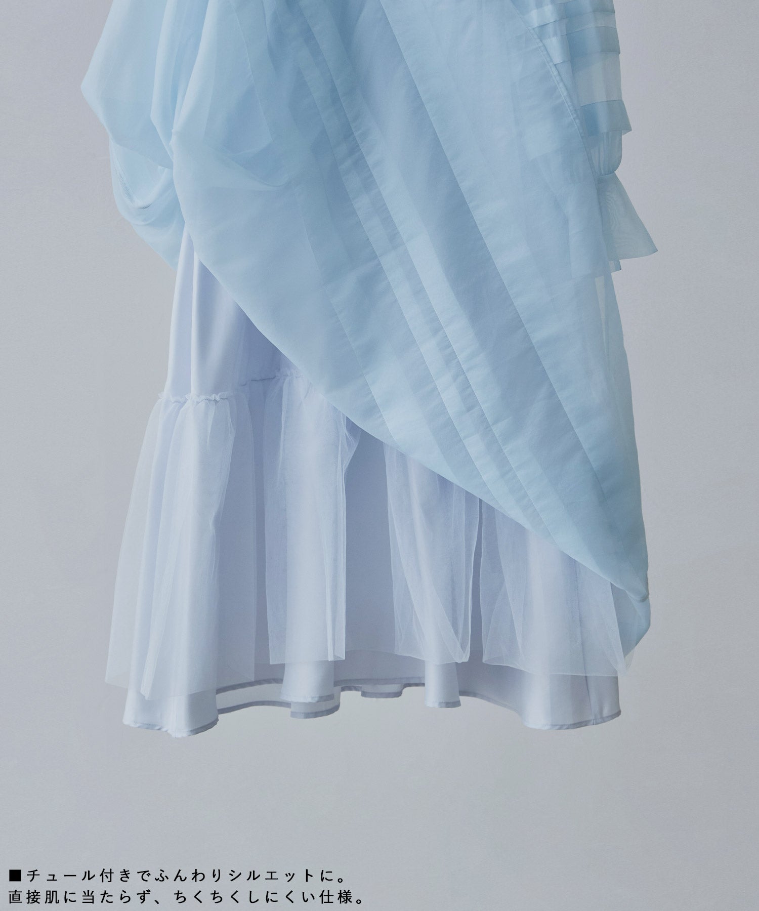 透明感のあるシフォン生地でボリュームたっぷりに仕立てたオケージョンドレス。