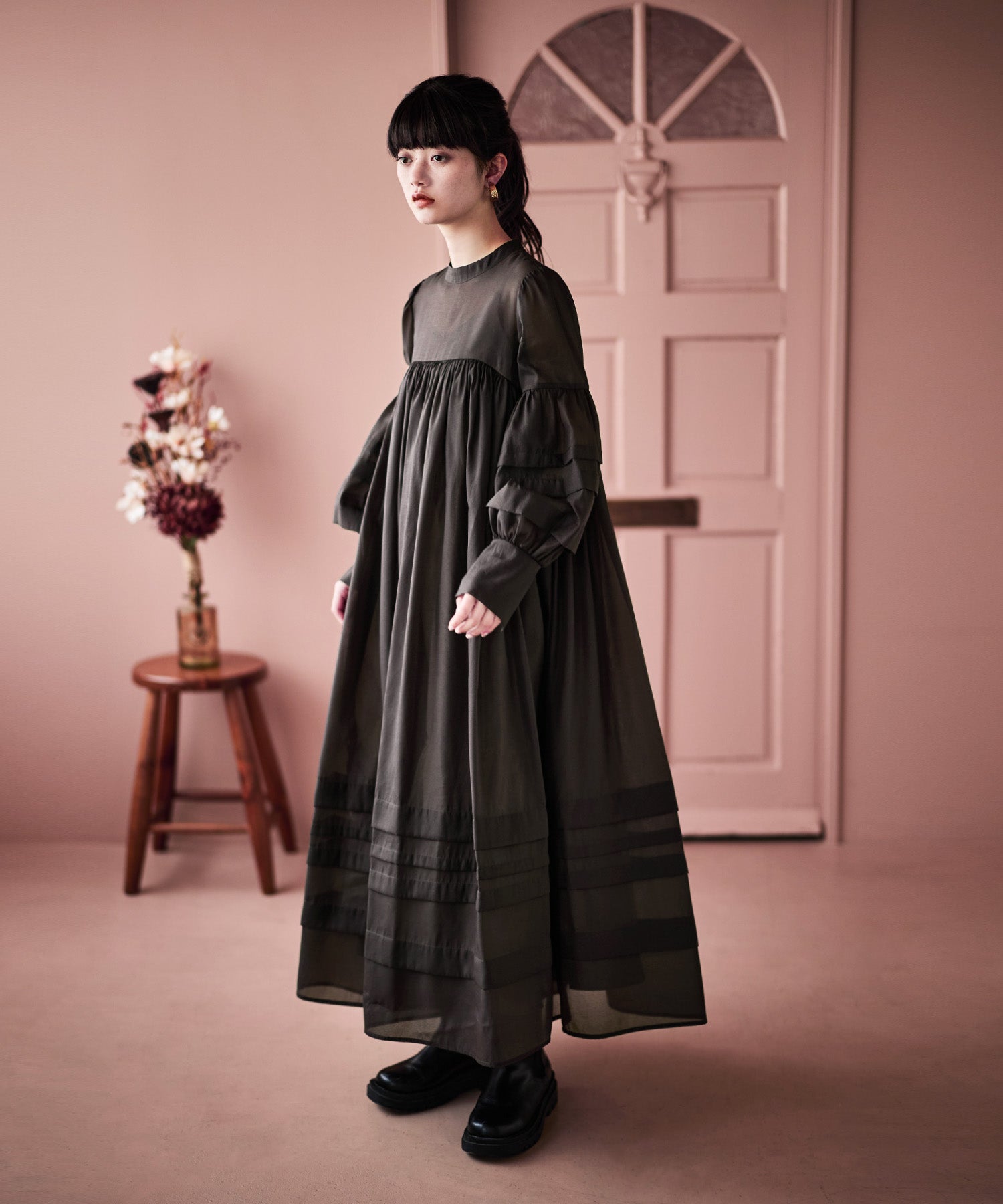胸もとのギャザーから広がる美しいAラインのシルエット。