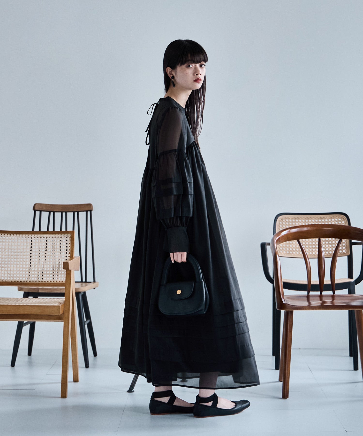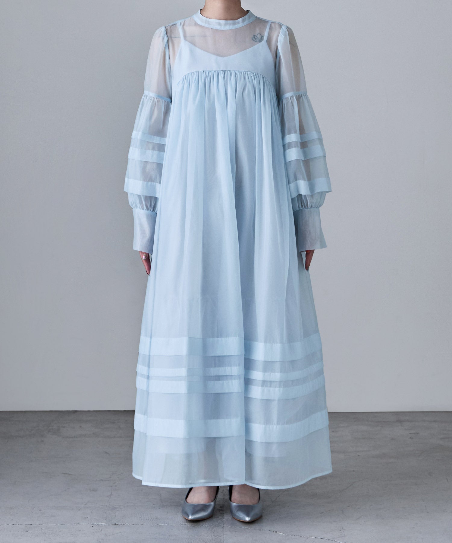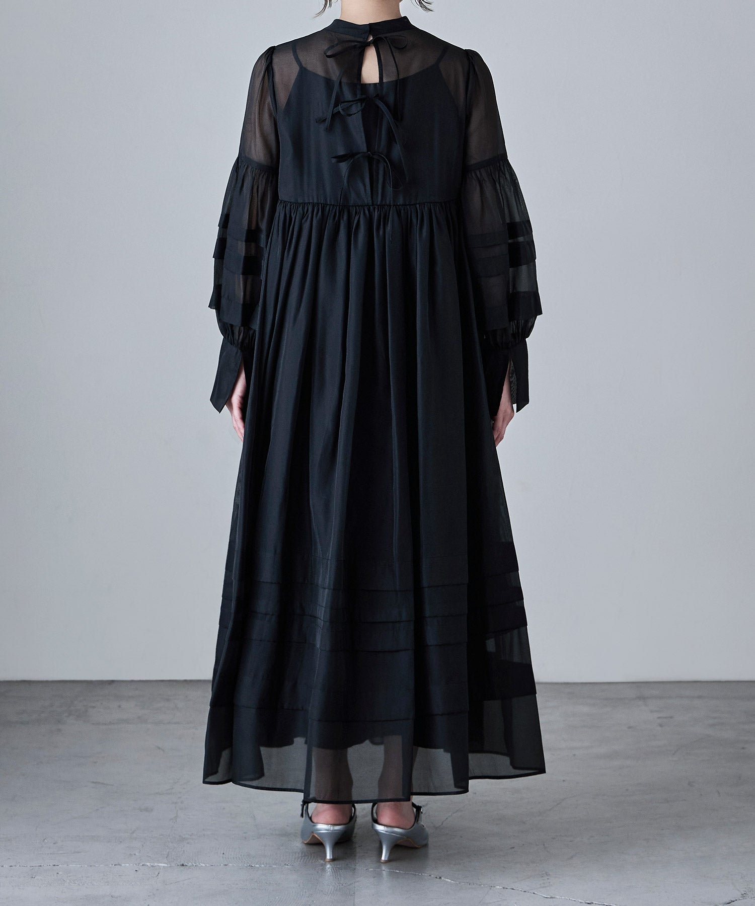 Rname ベビーコアシアーボリュームドレス ワンピース ワンピ ドレス 長袖 ロング オケワンピ ボリュームワンピ シフォン シアー ハイネック スタンドカラー バックリボン Aライン ビッグシルエット ゆったり 結婚式 二次会 パーティー マタニティー オケージョン カジュアル