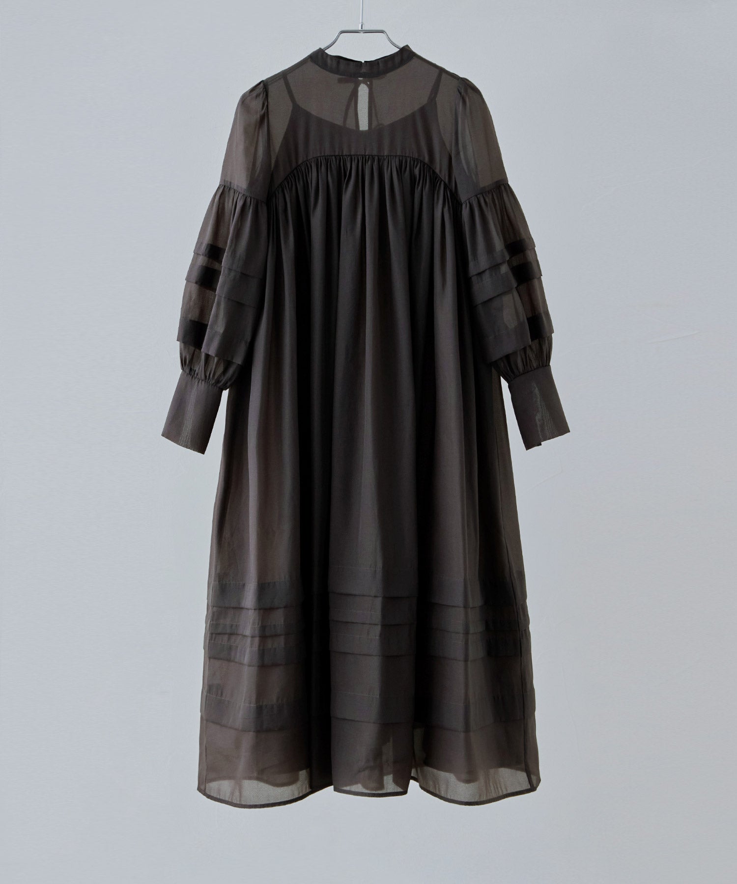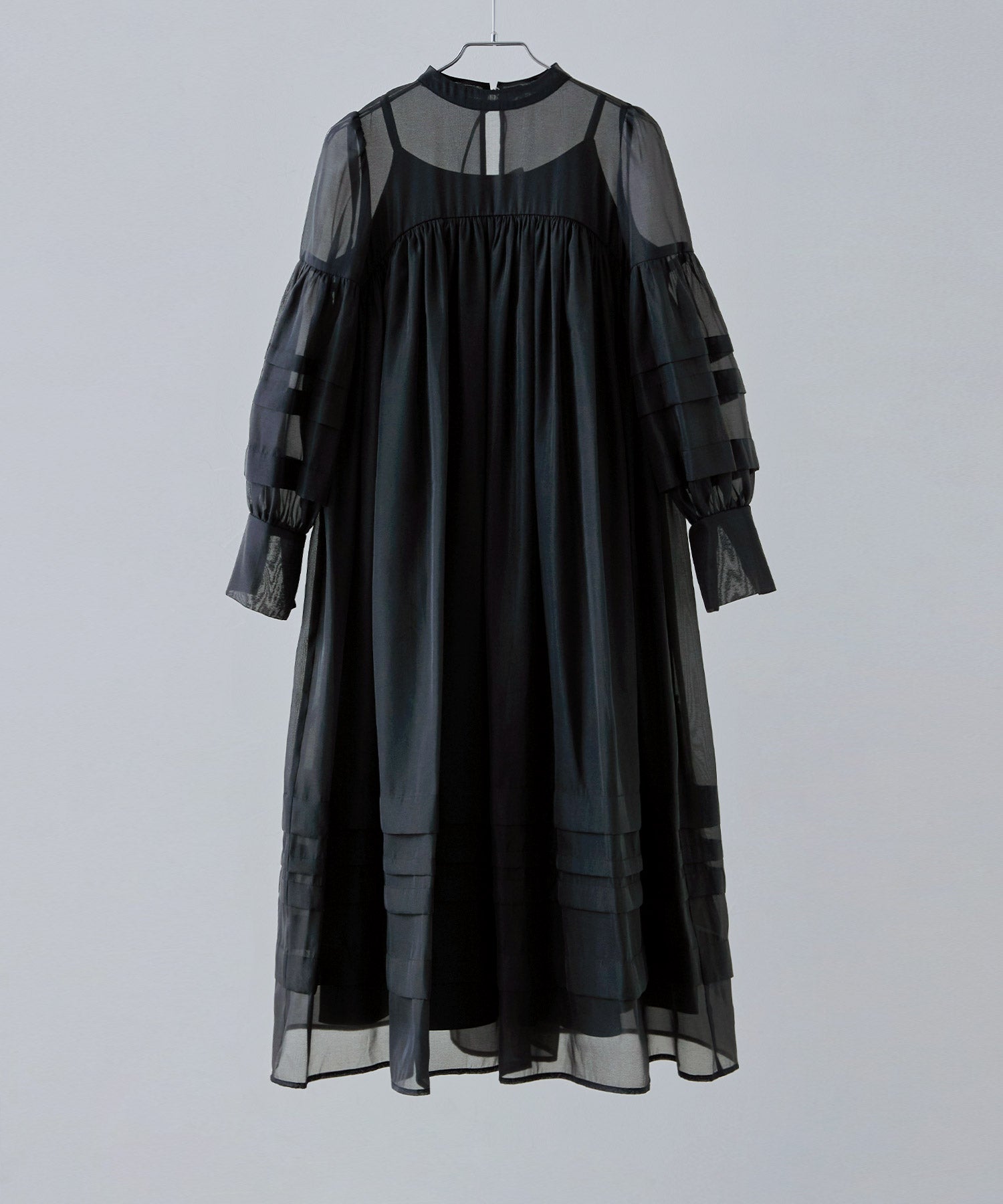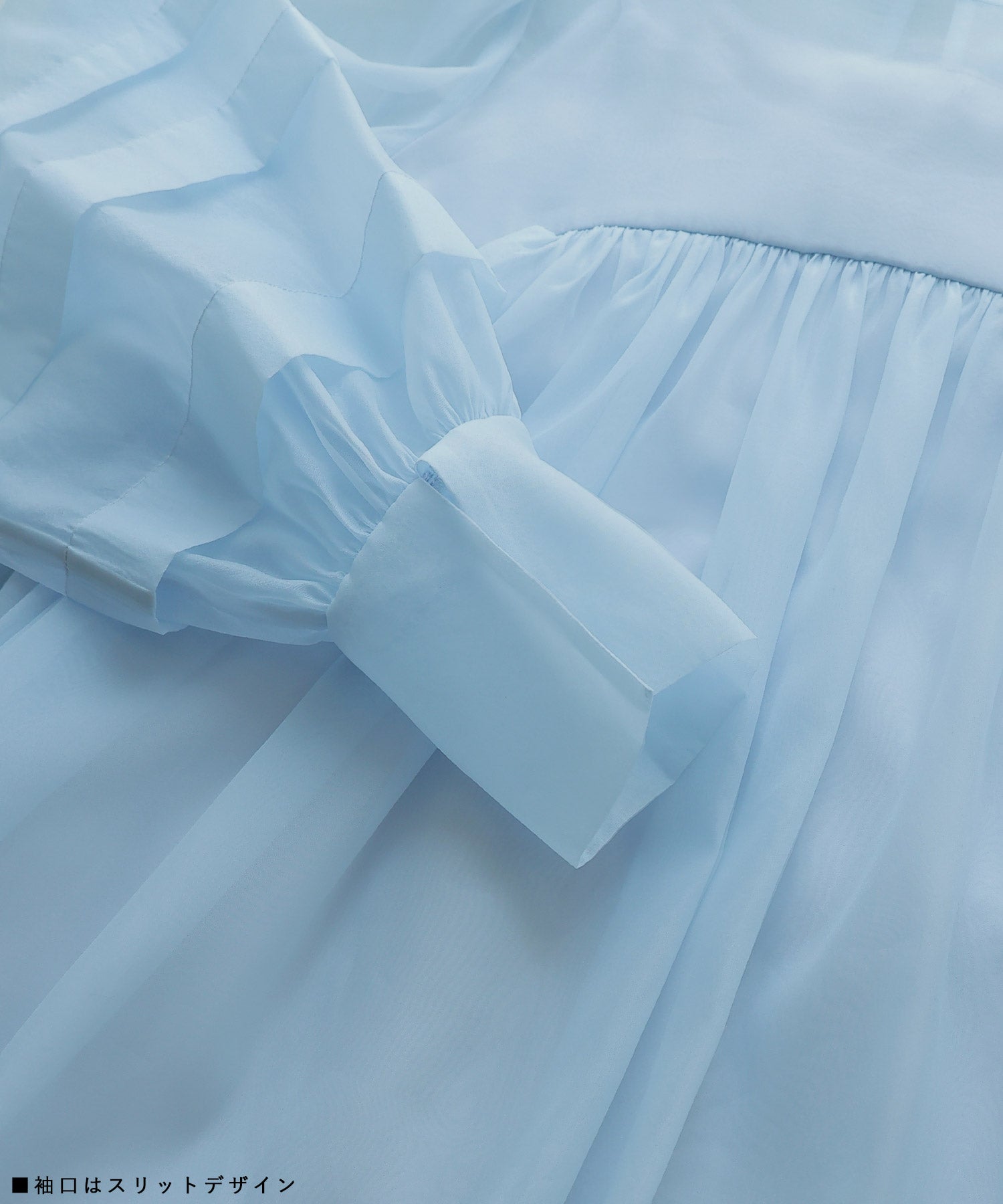 袖や裾には、シアー生地を重ねることで生まれるラインデザインを。