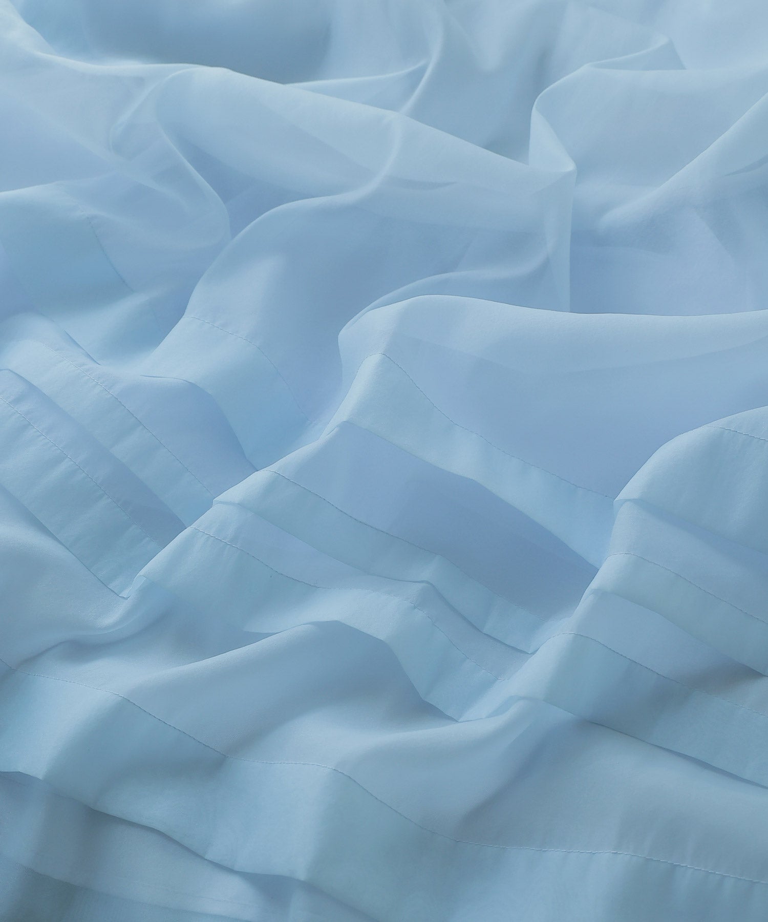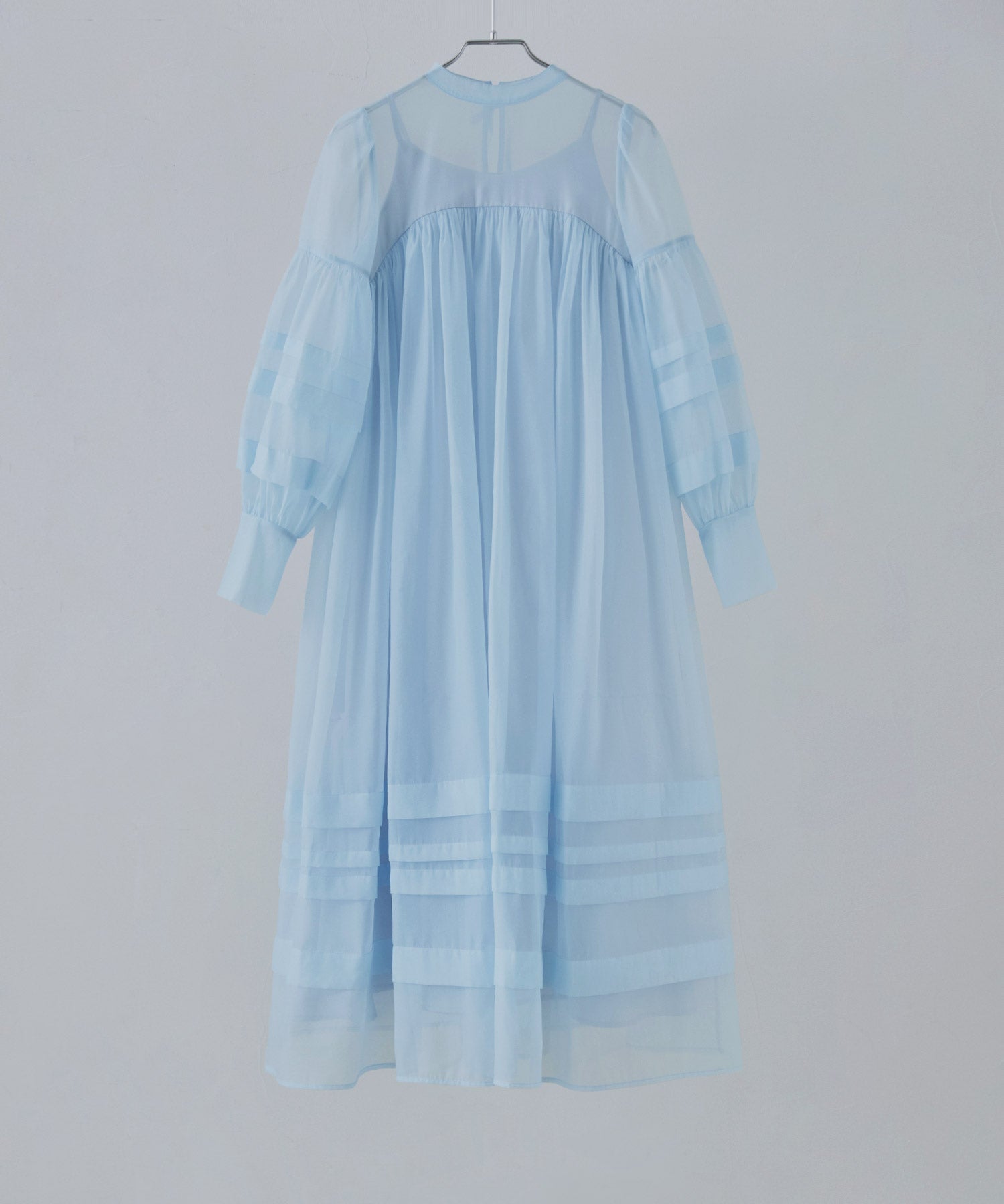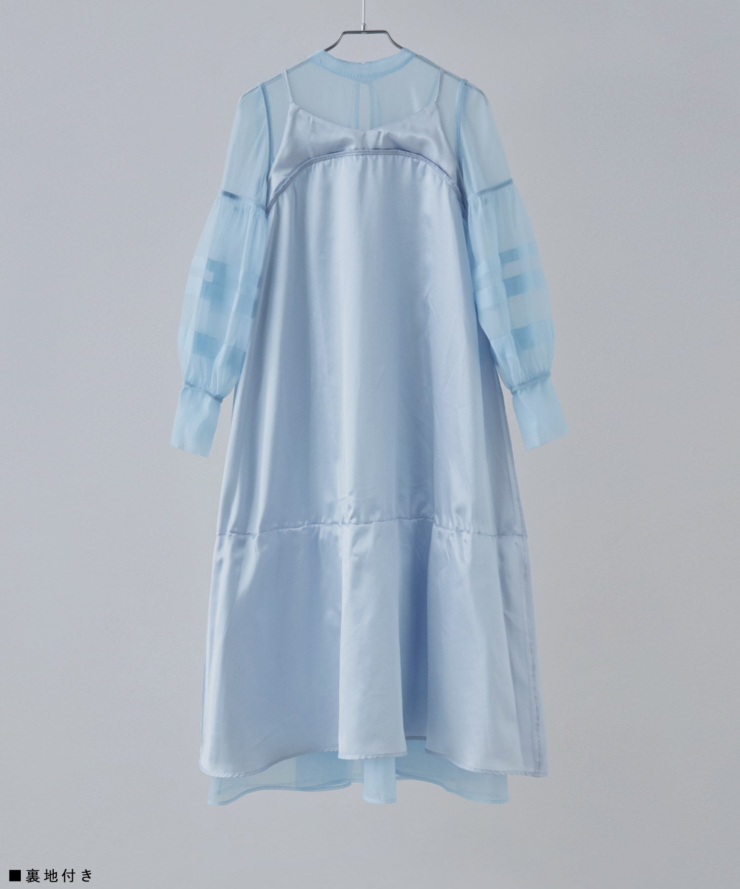 袖や裾には、シアー生地を重ねることで生まれるラインデザインを。