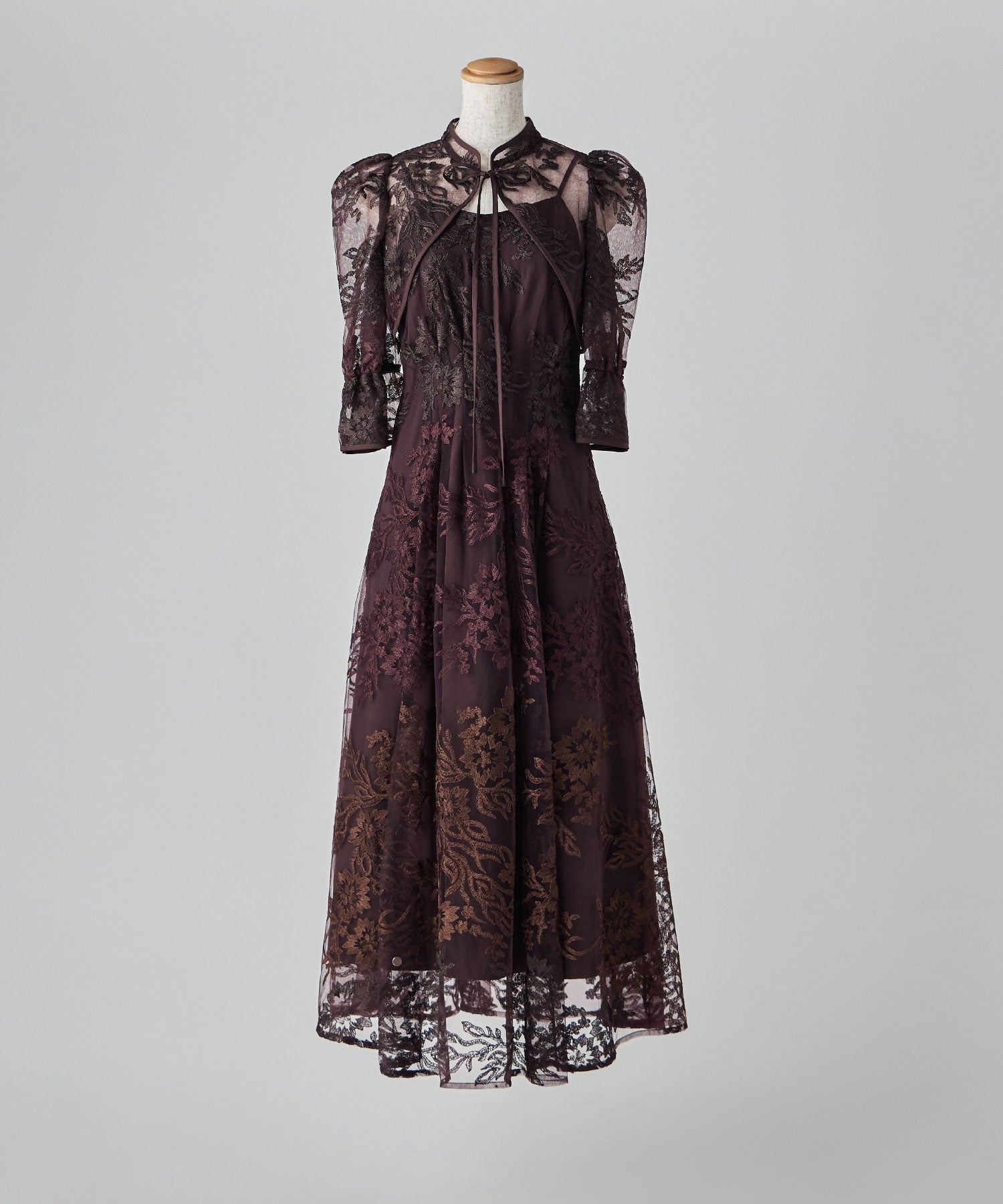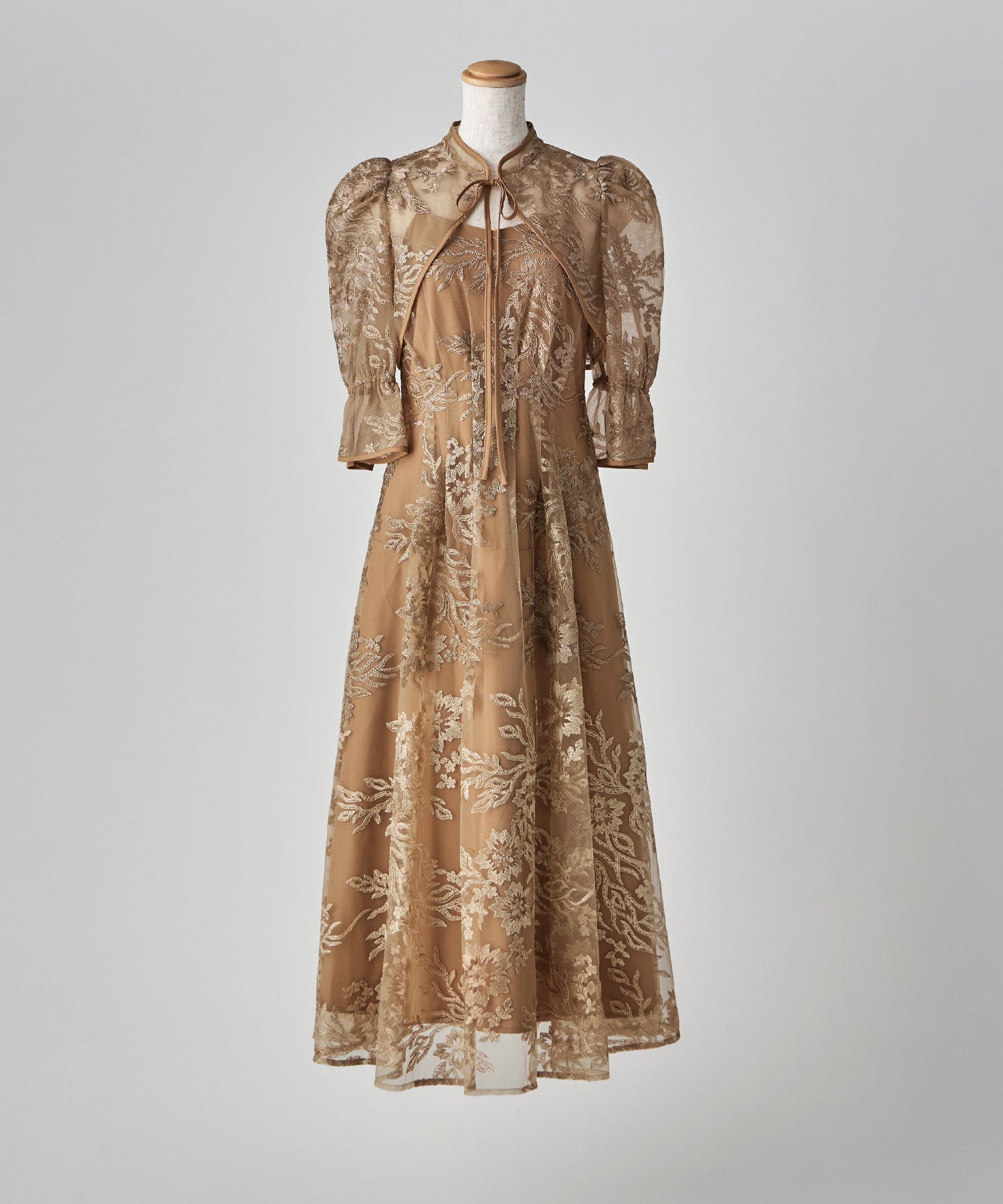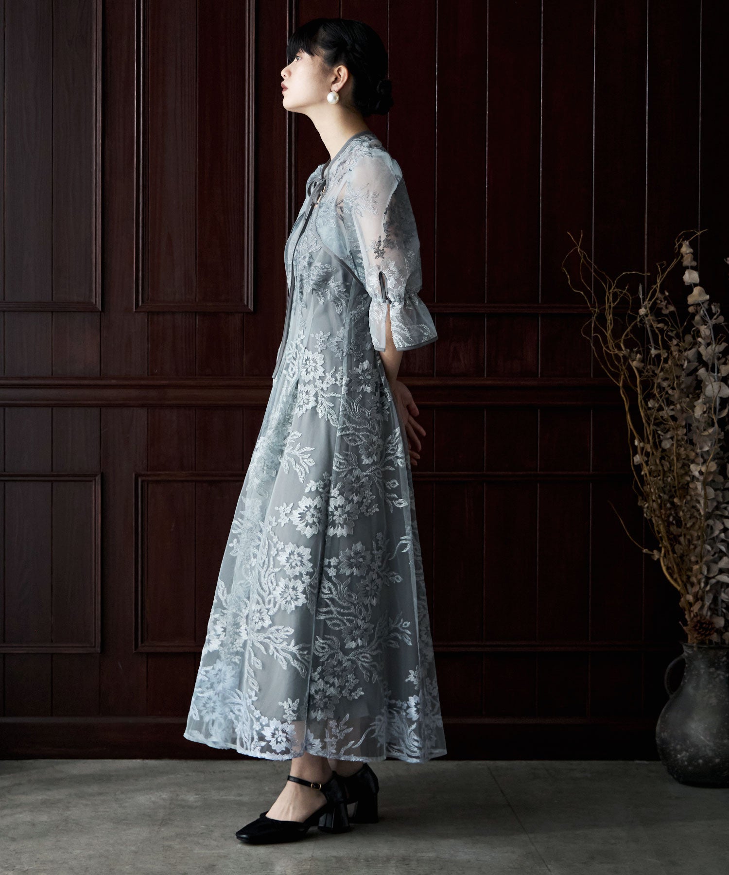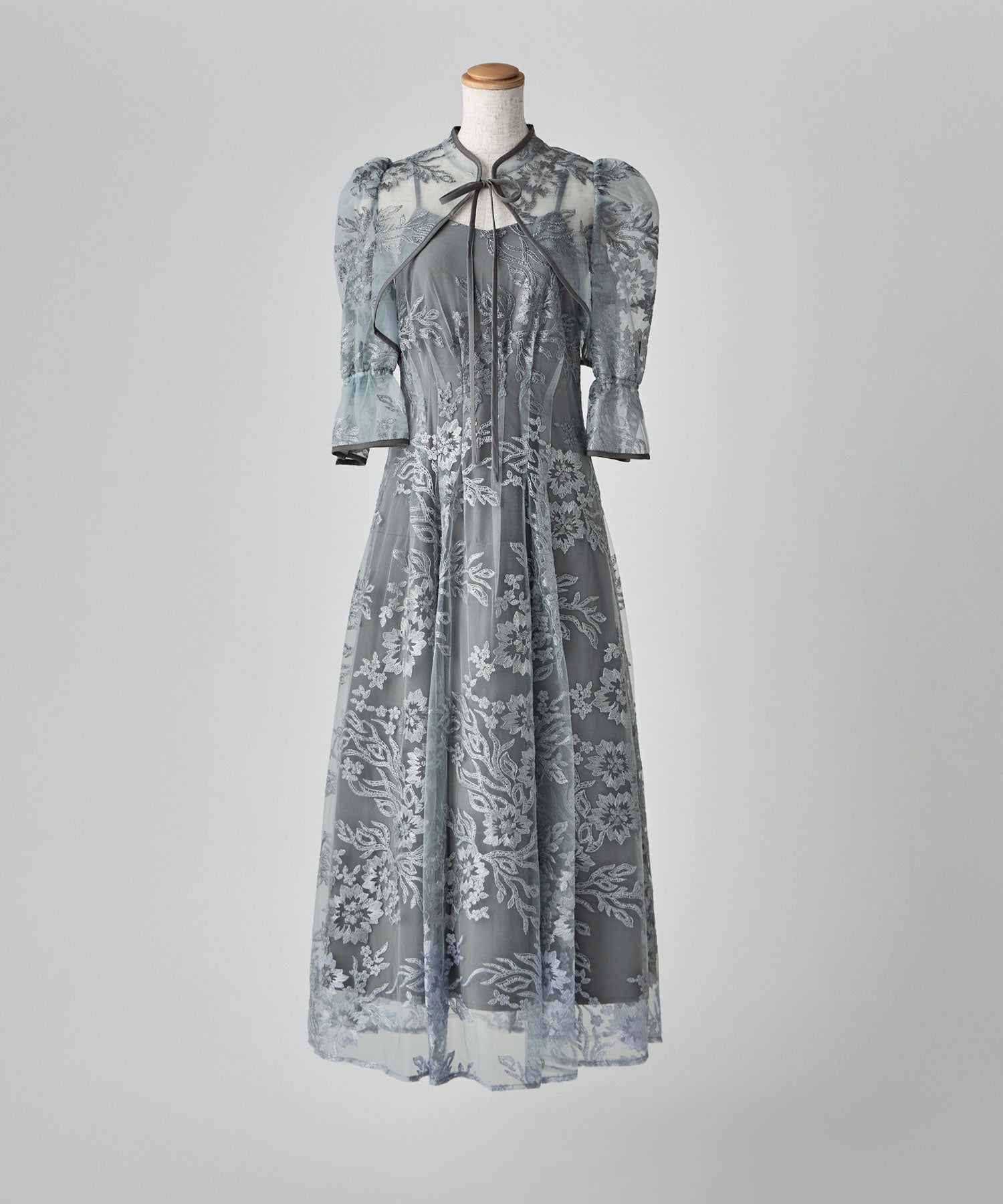シアーレースボレロとウエストタックのワンピースがセットになったクラシカルなオケージョンドレス。