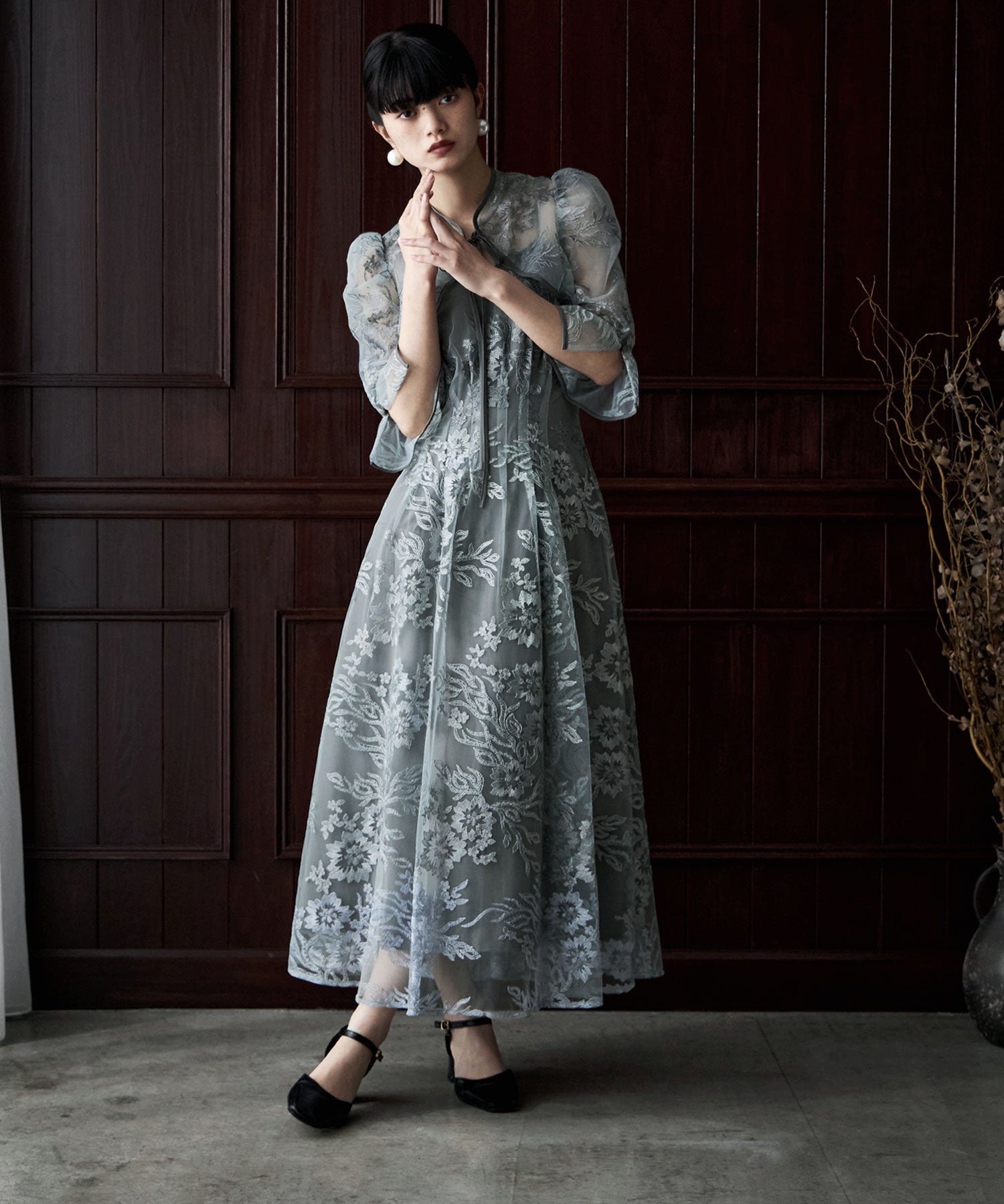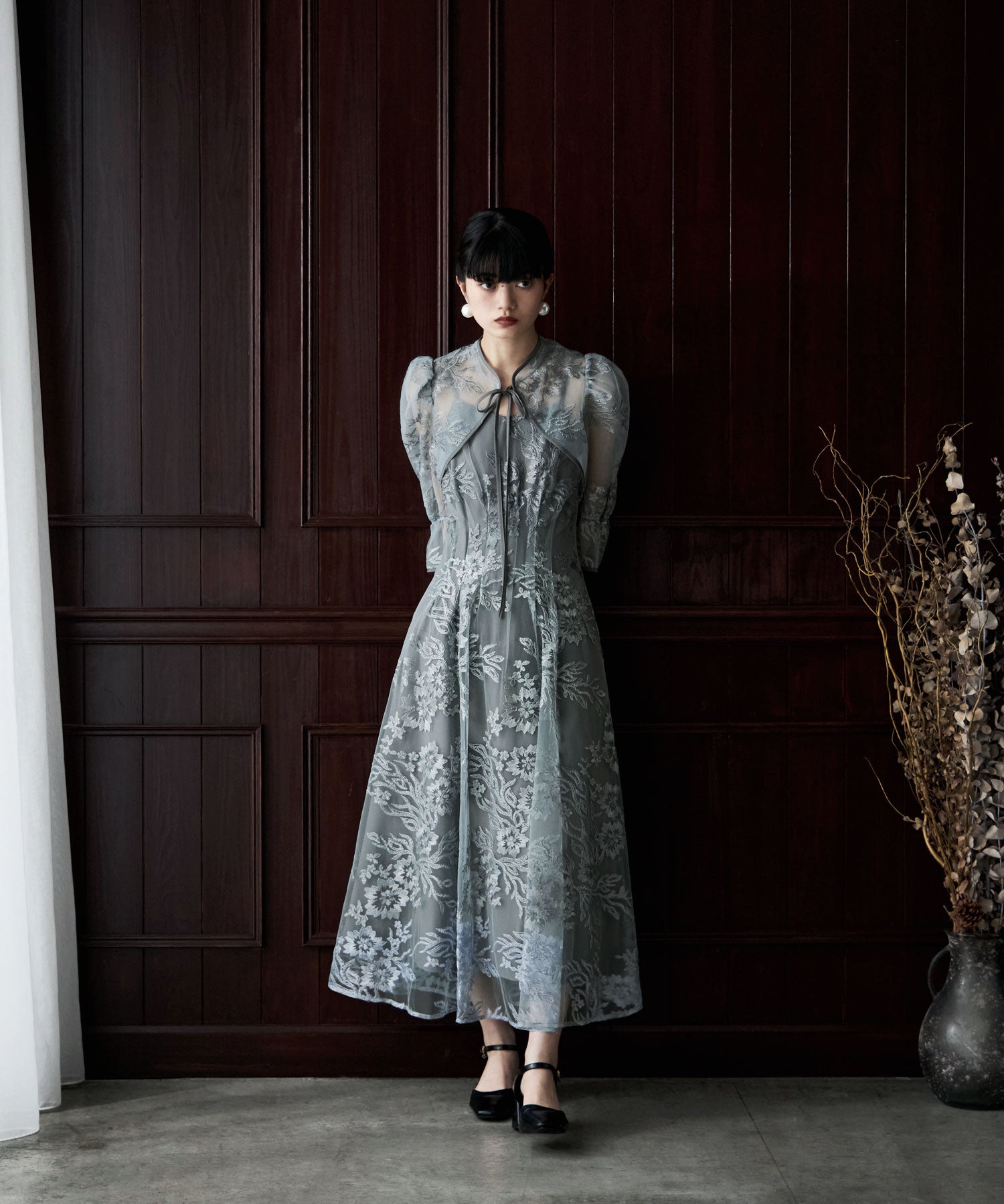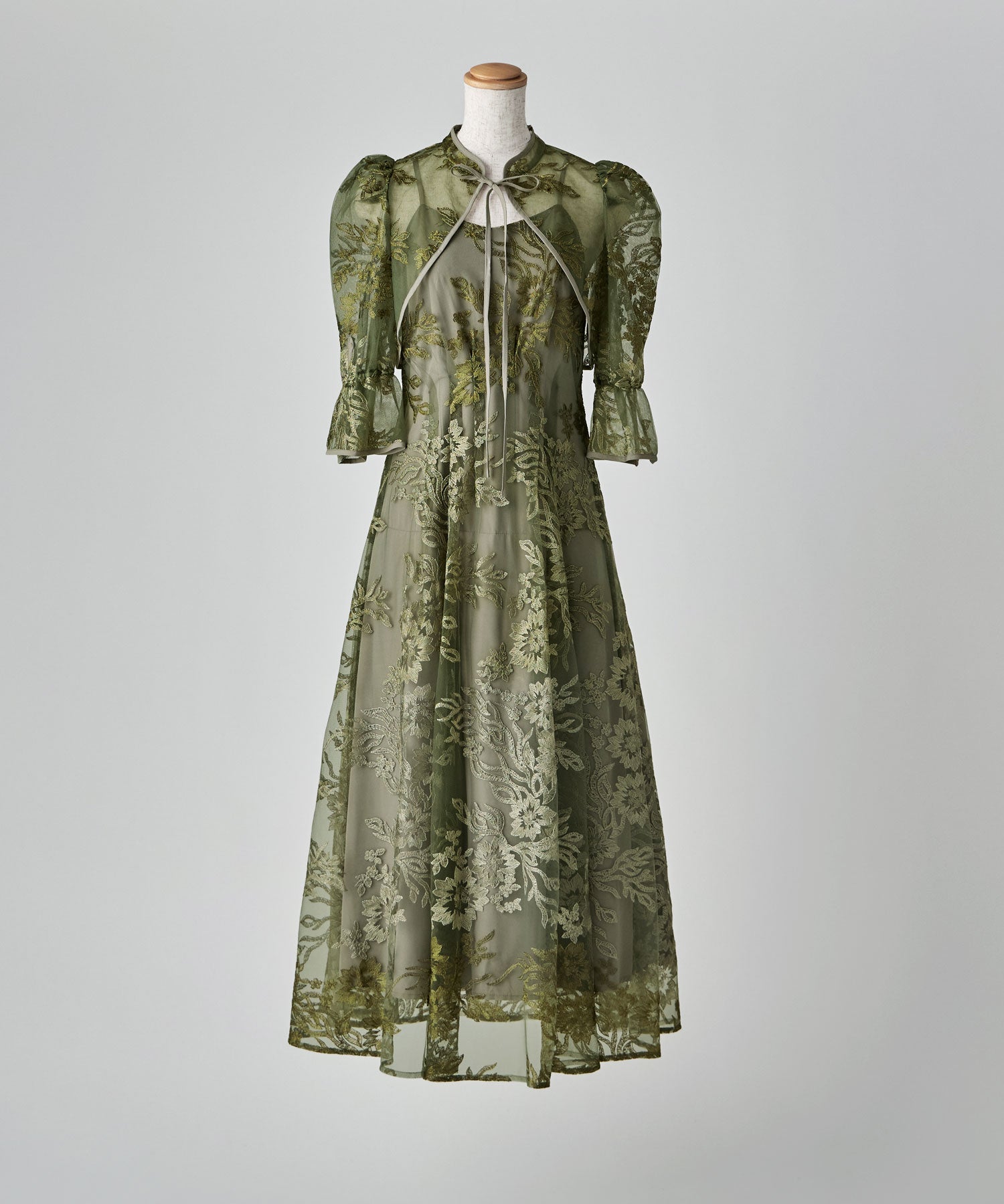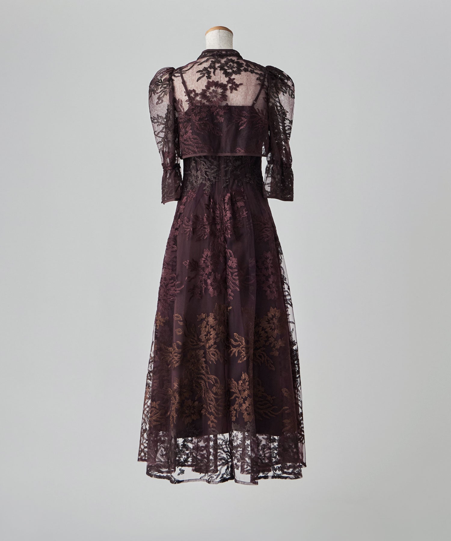 シアーレースボレロとウエストタックのワンピースがセットになったクラシカルなオケージョンドレス。