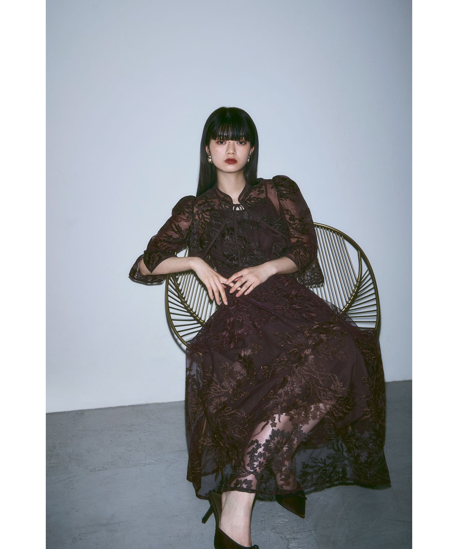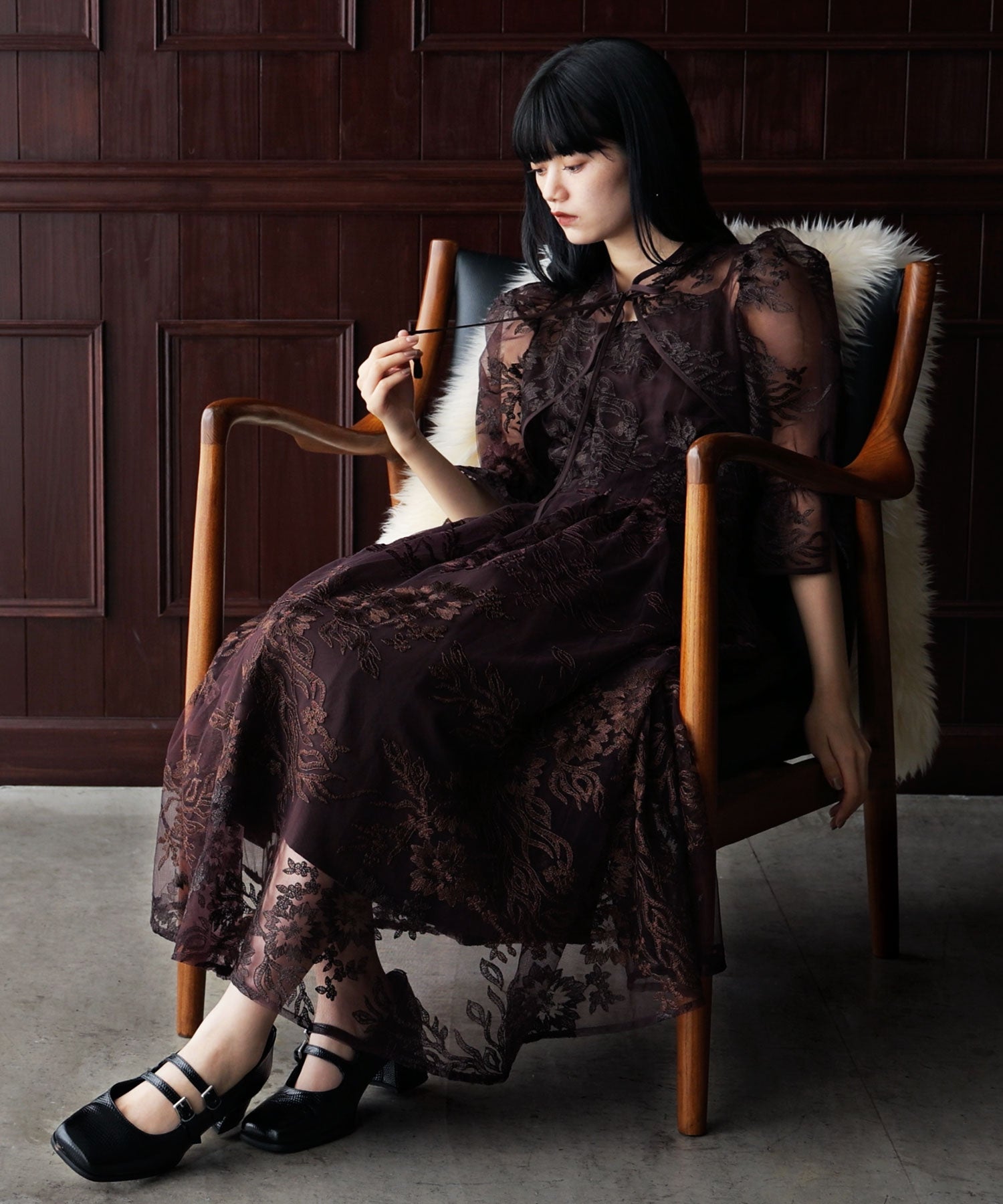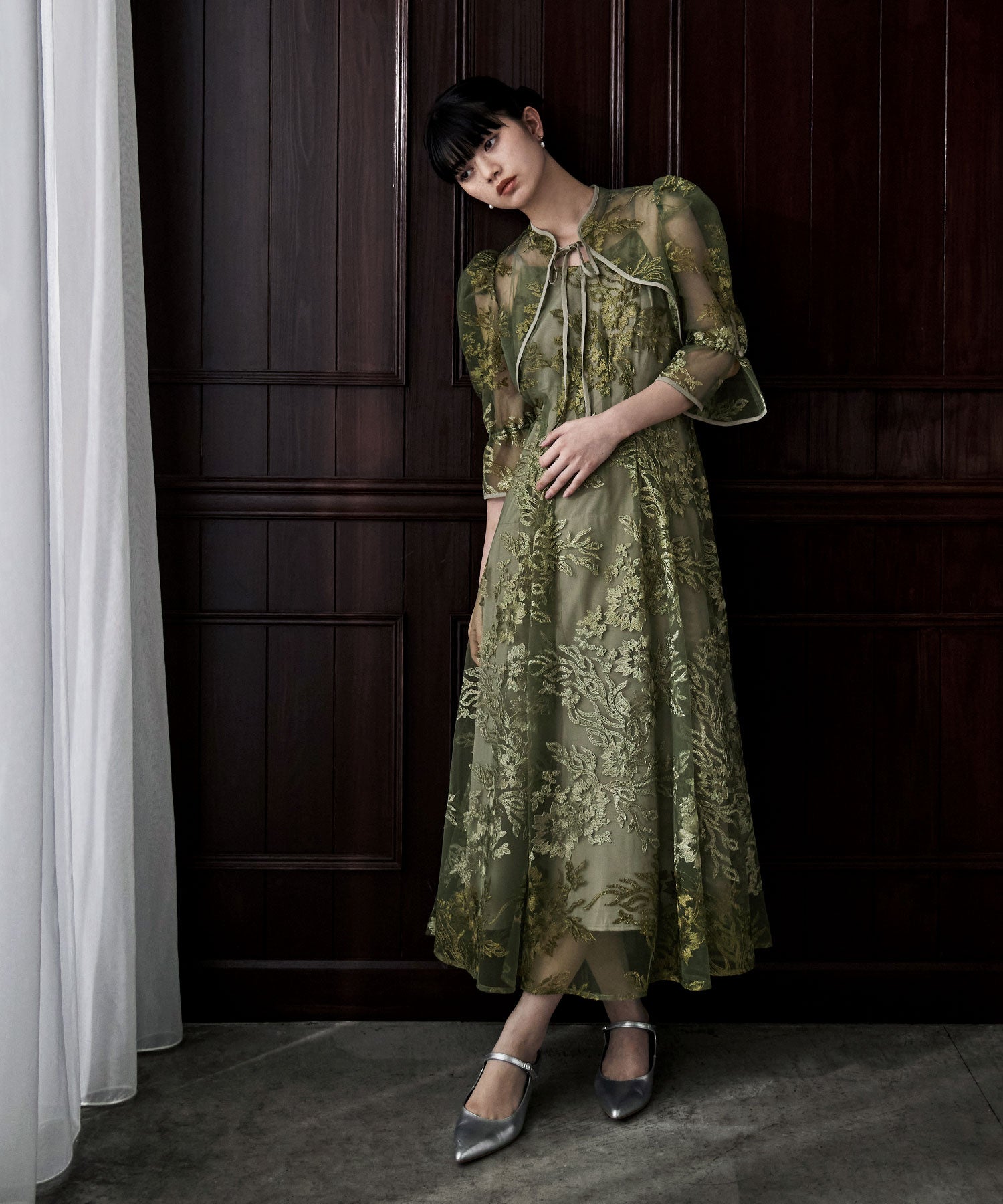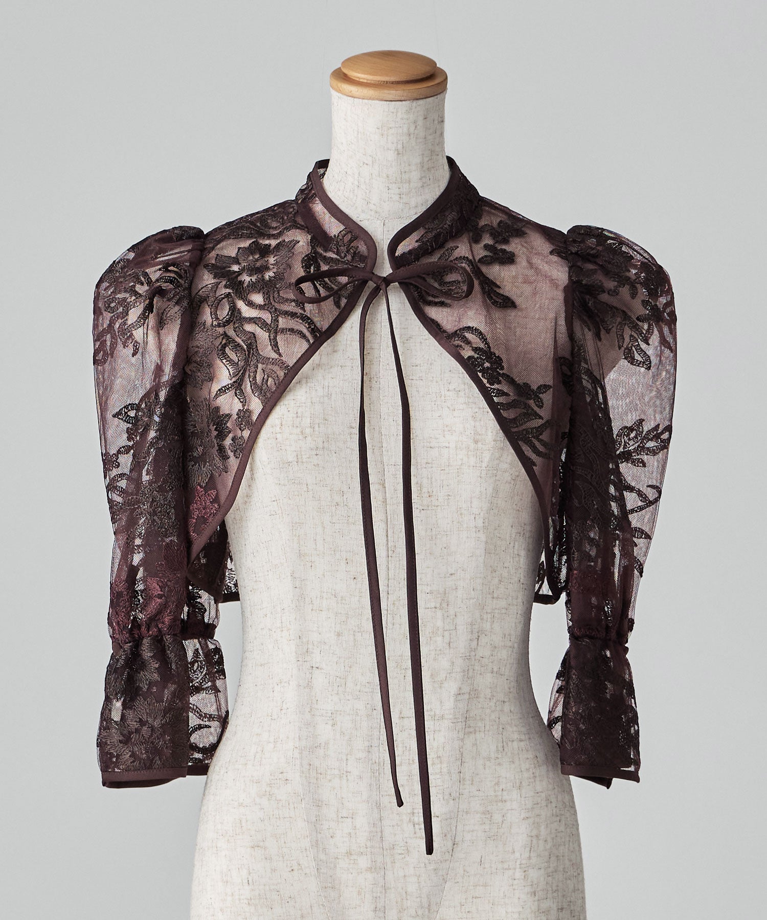 シアーレースボレロとウエストタックのワンピースがセットになったクラシカルなオケージョンドレス。