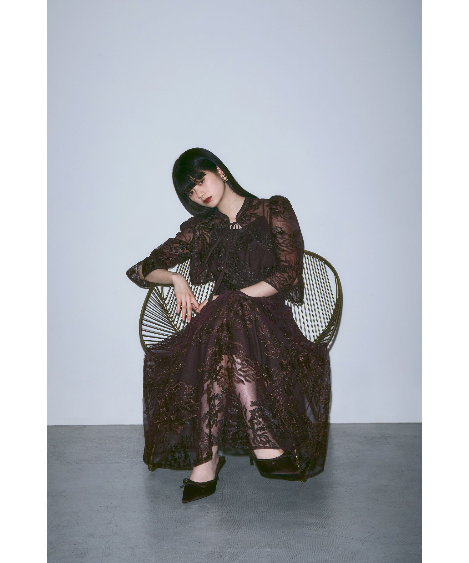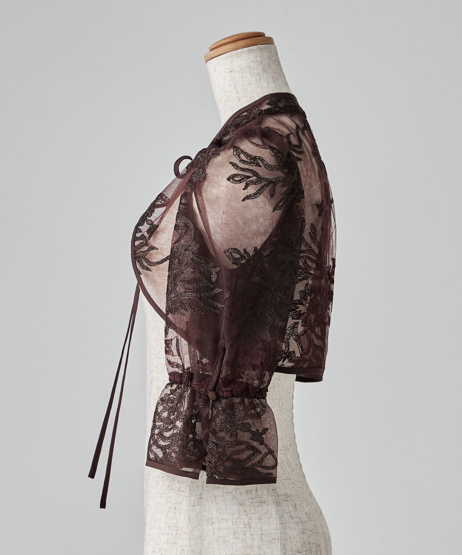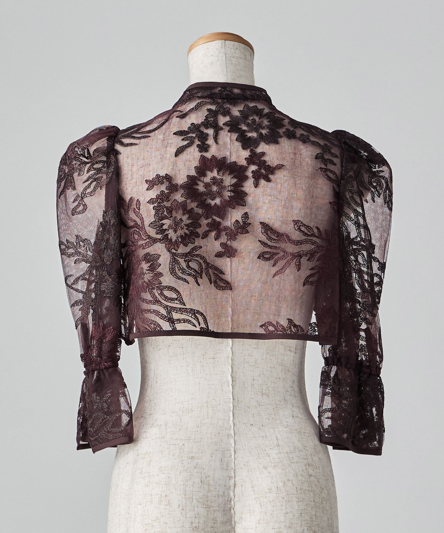 グラデーションがワンピースと繋がり馴染むようにこだわったボレロは、パフスリーブとリボンを結んだ首元で甘さをプラス。