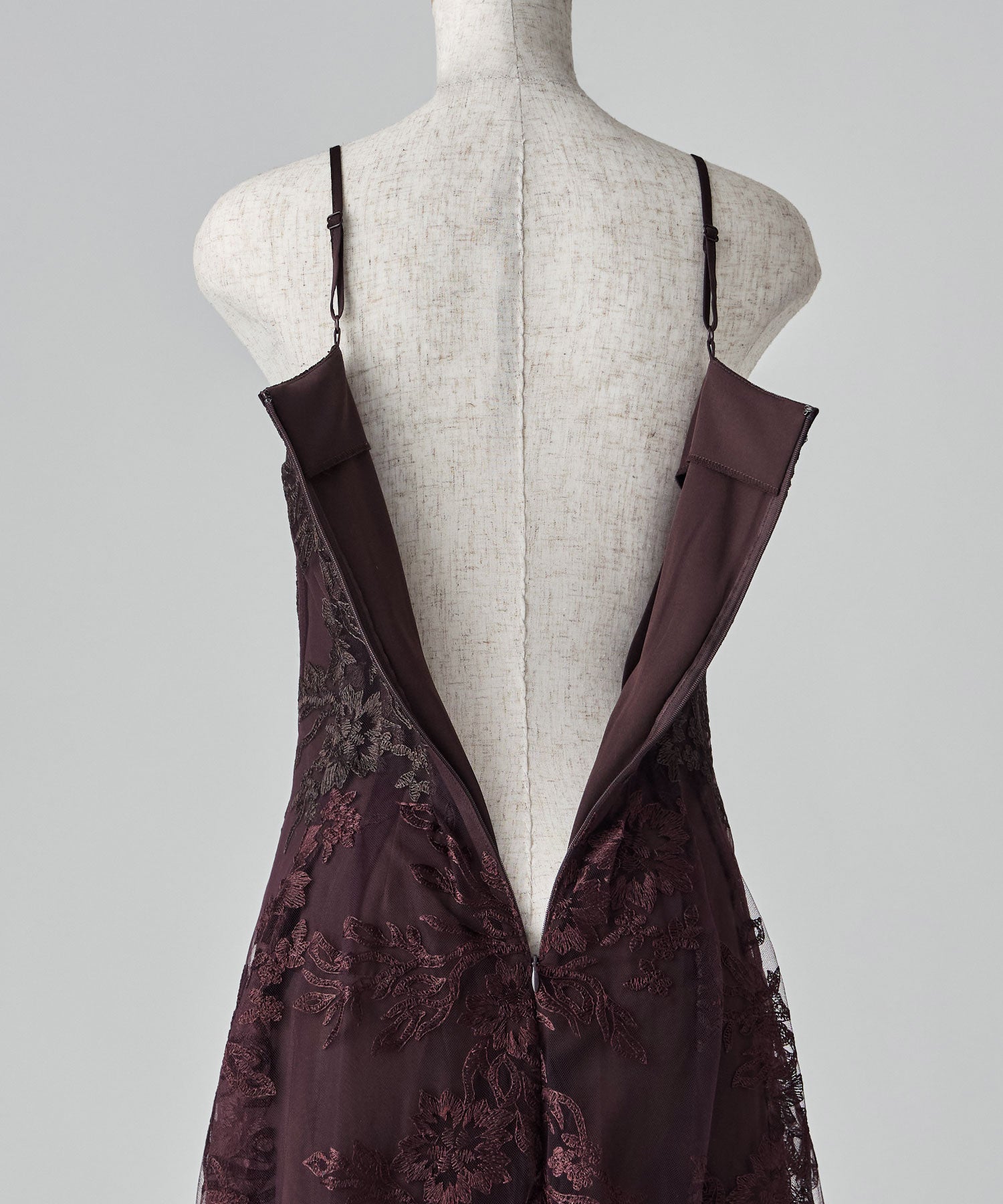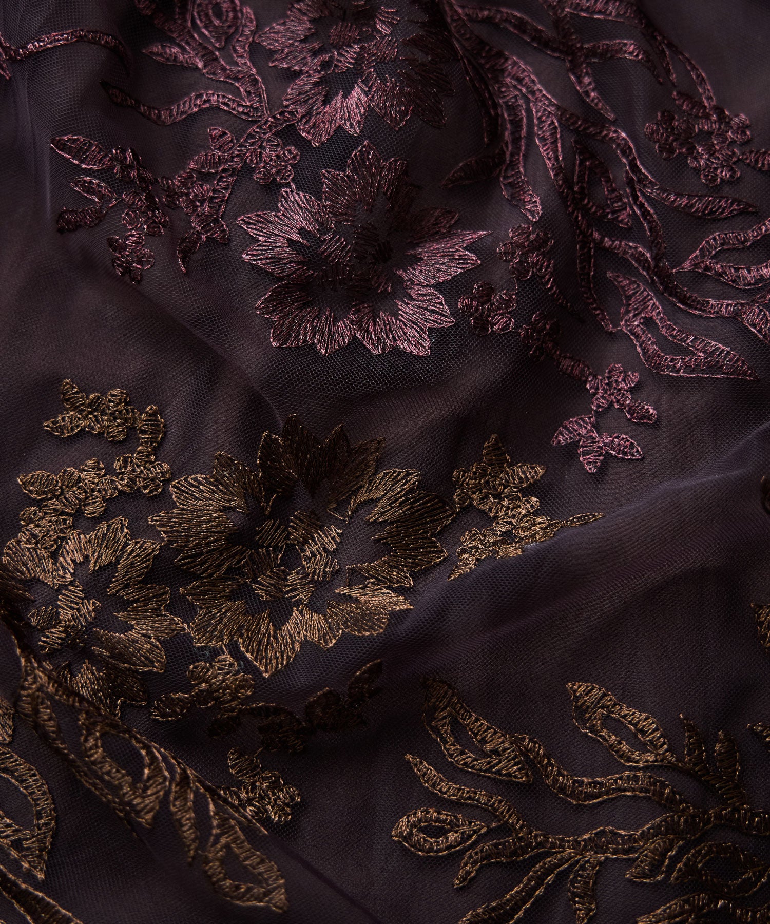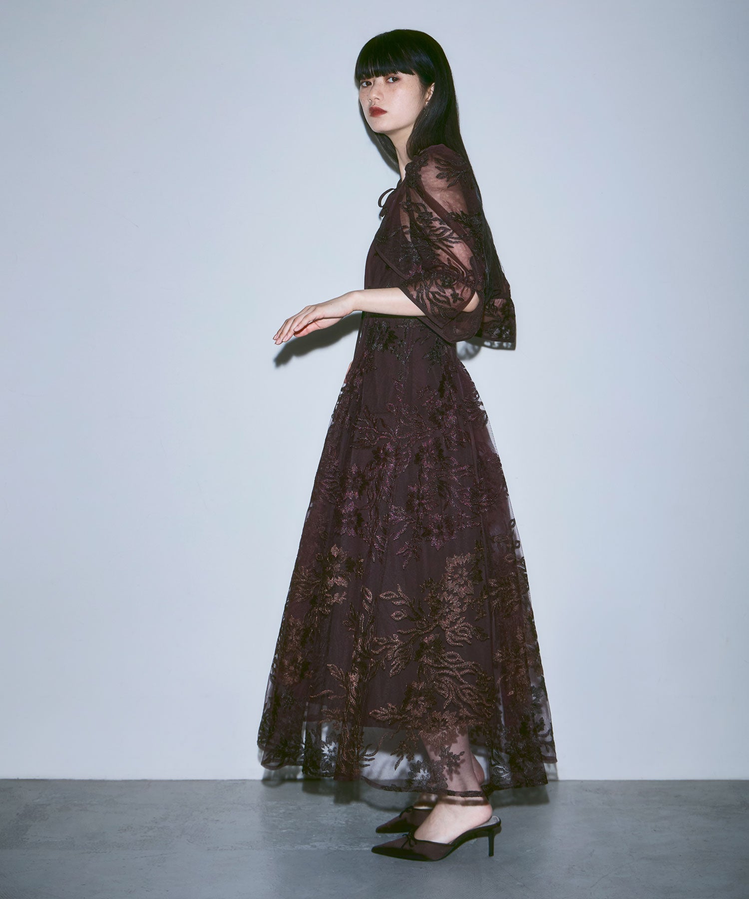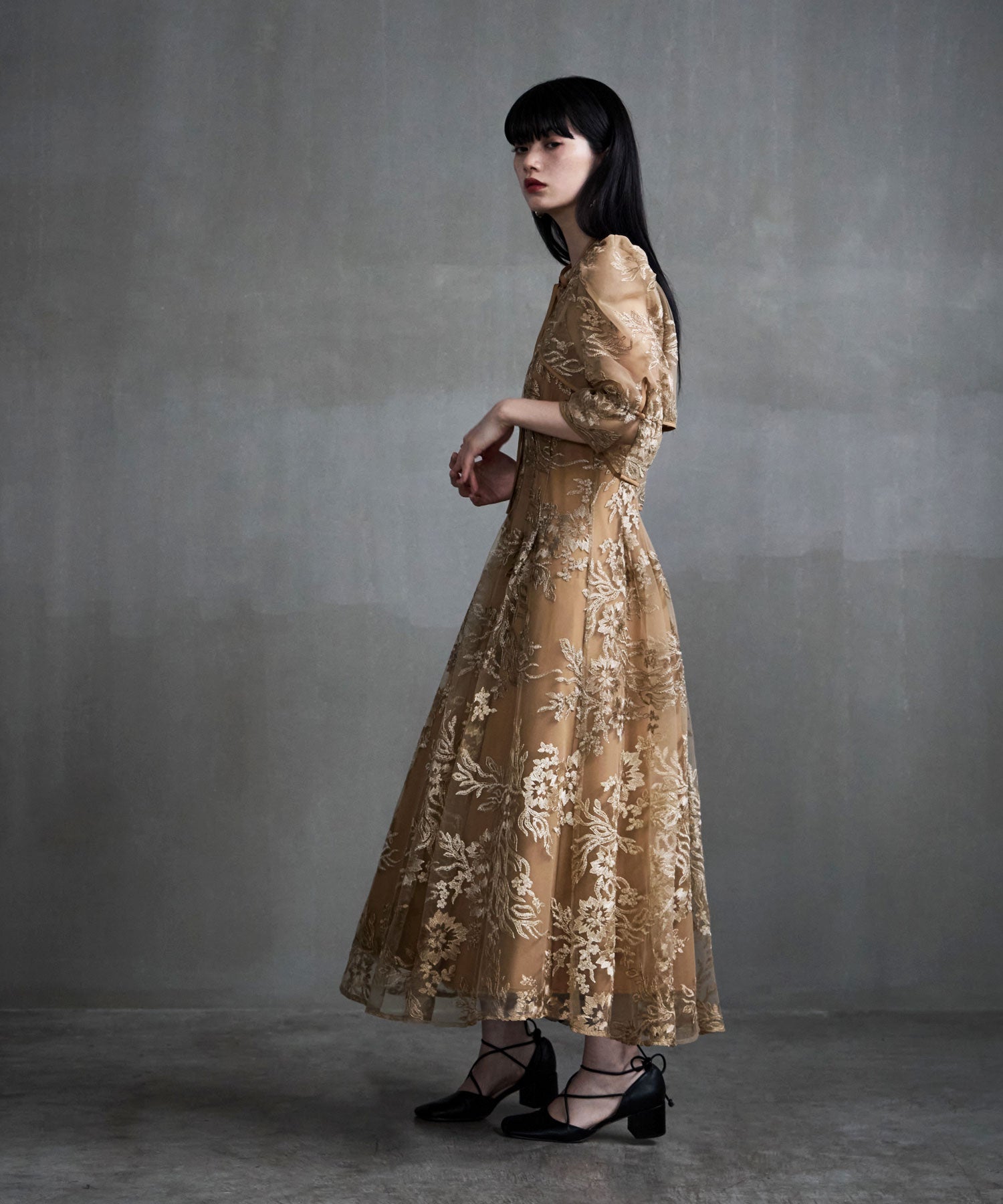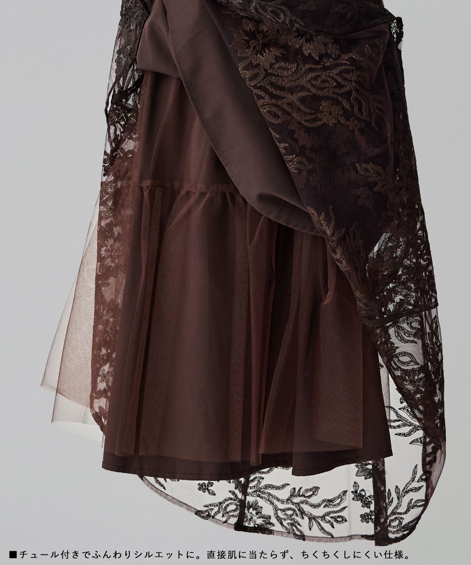 よりウエストの華奢見えを促し、また、華やかなシルエットになるよう、ワンピースの中にチュールを入れました。