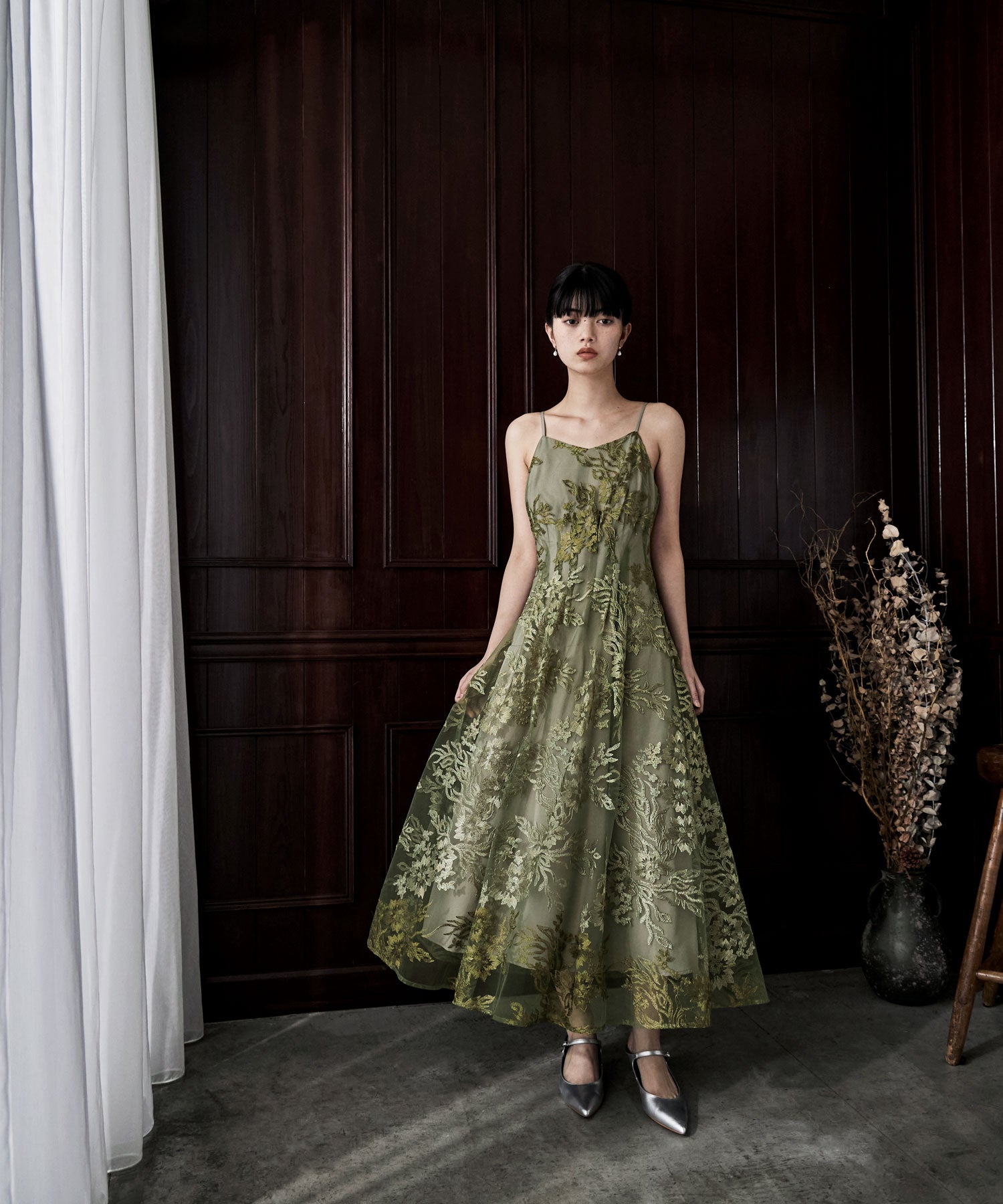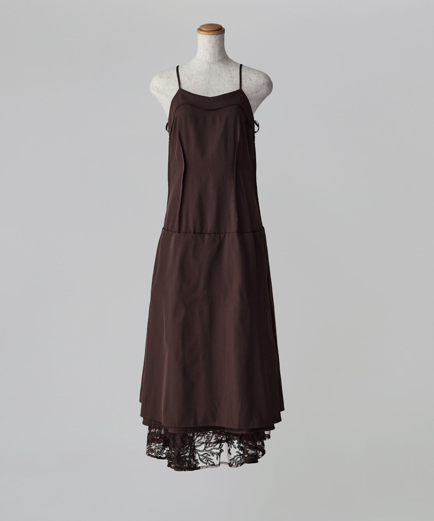 キャミソールワンピースはしっかりとくびれに沿うように施したウエストのタックから裾にかけて広がるシルエットは美しく、