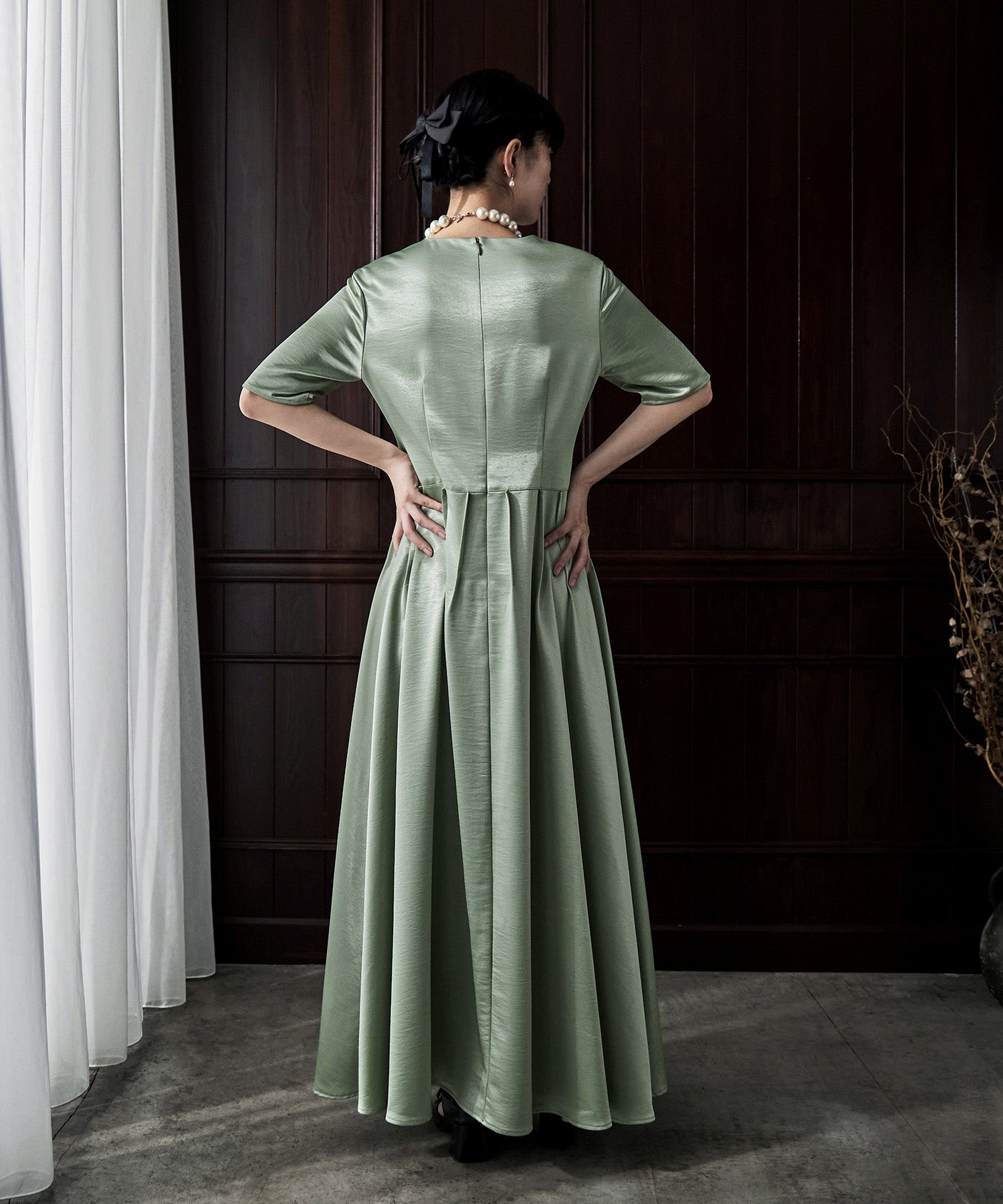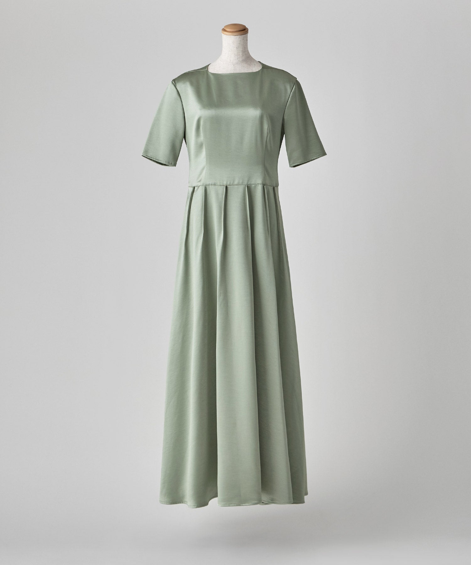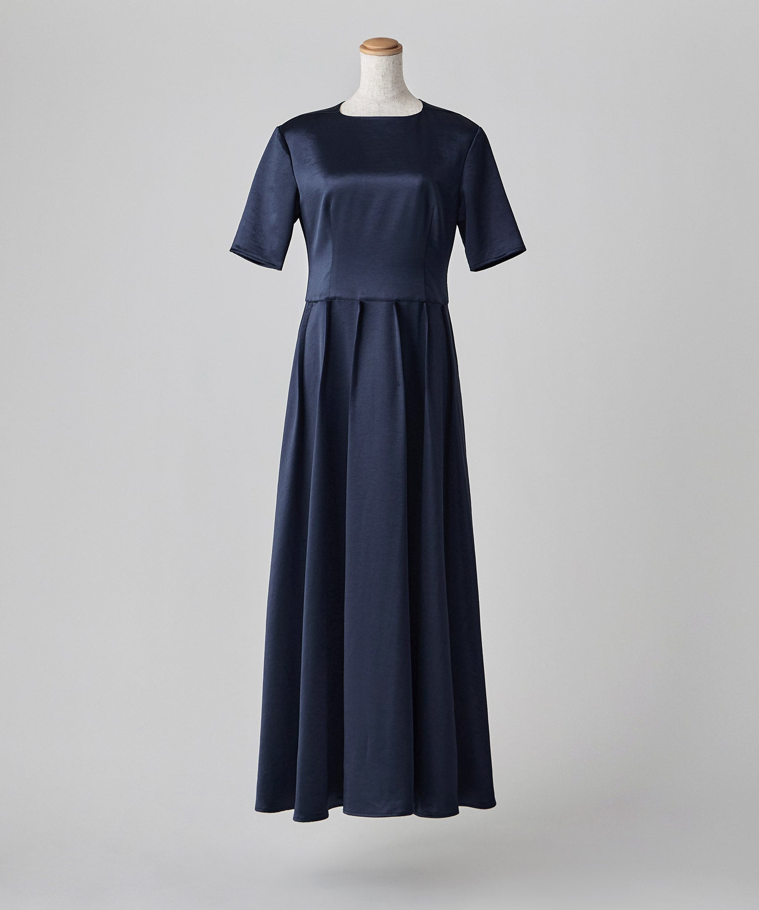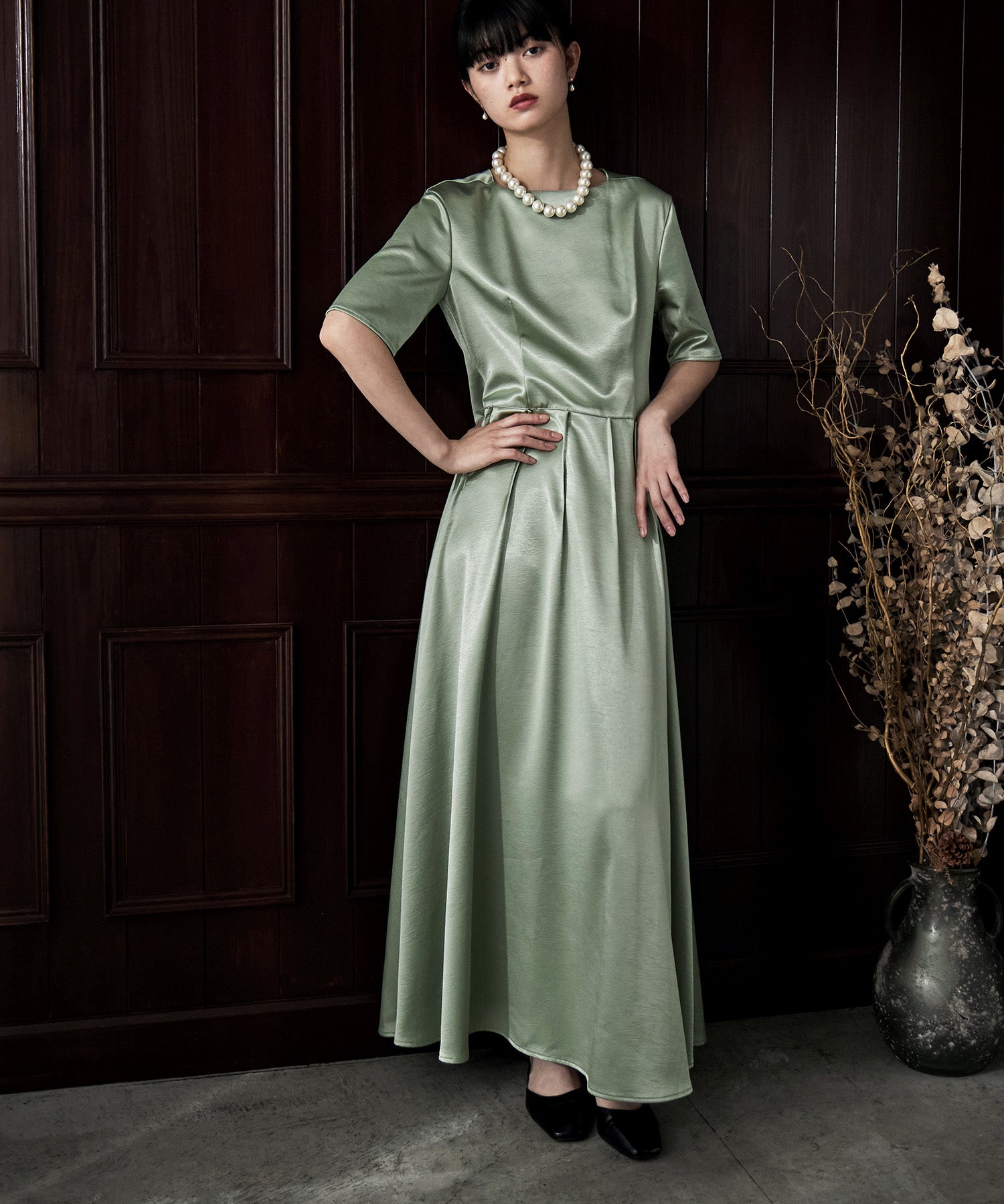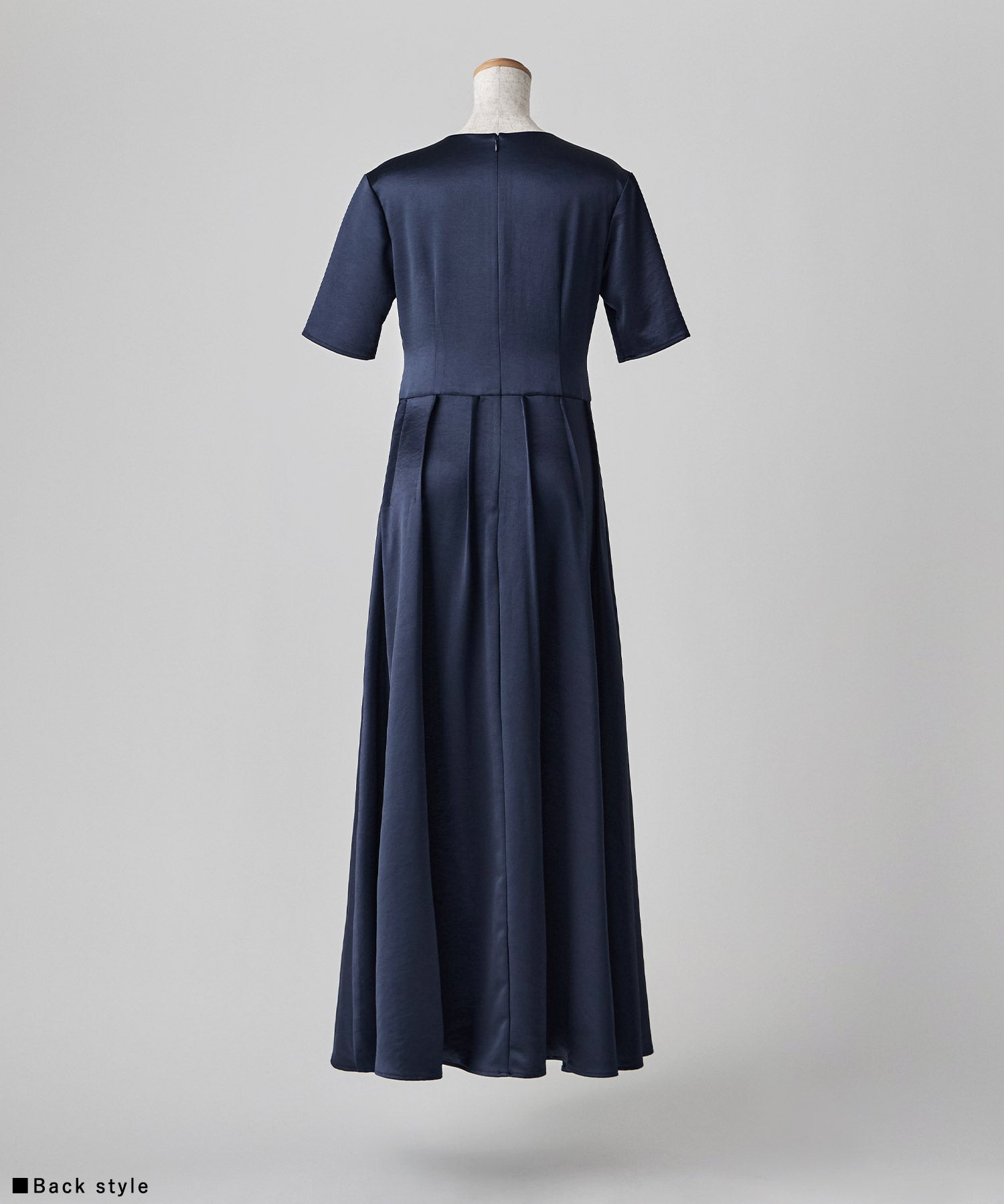 Rname サテンウエストタックドレス ワンピース ワンピ ドレス 半袖 ロング マキシ丈 オケワンピ スクエアネック サテン 光沢 Aライン ウエストタック フレア 結婚式 二次会 パーティー 発表会 演奏会 女子会 フォーマル オケージョン
