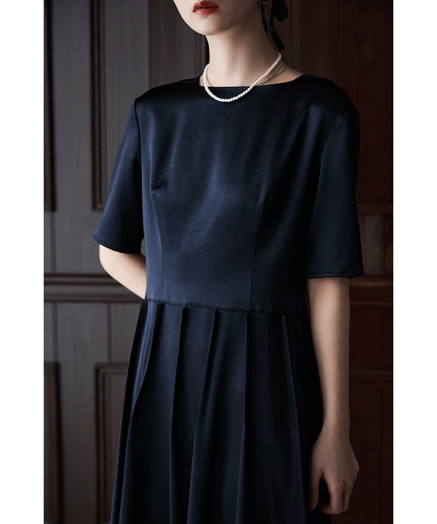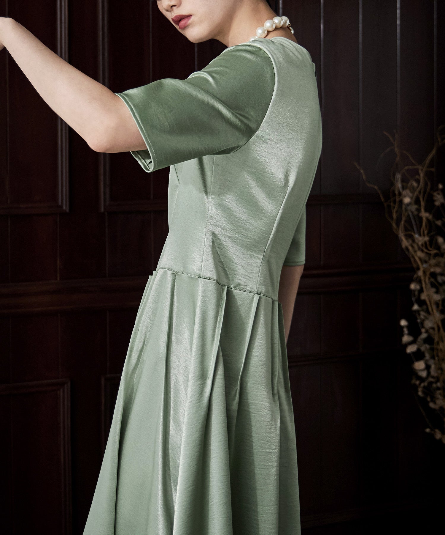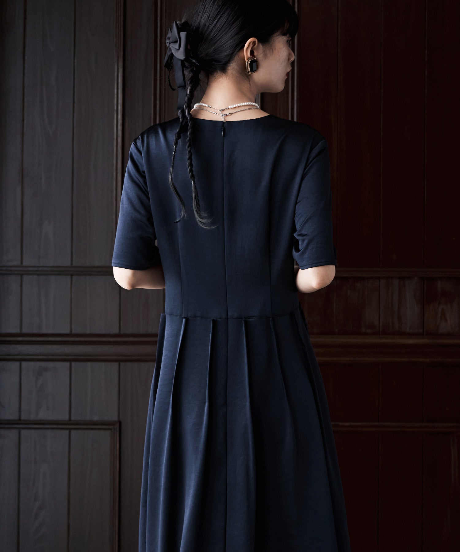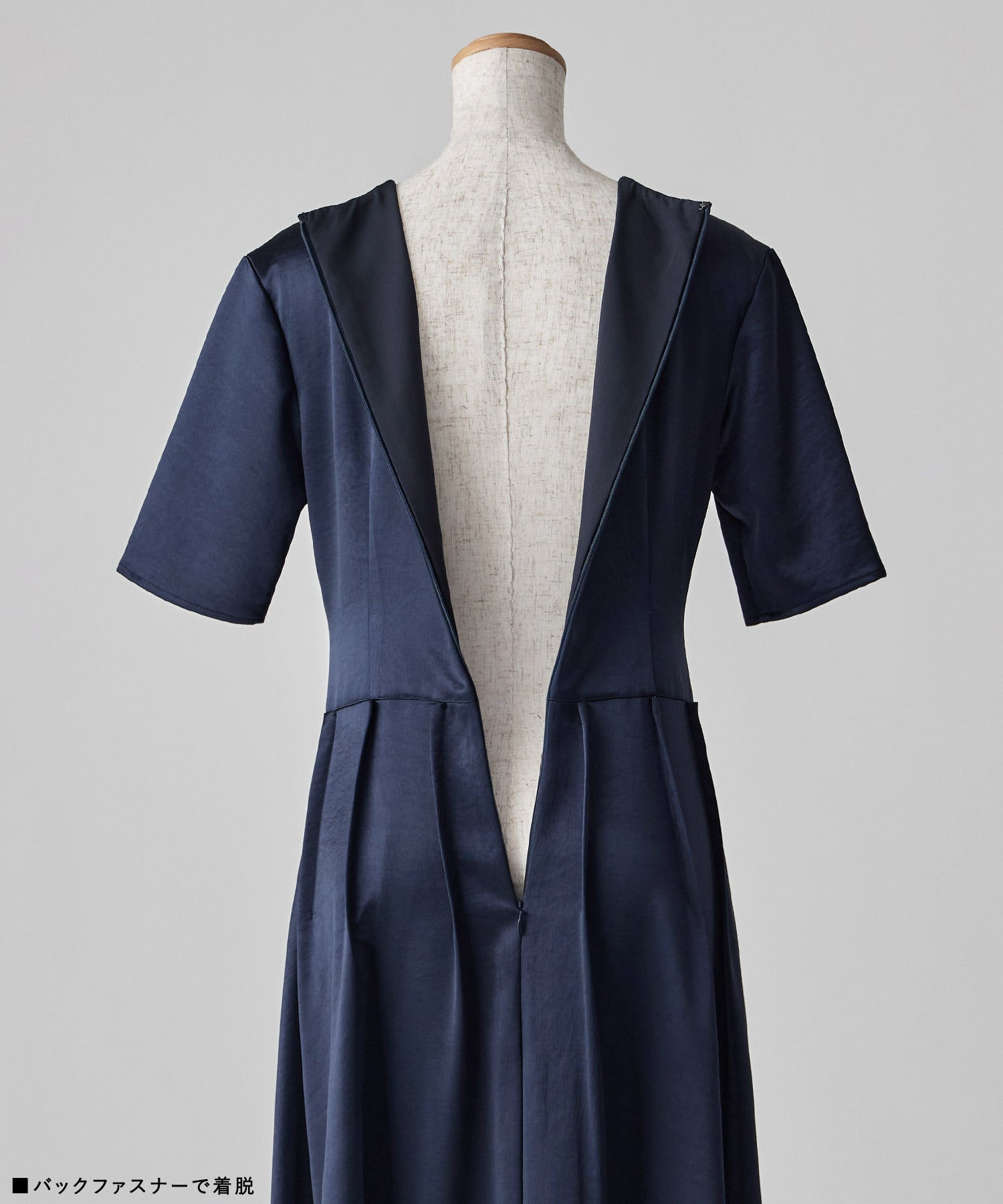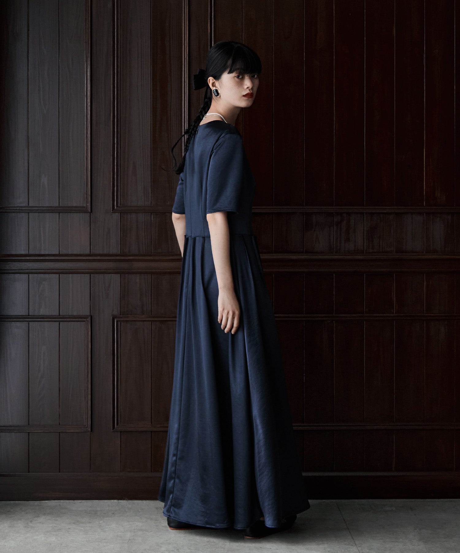 Rname サテンウエストタックドレス ワンピース ワンピ ドレス 半袖 ロング マキシ丈 オケワンピ スクエアネック サテン 光沢 Aライン ウエストタック フレア 結婚式 二次会 パーティー 発表会 演奏会 女子会 フォーマル オケージョン