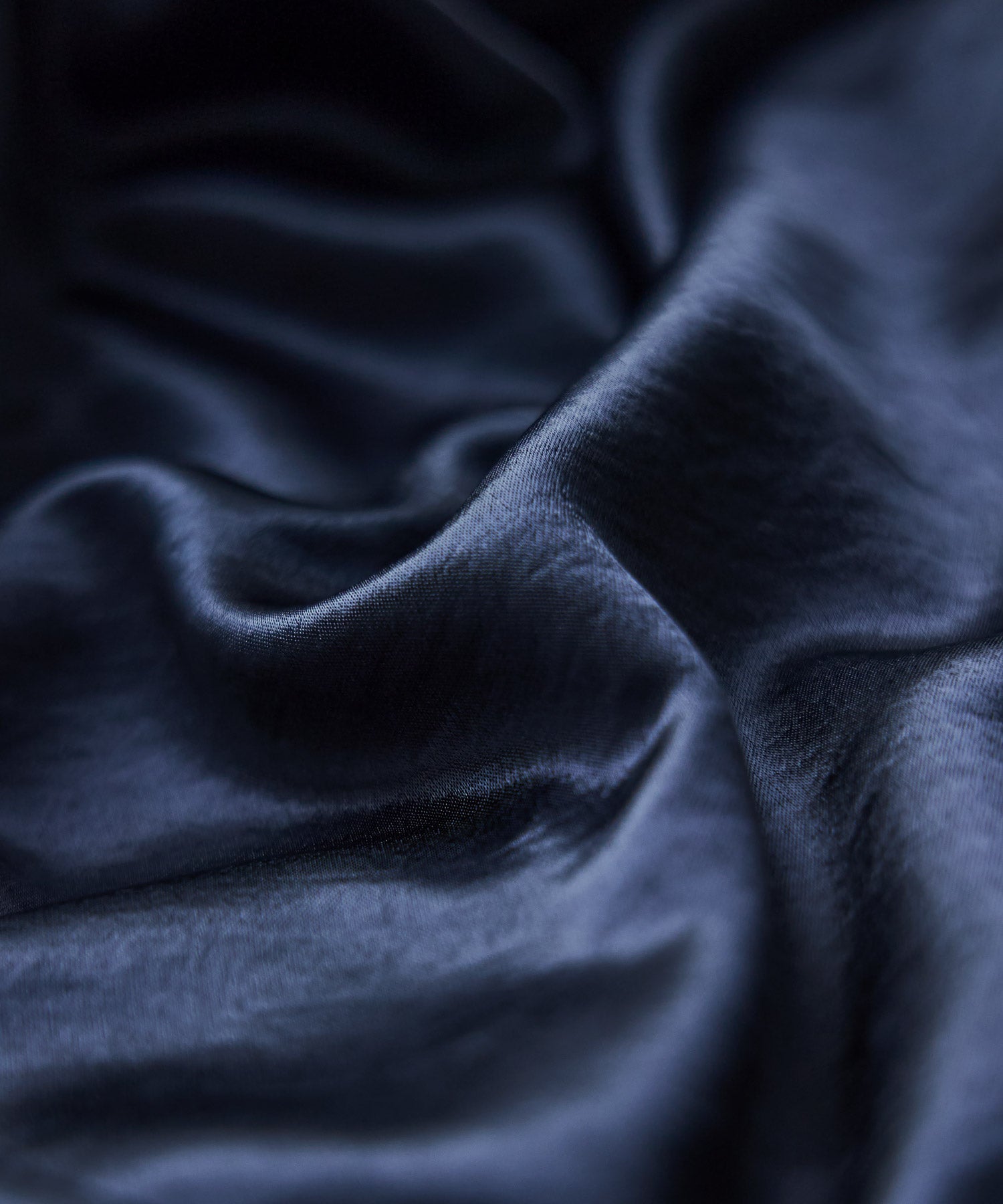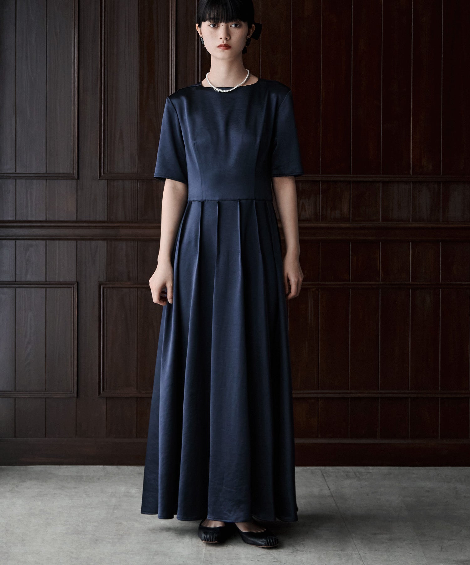 表面に抑揚が生まれるサテンならではの柔らかさととろみのある風合いで、落ち感が美しいAラインのシルエット。