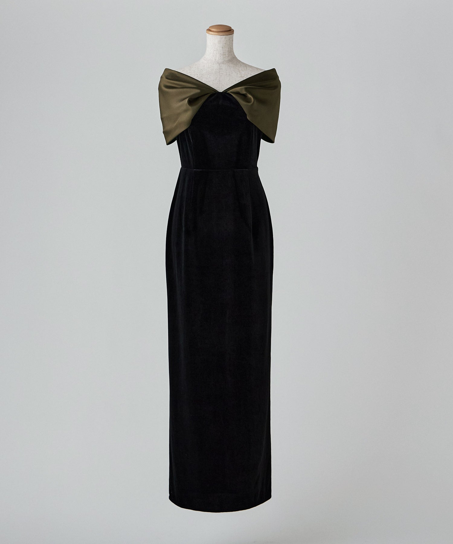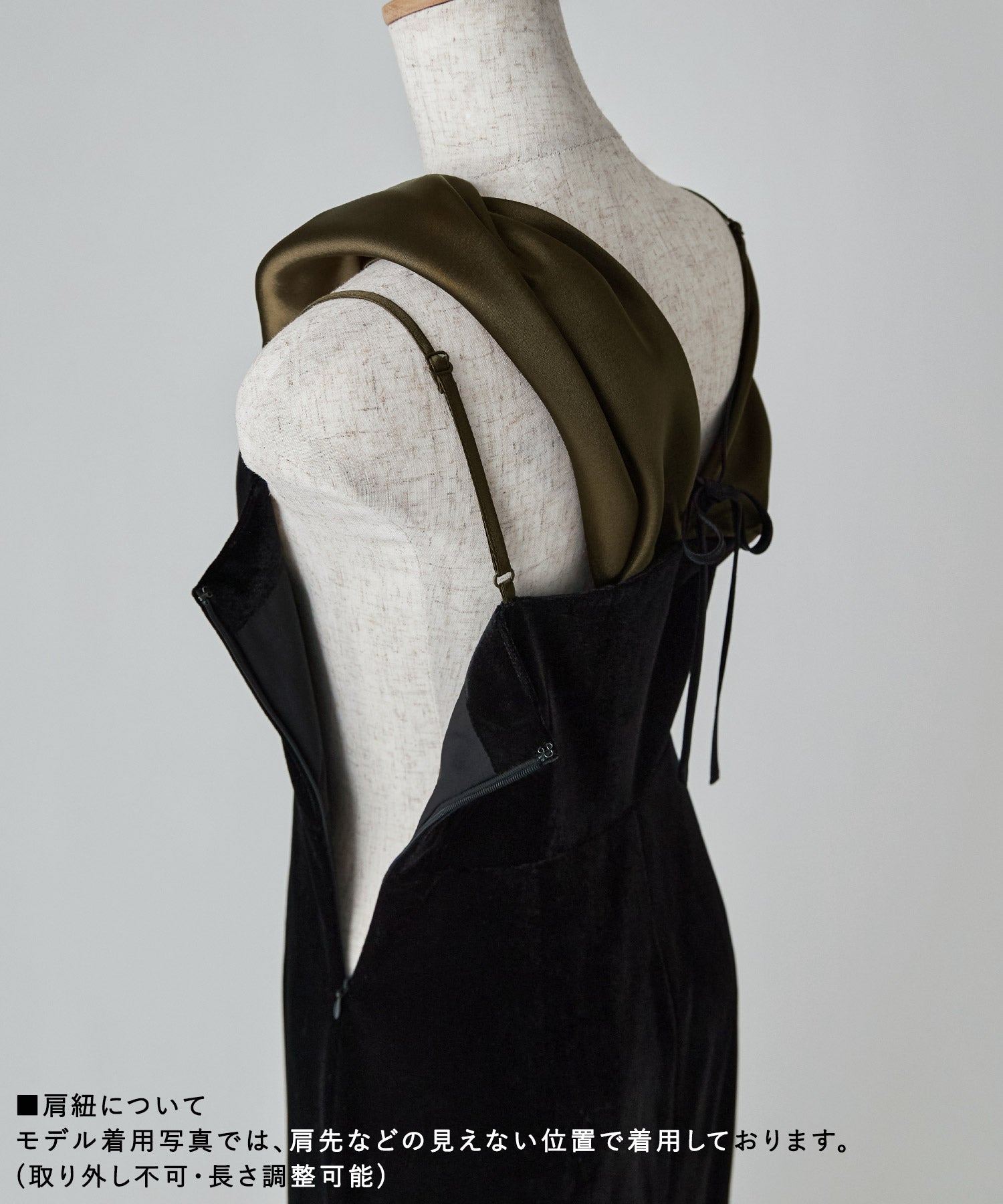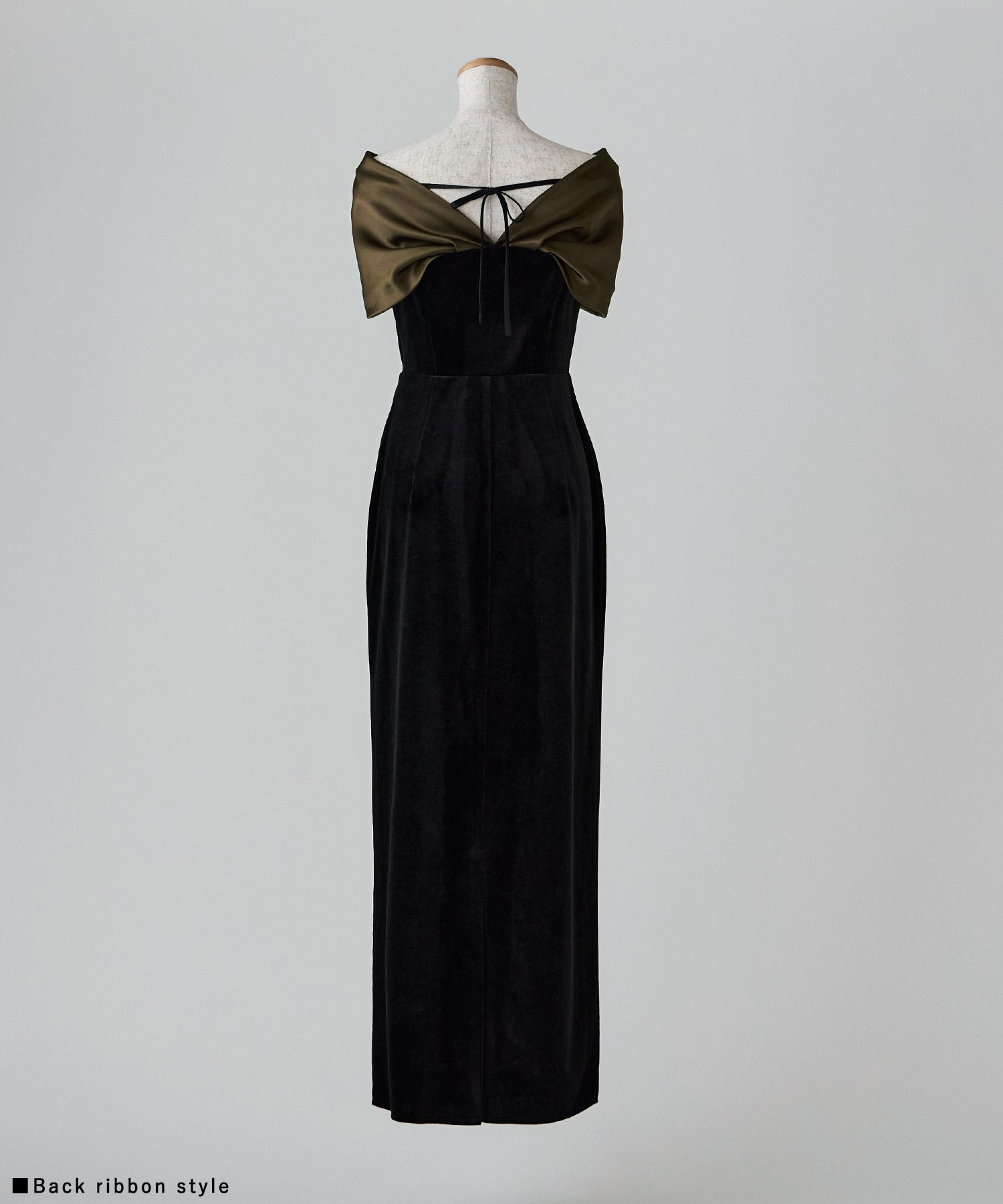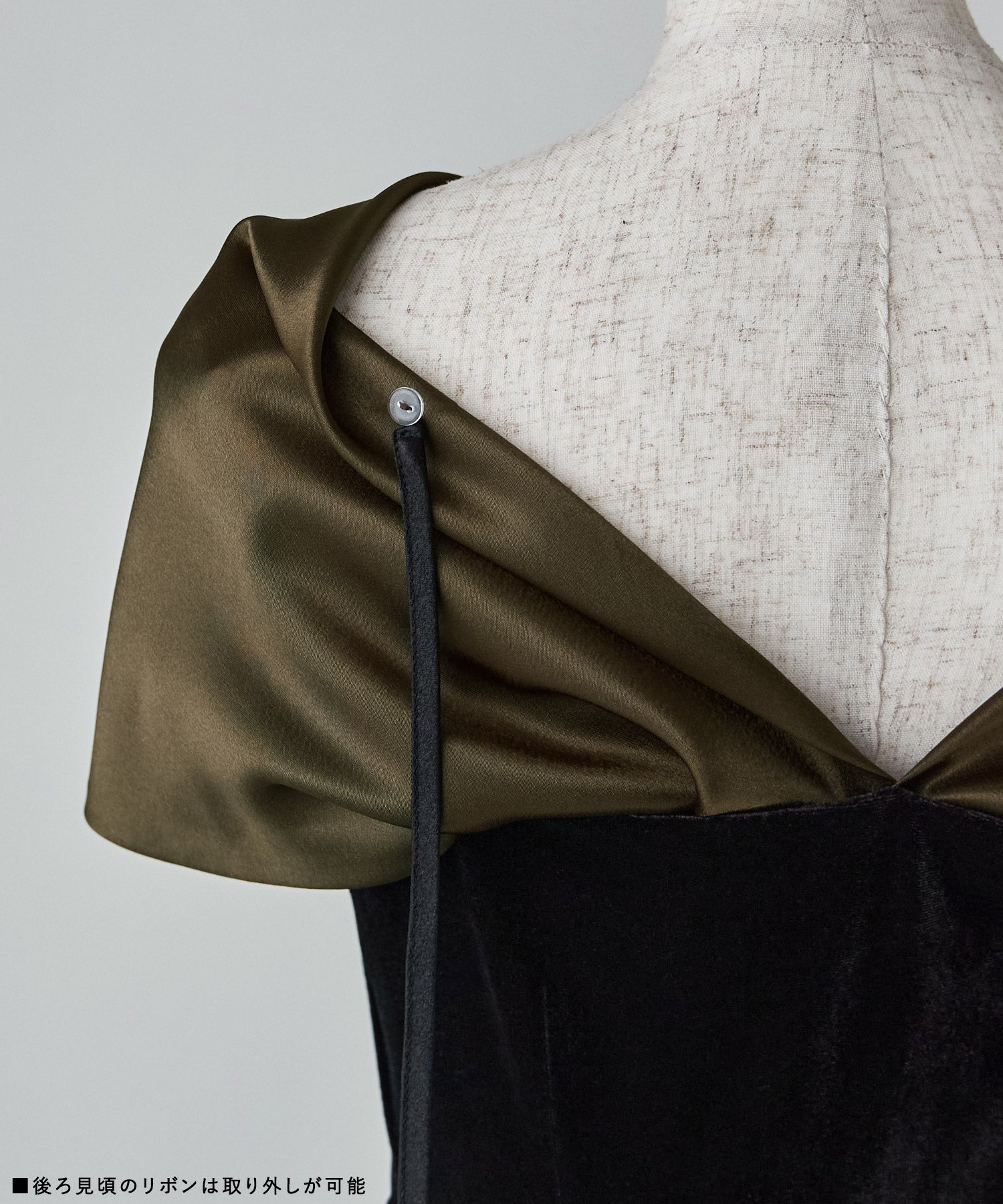 Rname サテンリボンスリーブベロアドレス ワンピース ワンピ ドレス 半袖 ロング マキシ丈 オケワンピ サテン ベロア Iライン バイカラー バレエネック Vネック オフショル タイト デコルテ リボン 結婚式 二次会 パーティー 発表会 演奏会 女子会 フォーマル オケージョン