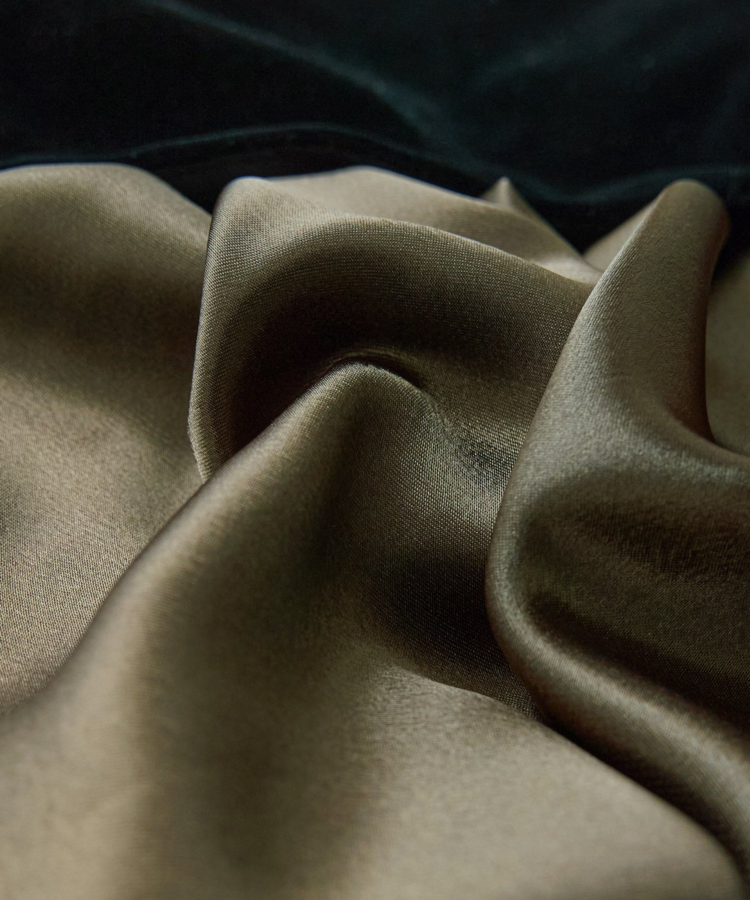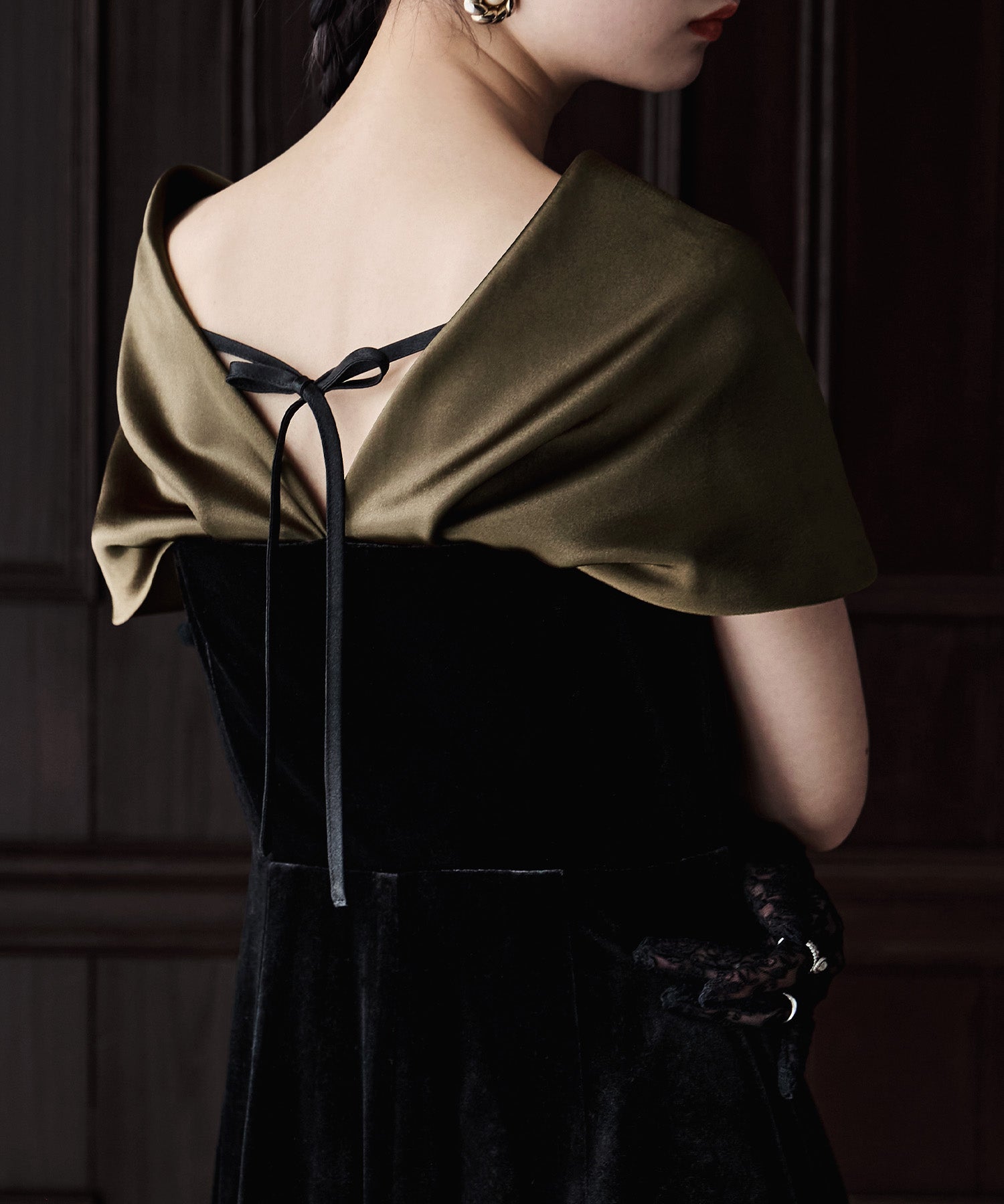 両肩の骨にかかるように着ることで美しい、リボンをまとったようなサテンのショルダーデザイン。