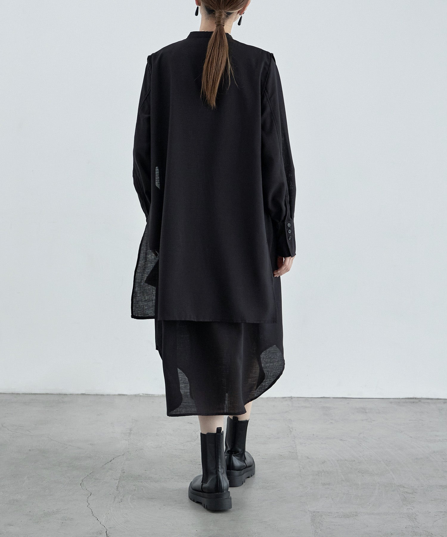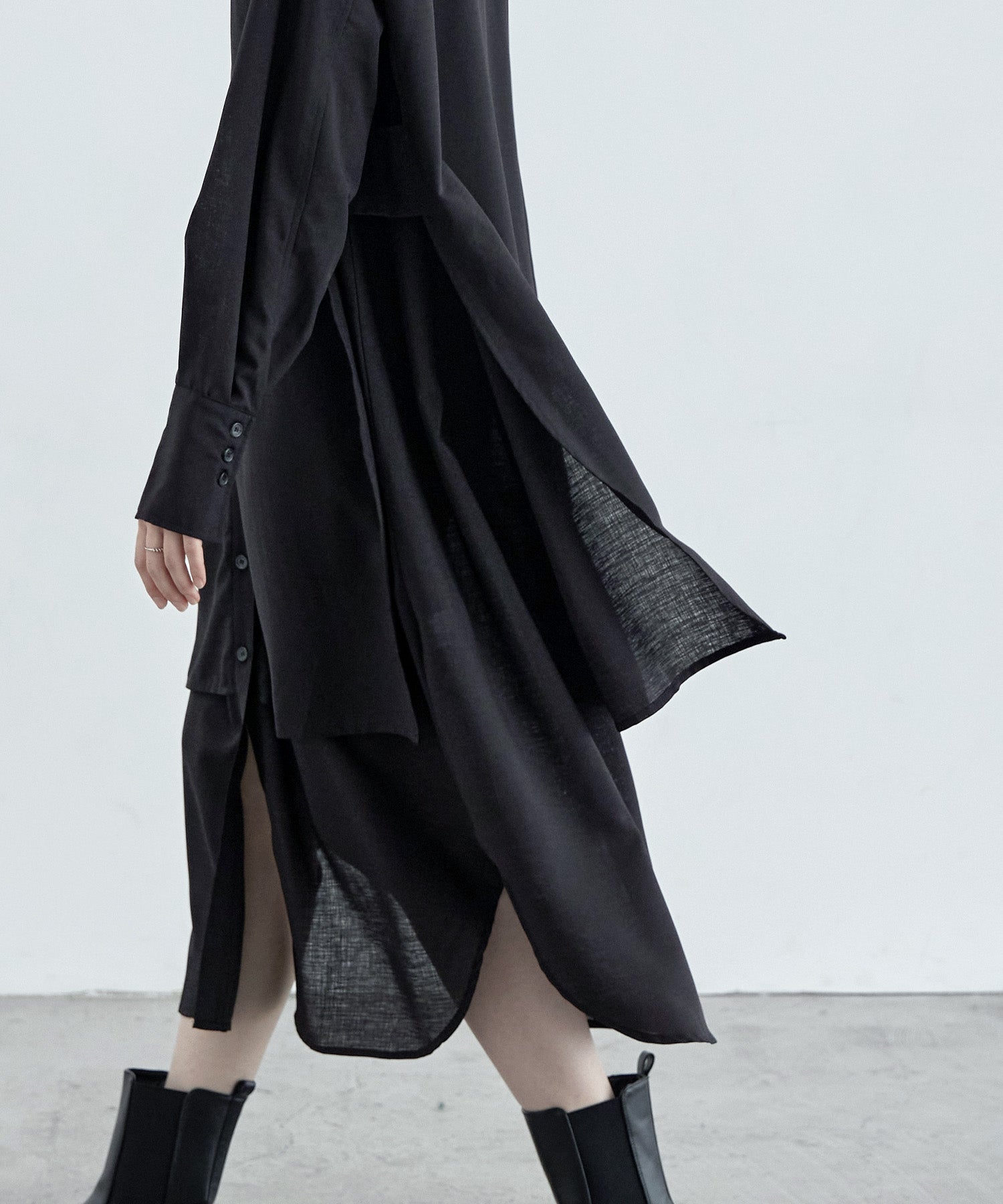 サイドスリット入りで足捌きも軽く、生地の程よい透け感と相まって動きのある表情を見せてくれます。