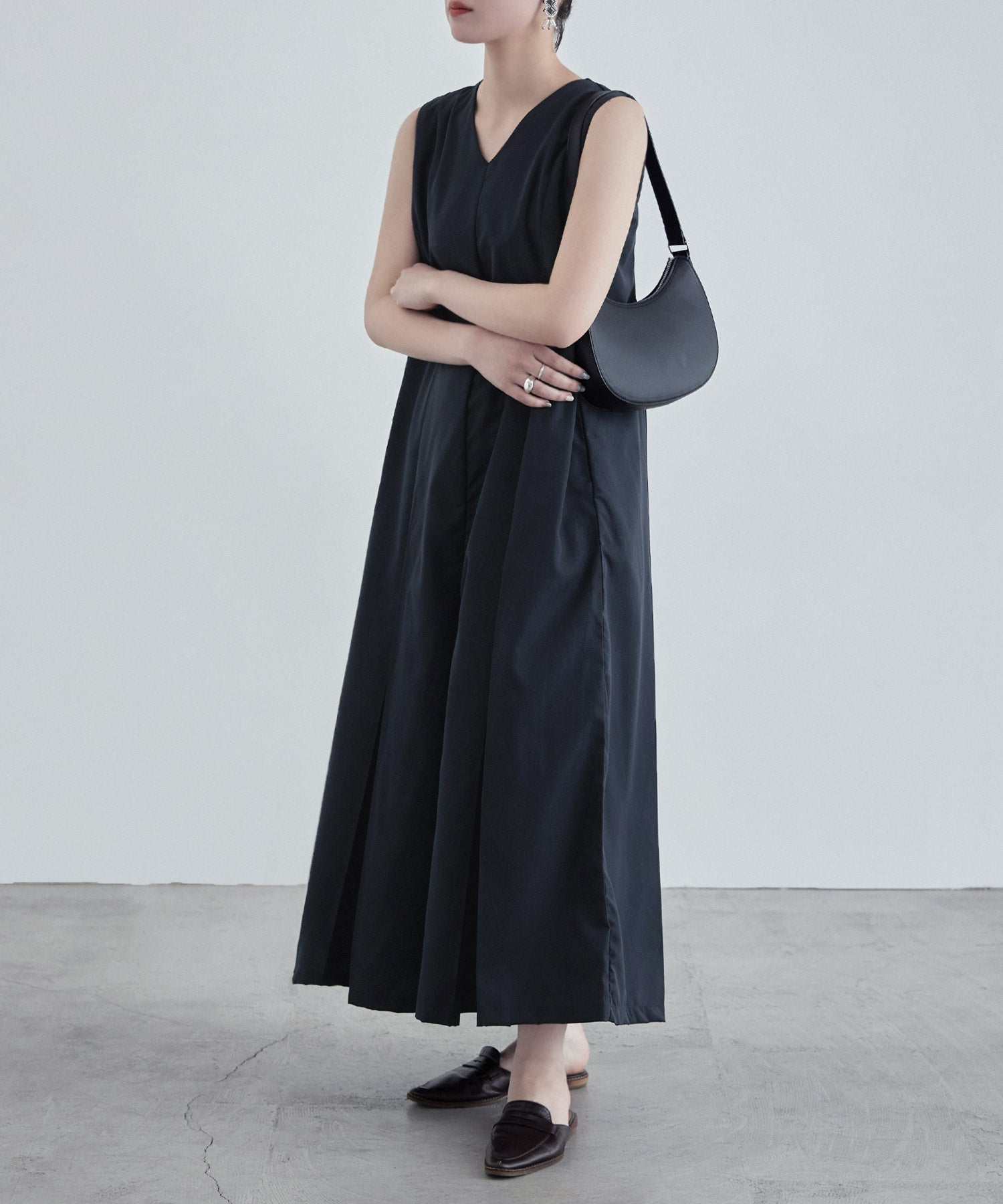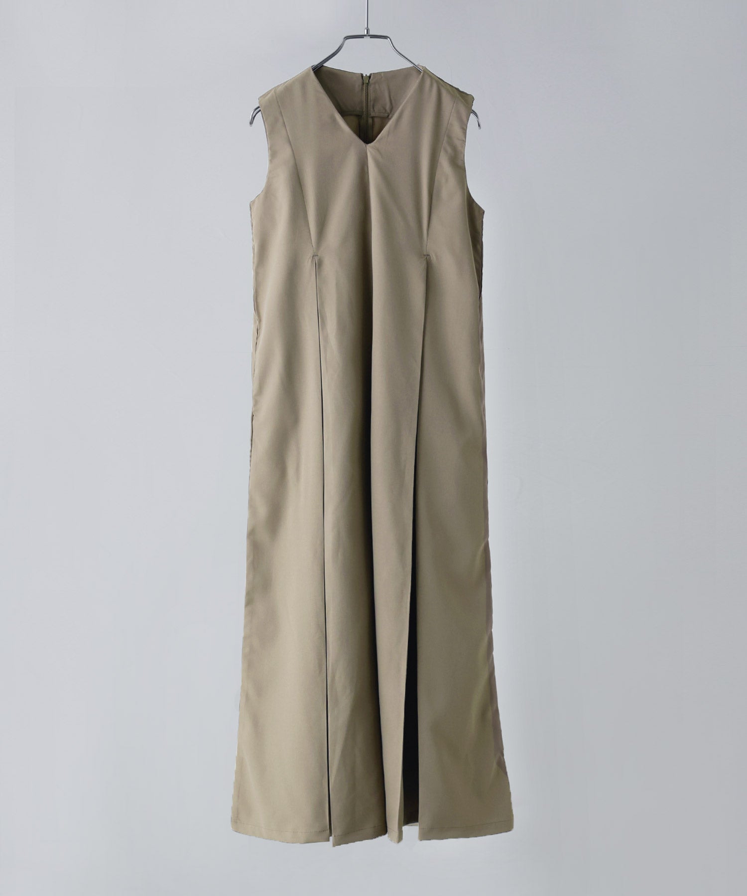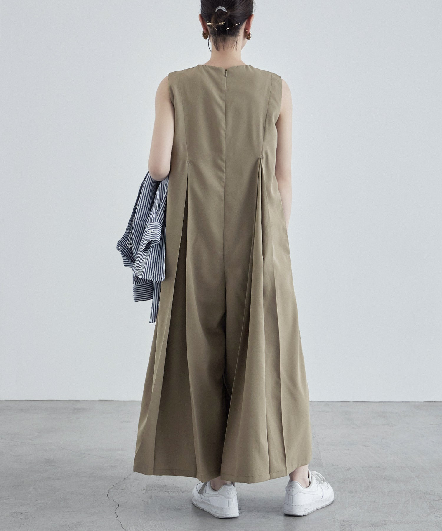 歩くたび広がるラインが美しい、スリーブレスのフレアオールインワン。