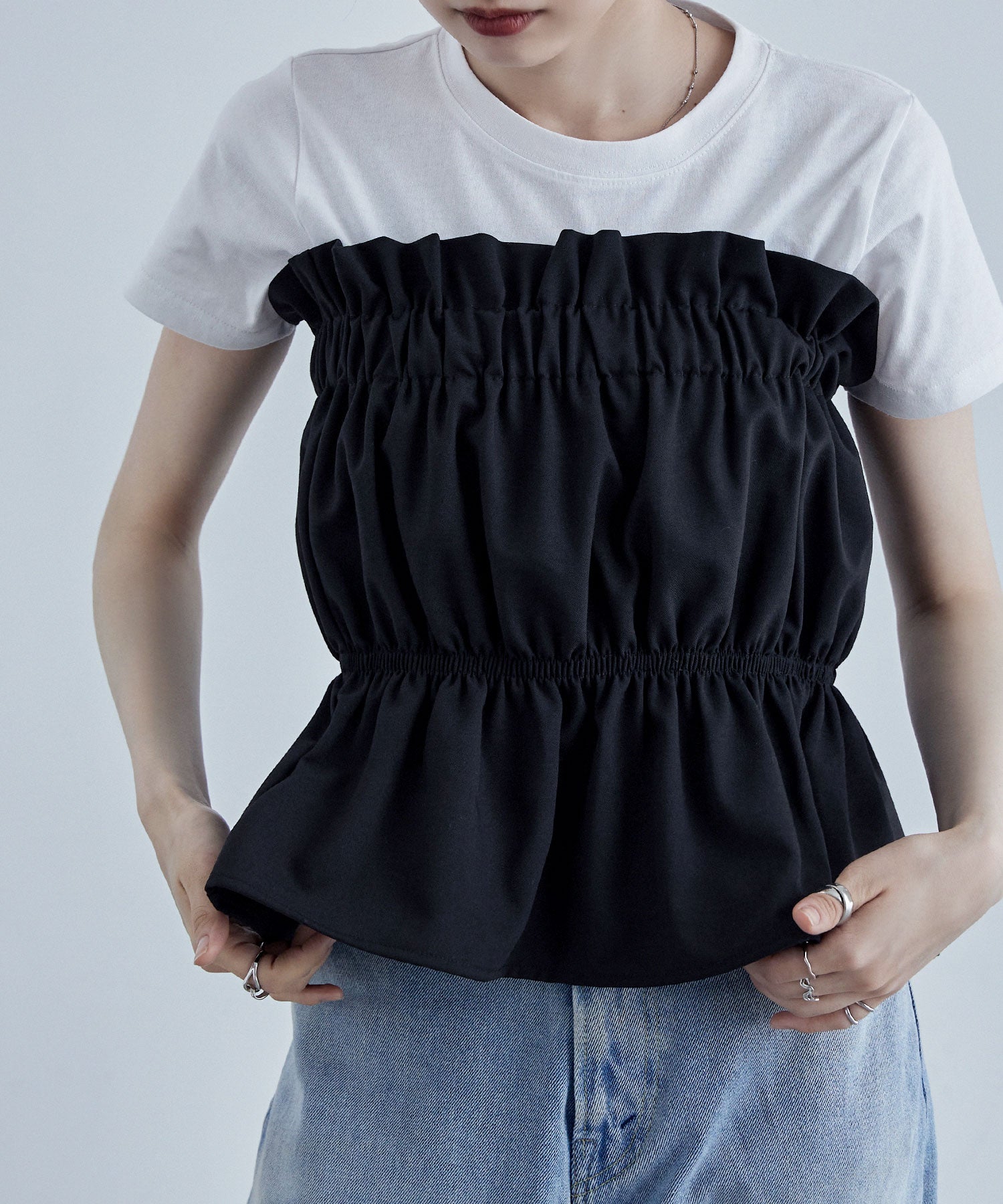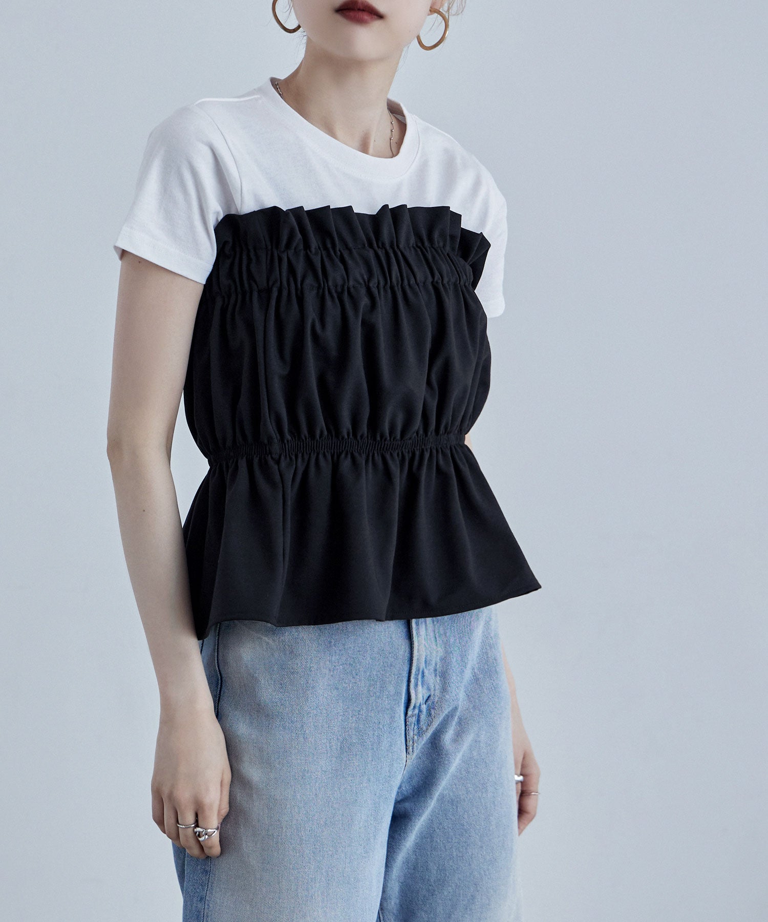 ギャザーでフリルとペプラムシルエットを作り、マニッシュなデニムやワイドパンツといったカジュアルボトムで中和すれば、大人らしい可愛いが完成。