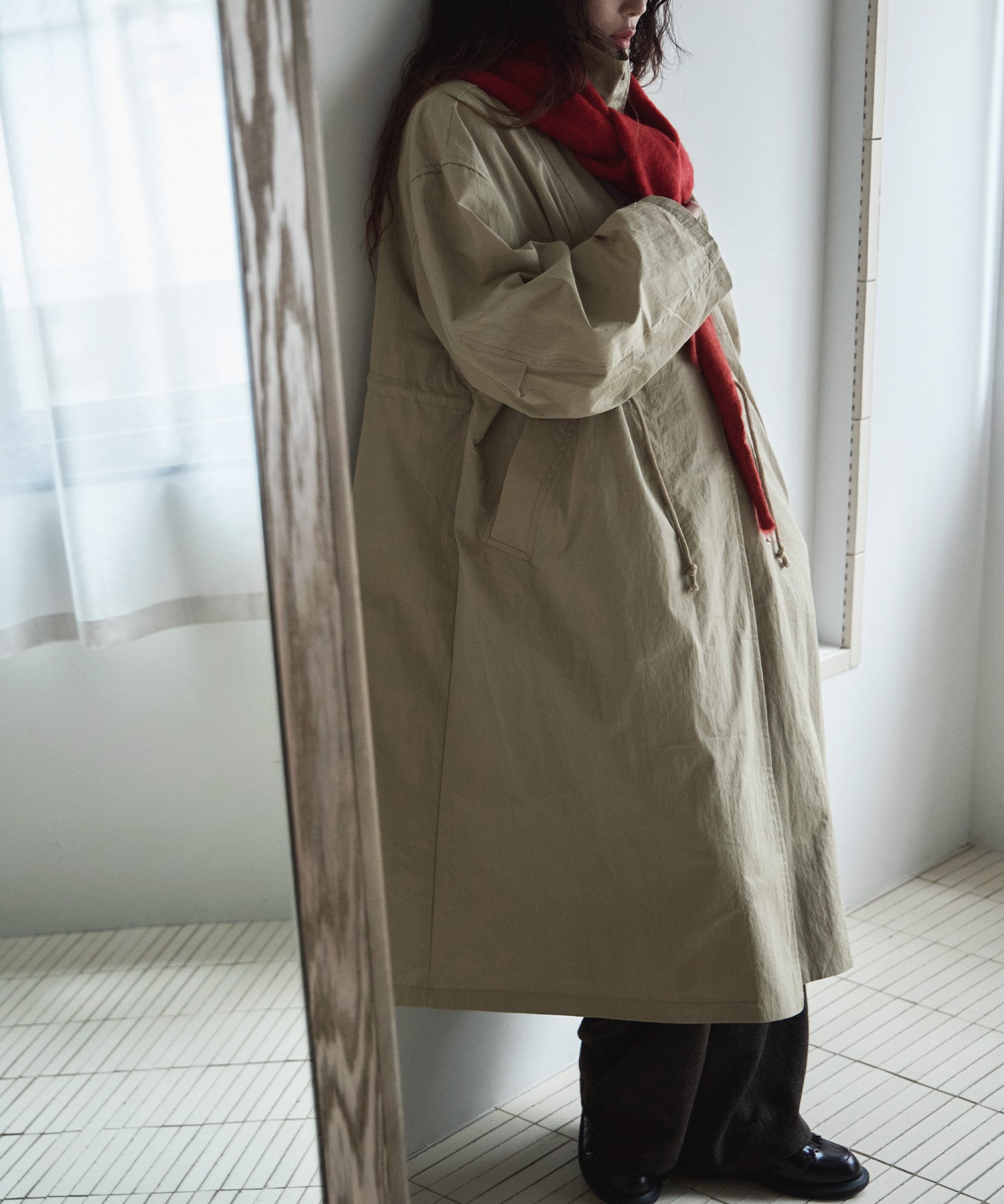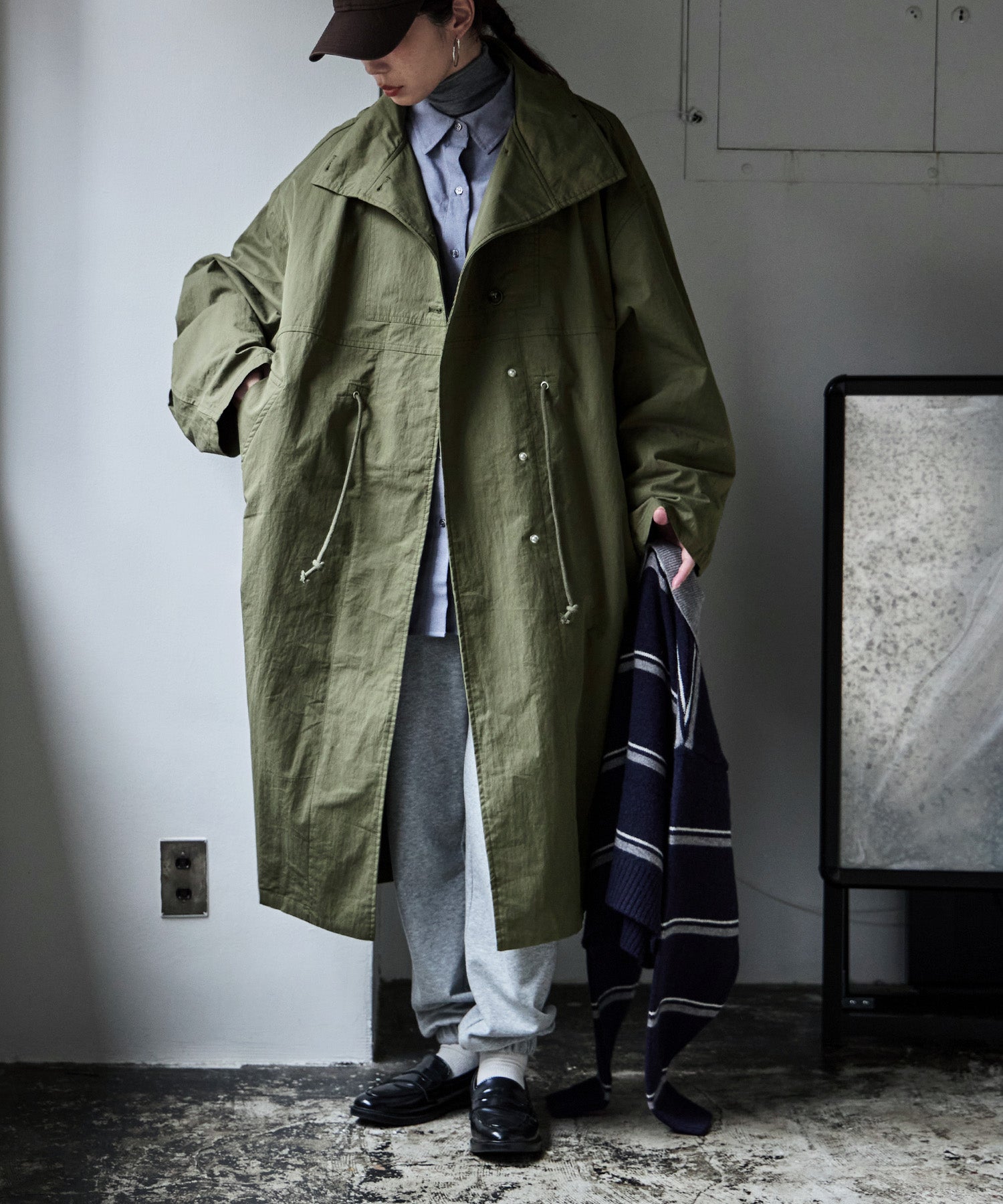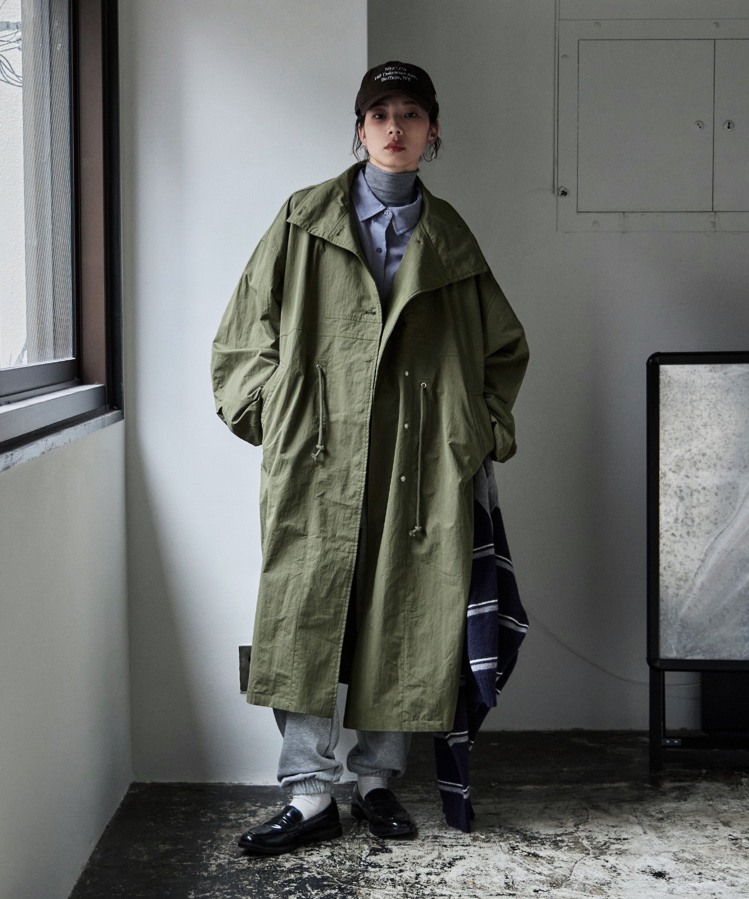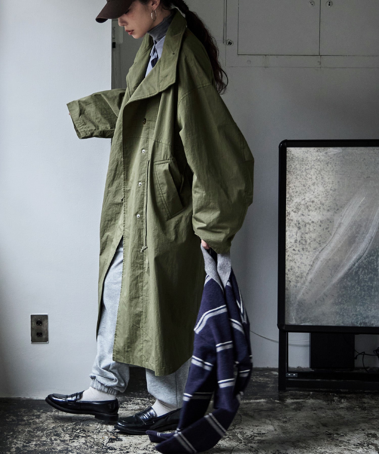 しっかり襟を立てて着ても、倒して着ても首元のアクセントになり、品よくカジュアルなスタイリングに整えてくれるスタンドカラーコート。