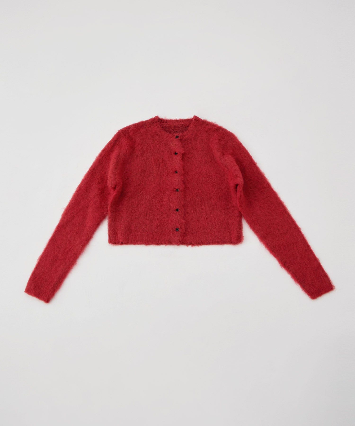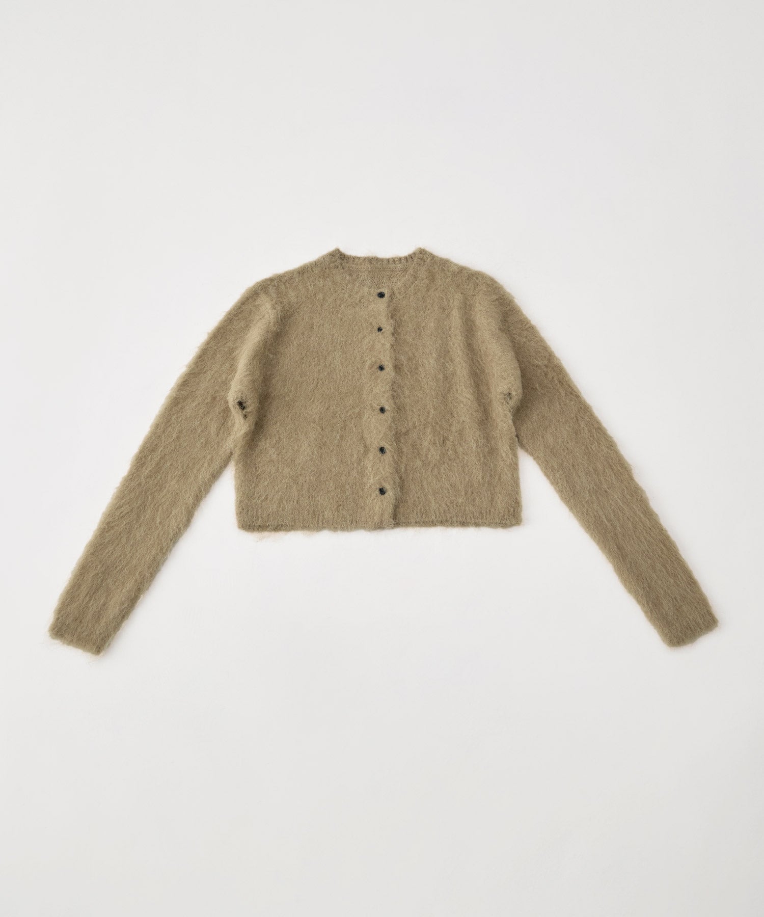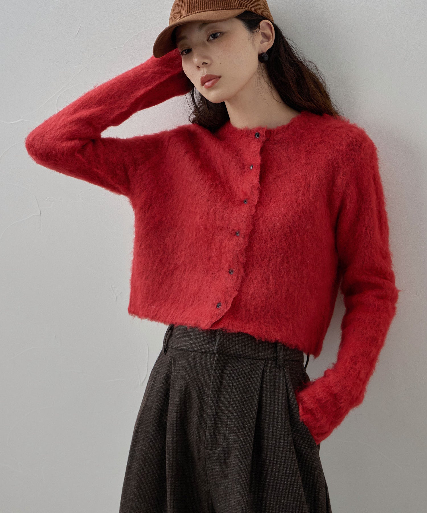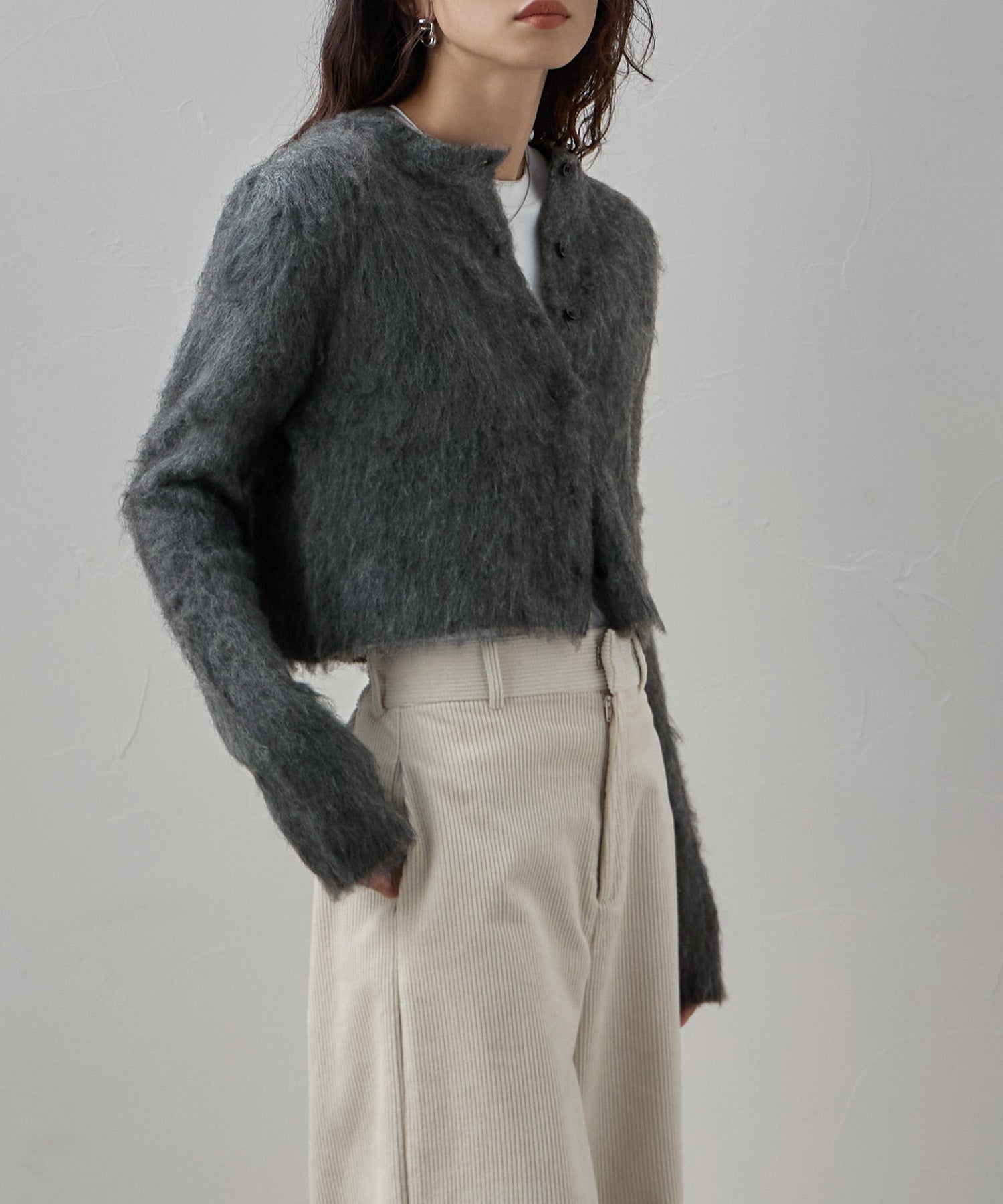 モヘアタッチの柔らかな起毛糸で仕立てた、クロップドニットカーディガン。