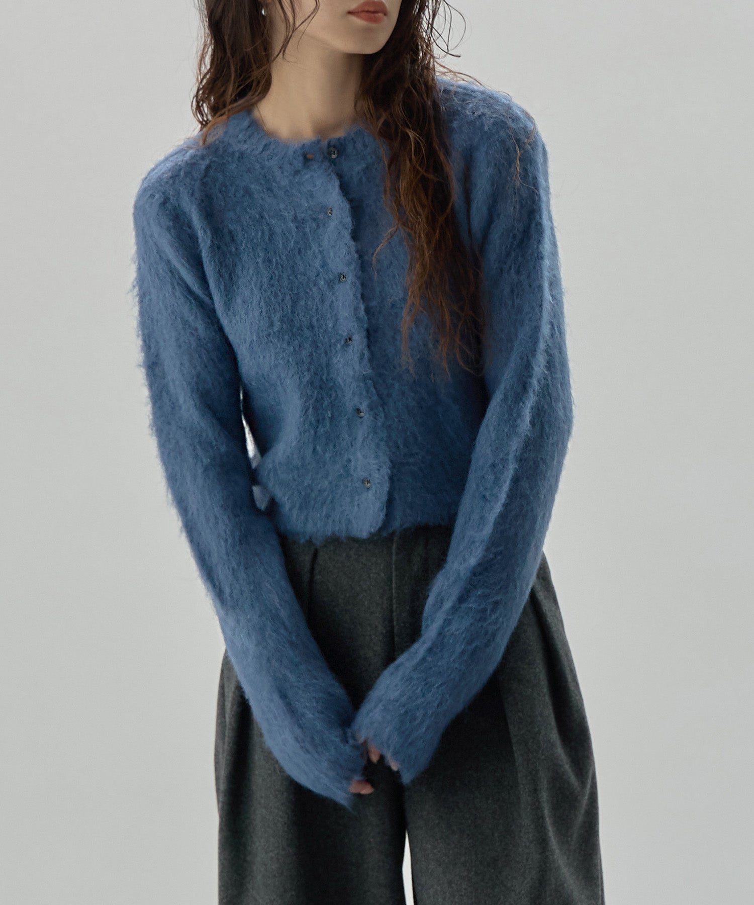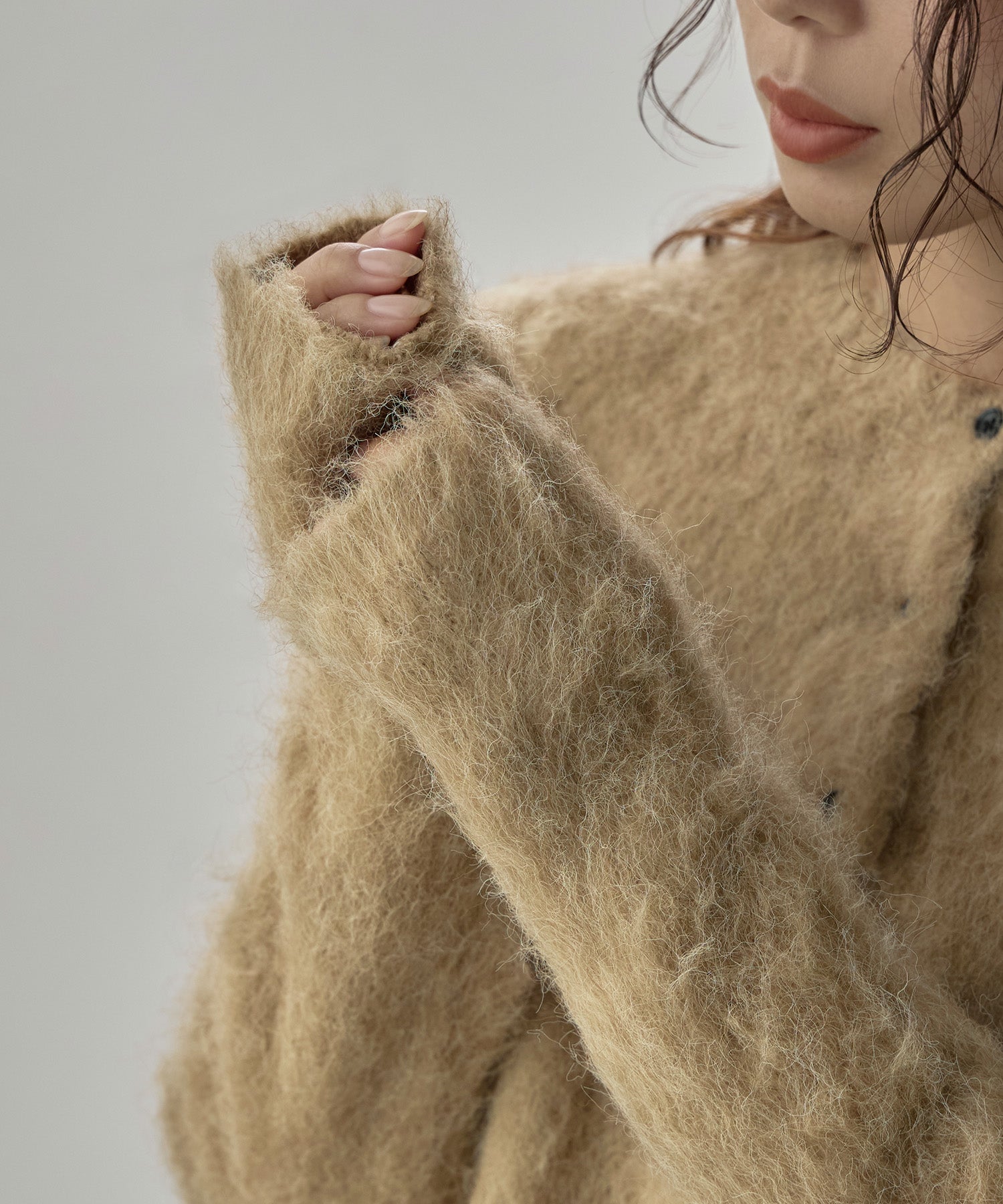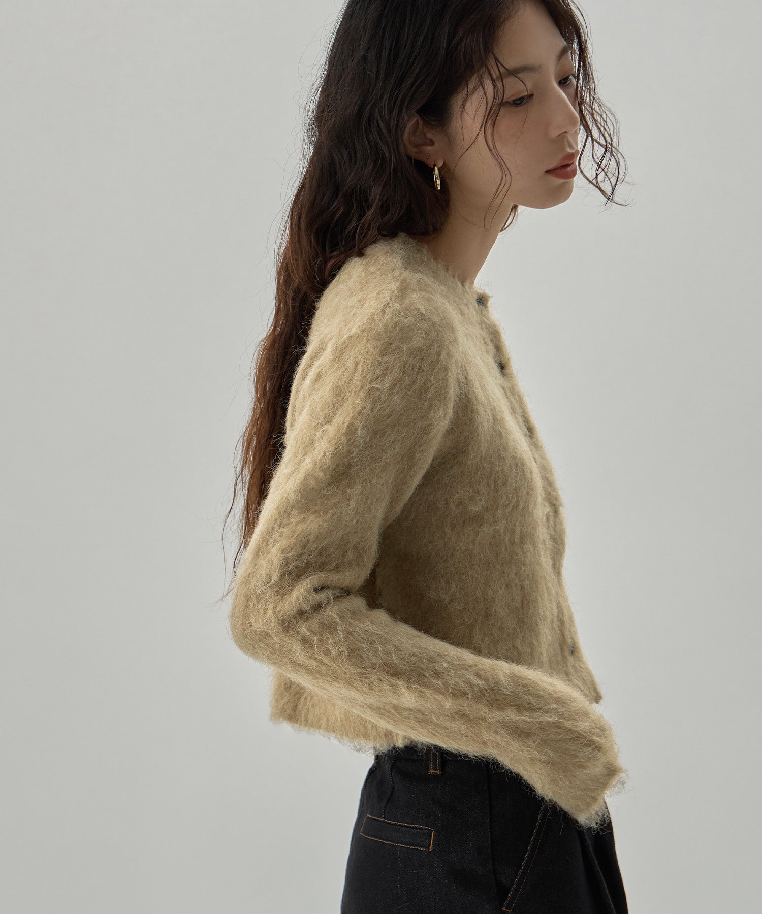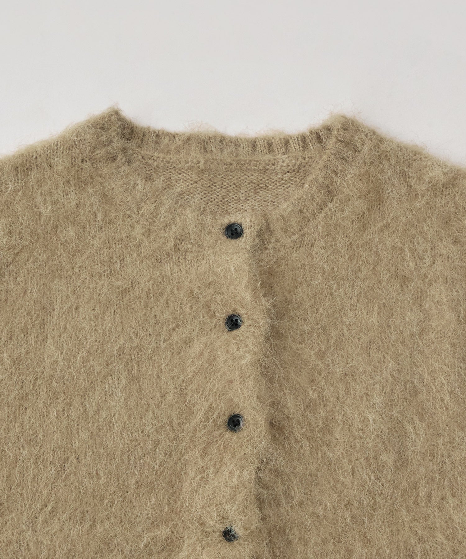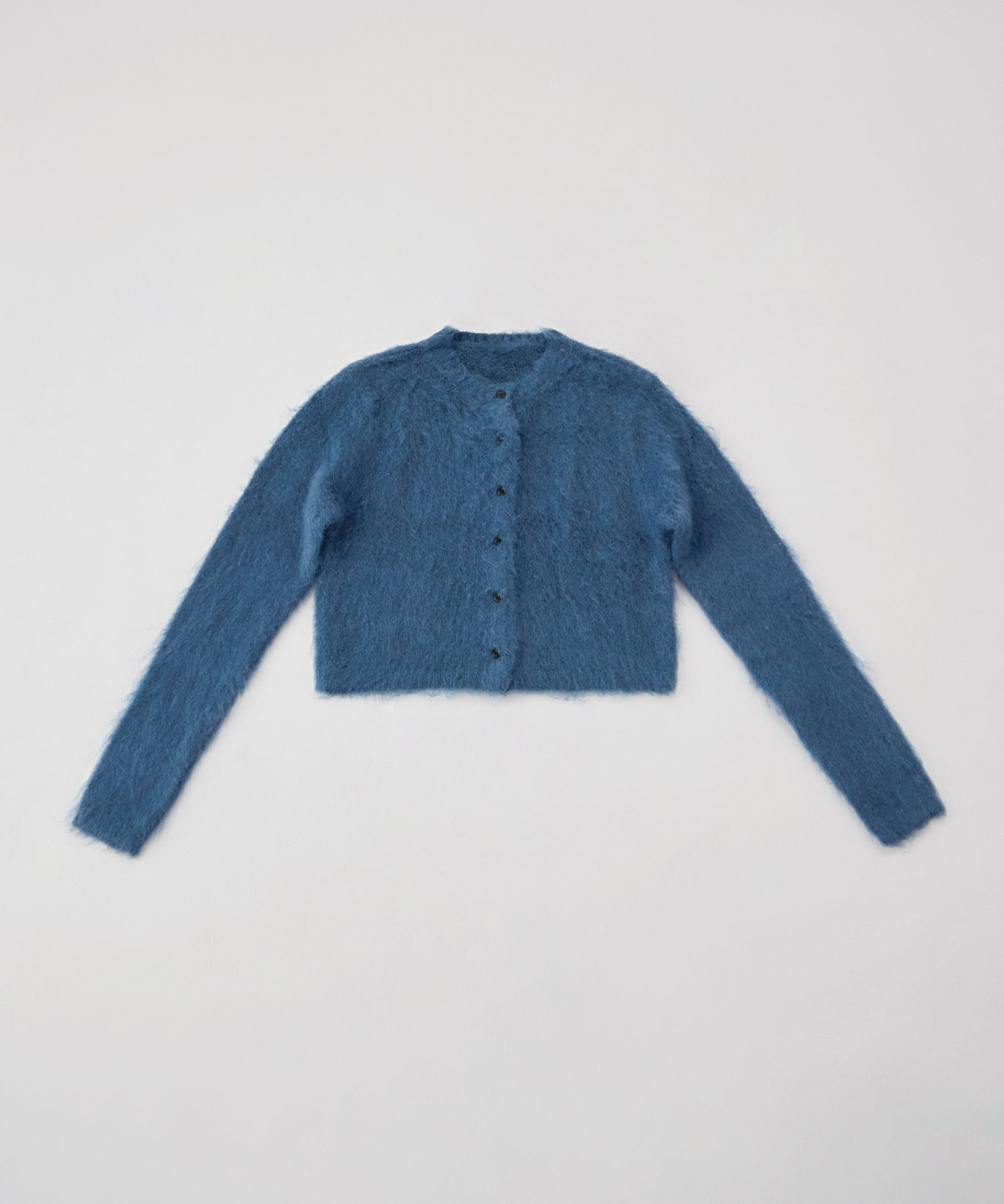 モヘアタッチの柔らかな起毛糸で仕立てた、クロップドニットカーディガン。