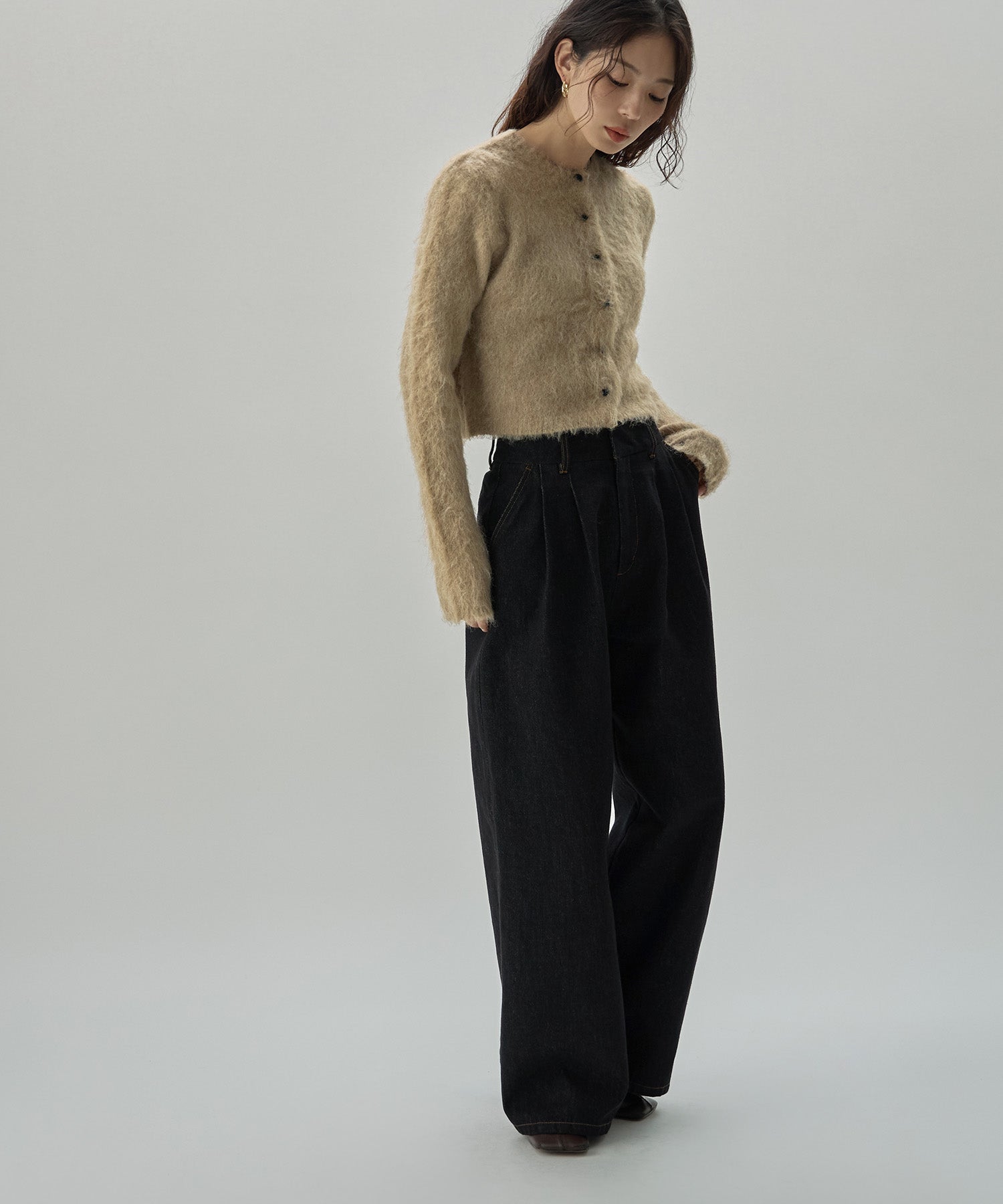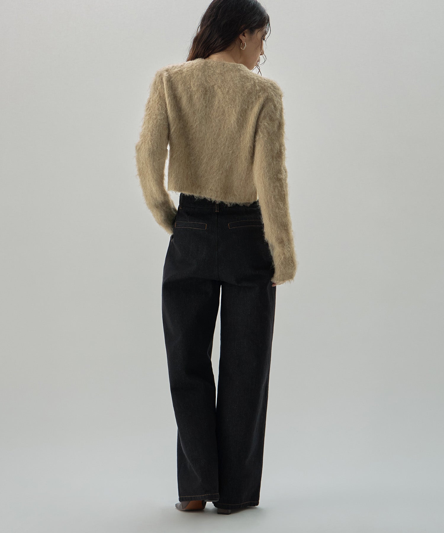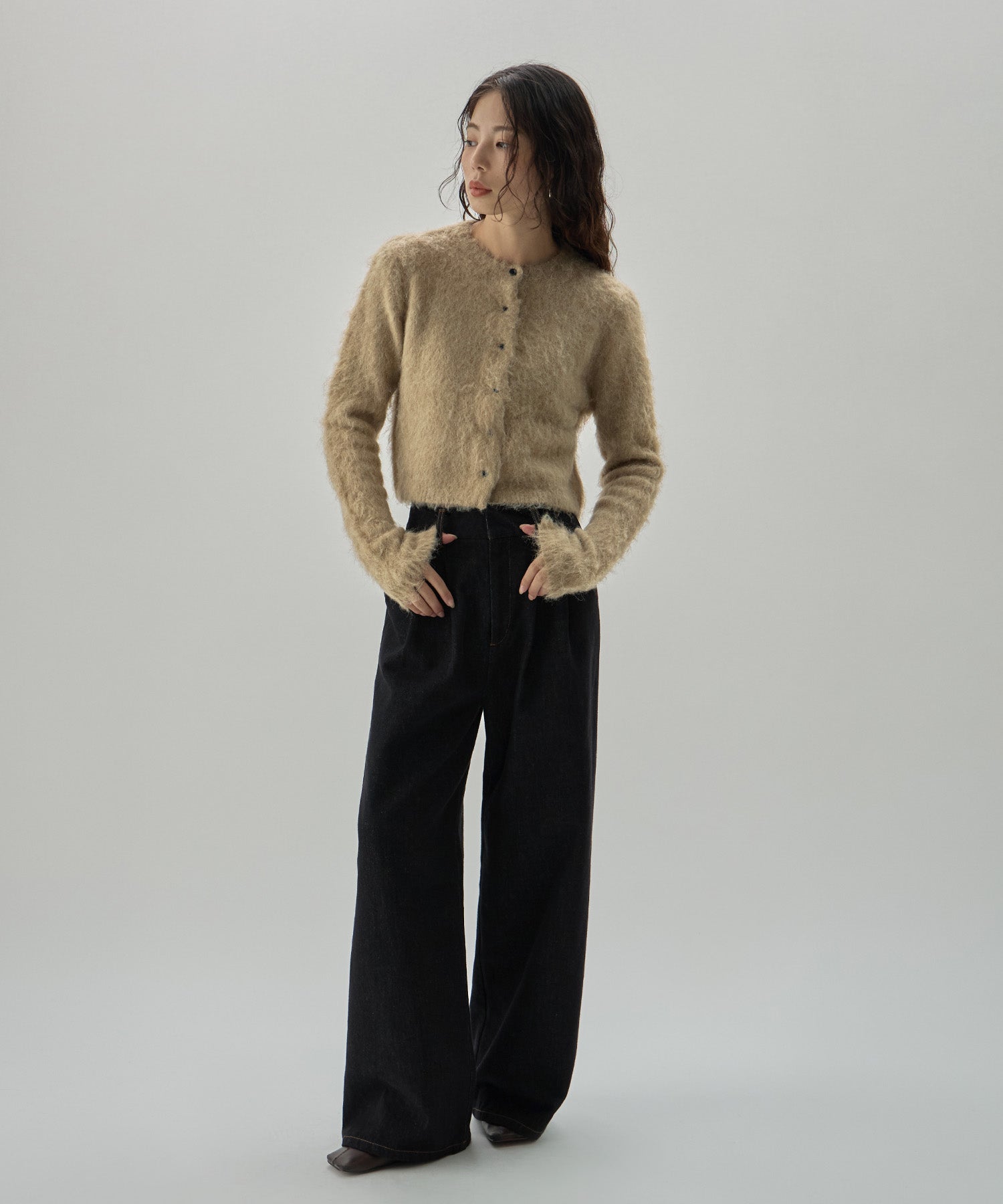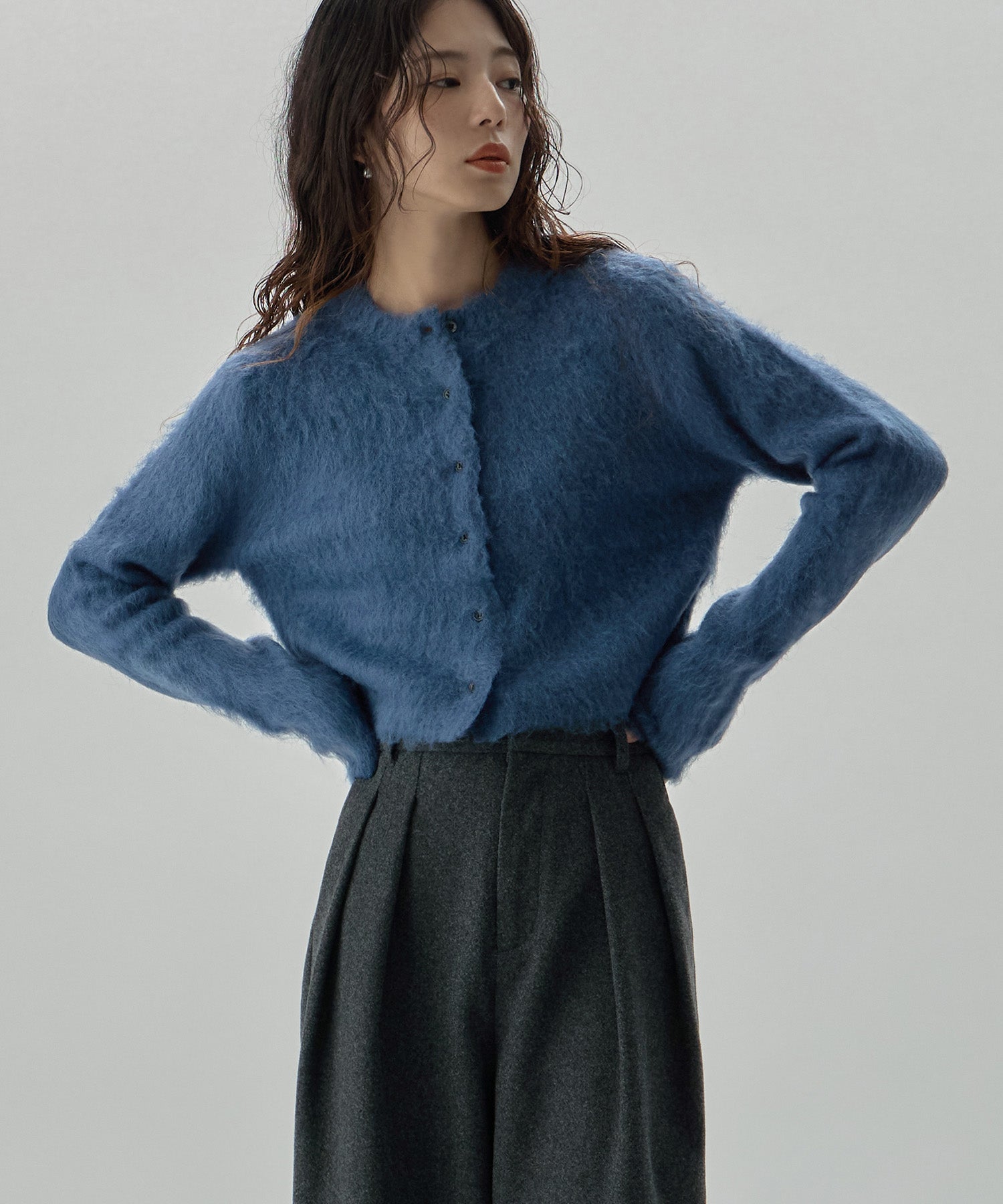 モヘアタッチの柔らかな起毛糸で仕立てた、クロップドニットカーディガン。