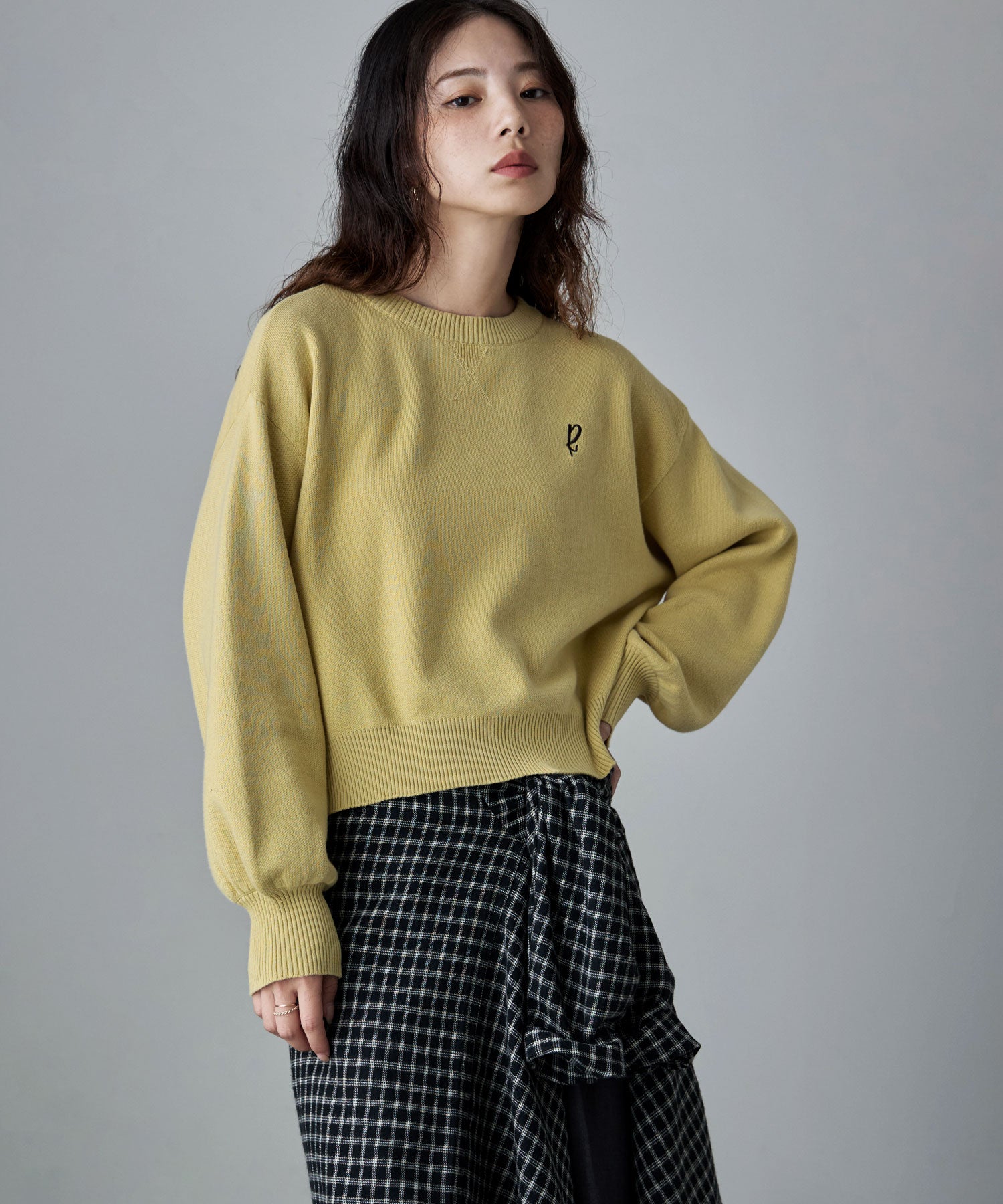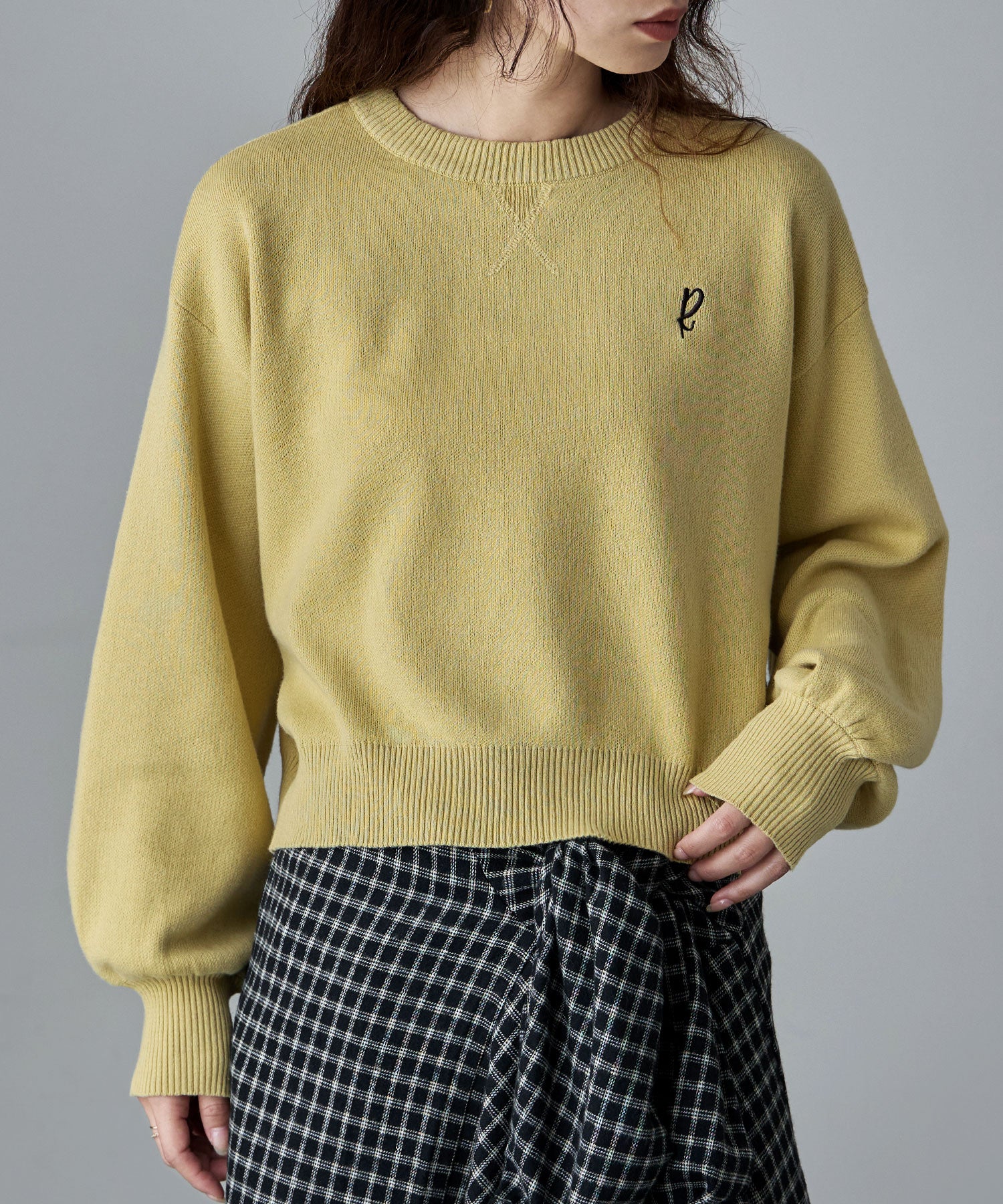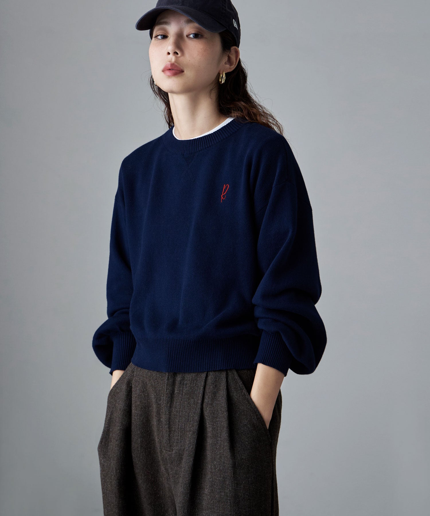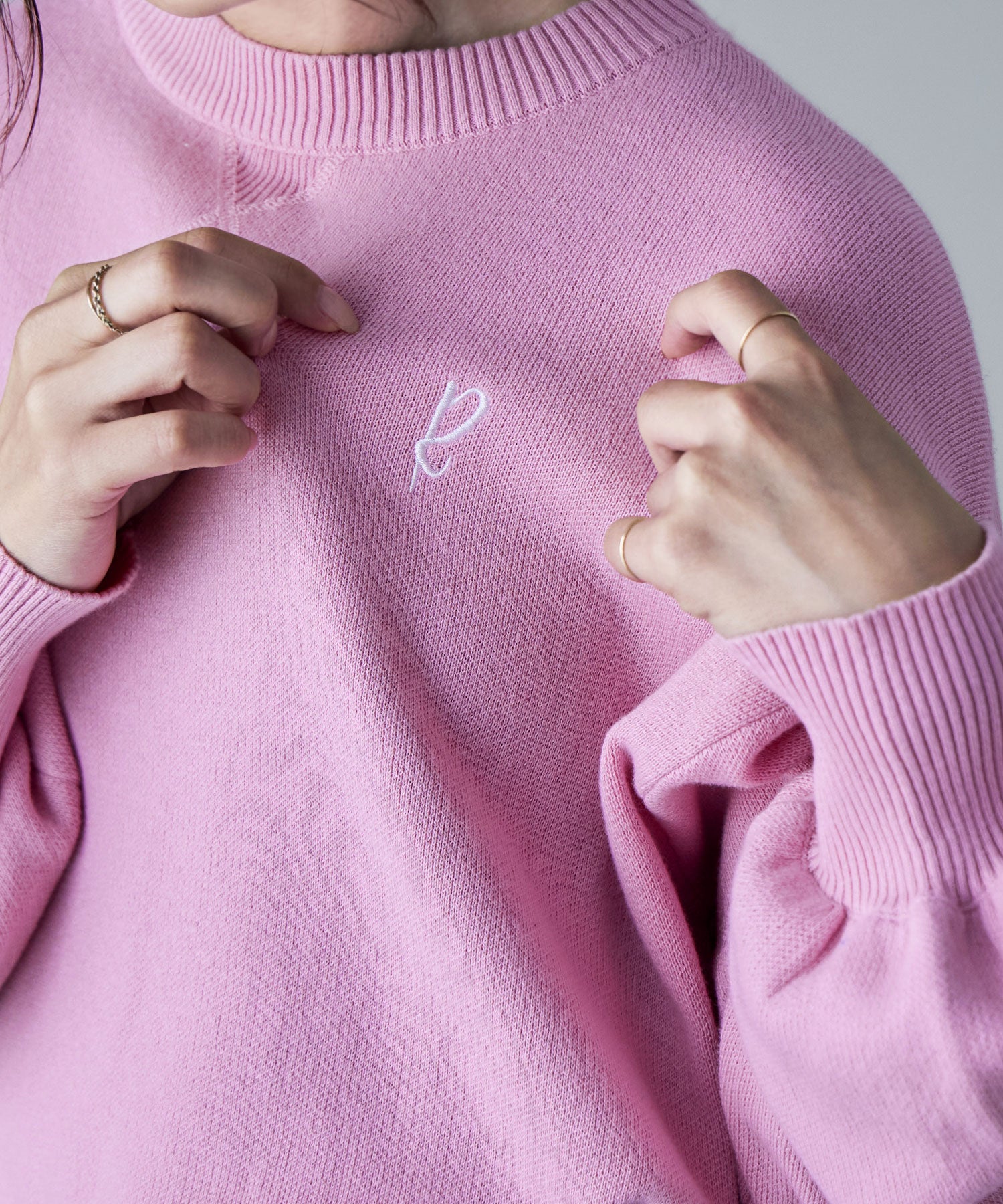 Rname スウェットライク刺繍ロゴニット トップス ニット セーター 長袖 スウェット カラーニット クルーネック ロゴ ショート丈 ビッグシルエット ゆったり クロップド オーバーサイズ 無地