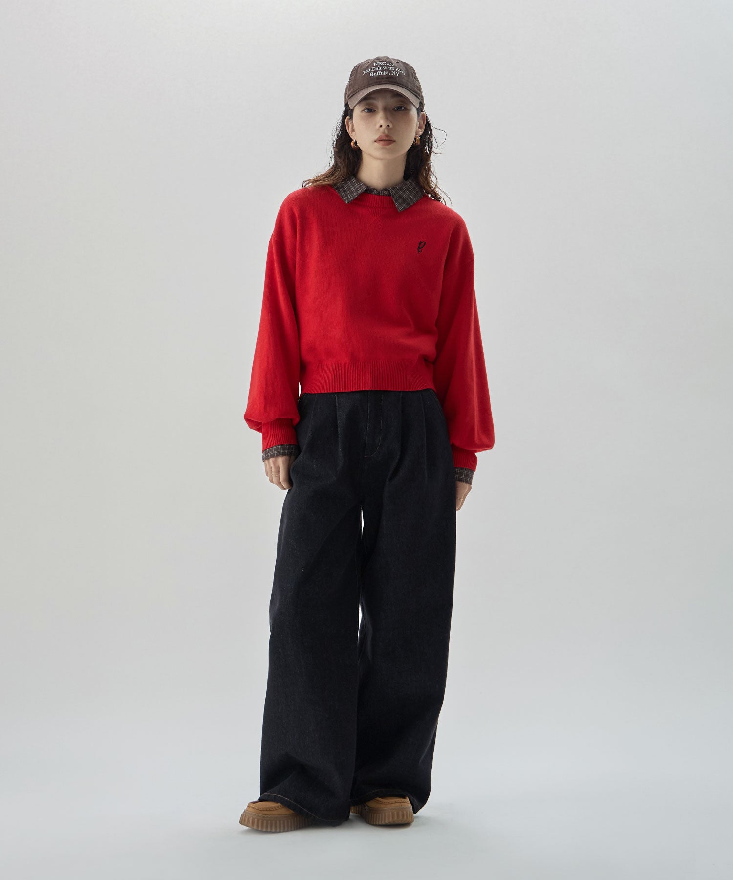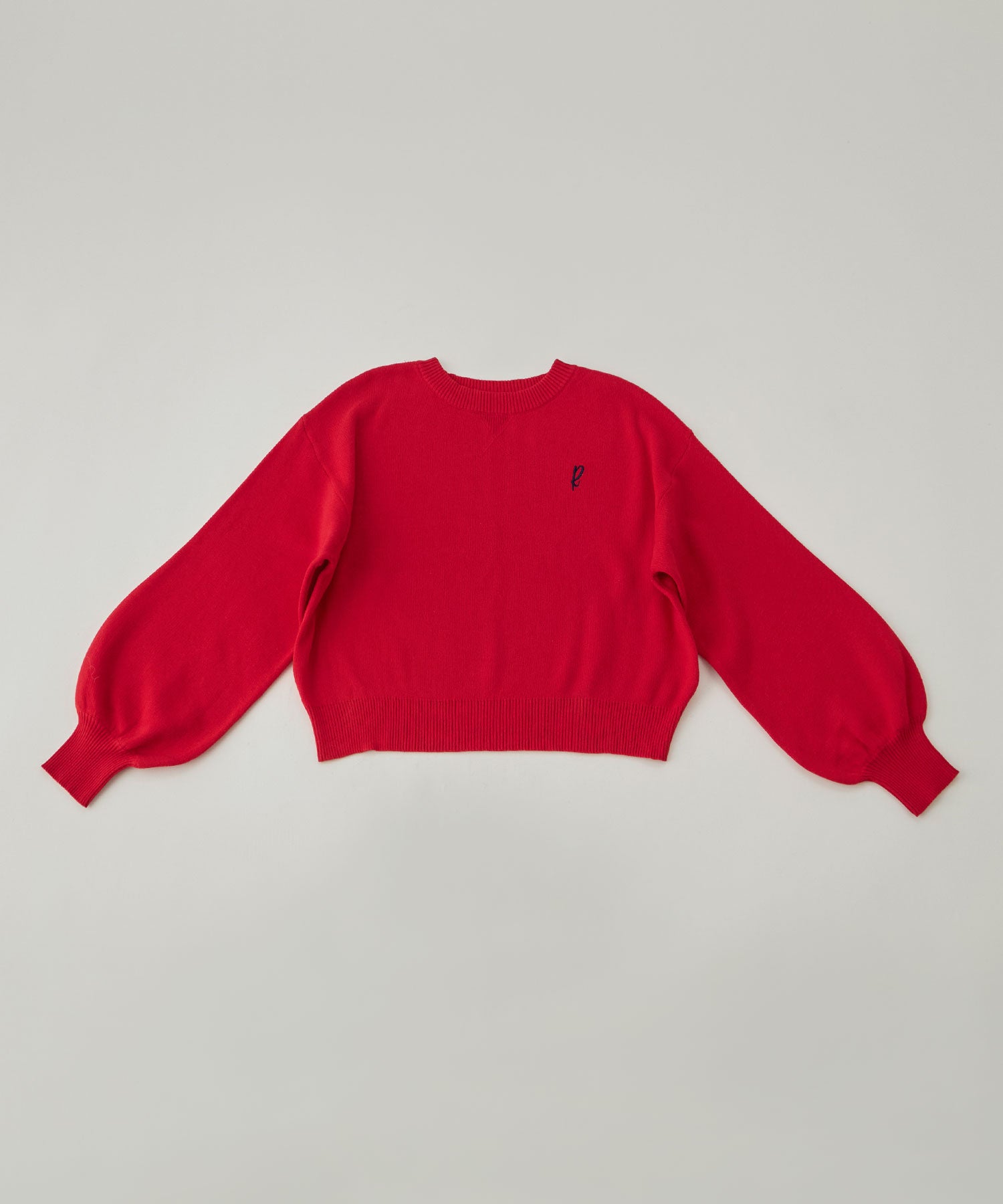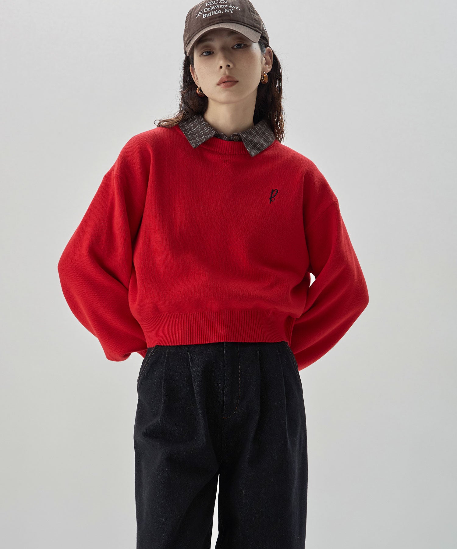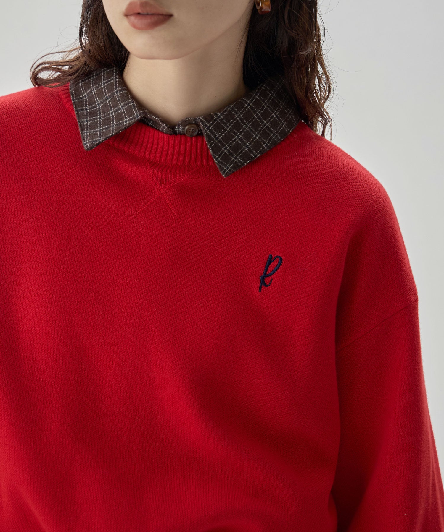 Rname スウェットライク刺繍ロゴニット トップス ニット セーター 長袖 スウェット カラーニット クルーネック ロゴ ショート丈 ビッグシルエット ゆったり クロップド オーバーサイズ 無地