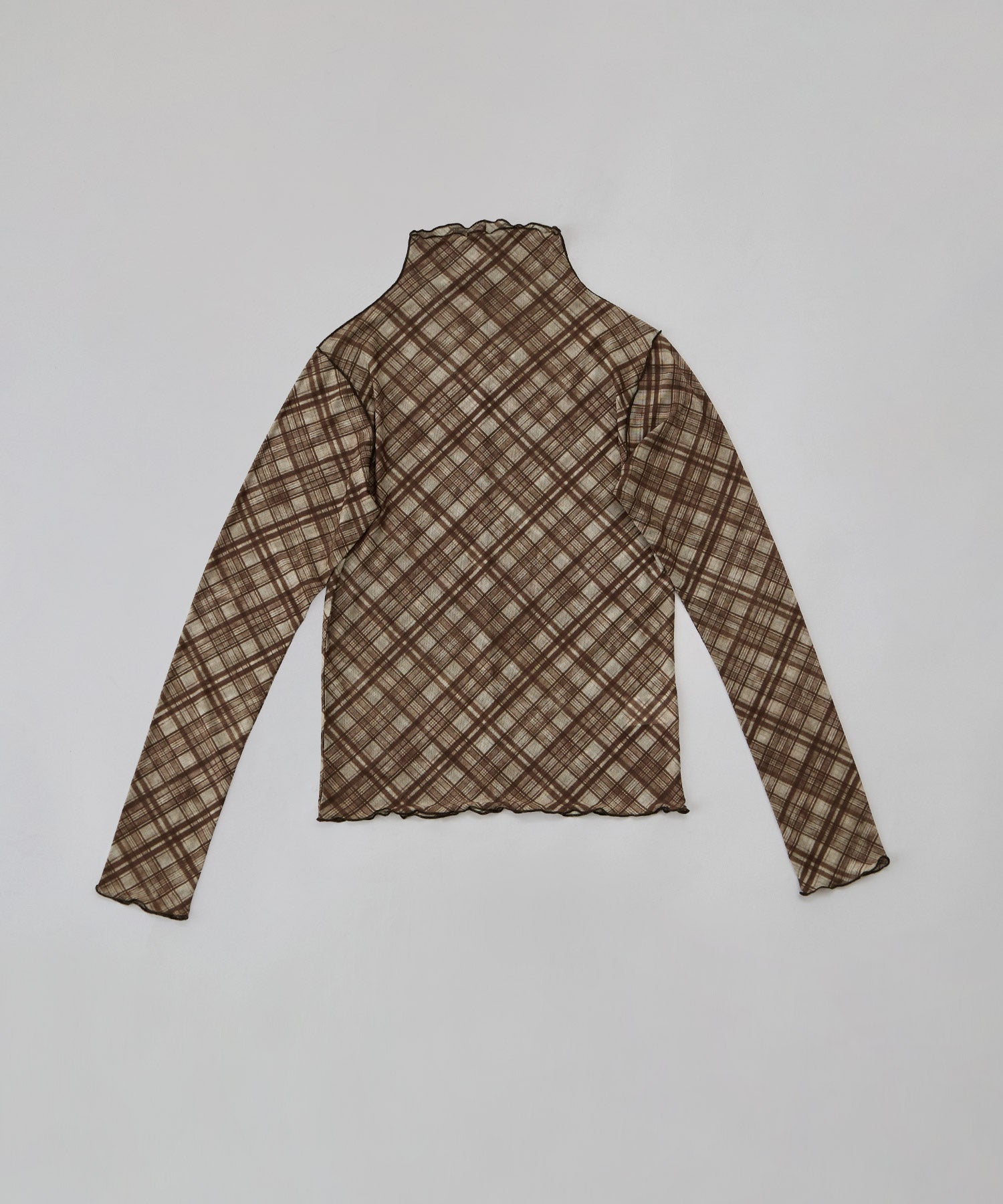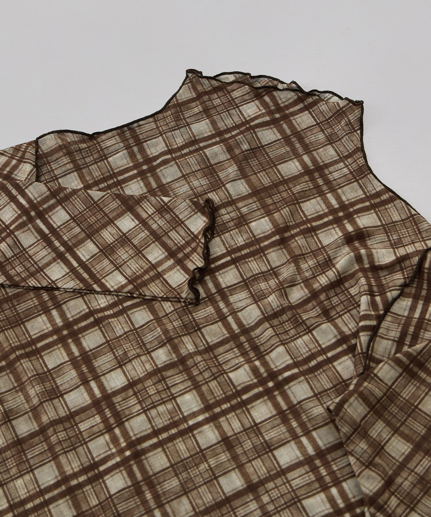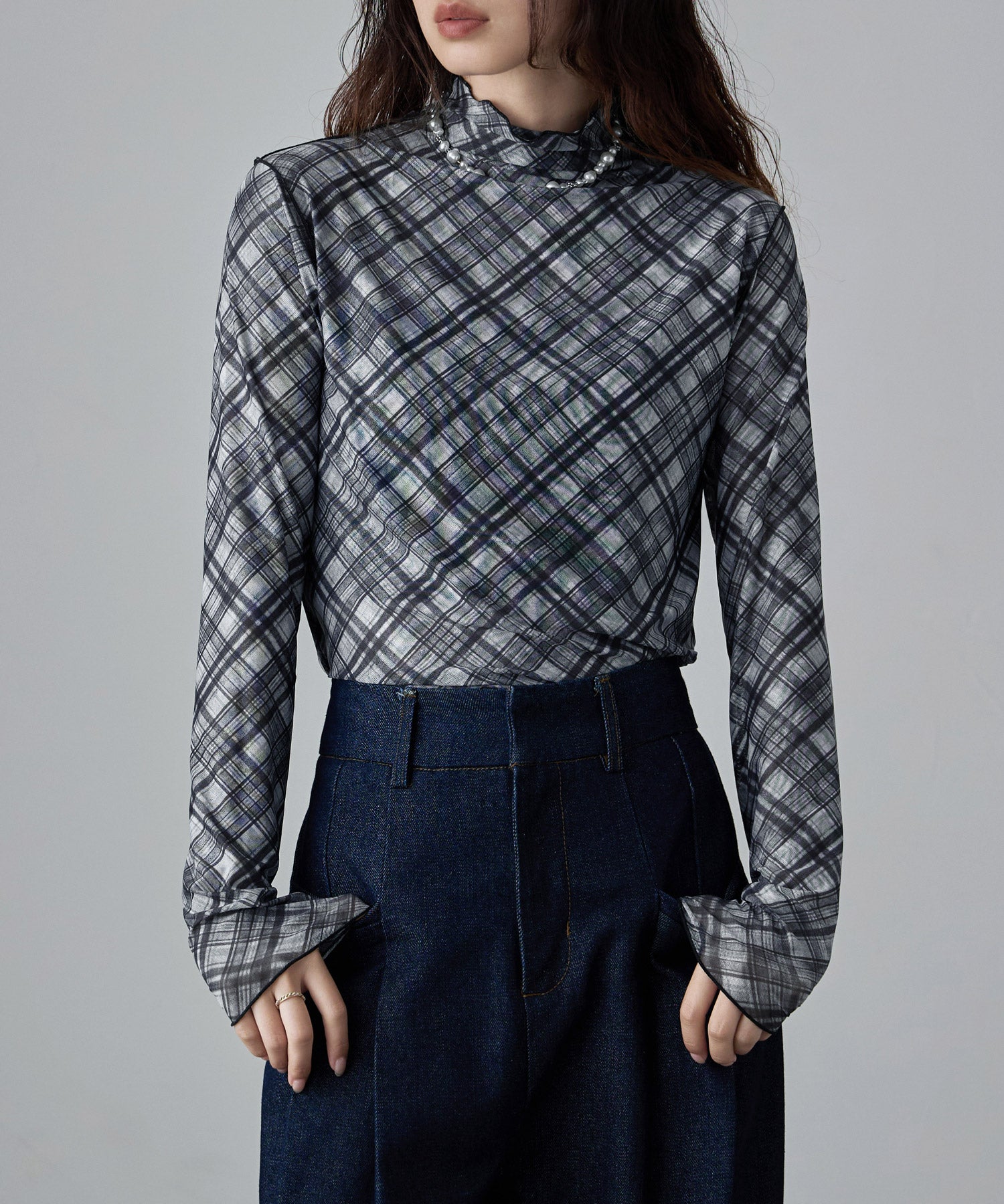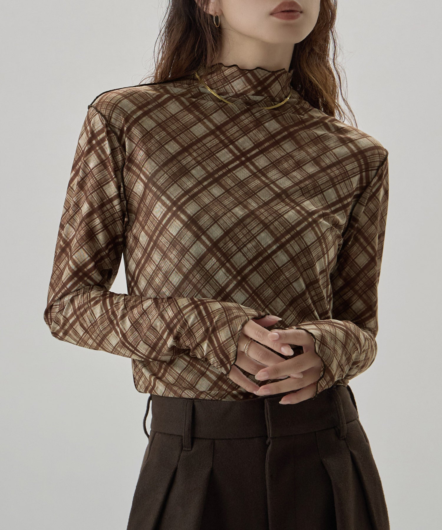 Zname チェック柄シアーボトルネックトップス
