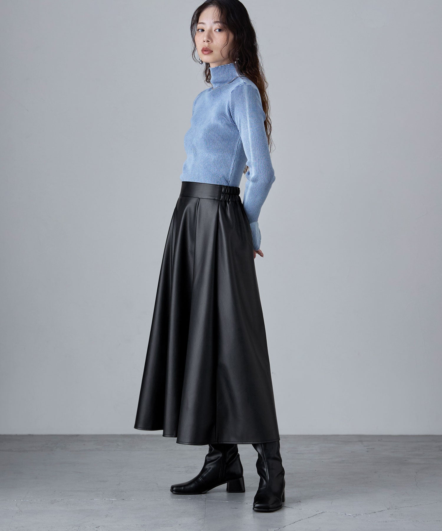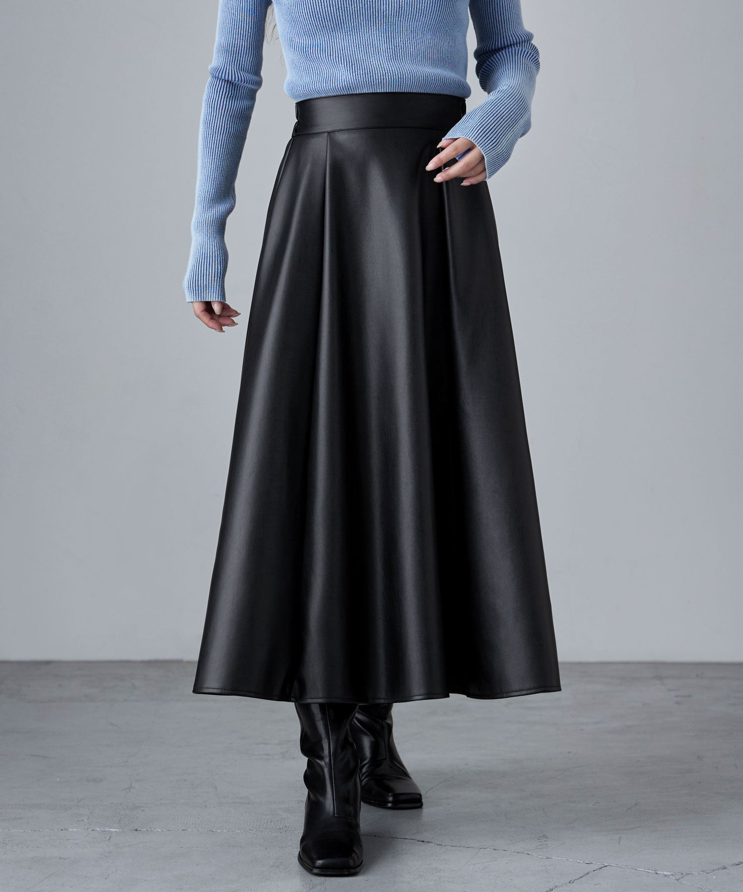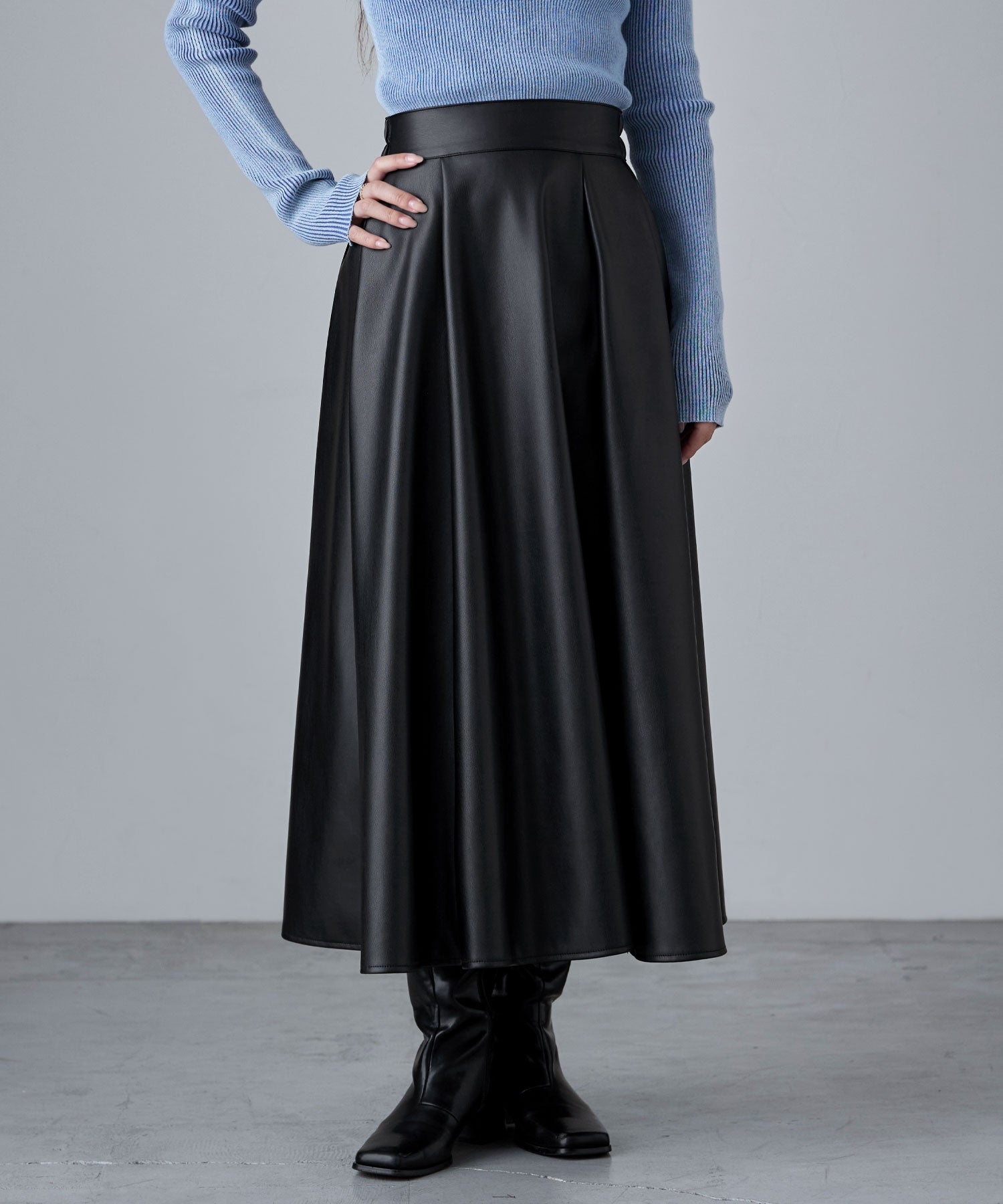 「メンズっぽくないレザー」としてとり入れたいから、やさしくも強い女らしさを感じさせる、フレアスカートで。