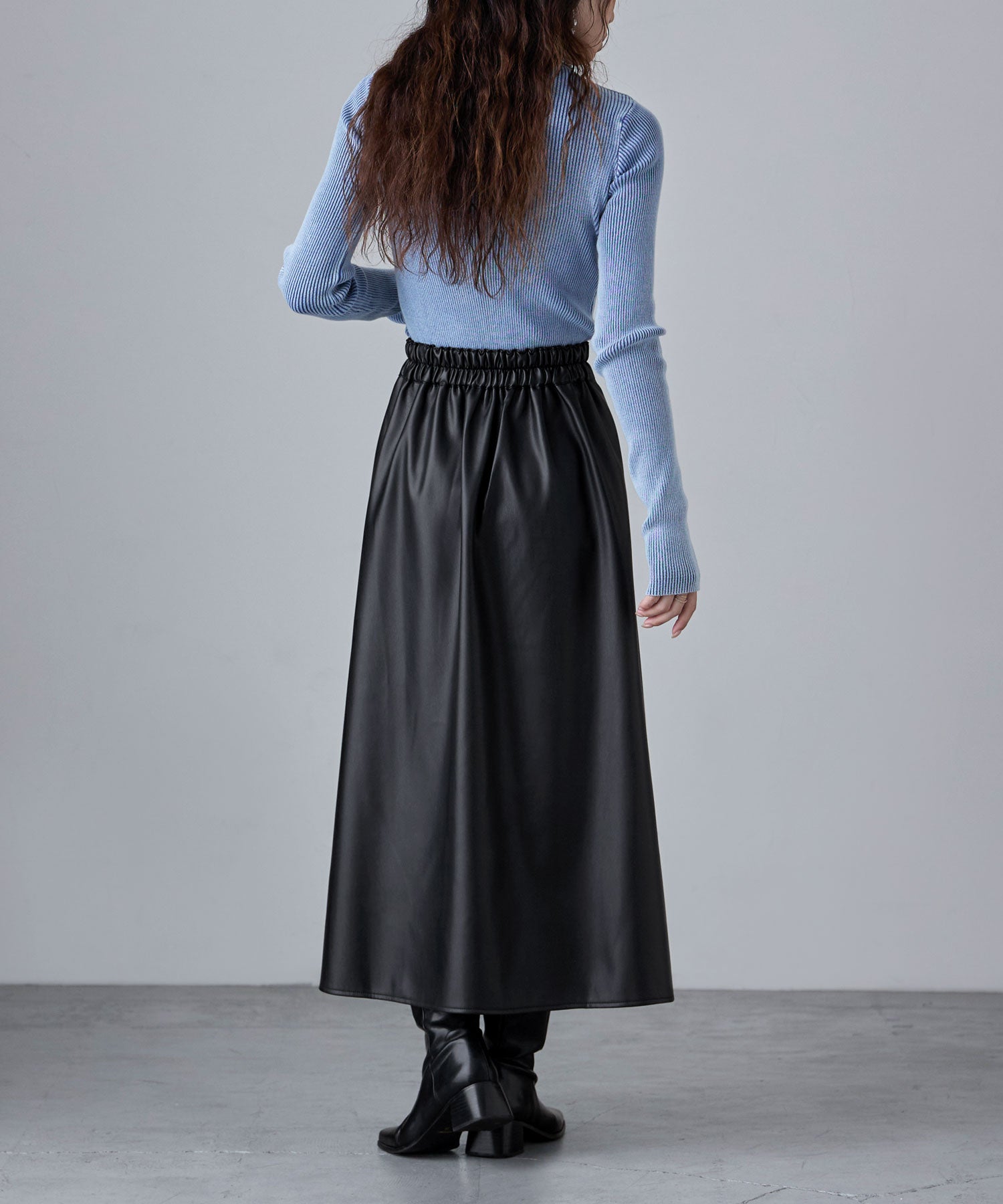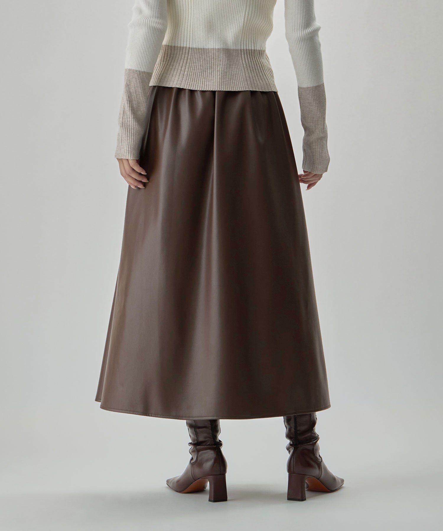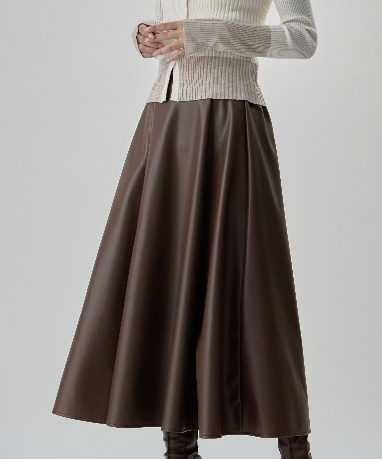「メンズっぽくないレザー」としてとり入れたいから、やさしくも強い女らしさを感じさせる、フレアスカートで。