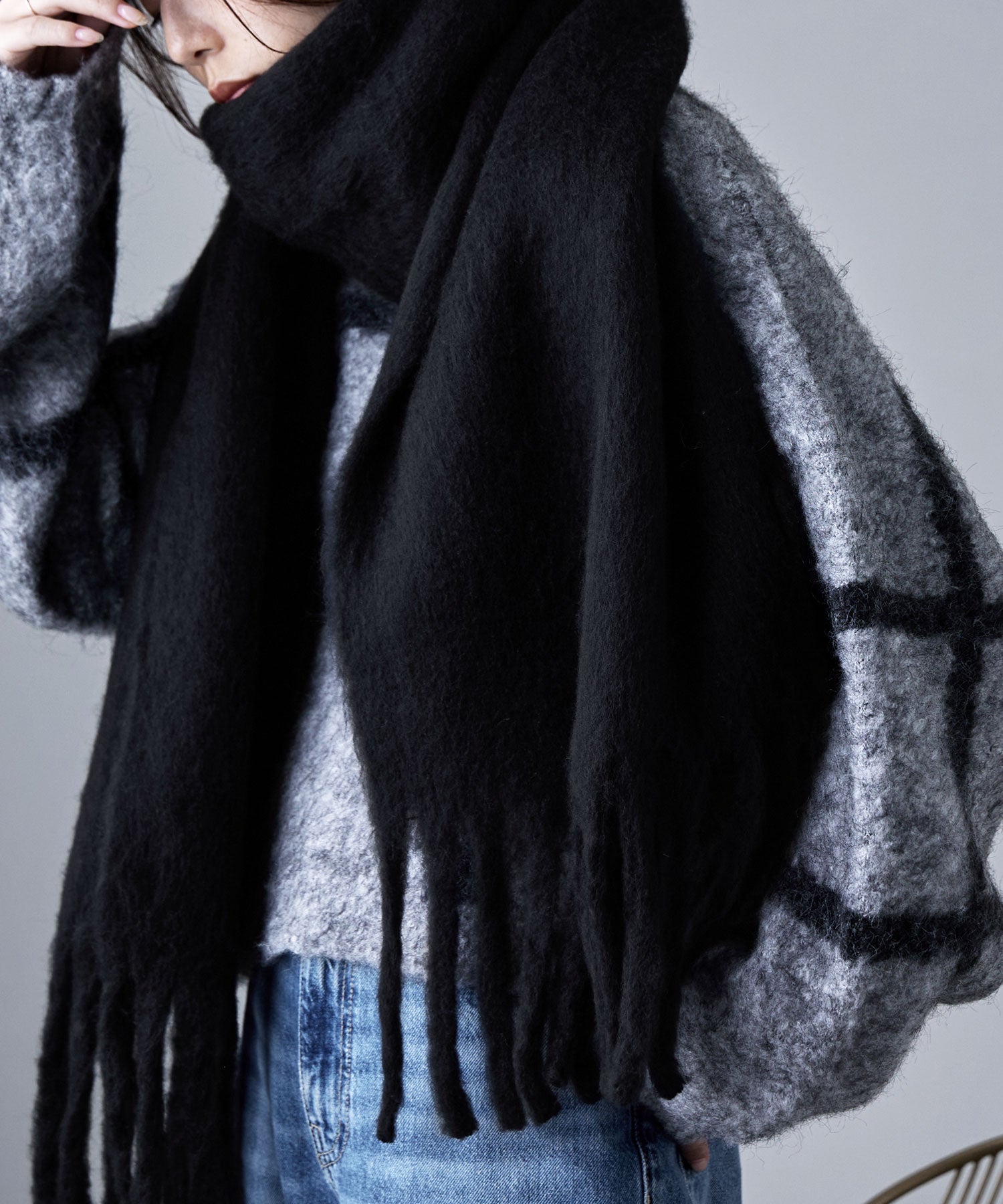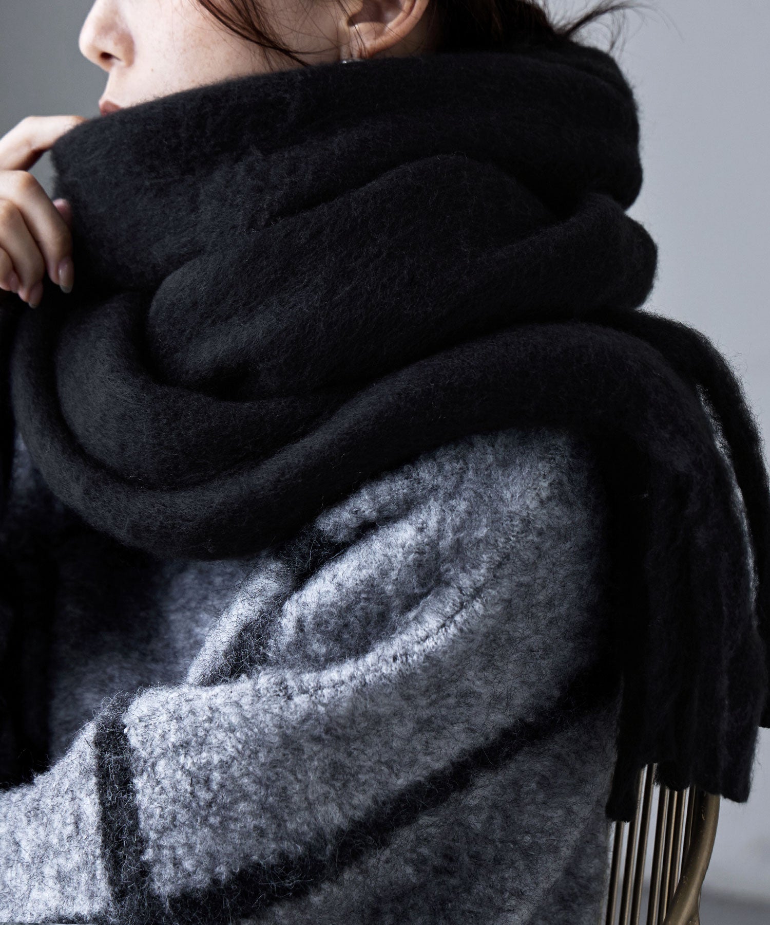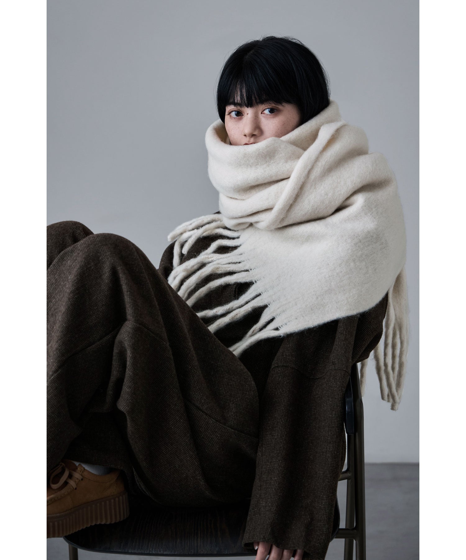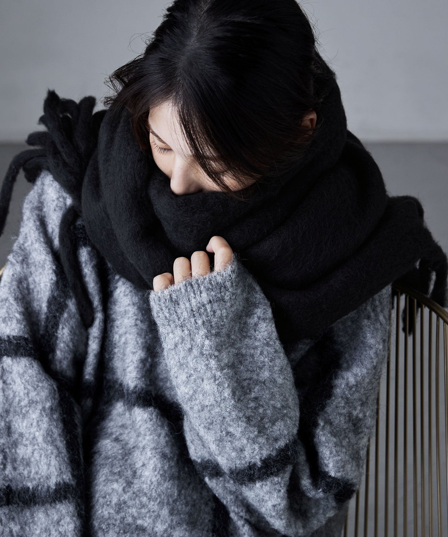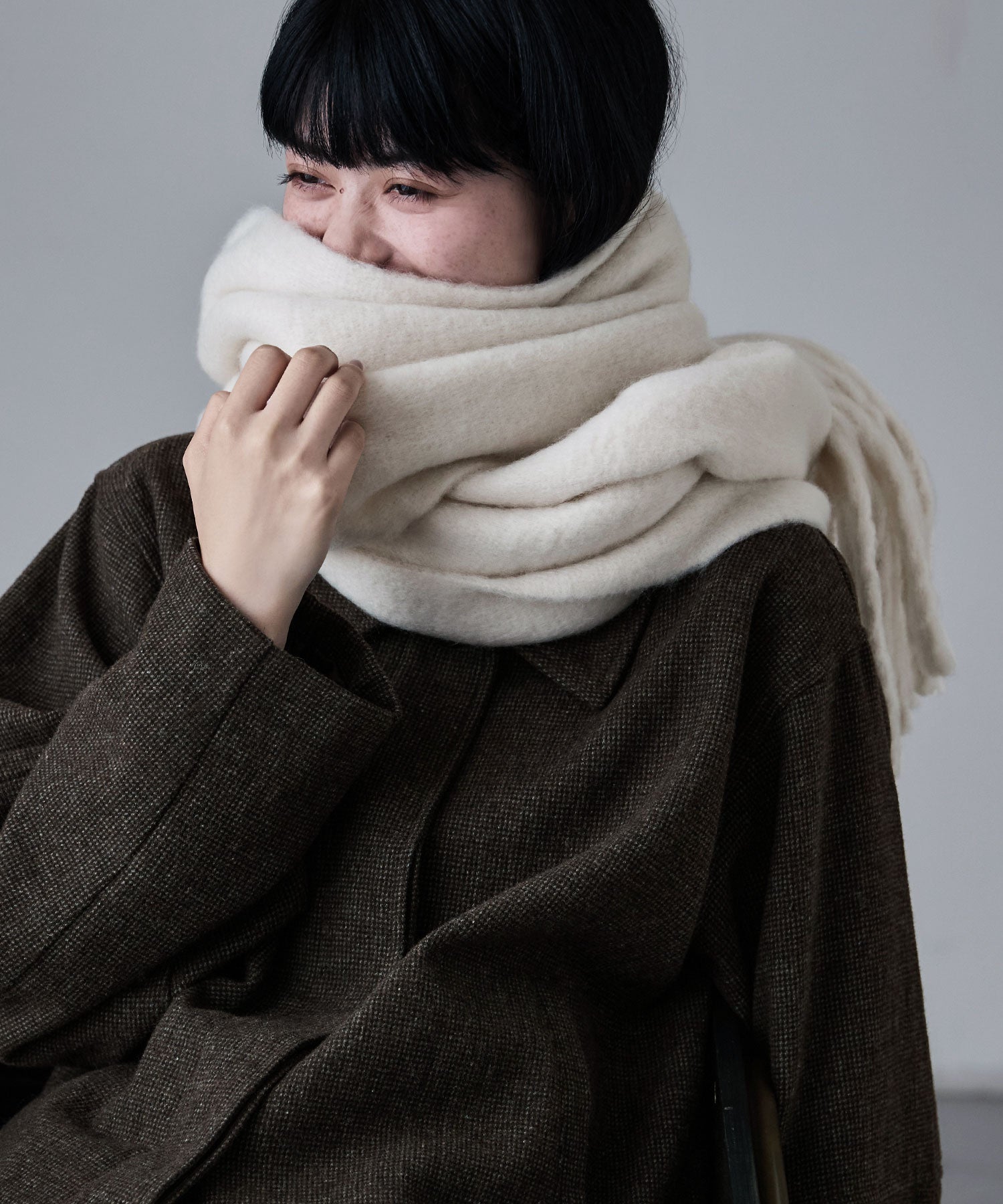 顔が埋もれるくらいふわりとした素材感で、服に負けない存在感を発揮してくれるボリュームマフラー。