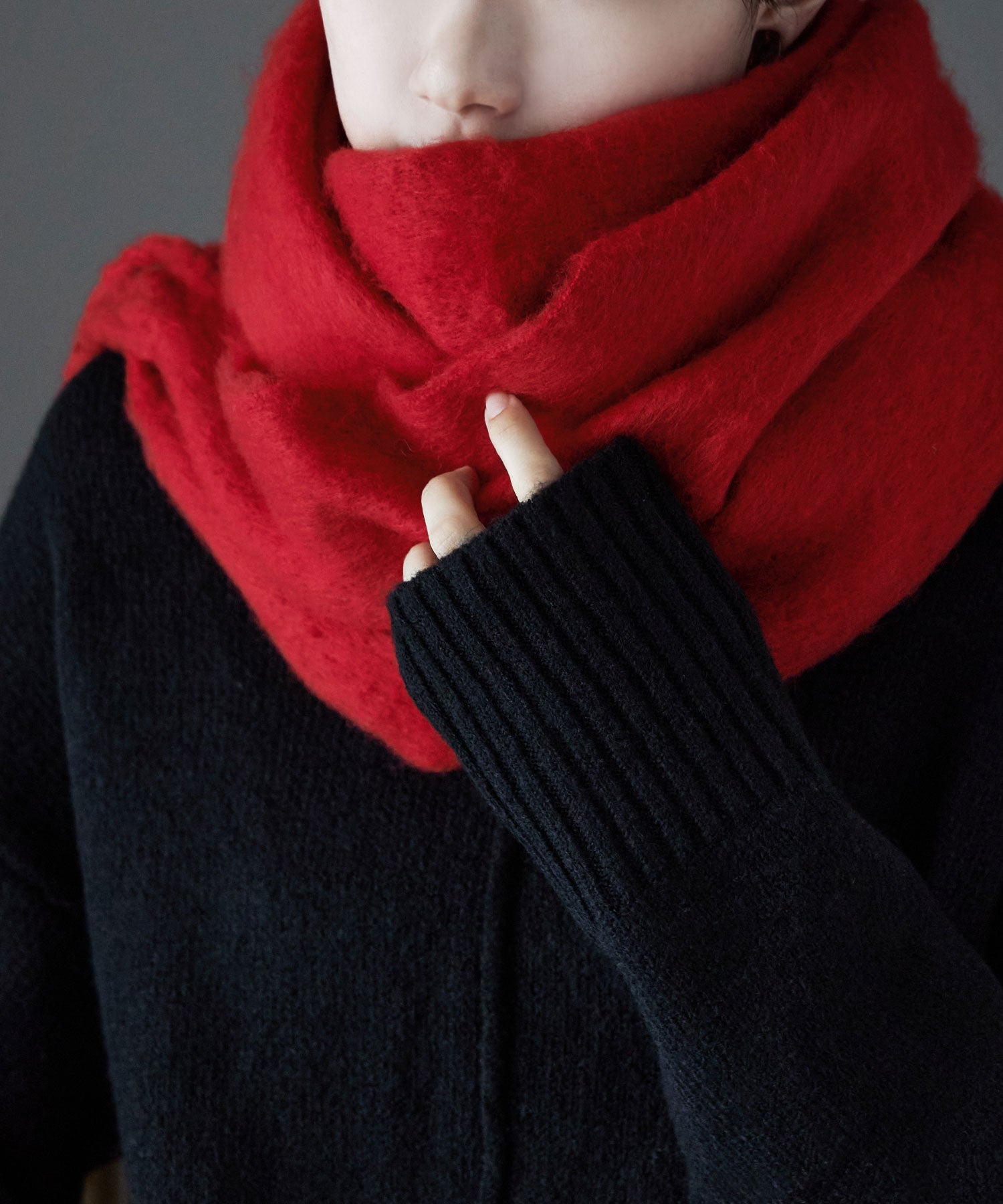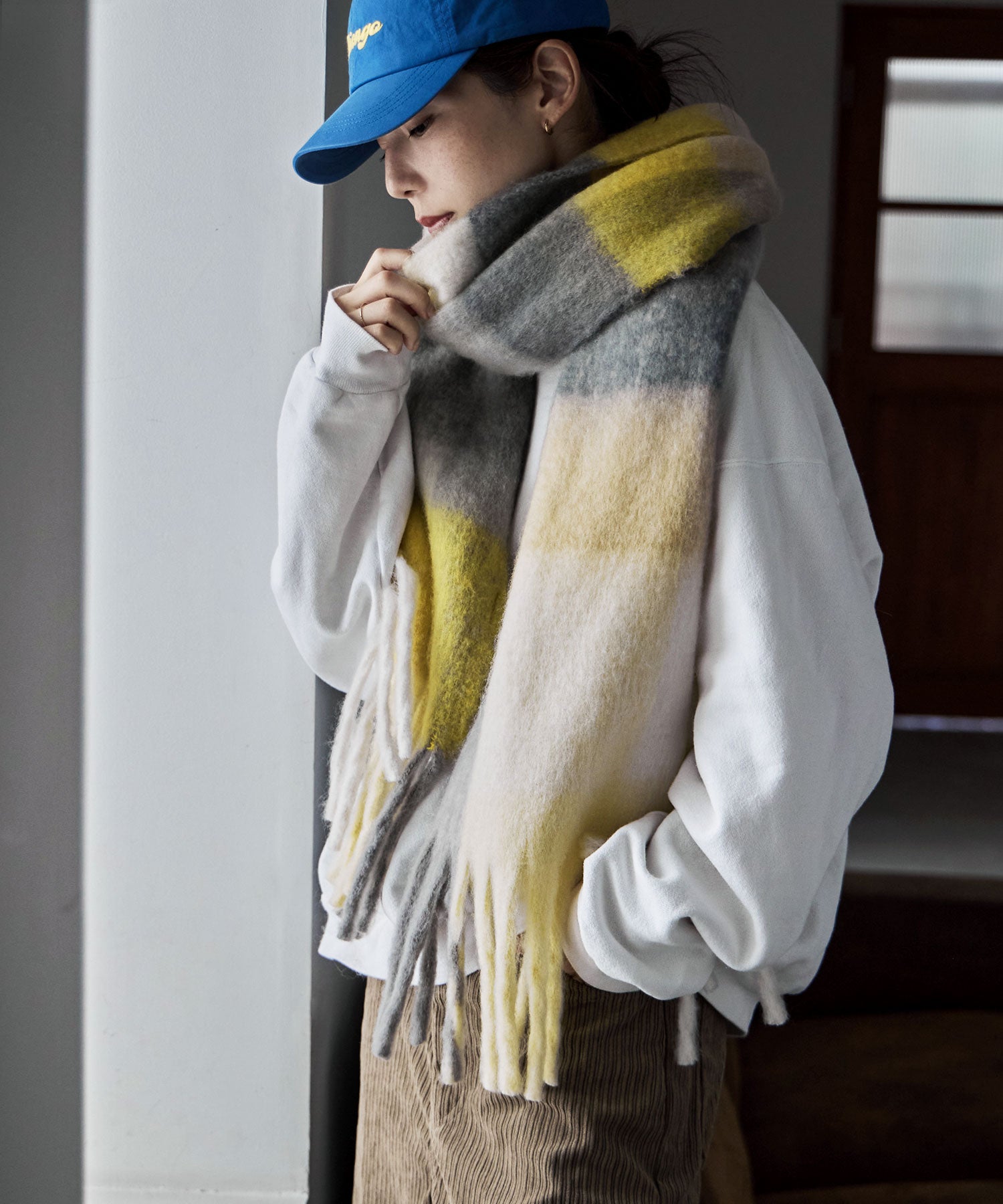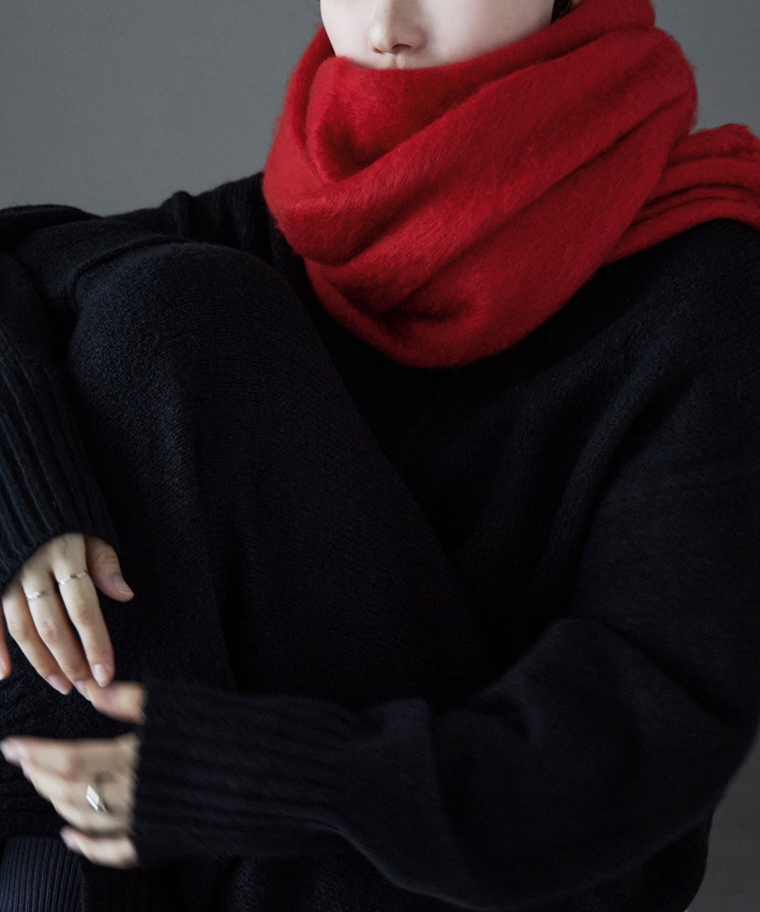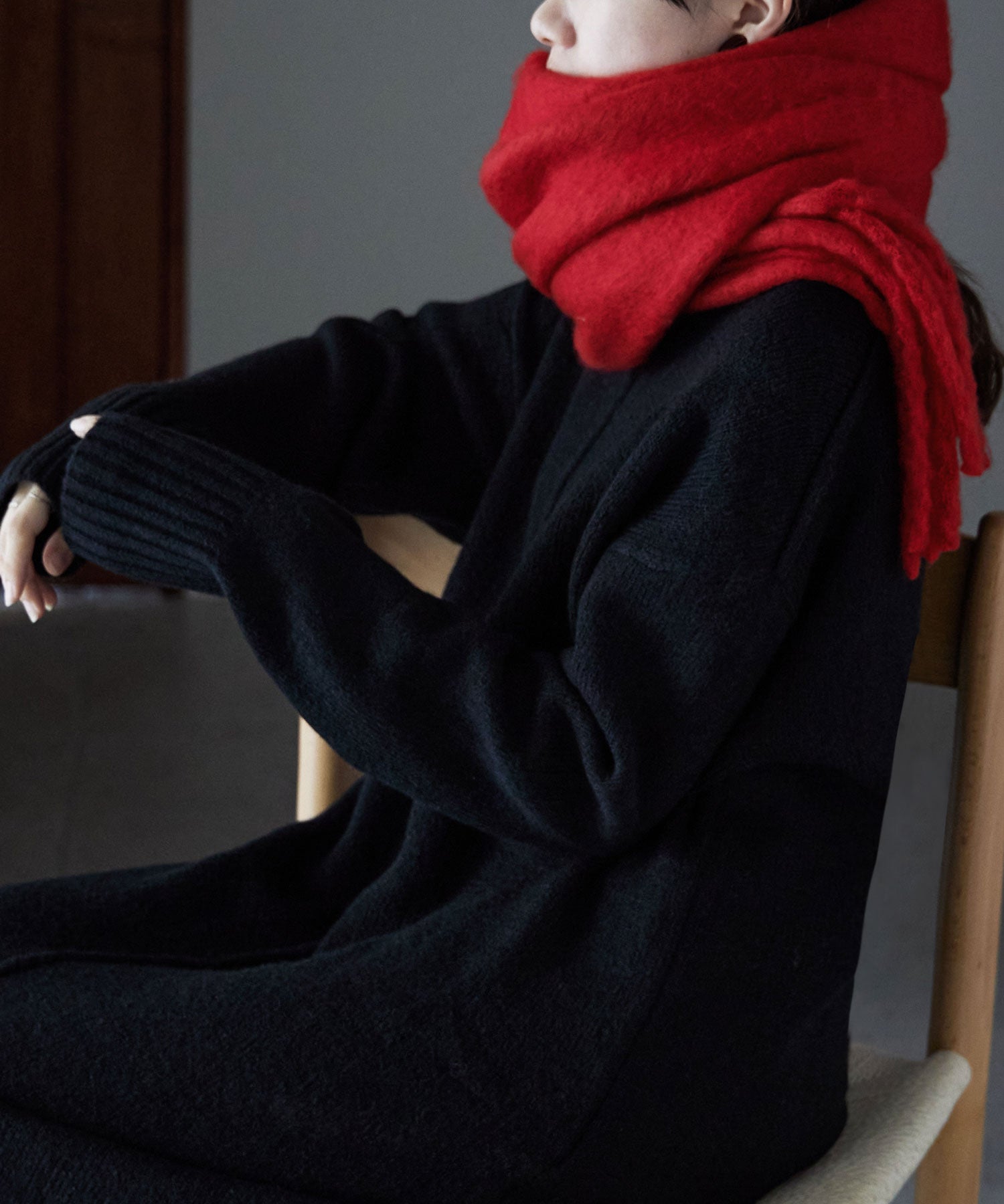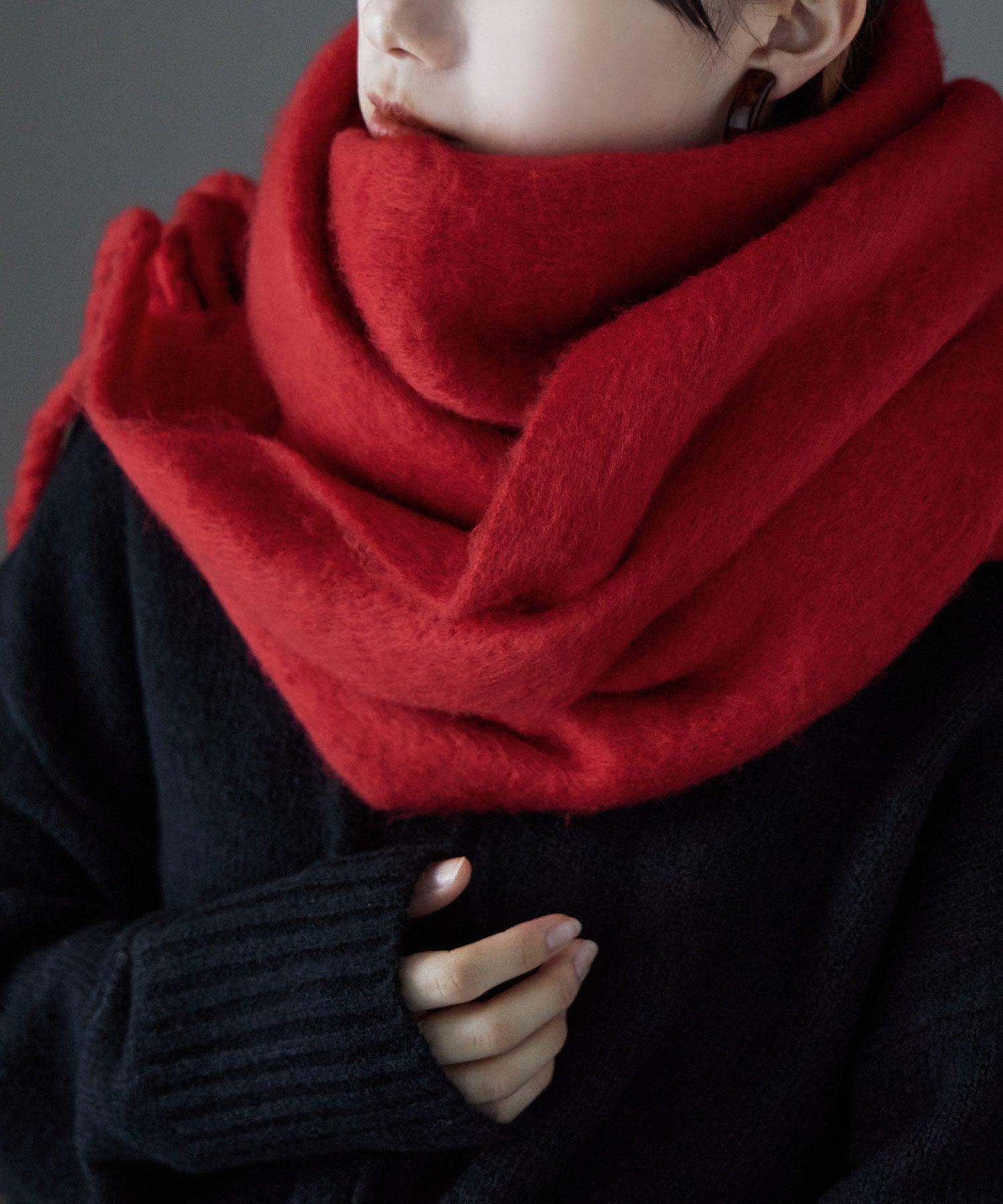 顔が埋もれるくらいふわりとした素材感で、服に負けない存在感を発揮してくれるボリュームマフラー。