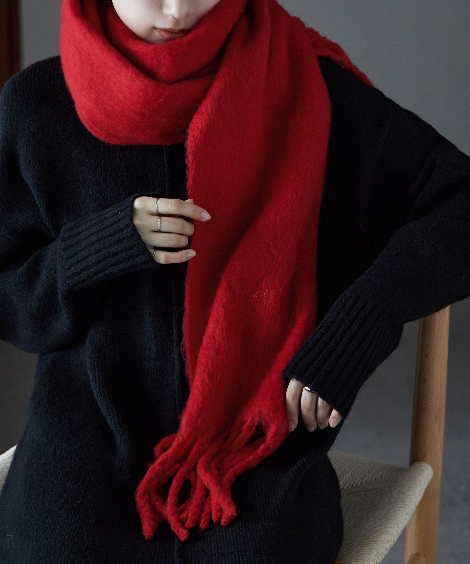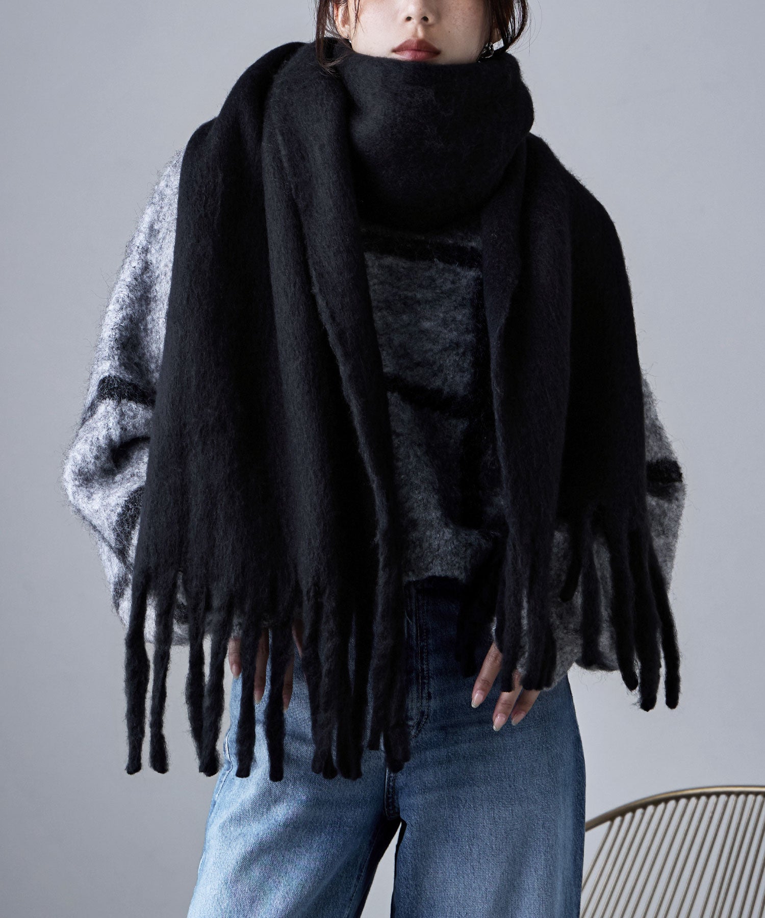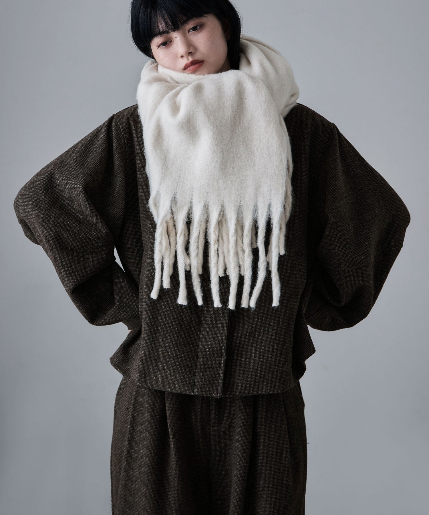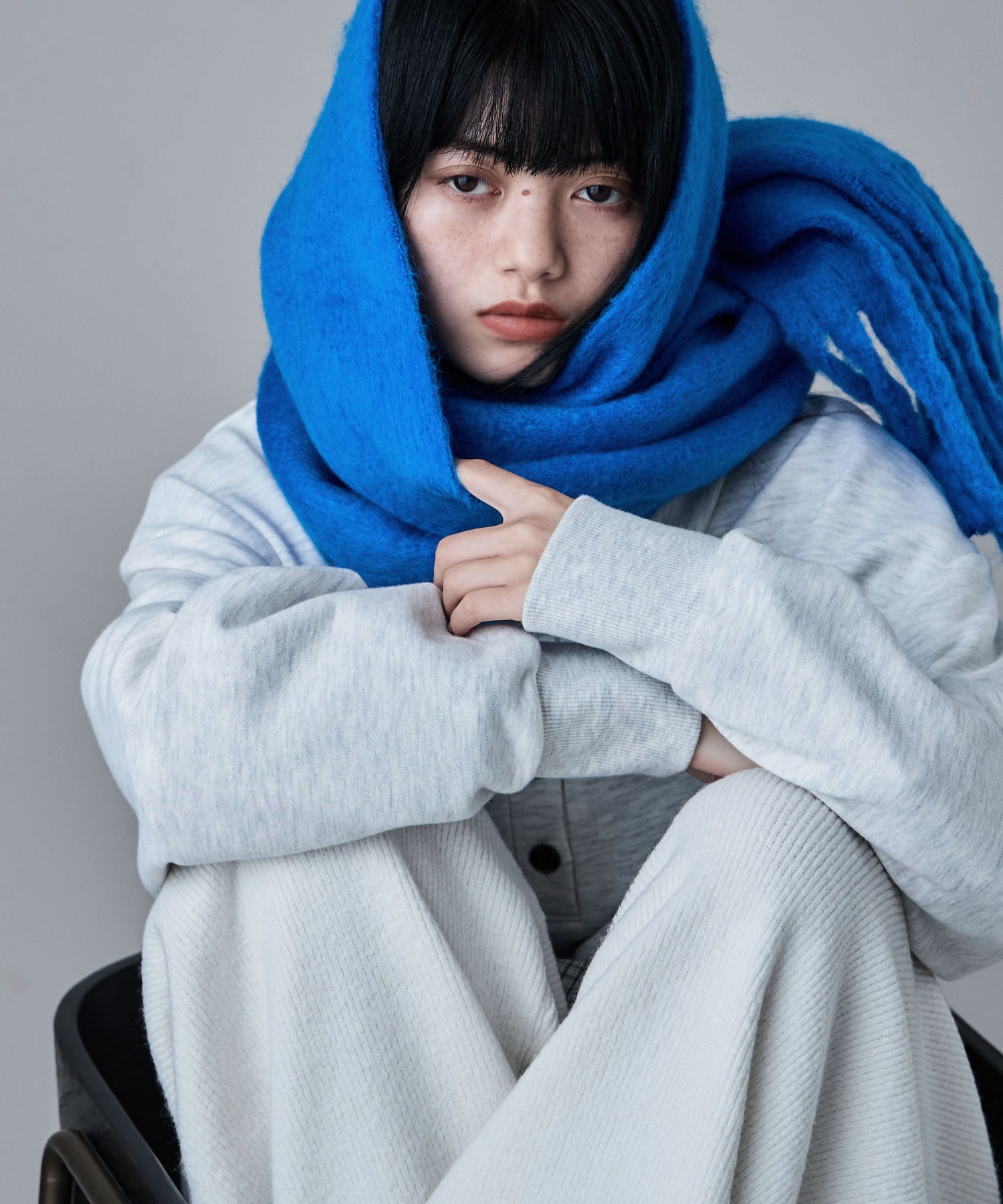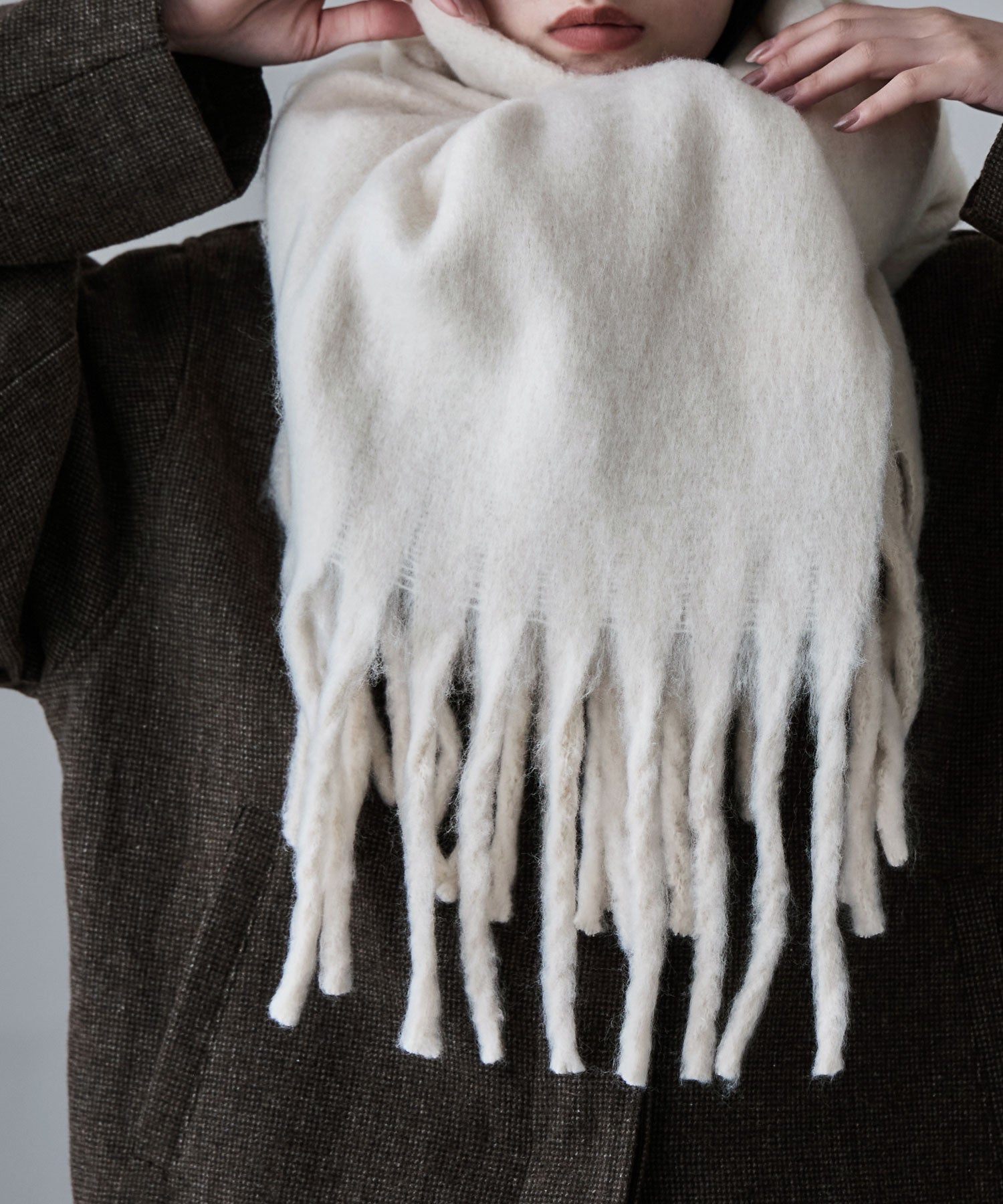 顔が埋もれるくらいふわりとした素材感で、服に負けない存在感を発揮してくれるボリュームマフラー。
