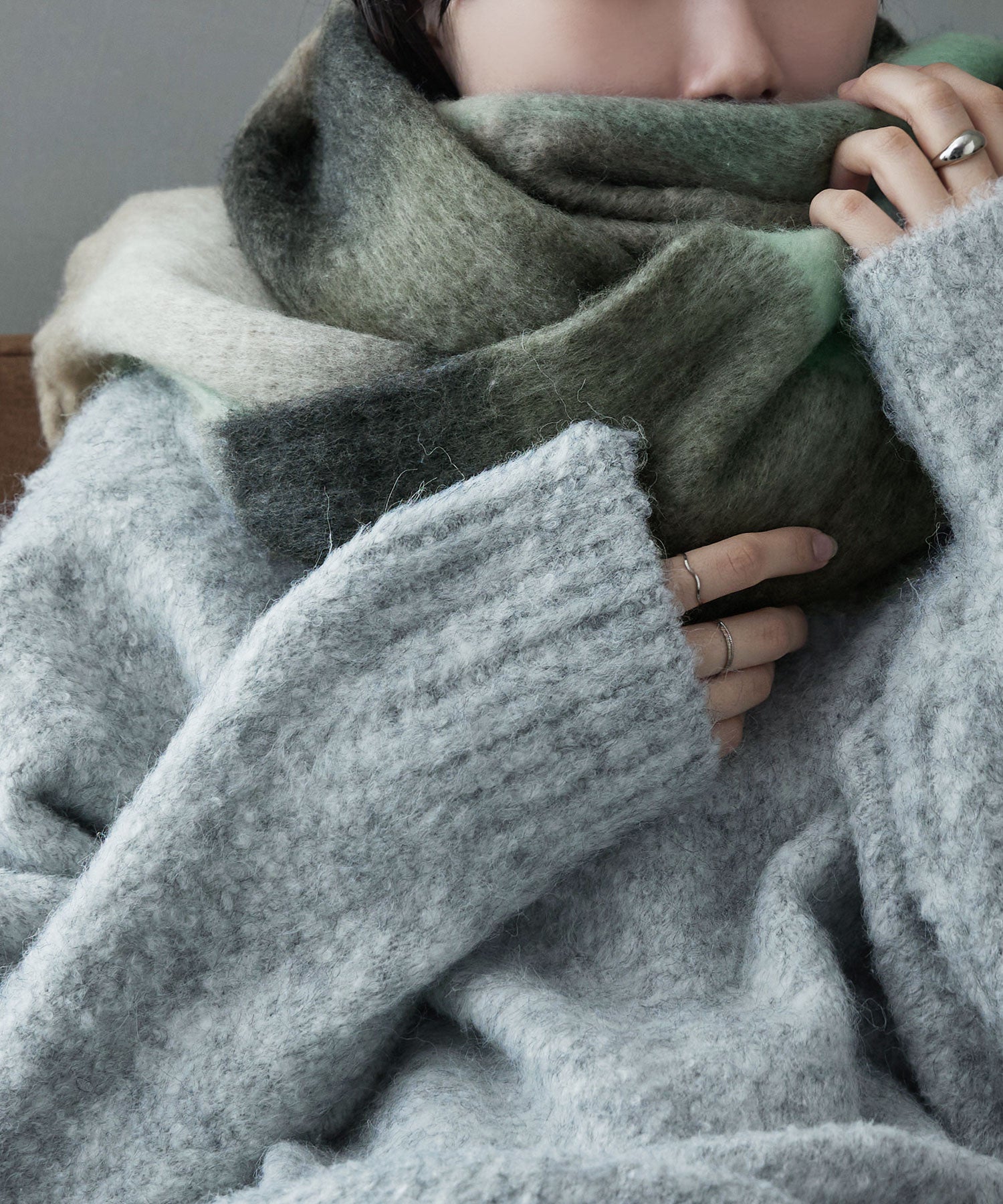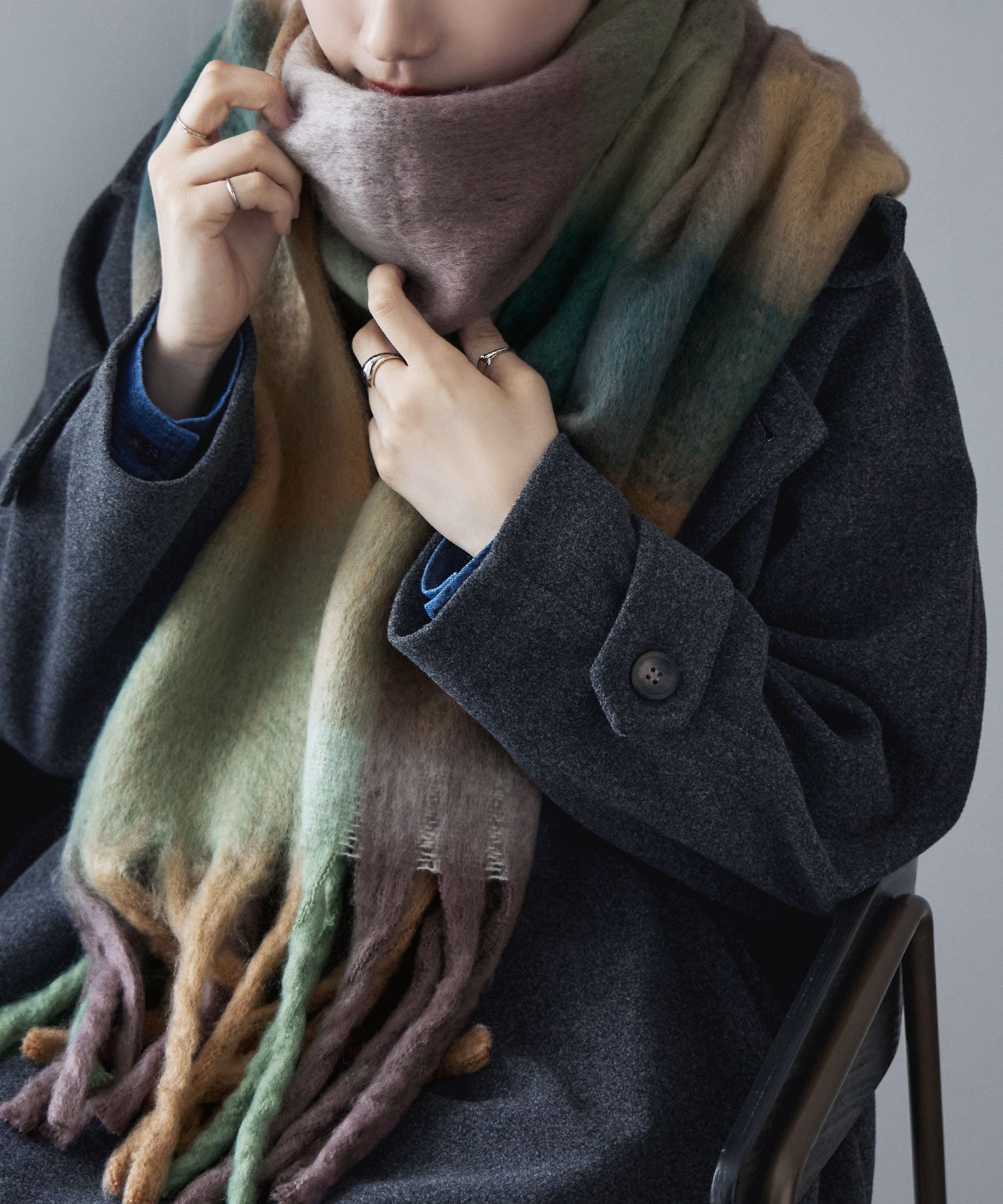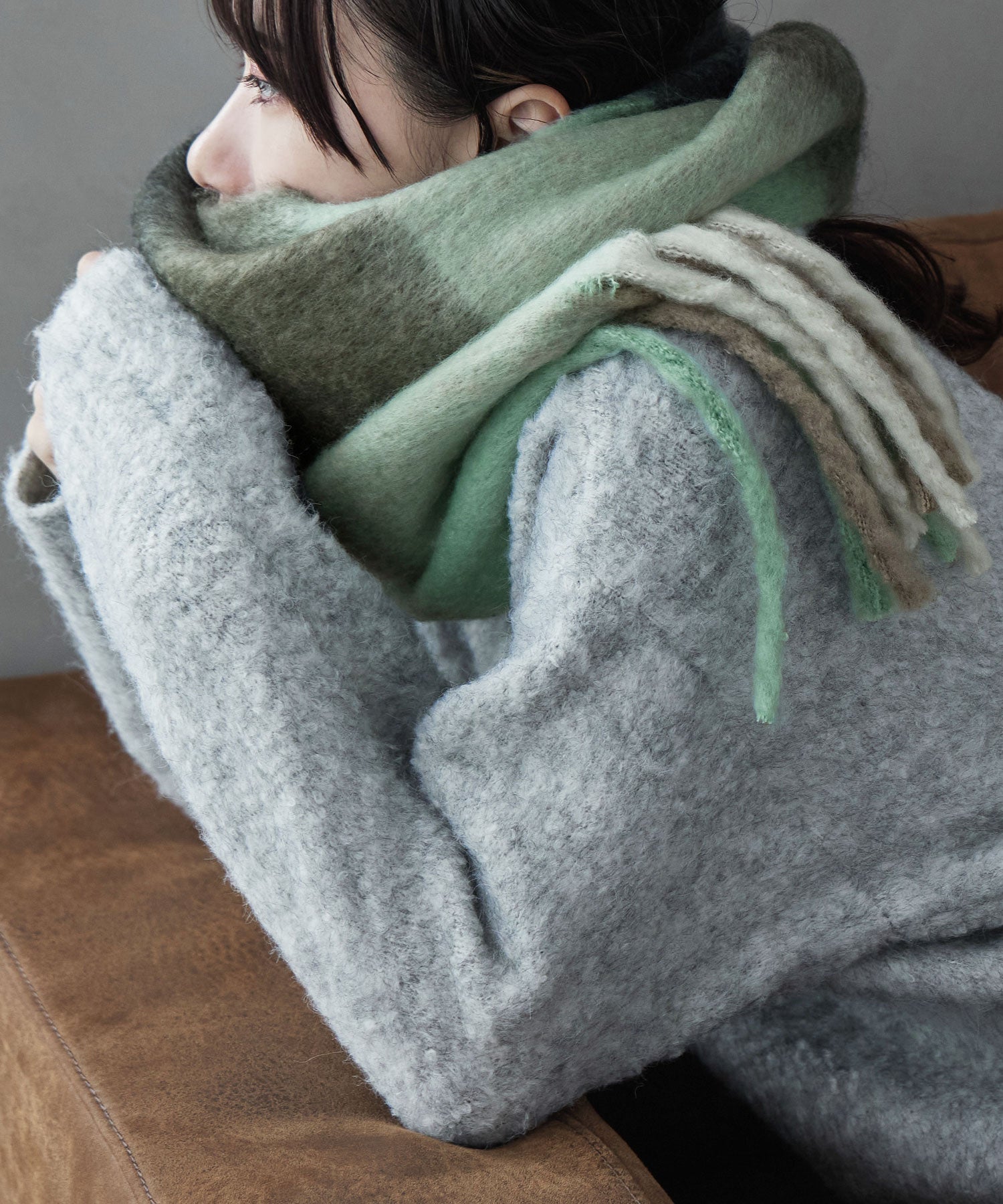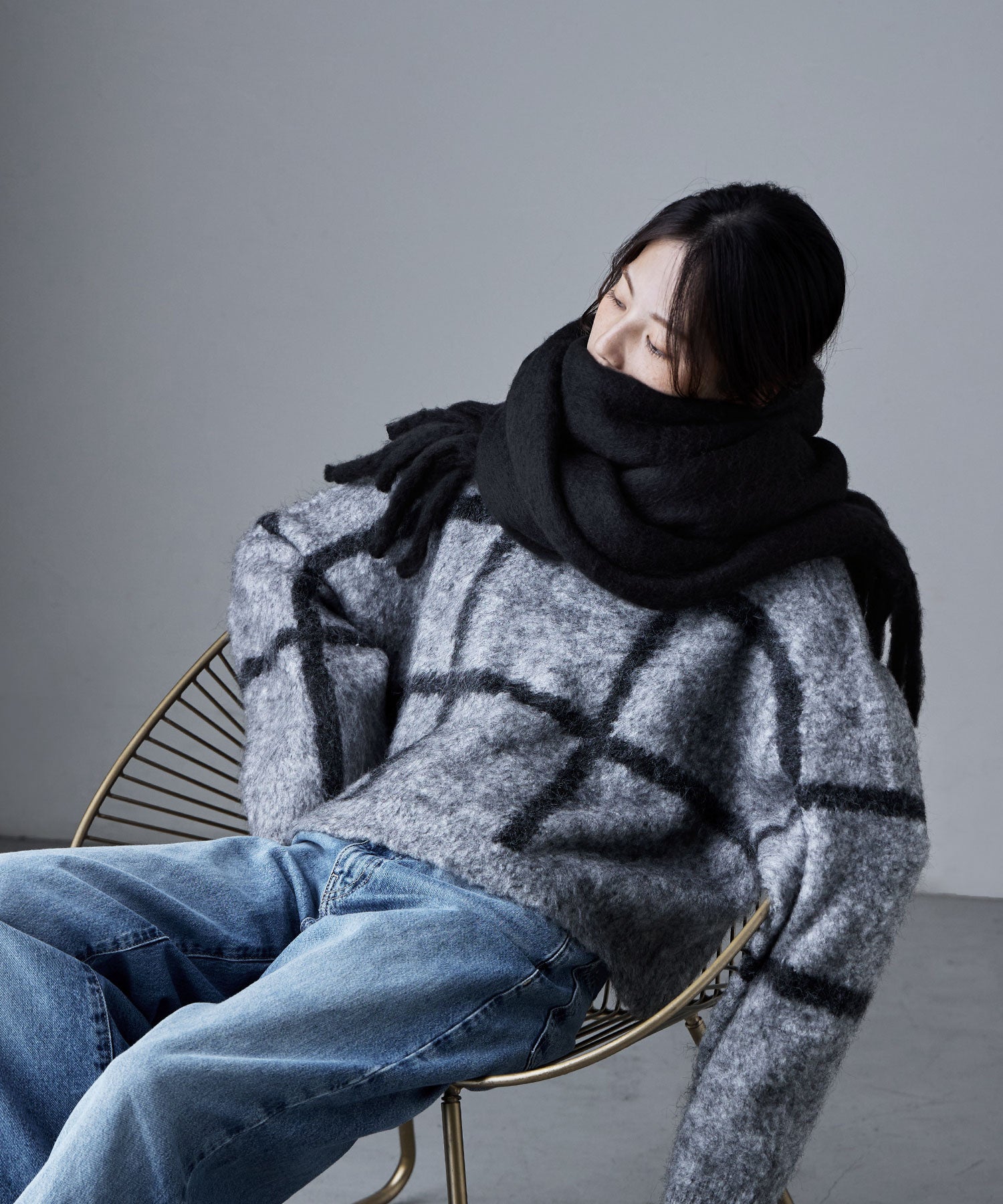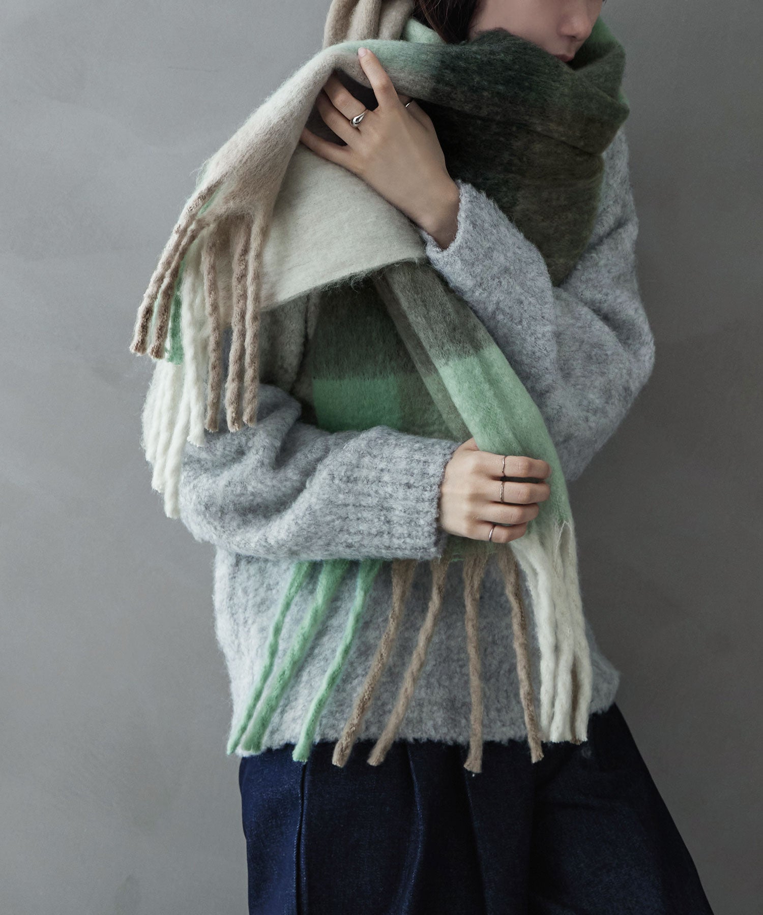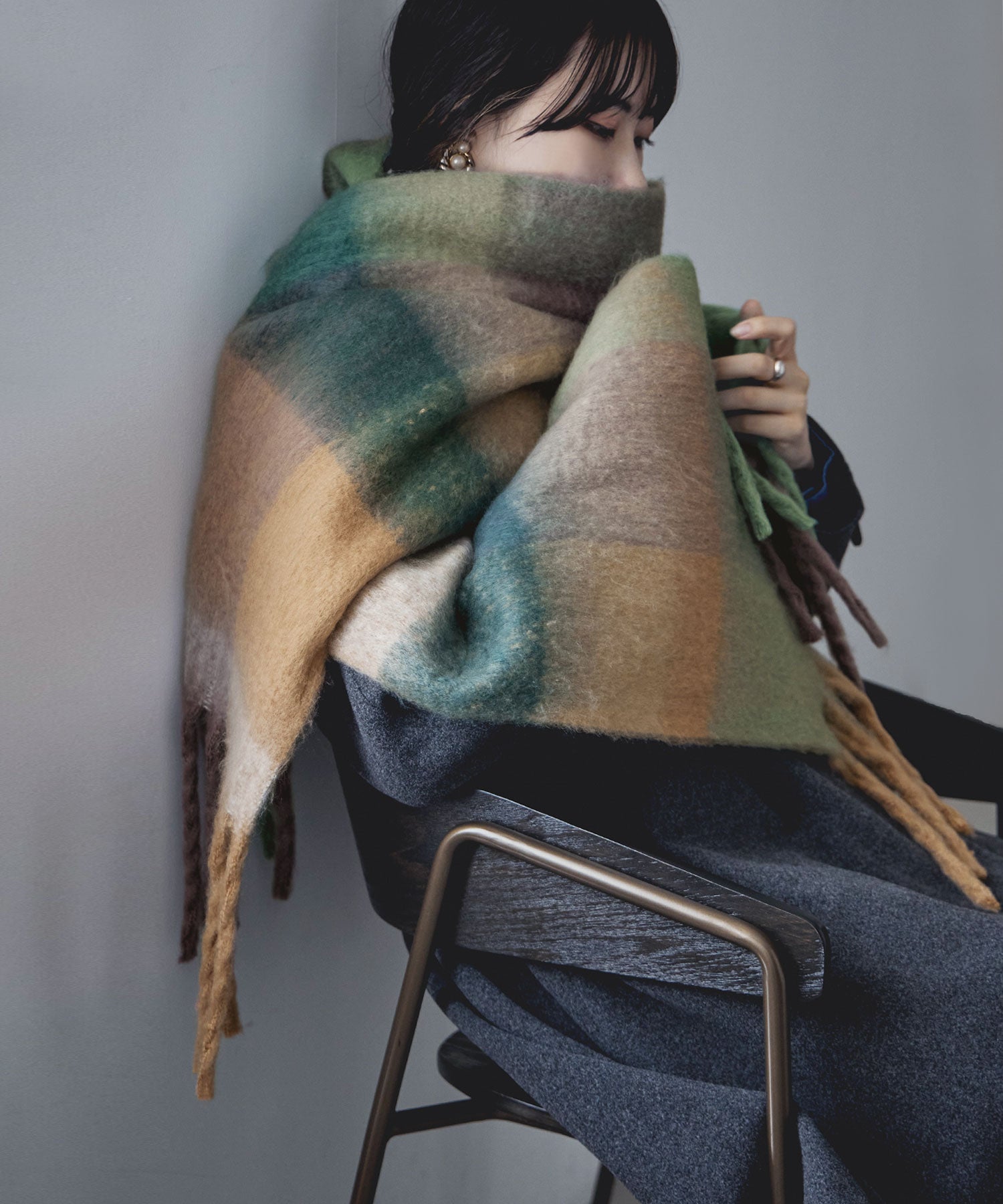 顔が埋もれるくらいふわりとした素材感で、服に負けない存在感を発揮してくれるボリュームマフラー。