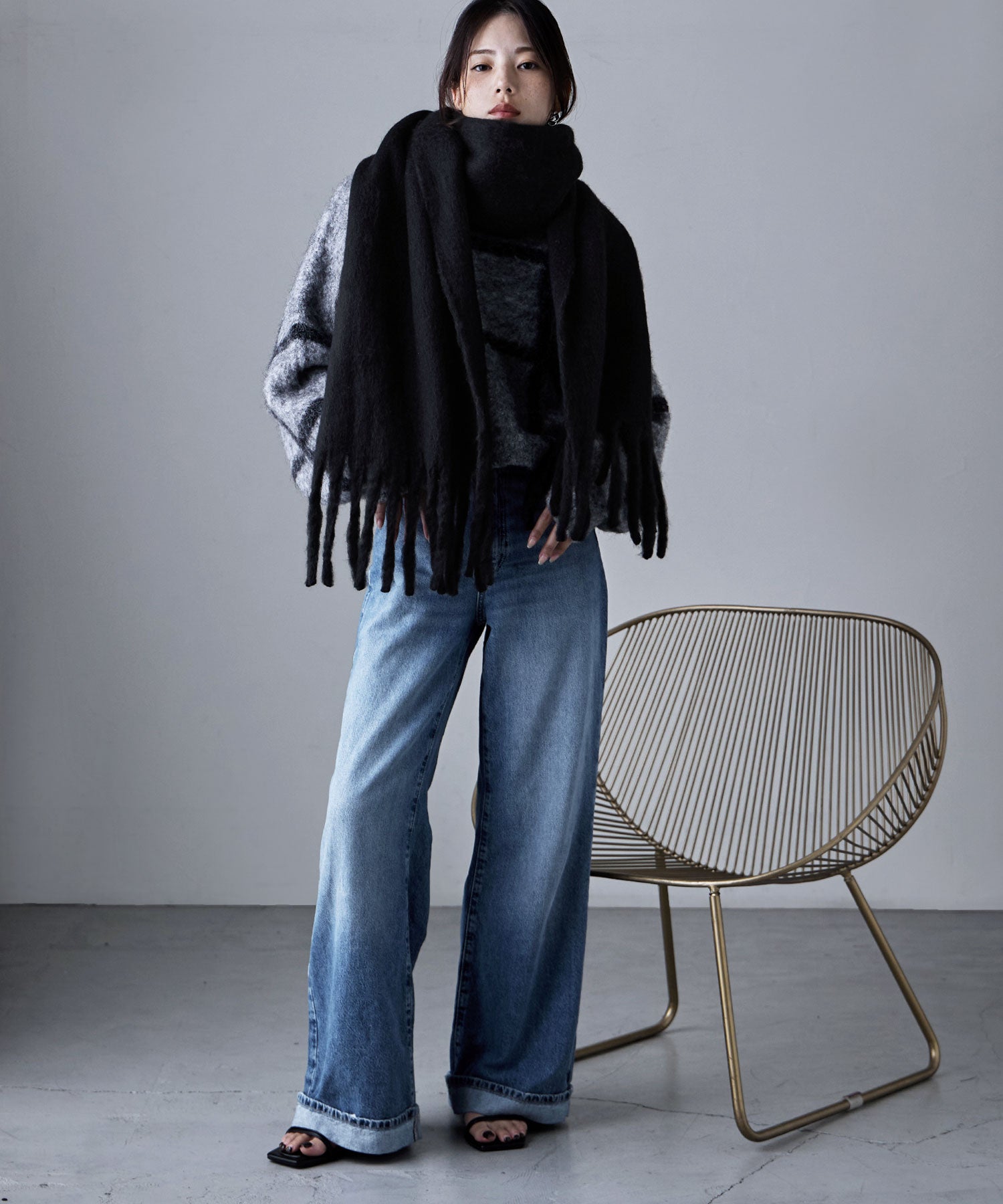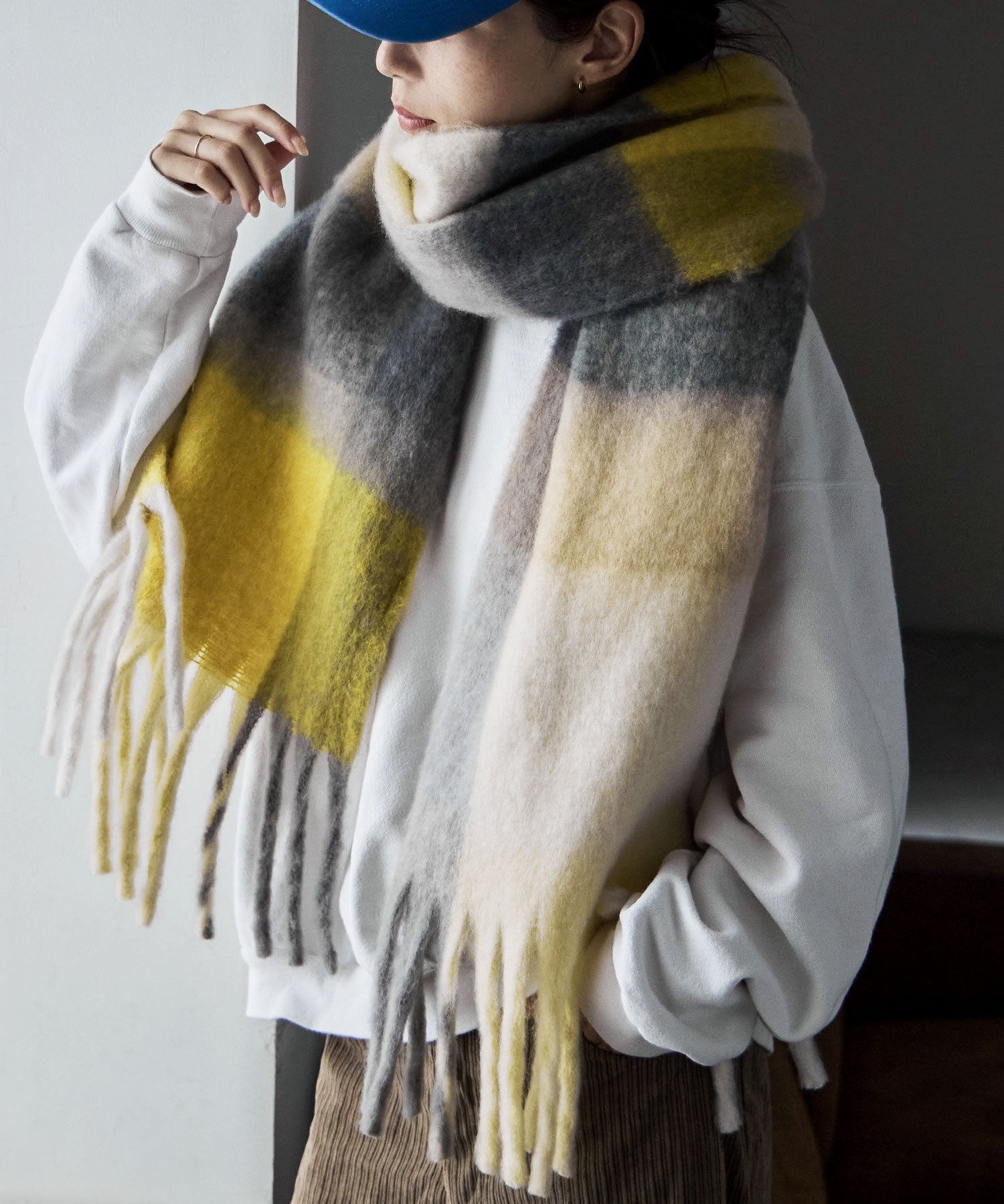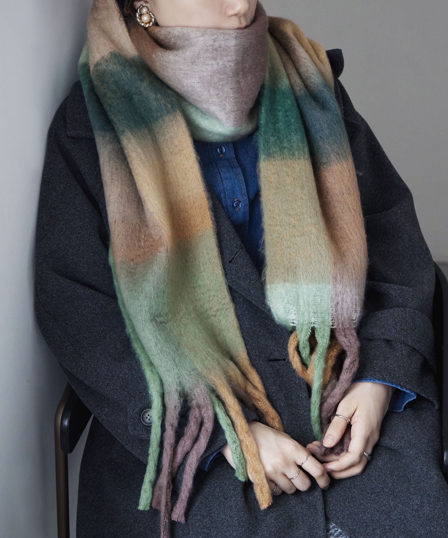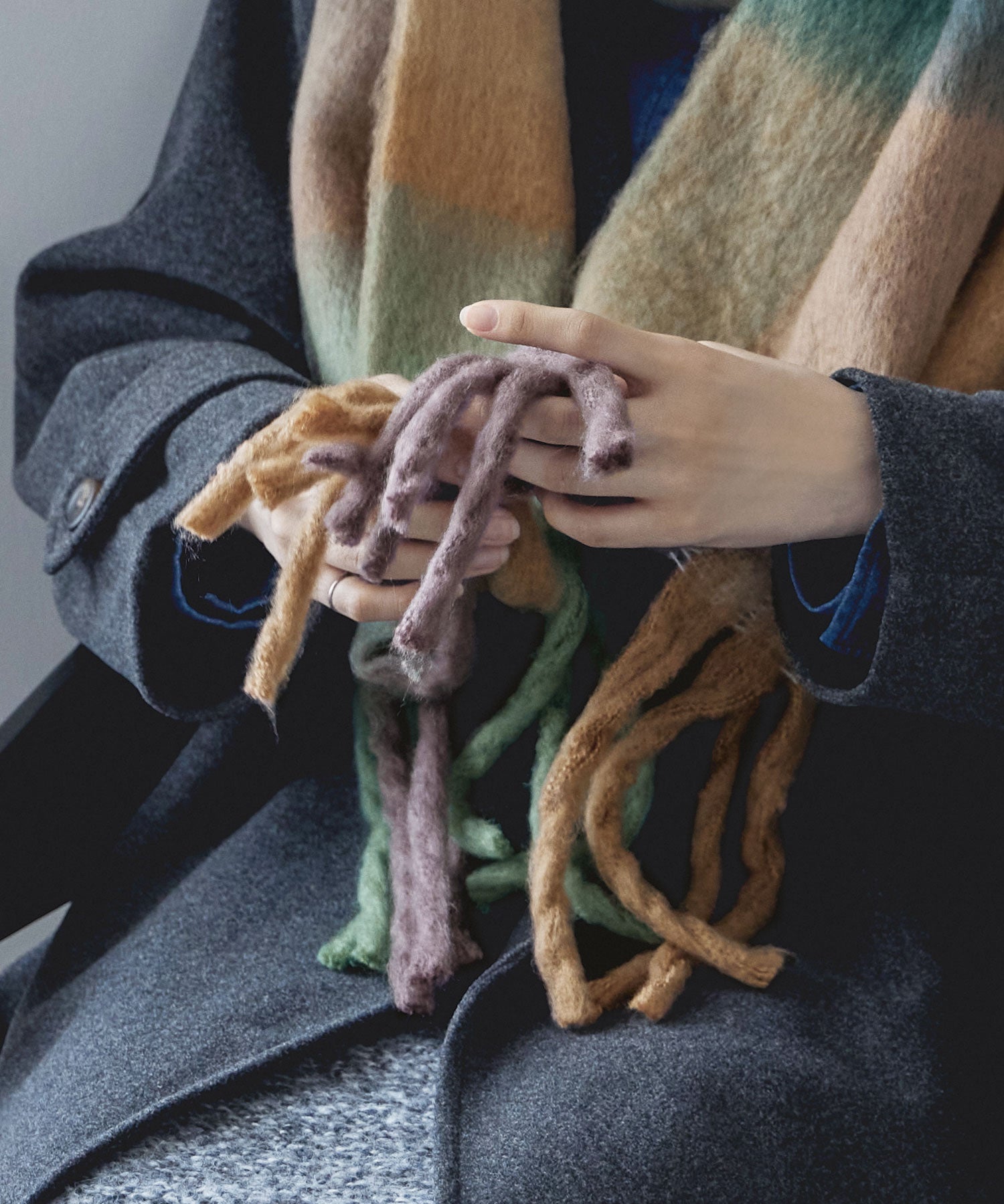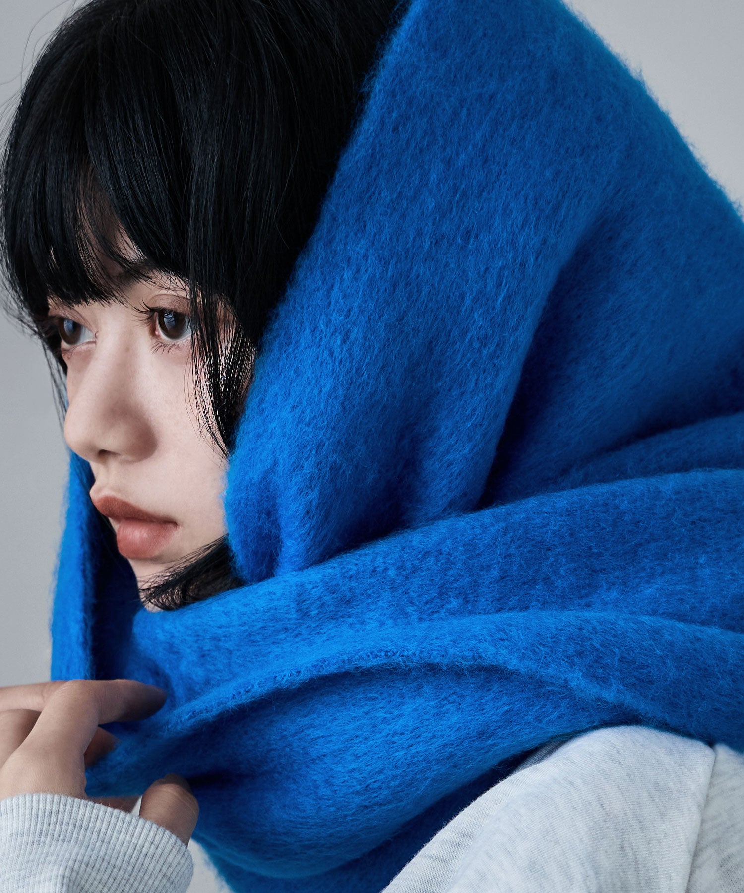 顔が埋もれるくらいふわりとした素材感で、服に負けない存在感を発揮してくれるボリュームマフラー。