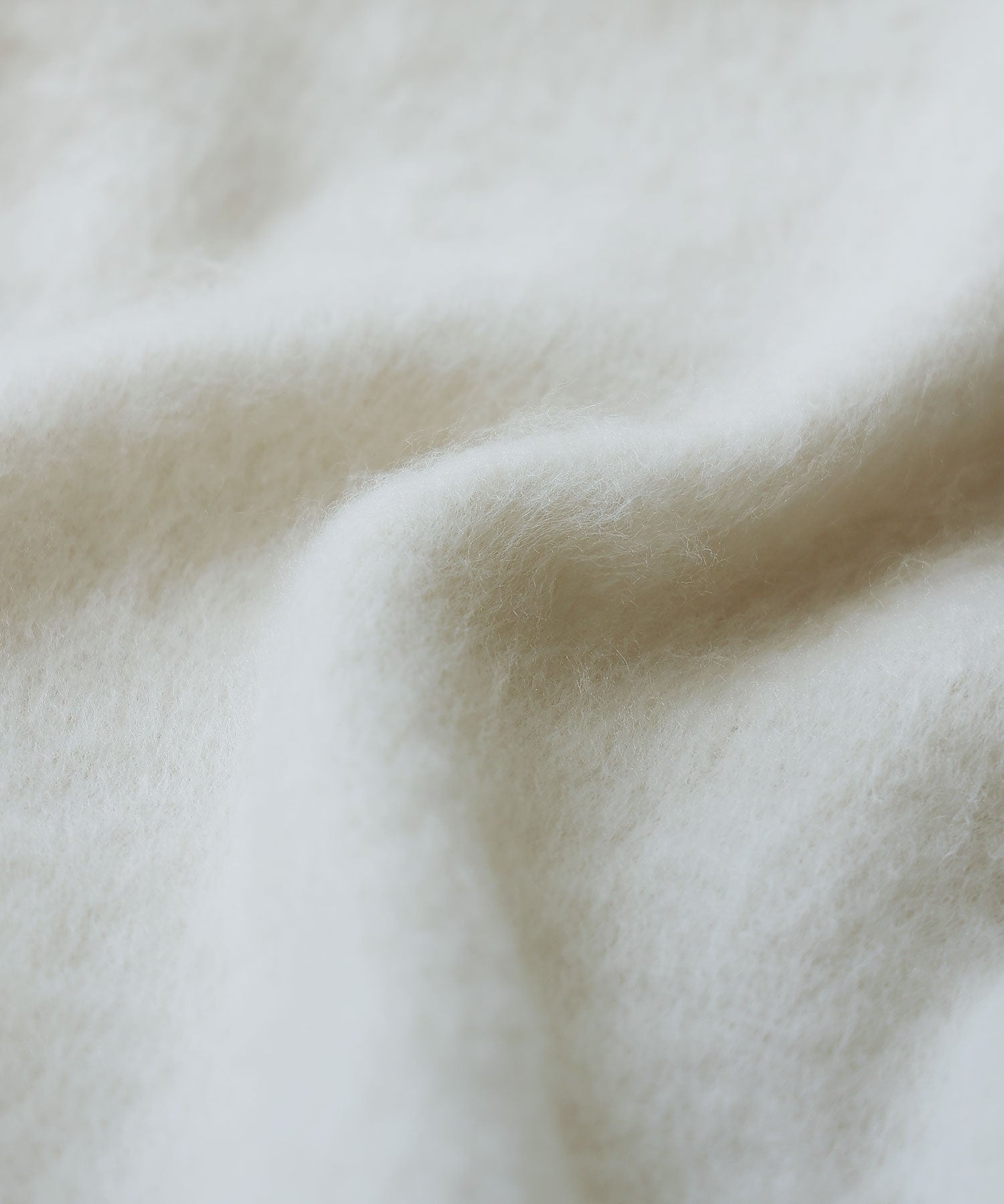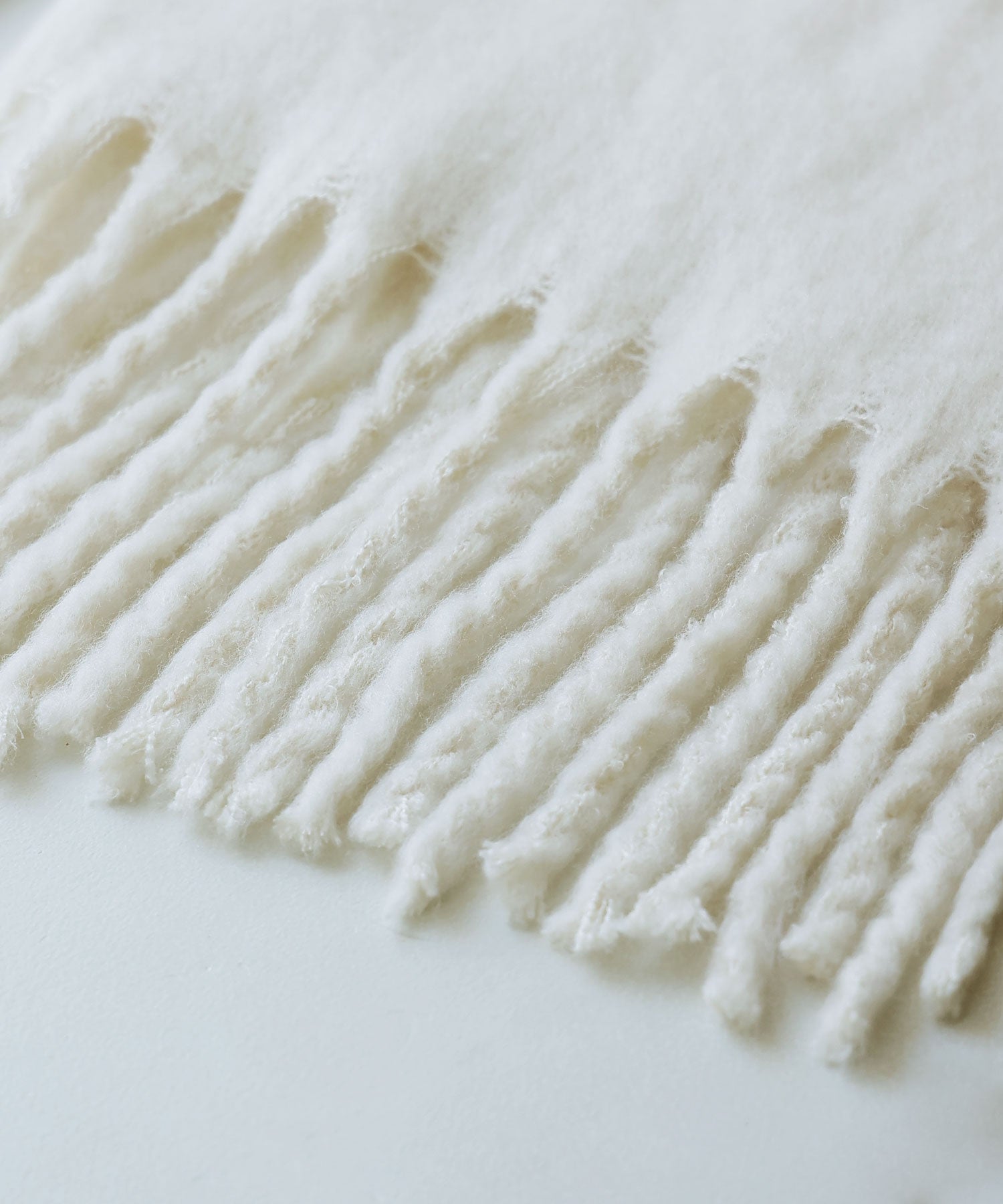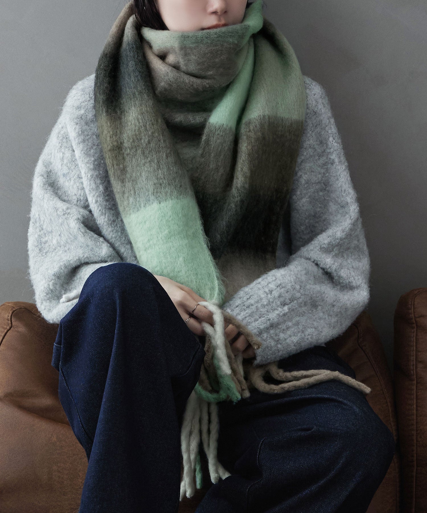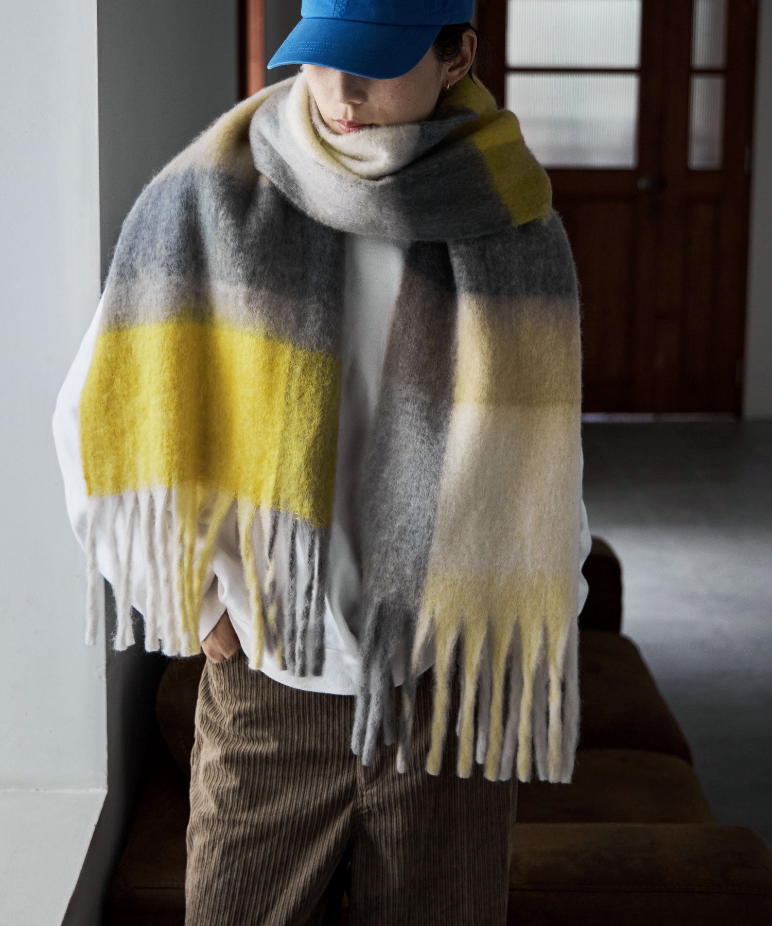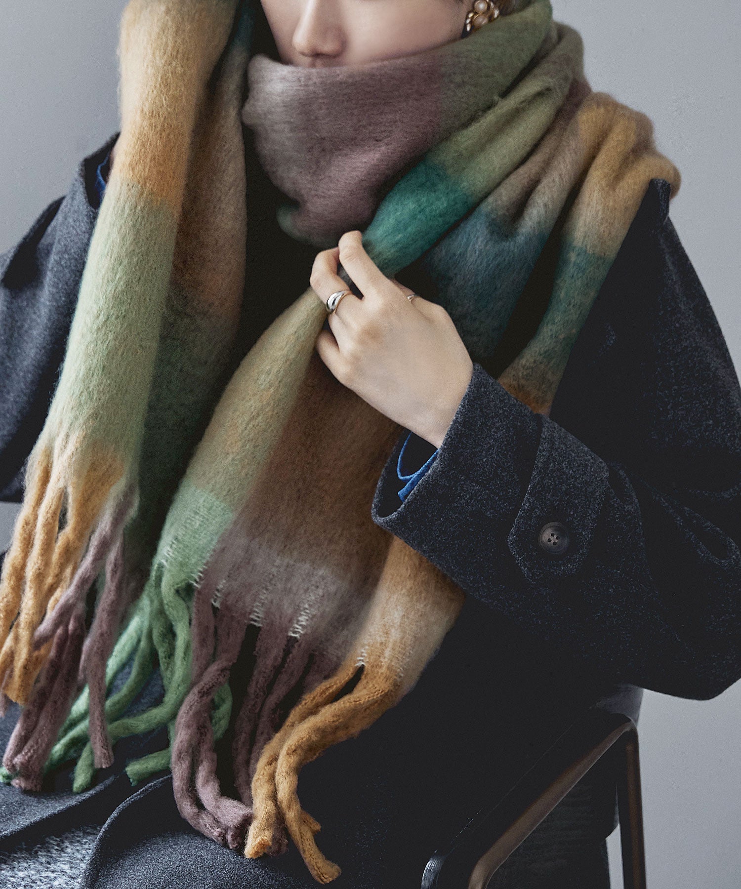 顔が埋もれるくらいふわりとした素材感で、服に負けない存在感を発揮してくれるボリュームマフラー。