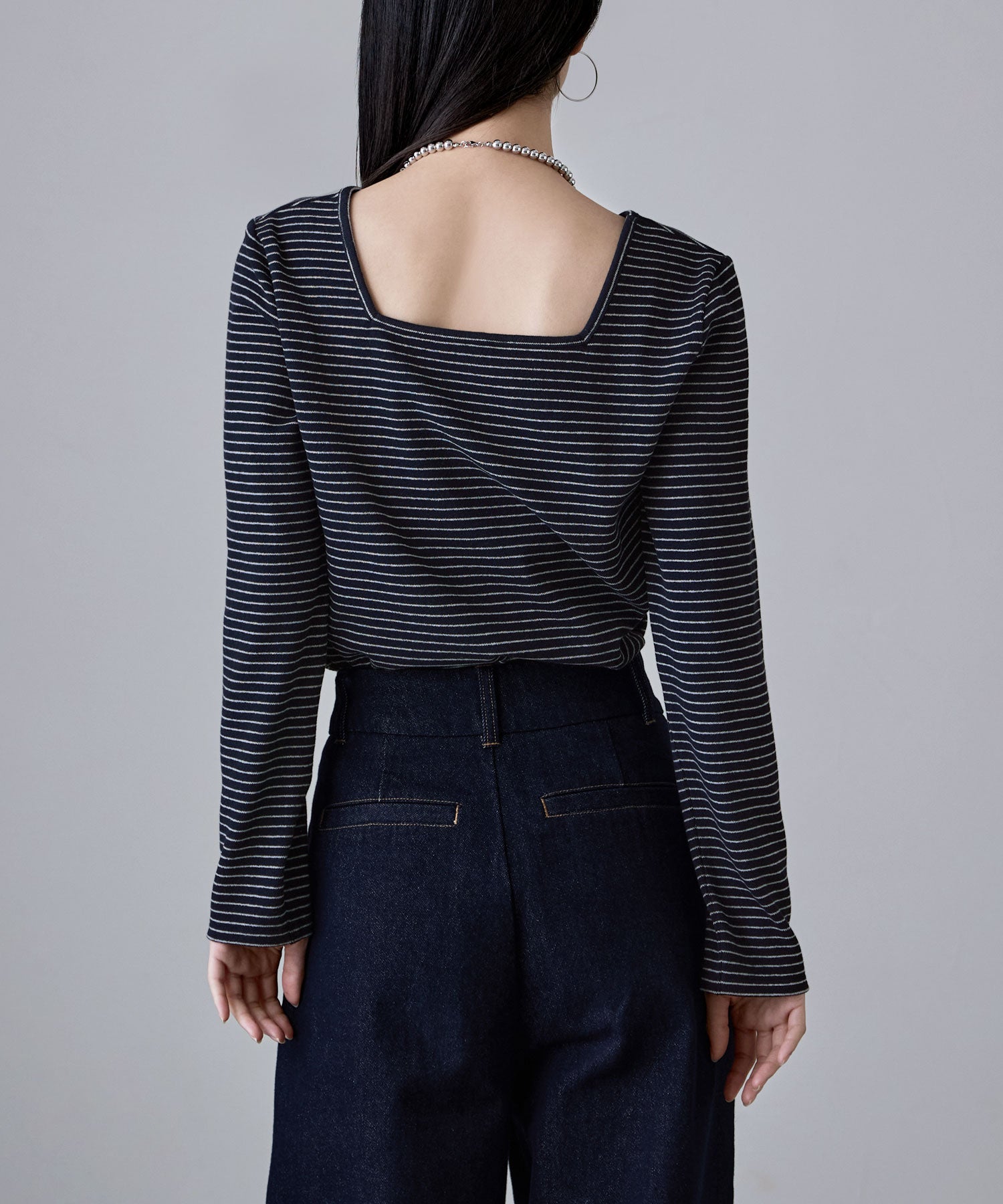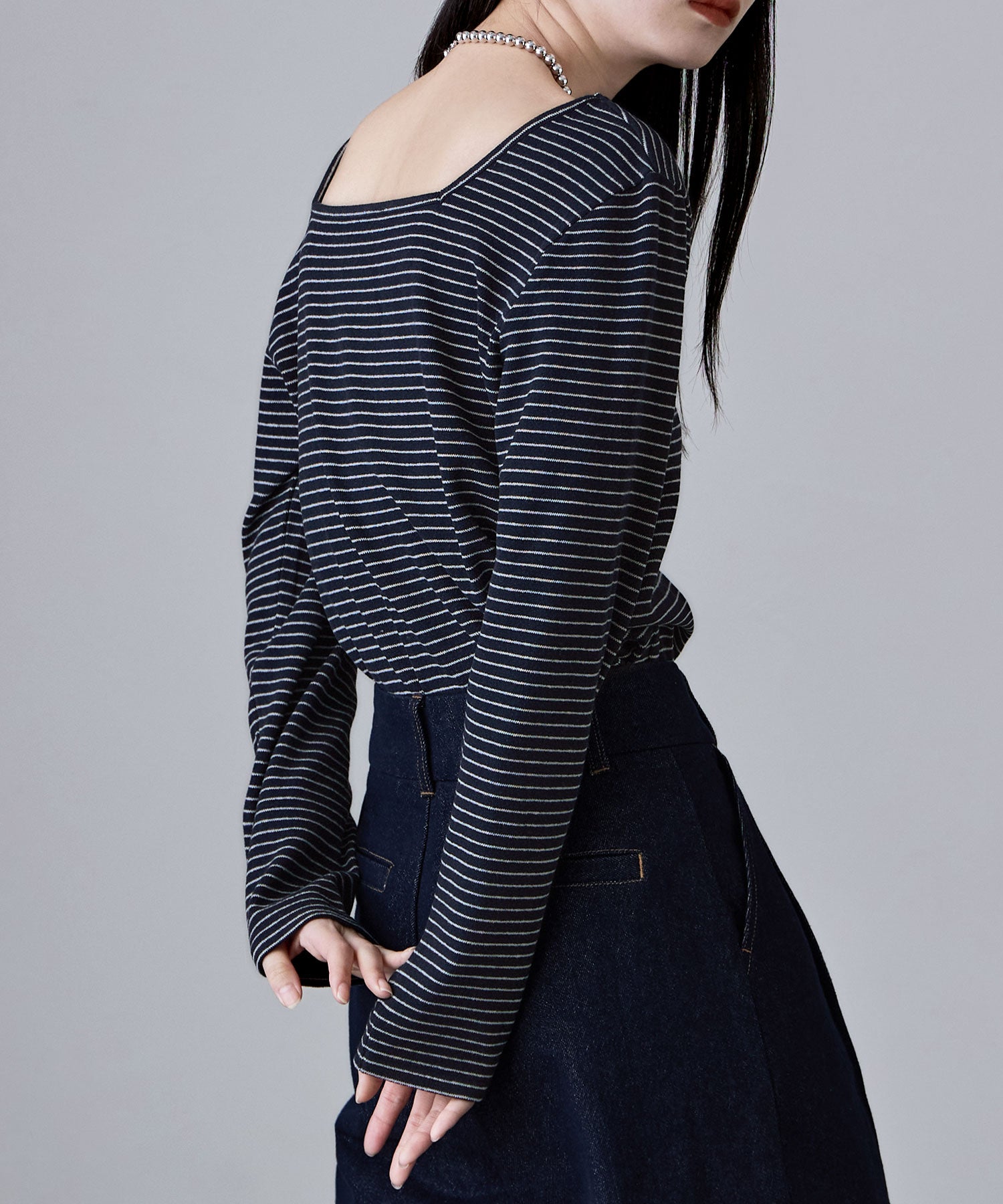 Rname クルー&スクエア 2wayネックボーダートップス トップス Tシャツ ロンT 長袖 ボーダー クルーネック 丸首 スクエアネック 2way プルオーバー ティーシャツ 伸縮性 レディース カットソー ボートネック 前後着用