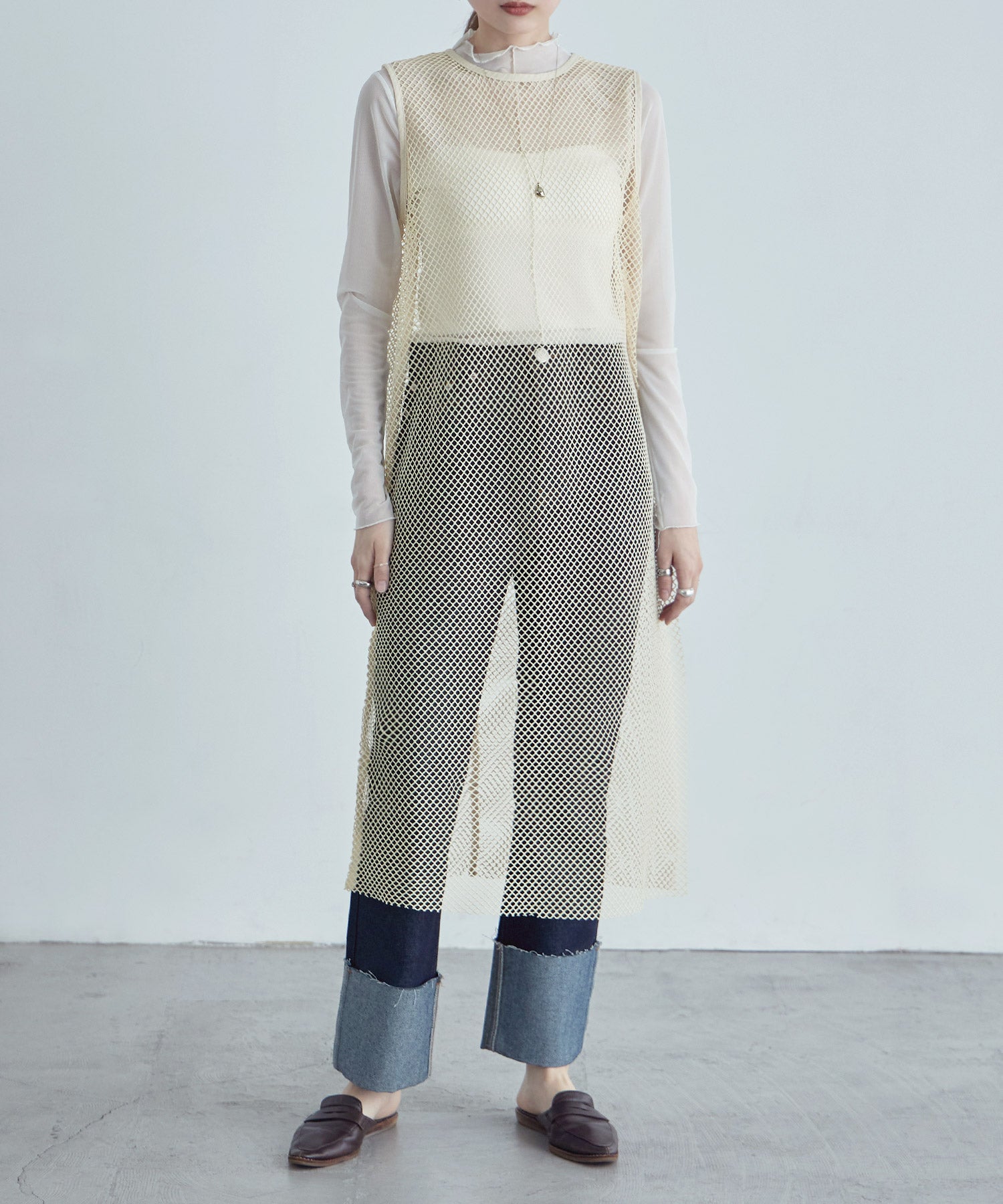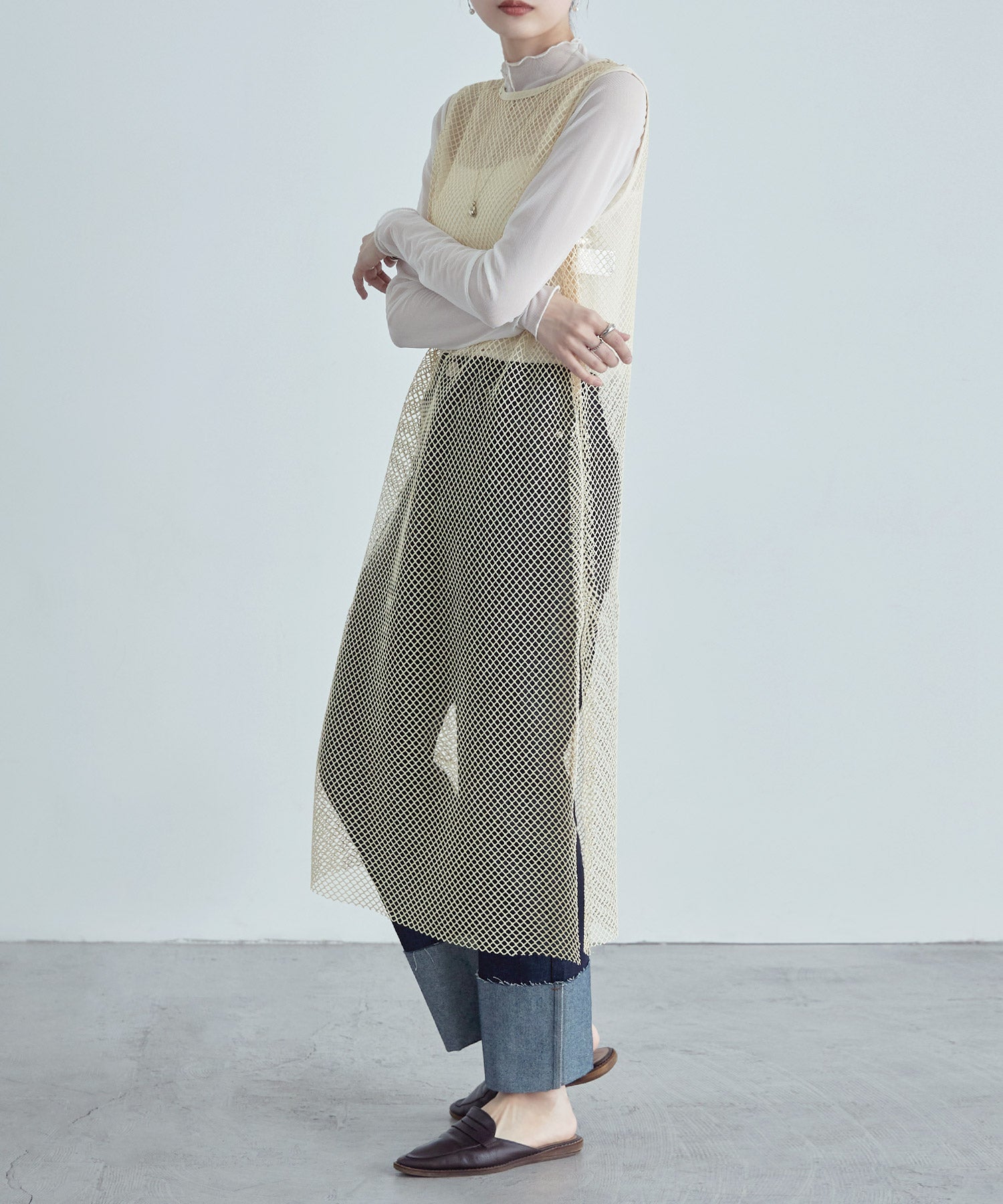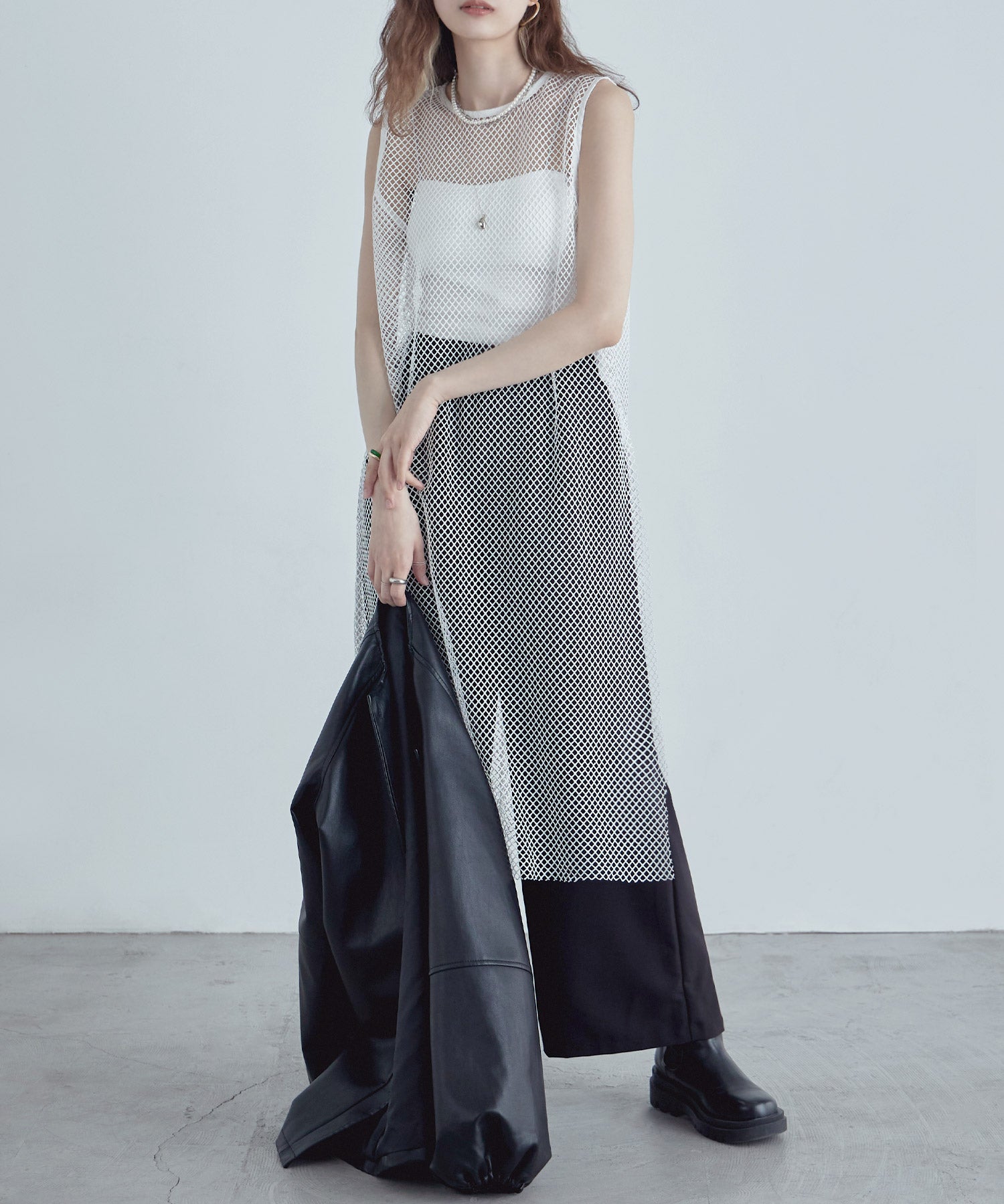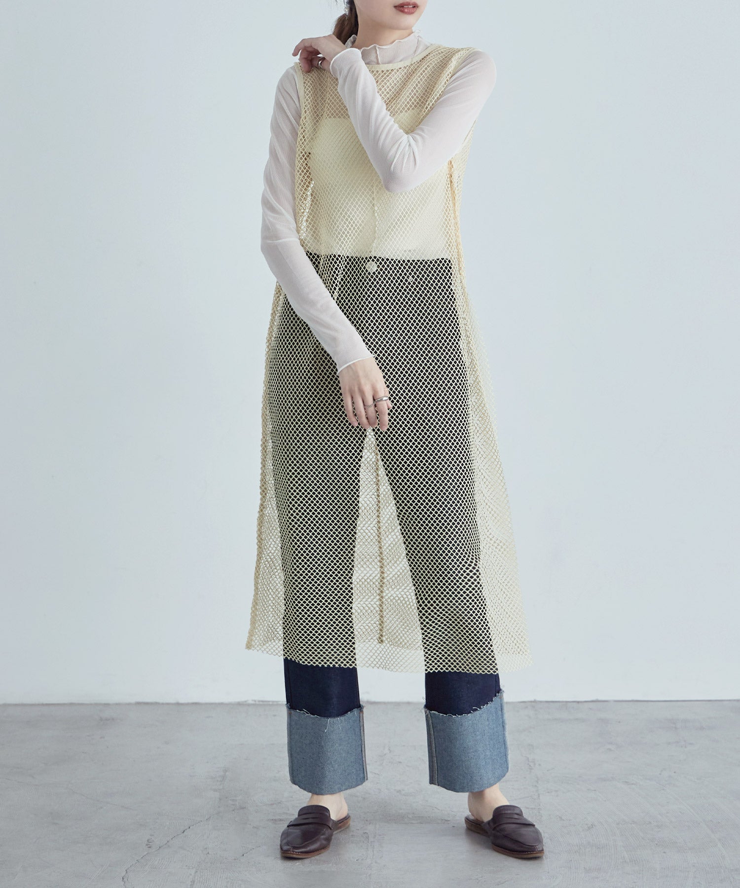 レイヤードコーデをクラスアップするメッシュスリーブレスワンピース。