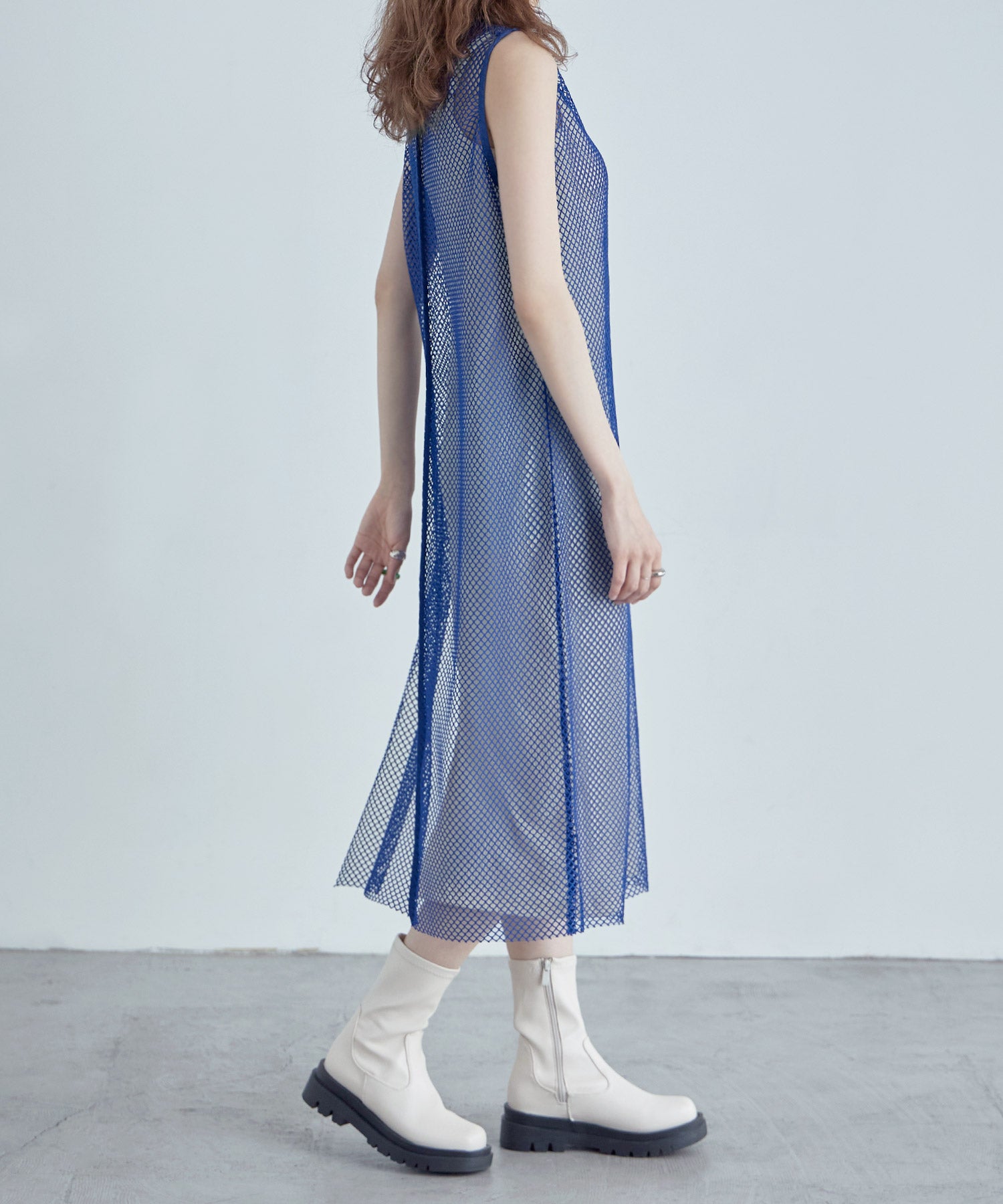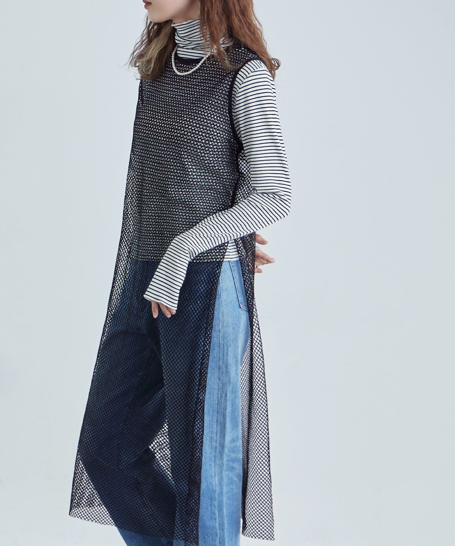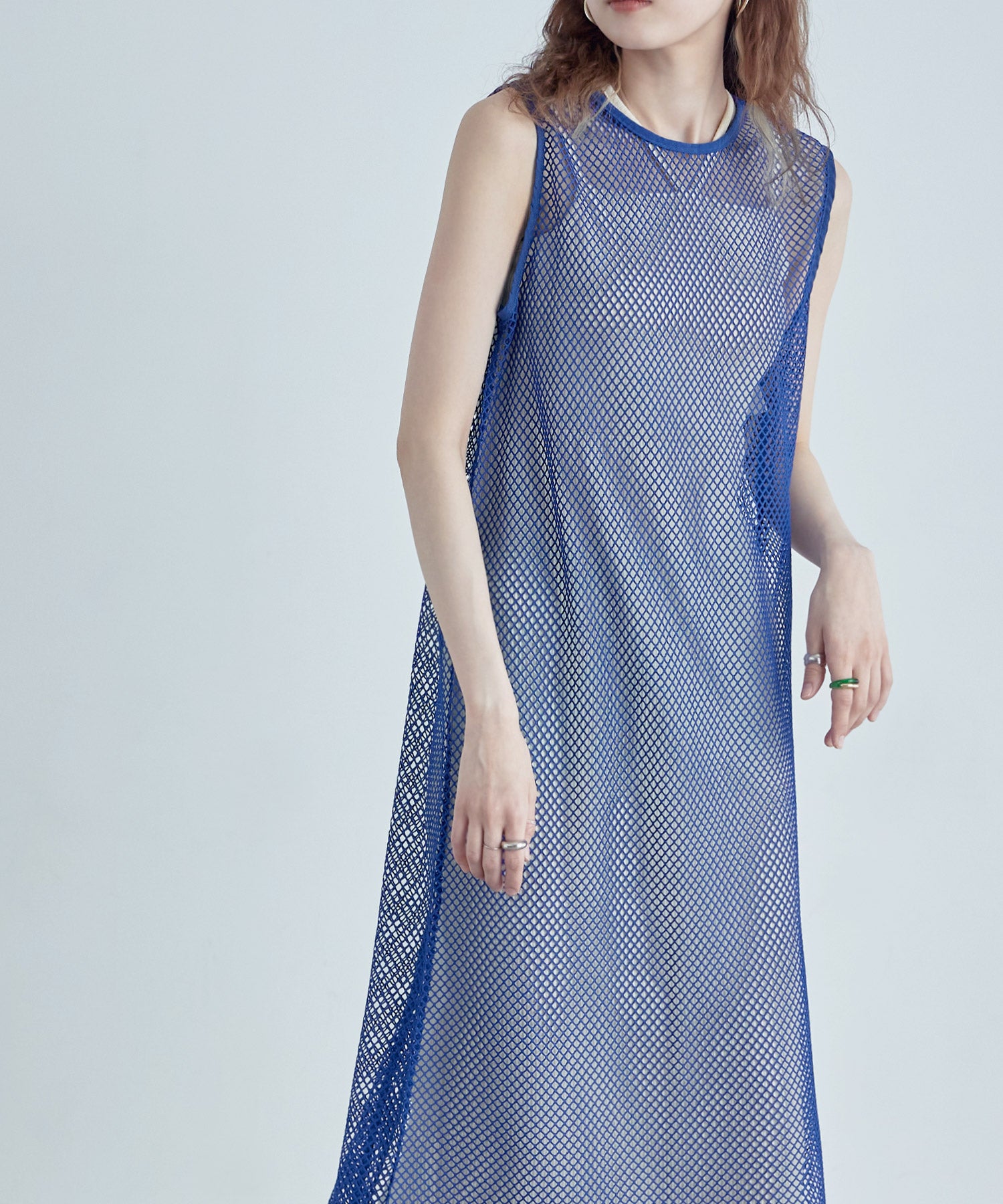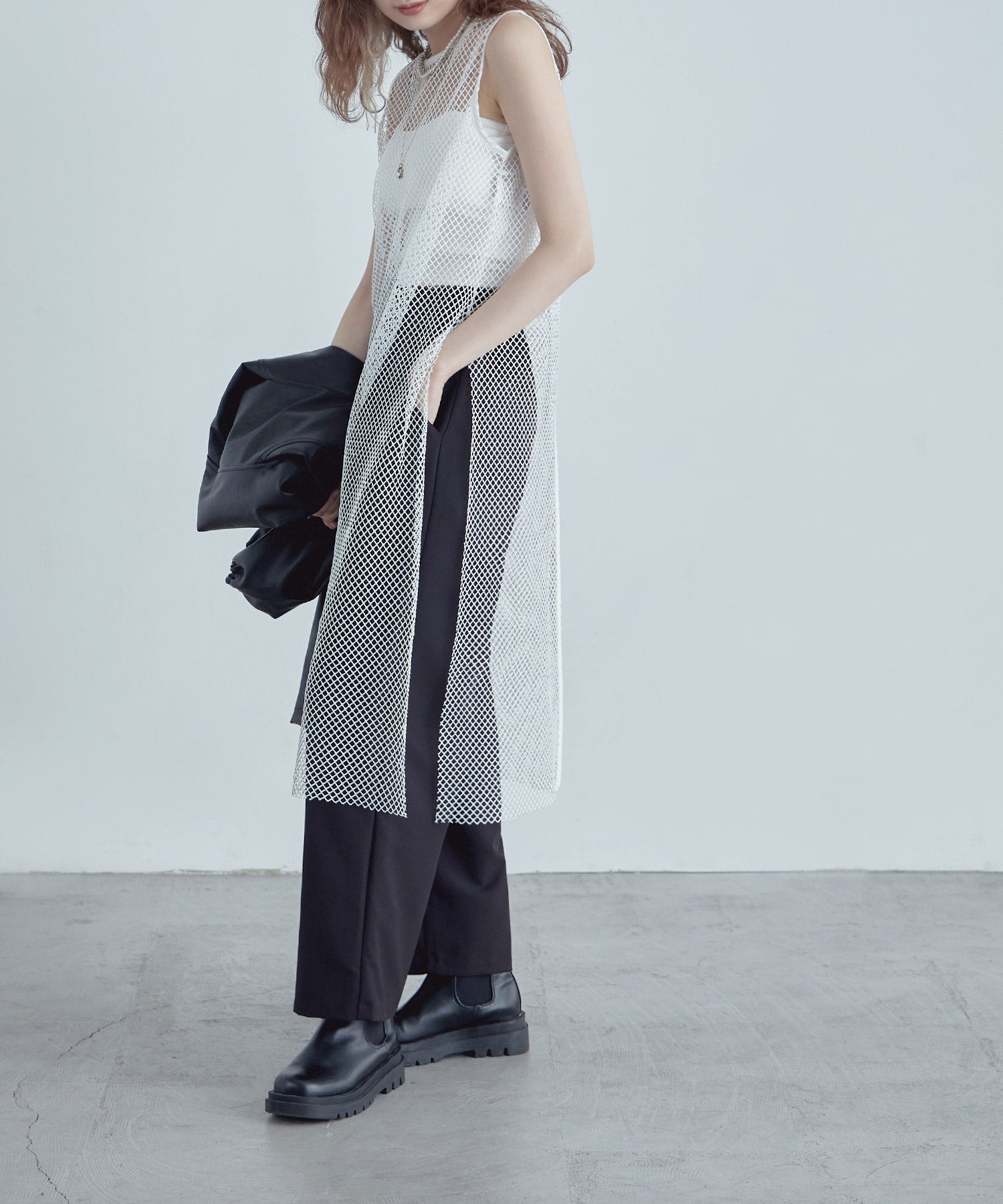 レイヤードコーデをクラスアップするメッシュスリーブレスワンピース。