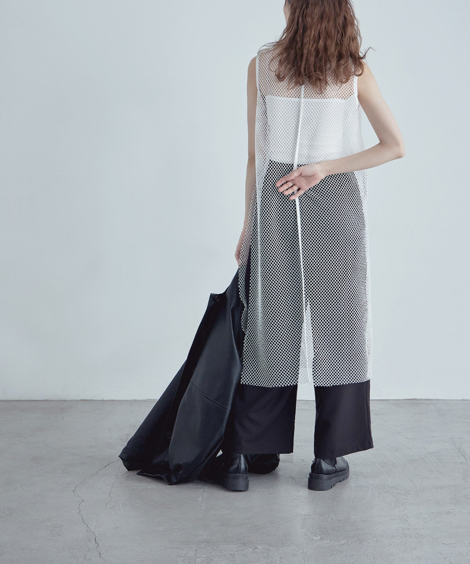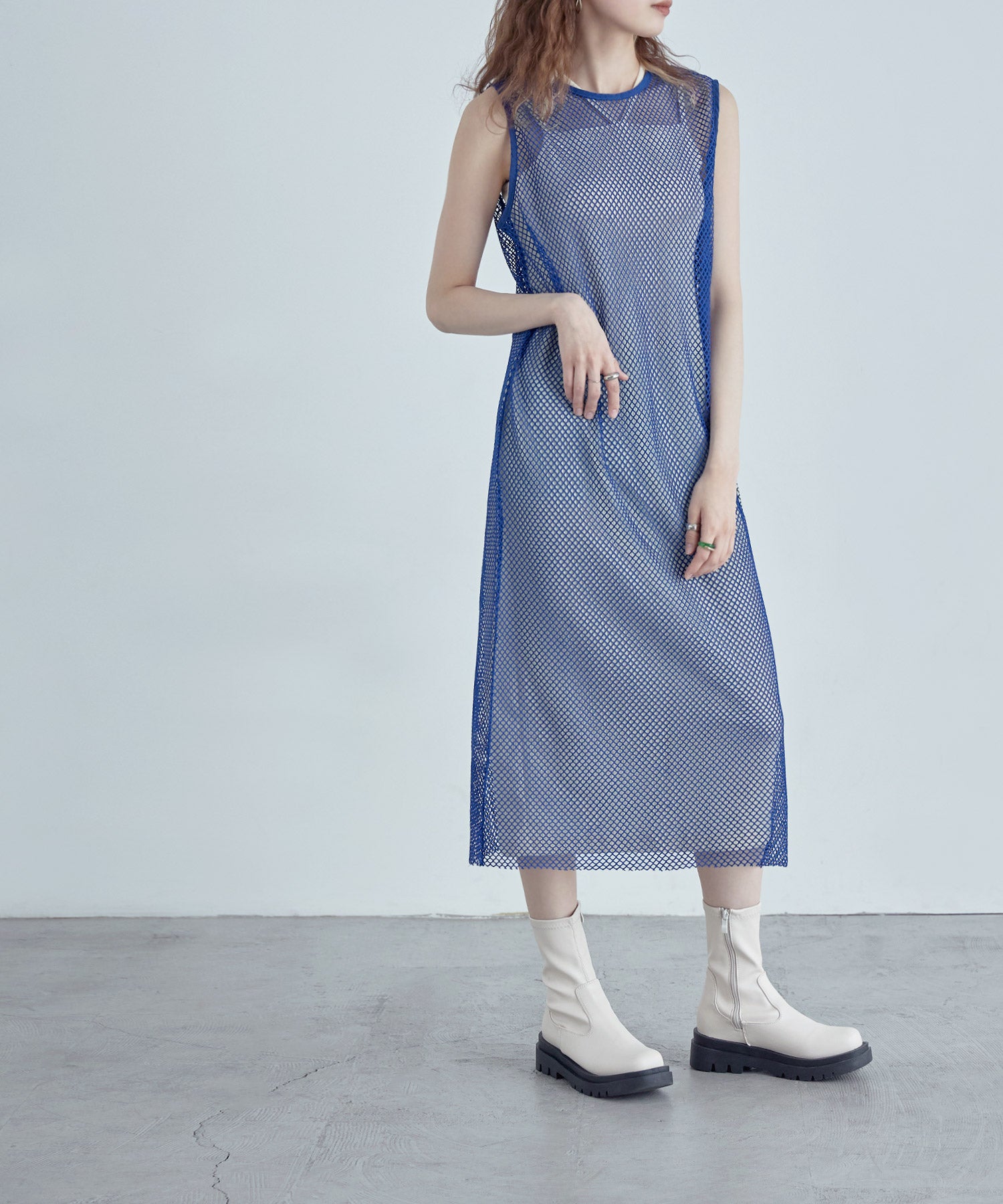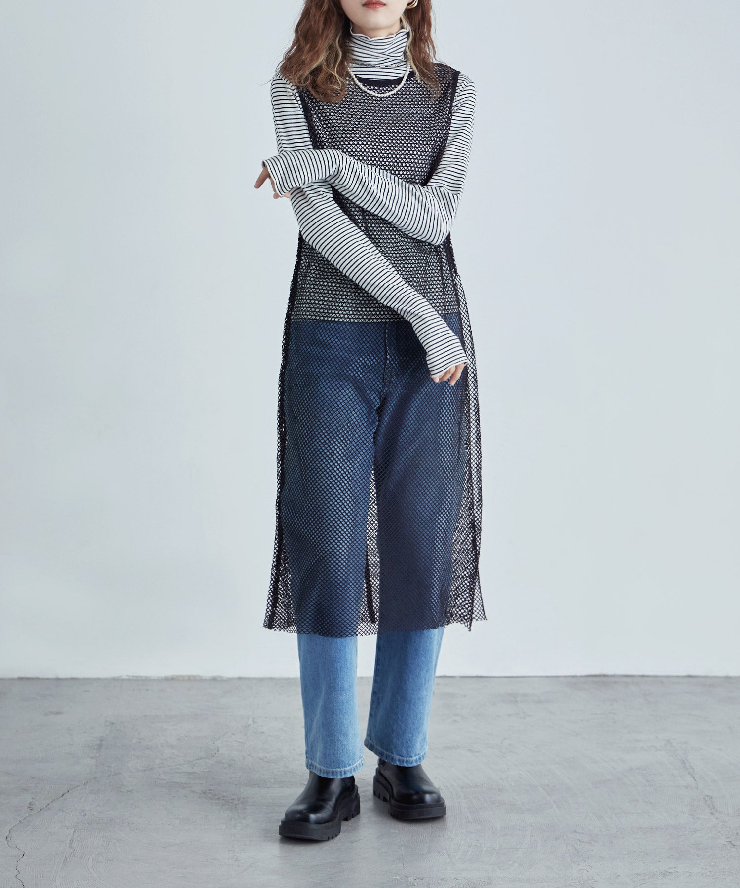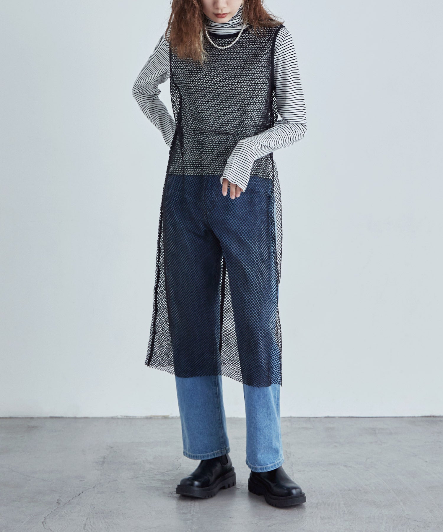 レイヤードコーデをクラスアップするメッシュスリーブレスワンピース。