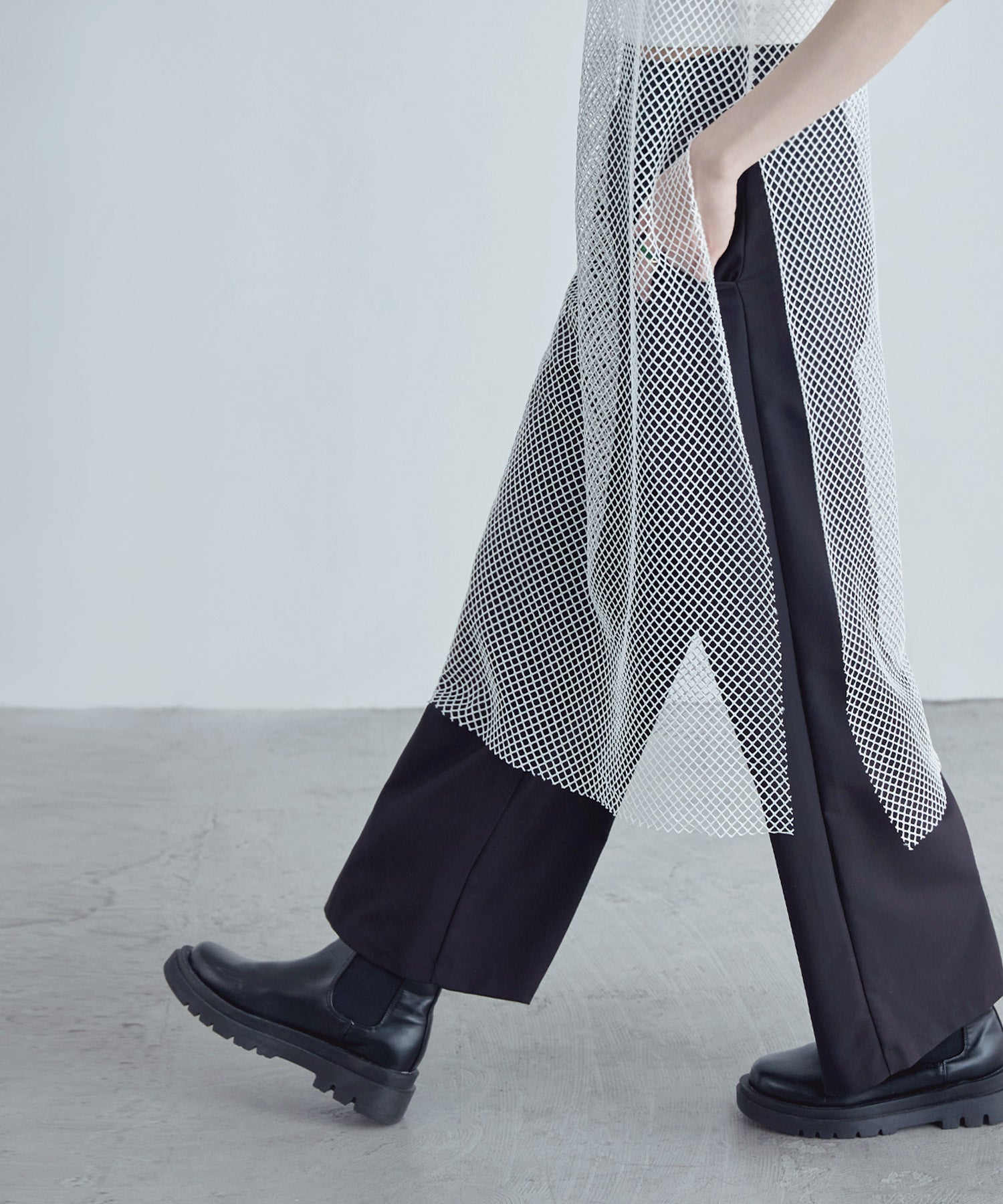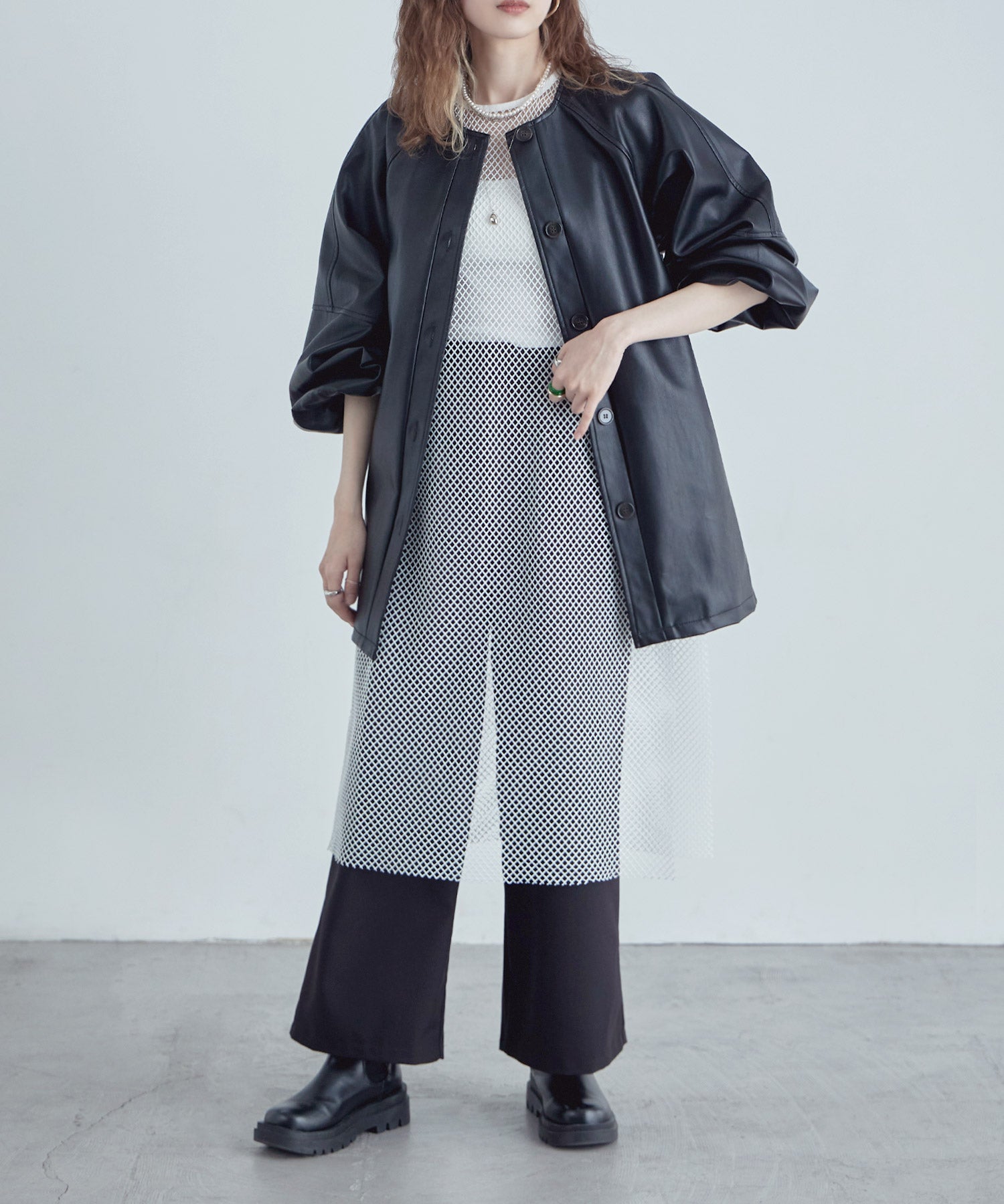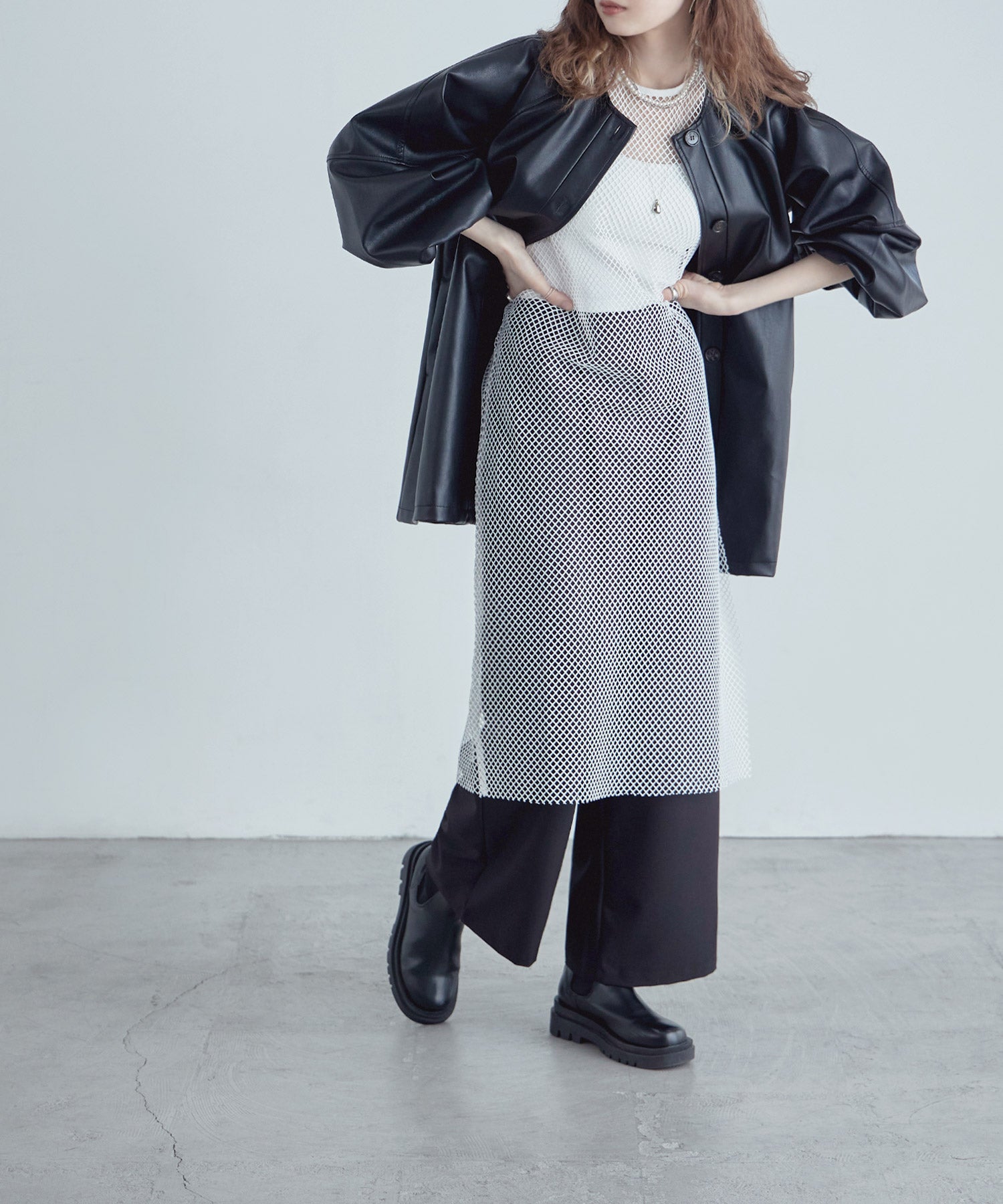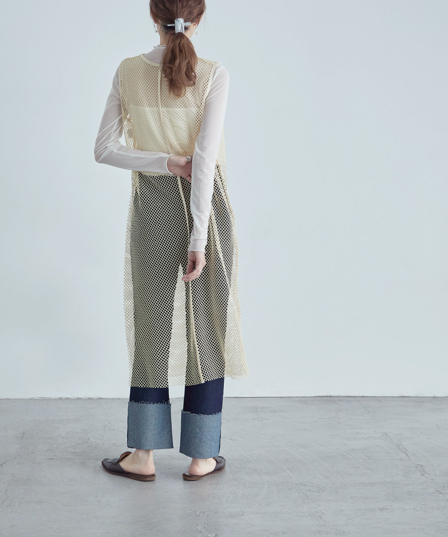 レイヤードコーデをクラスアップするメッシュスリーブレスワンピース。