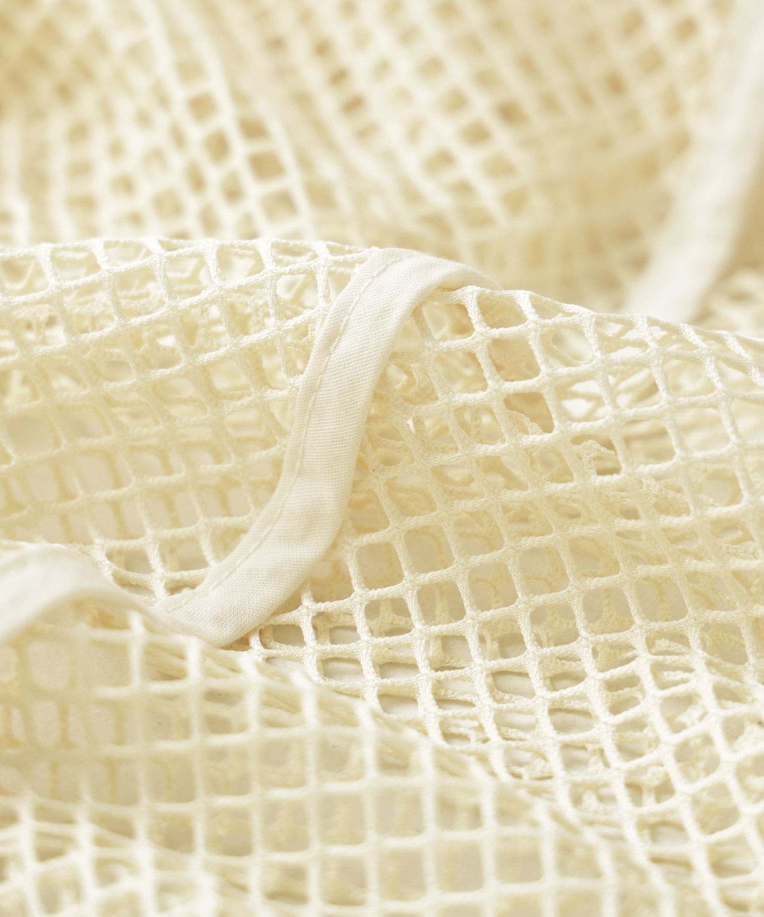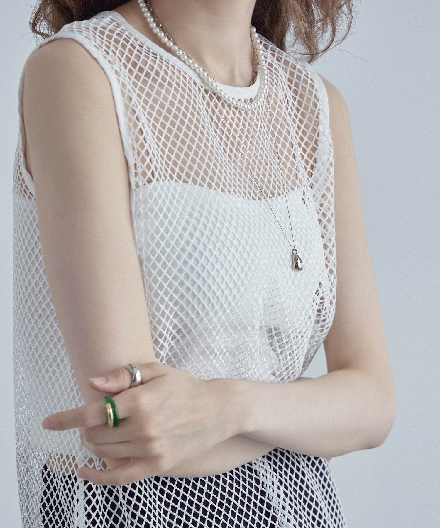 インナーで雰囲気を変えてみたり、肩周りの透け感が気になるときは羽織りものを合わせると、チラ見えするワンポイントメッシュでいつものスタイルをアップデート。
