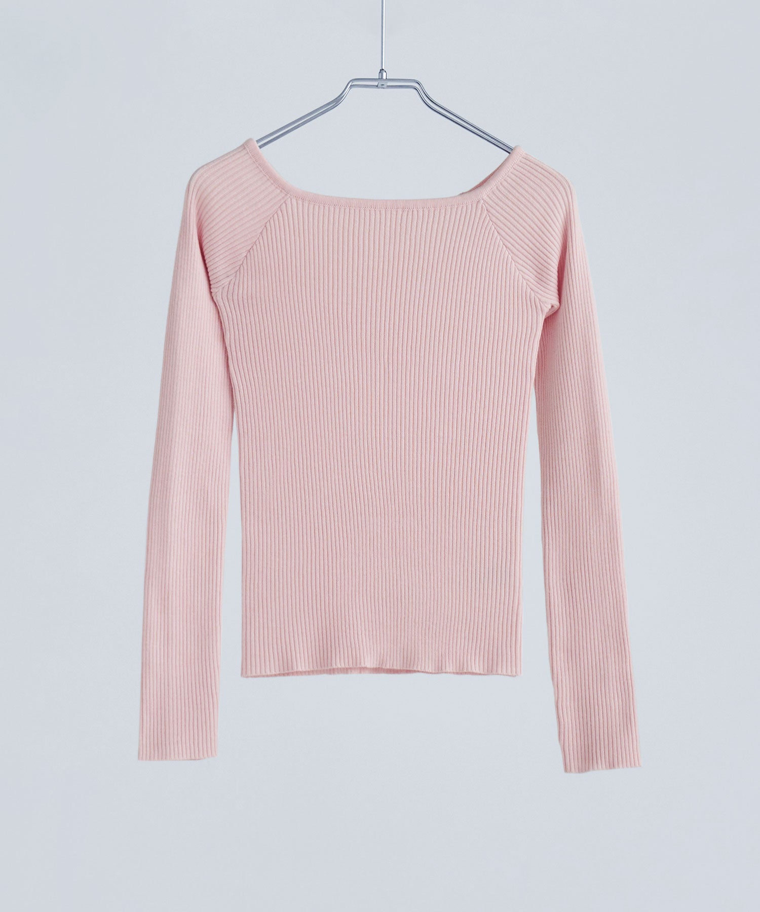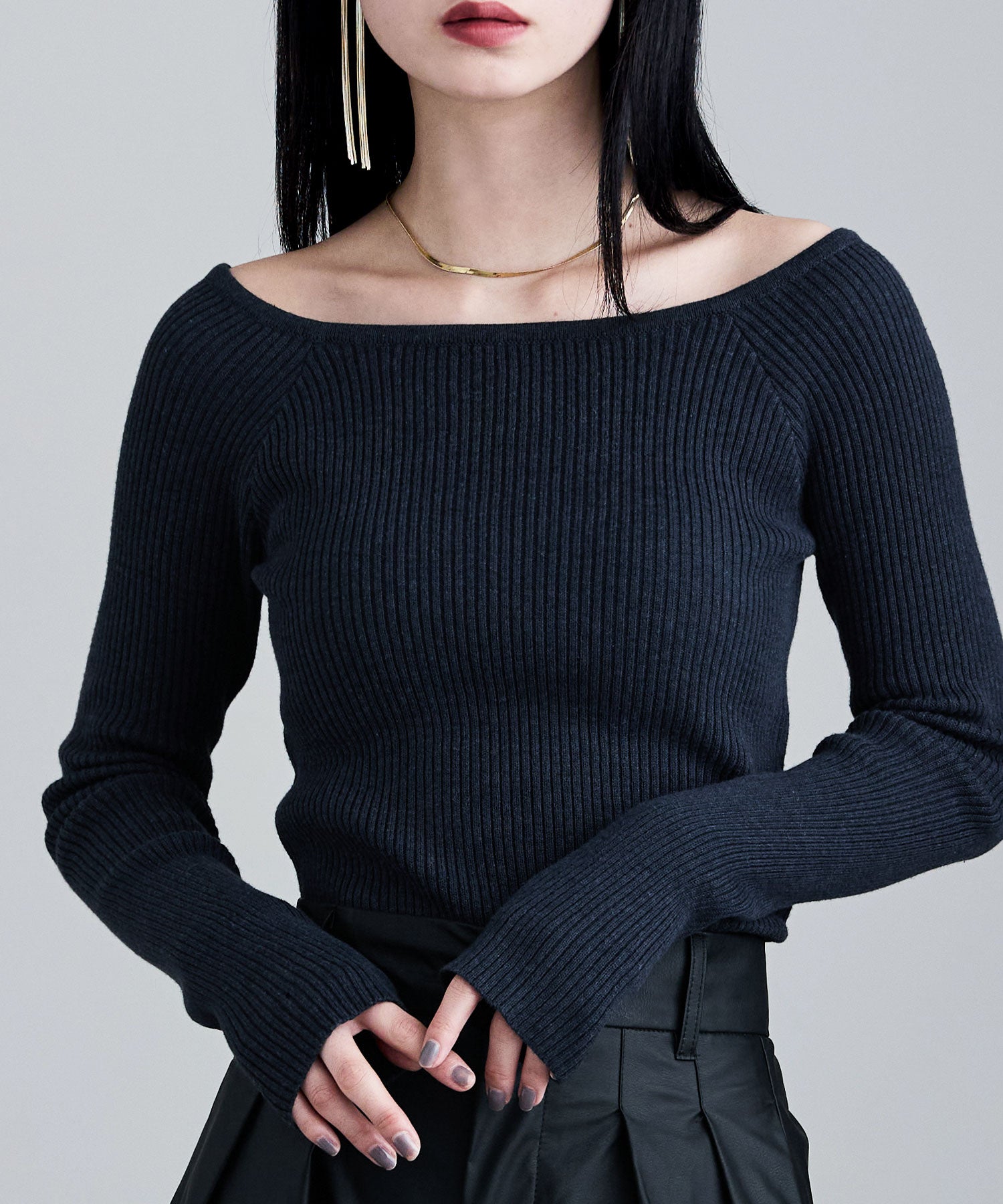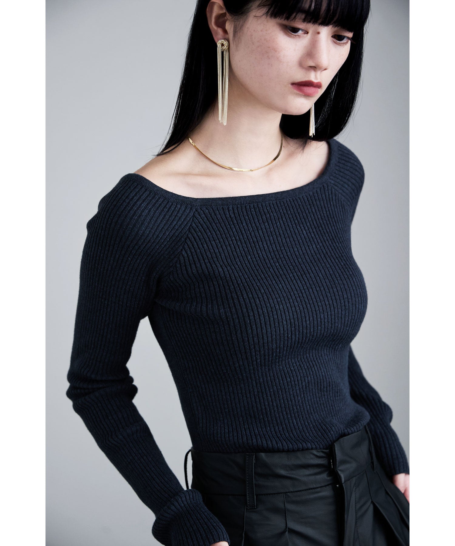 デコルテを綺麗に見せてくれるボートネックとフィットするシルエットが綺麗なリブニット。