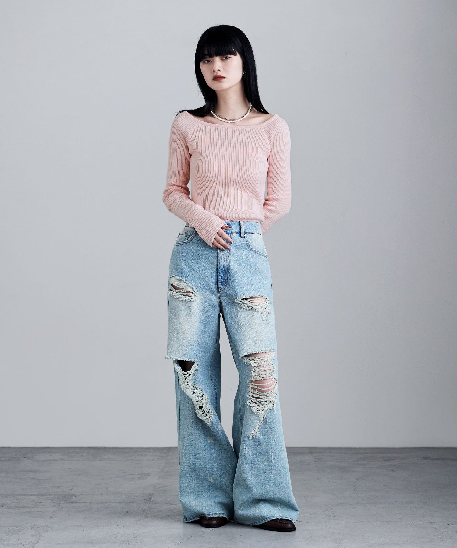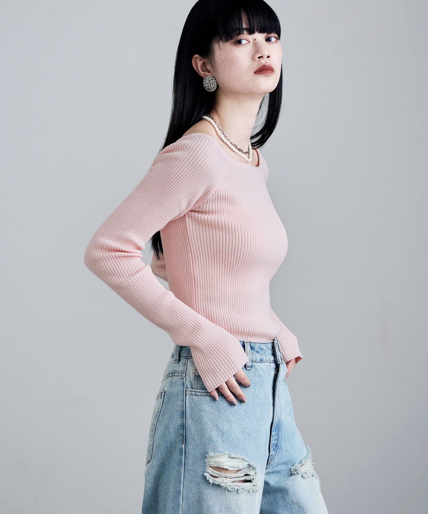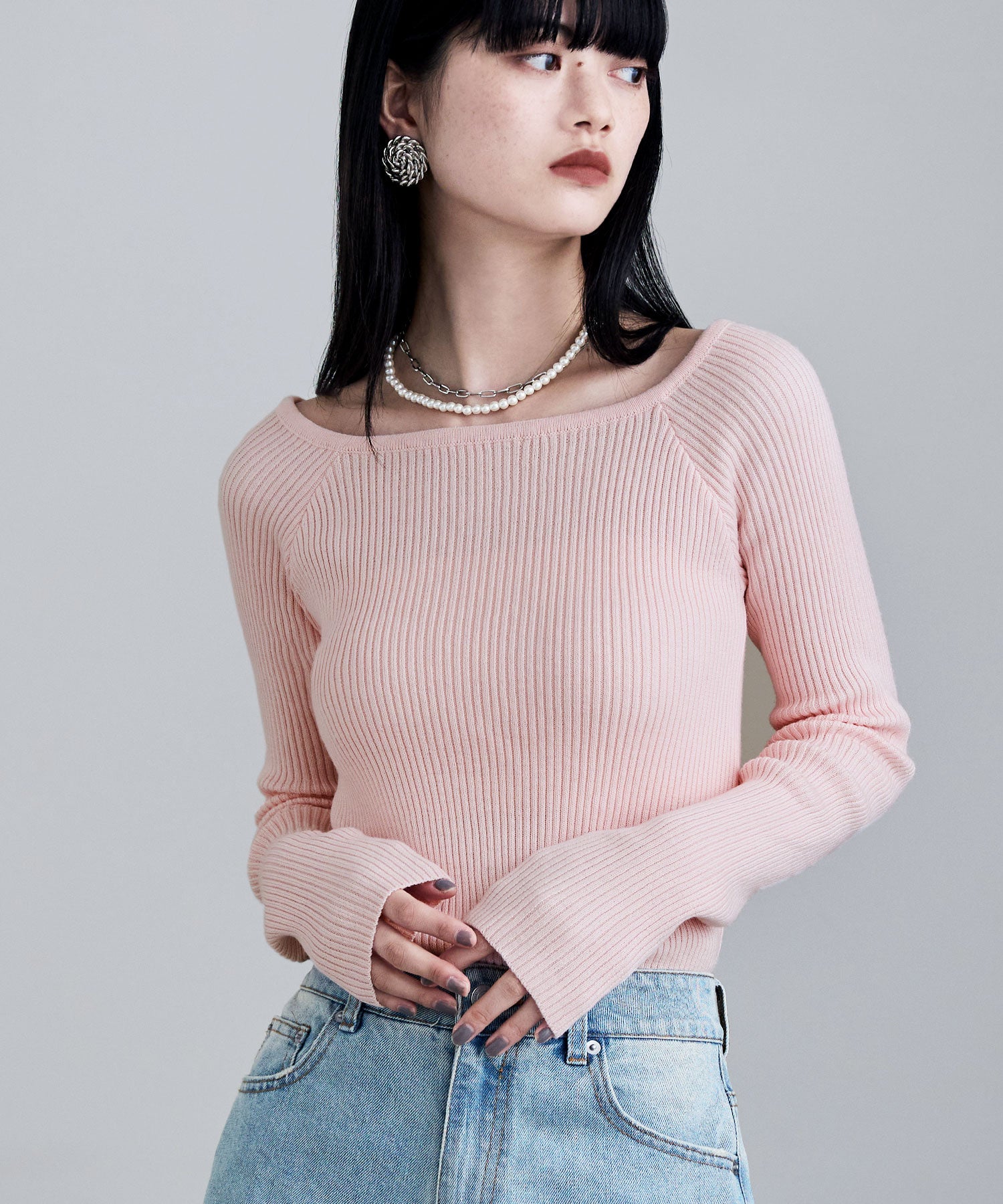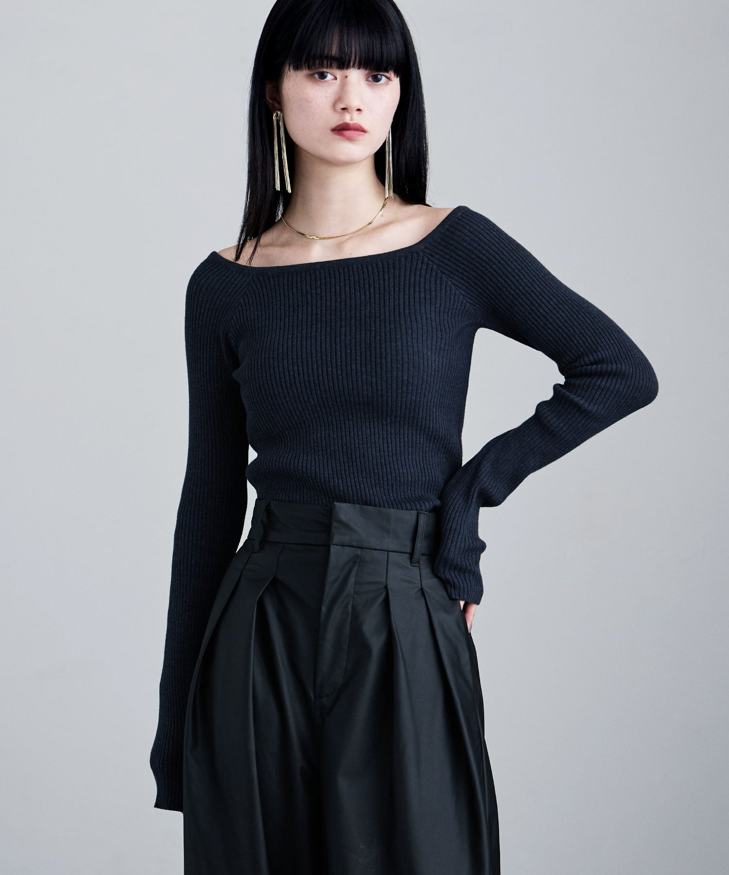 デコルテを綺麗に見せてくれるボートネックとフィットするシルエットが綺麗なリブニット。