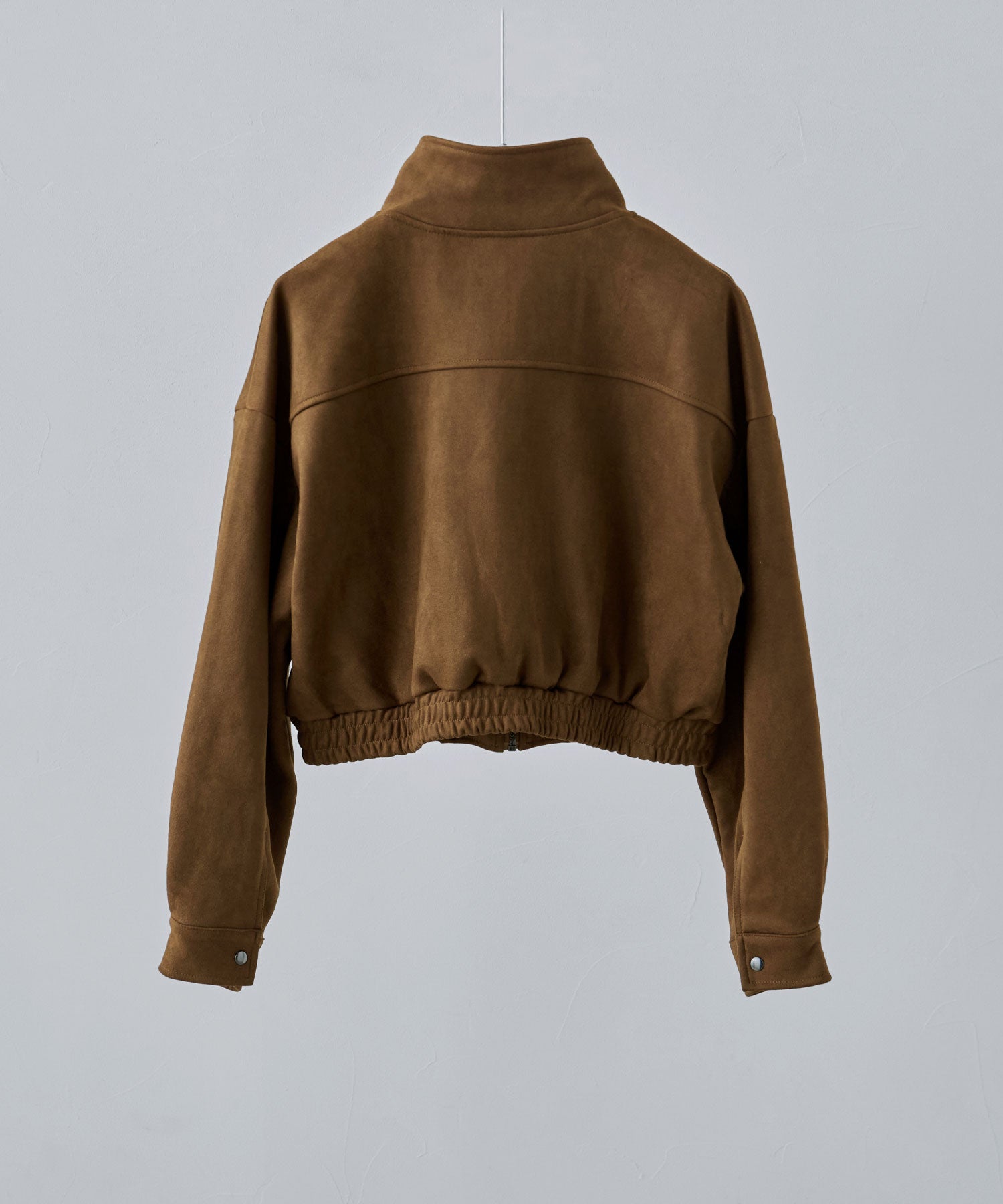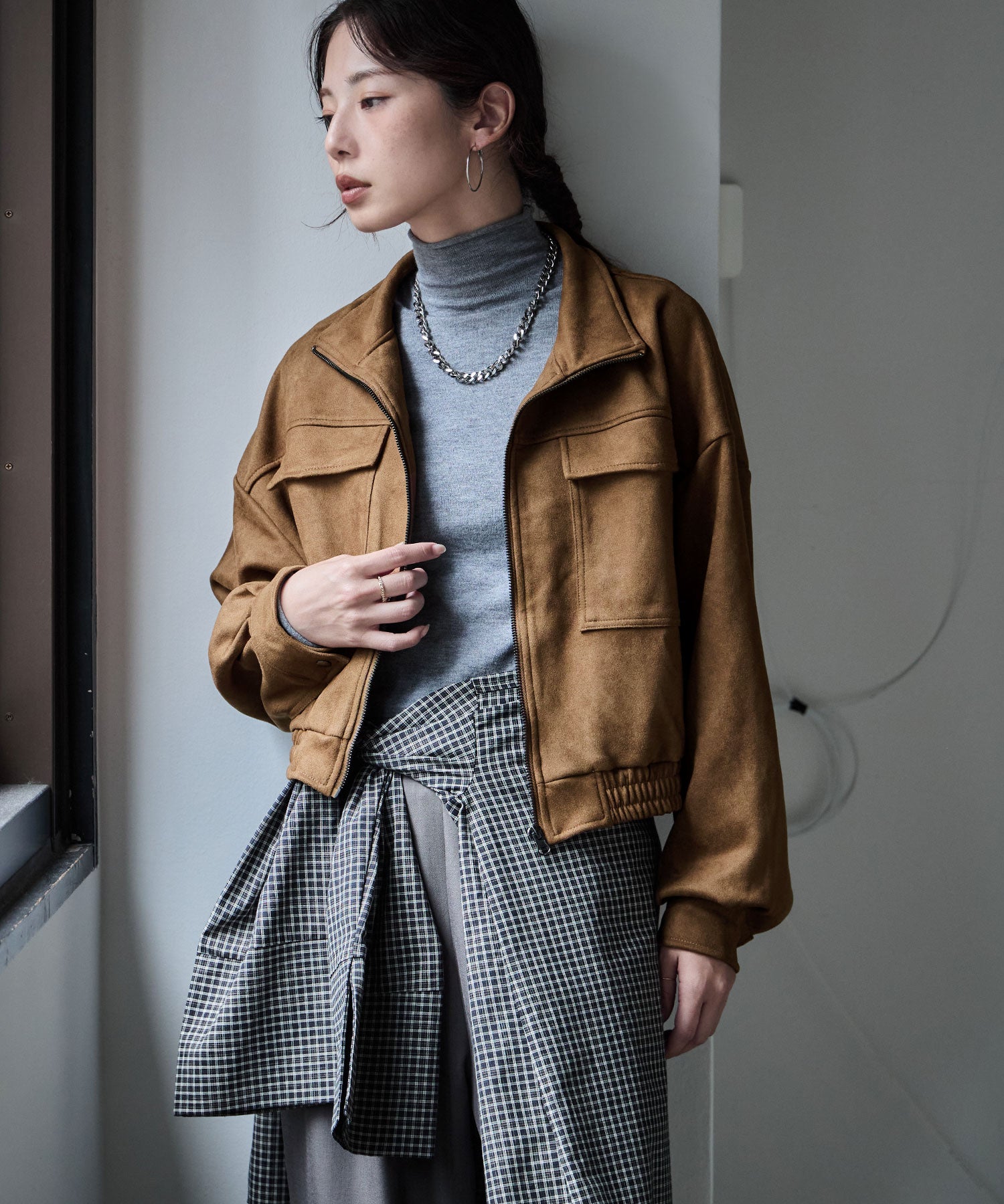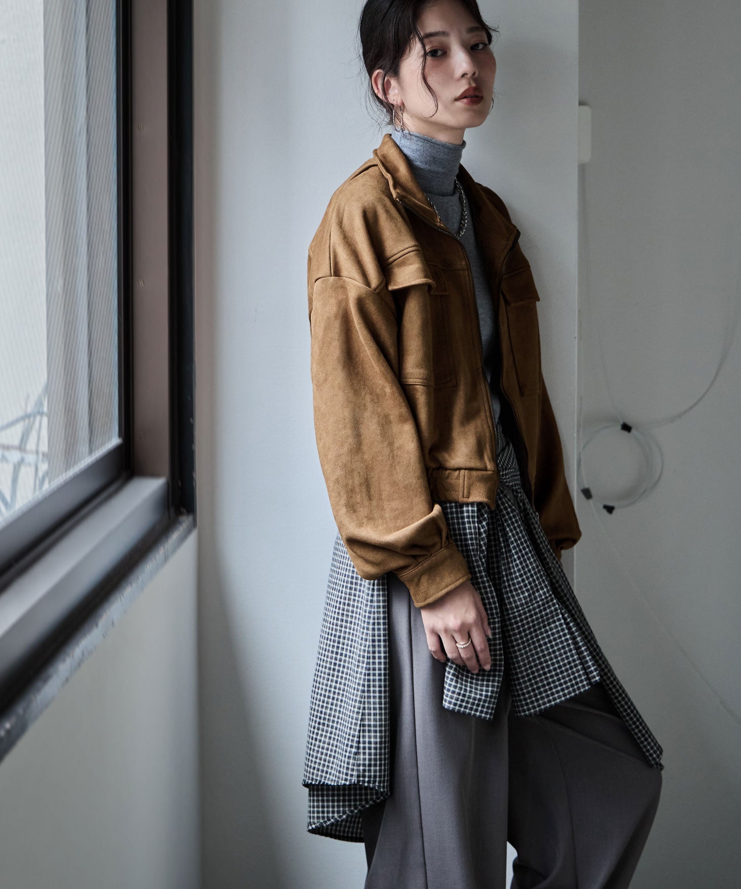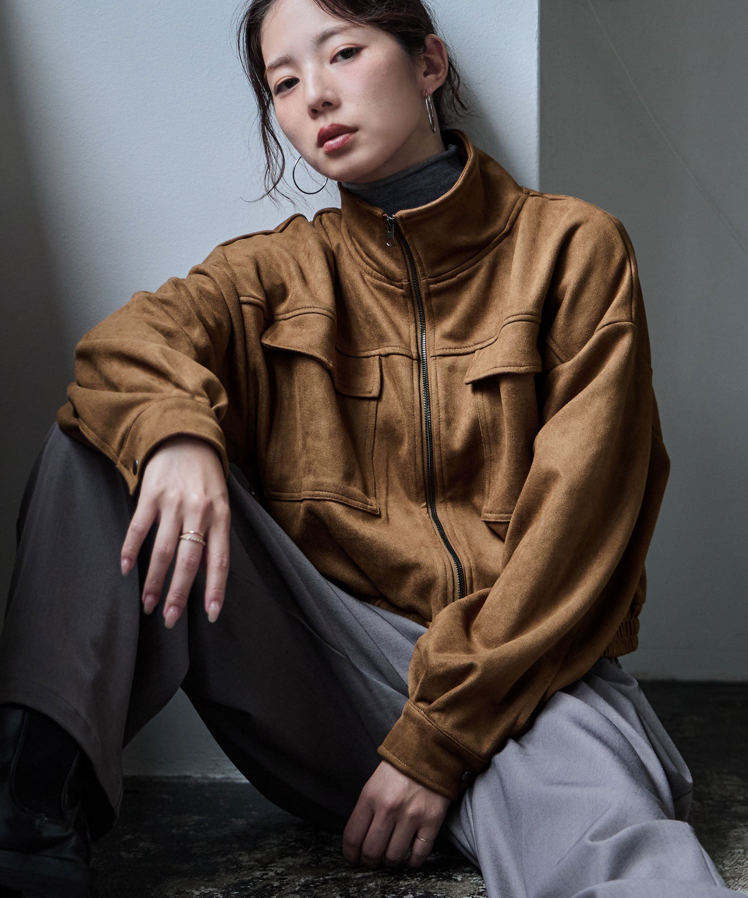 ハイセンスなスタンドネック、気軽に羽織れるくたっと感が魅力のスエード風素材。