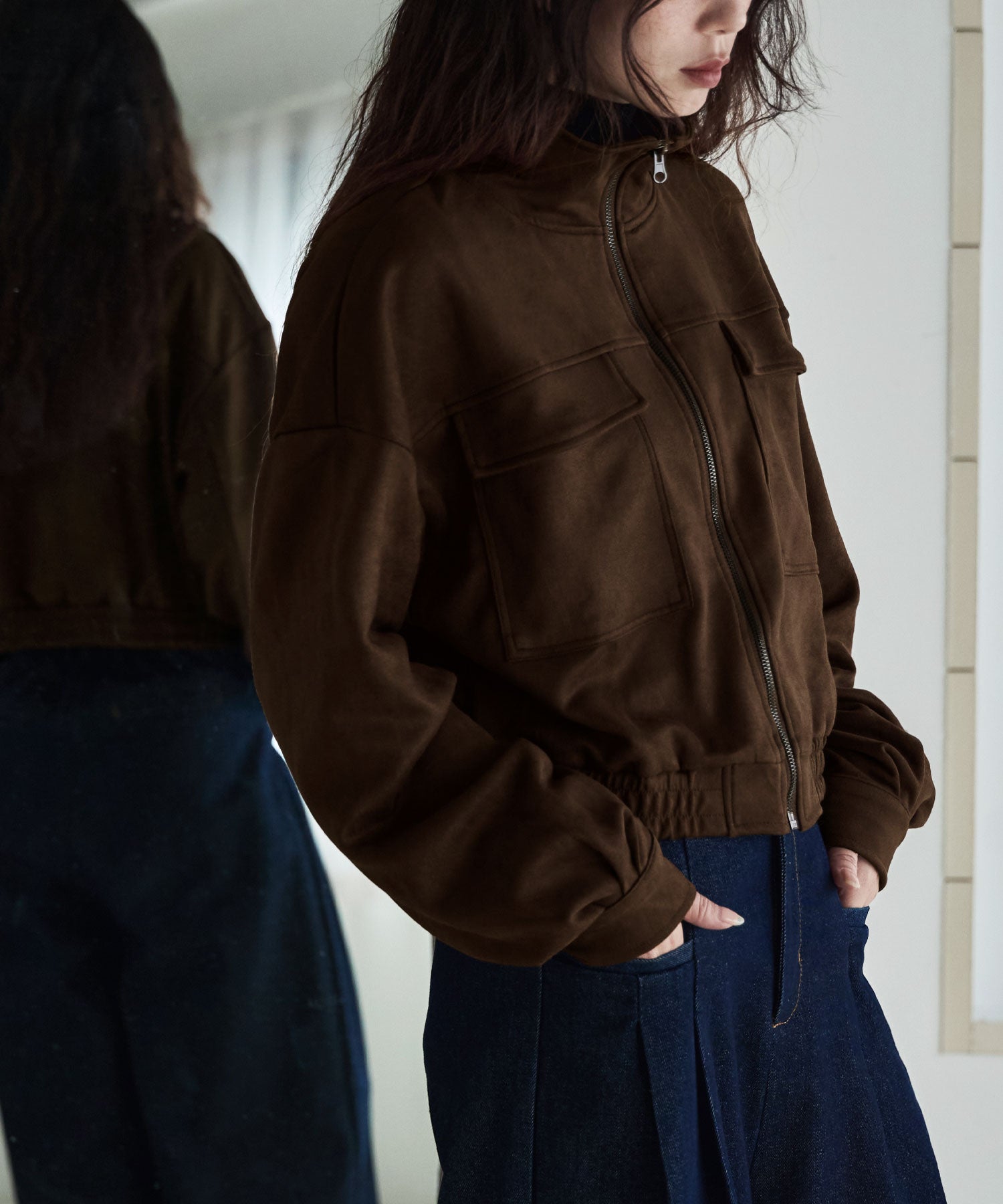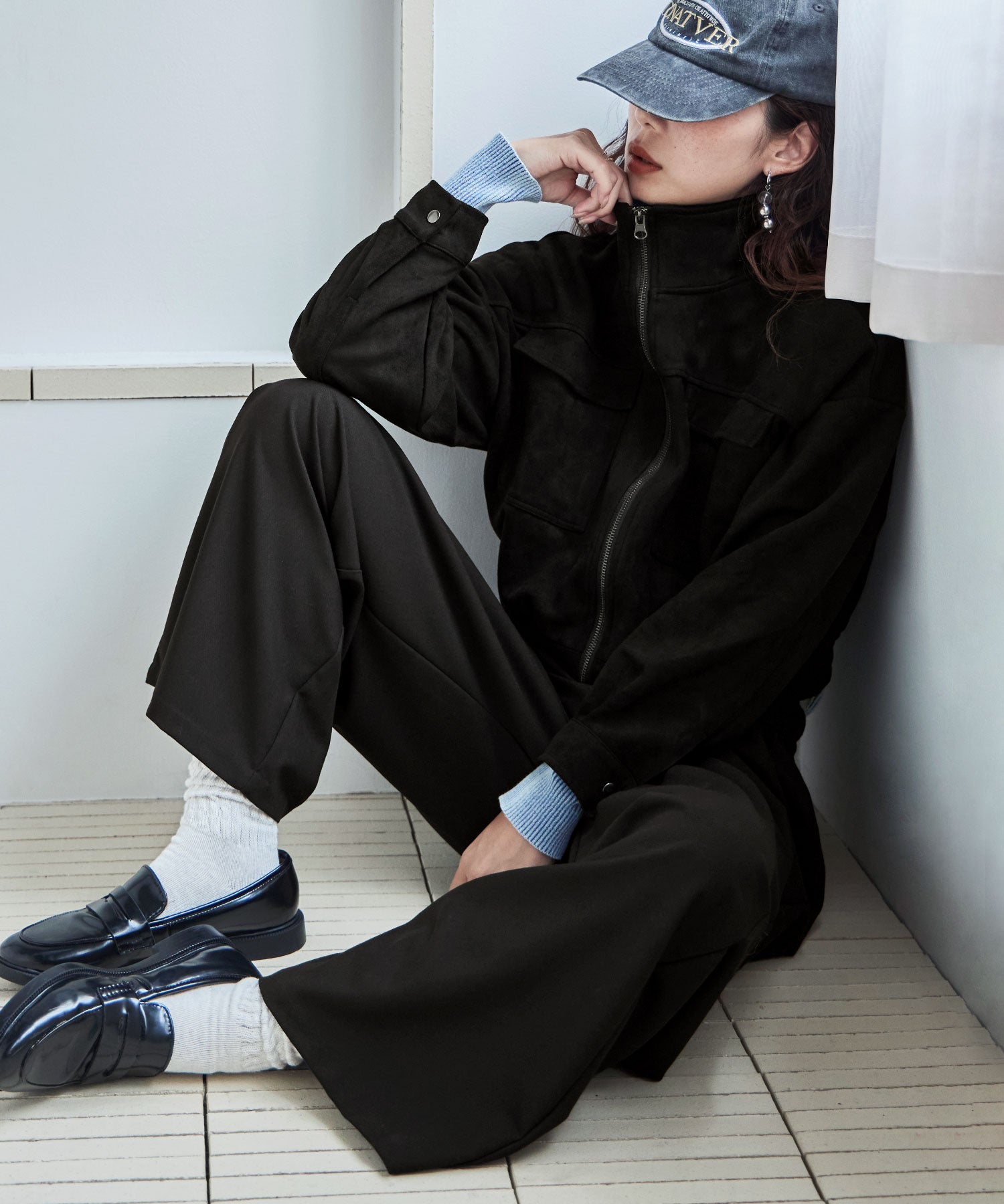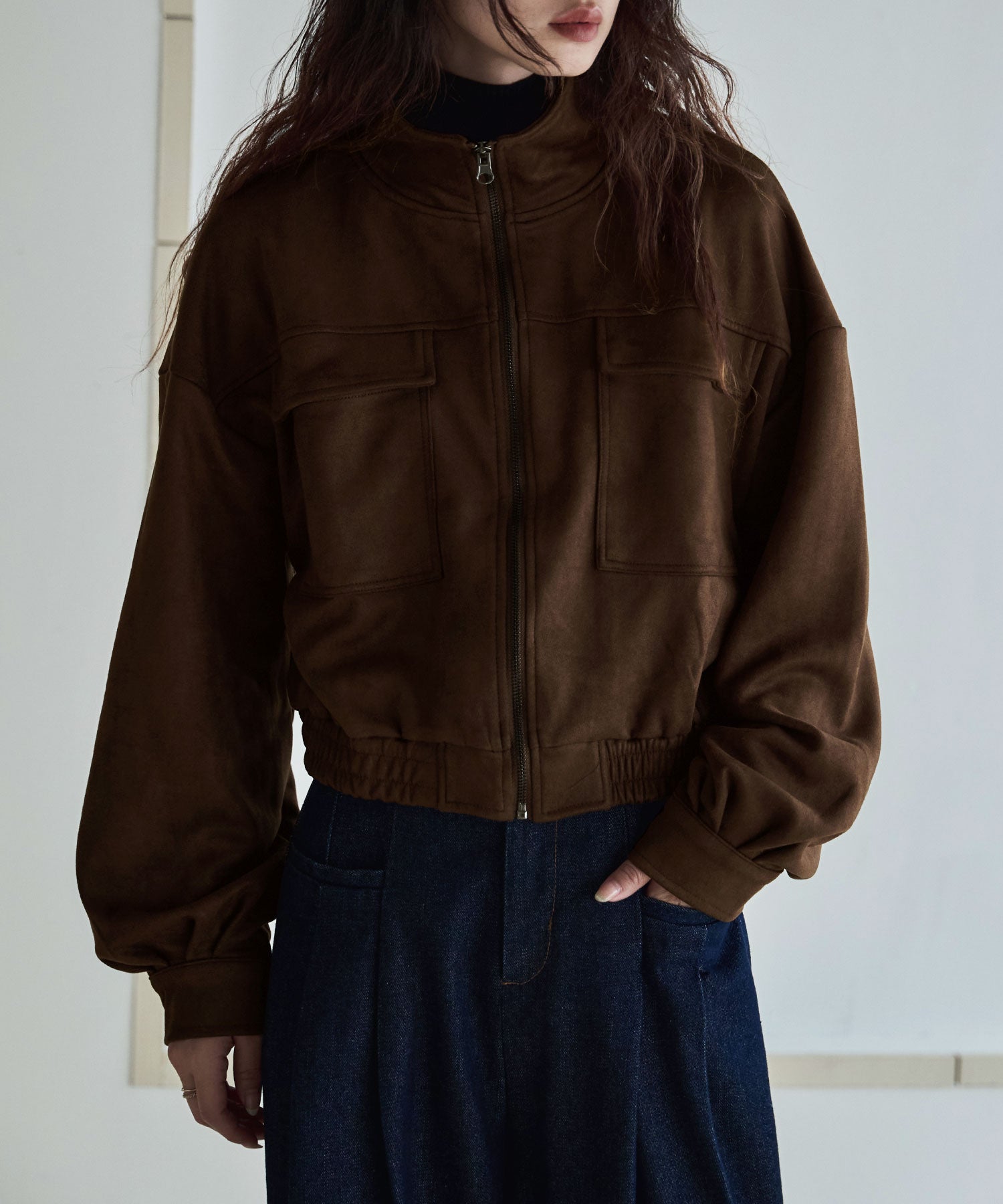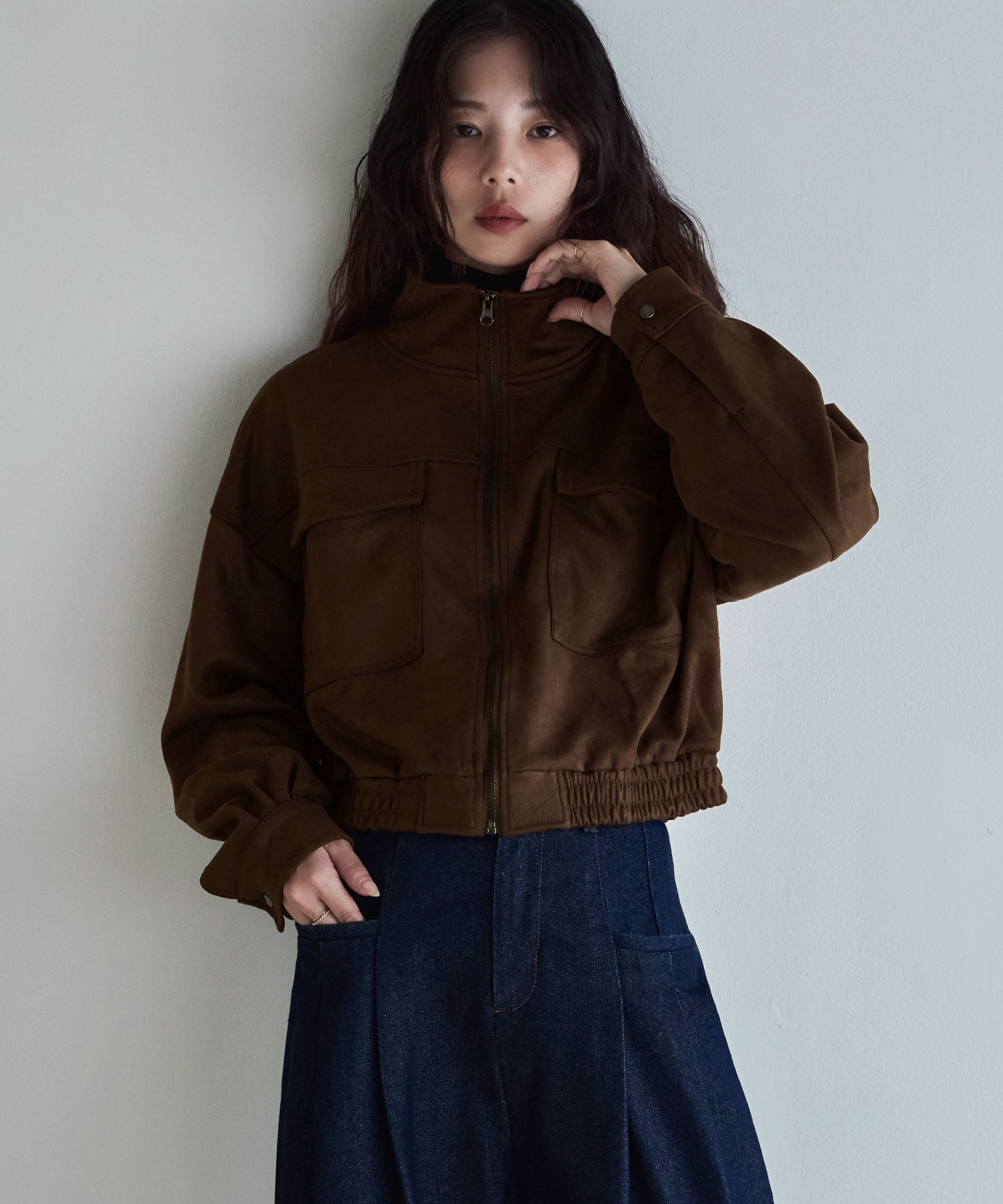 ハイセンスなスタンドネック、気軽に羽織れるくたっと感が魅力のスエード風素材。