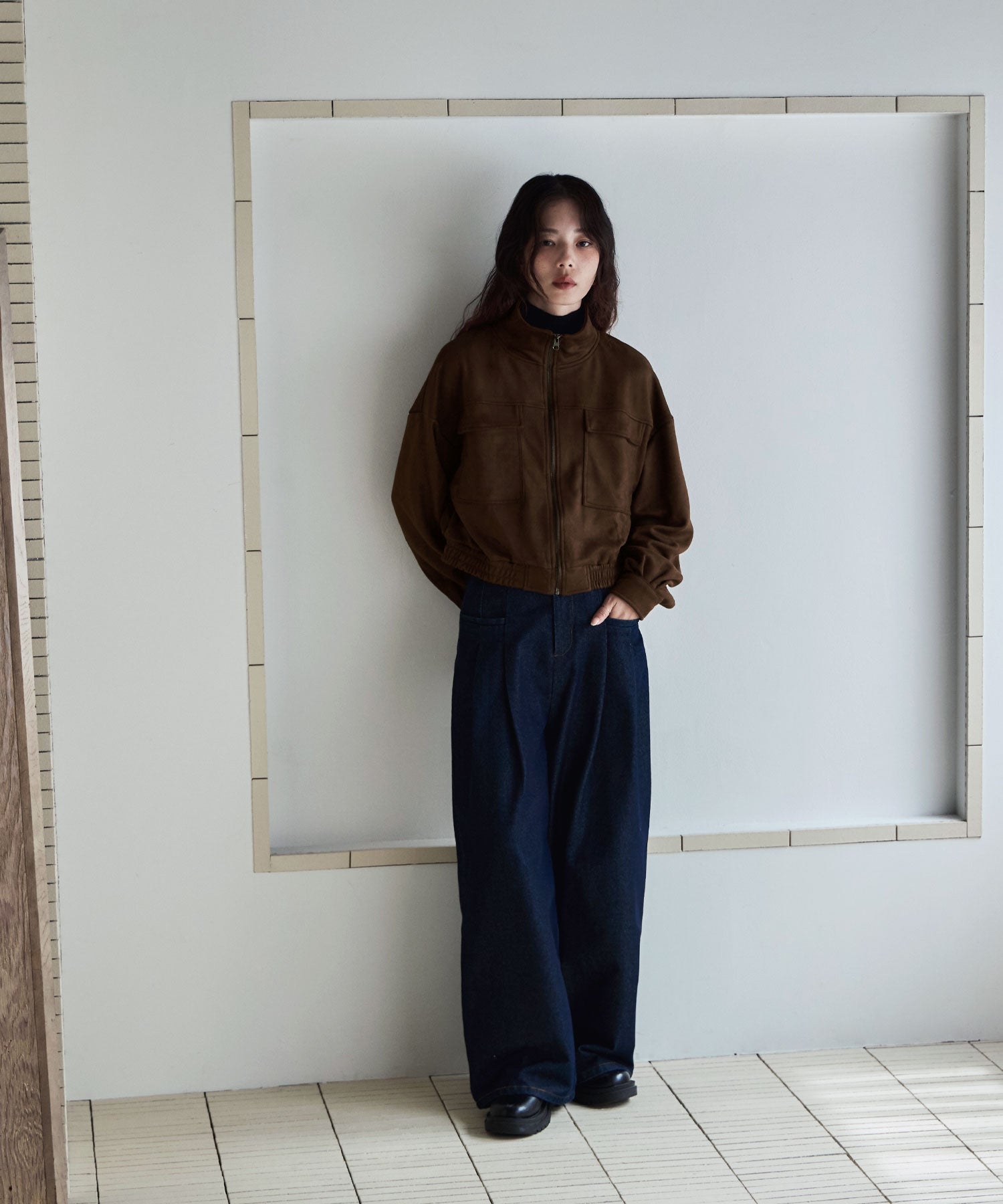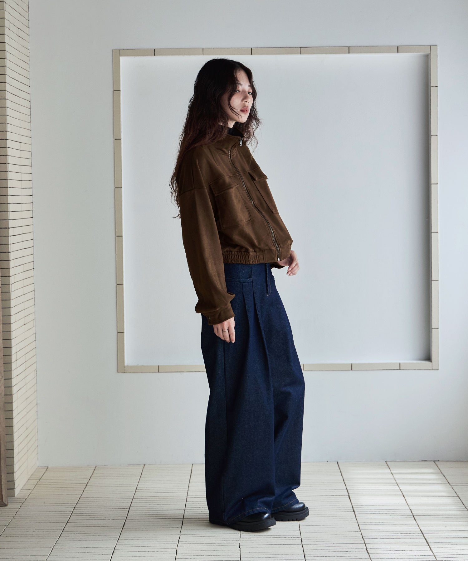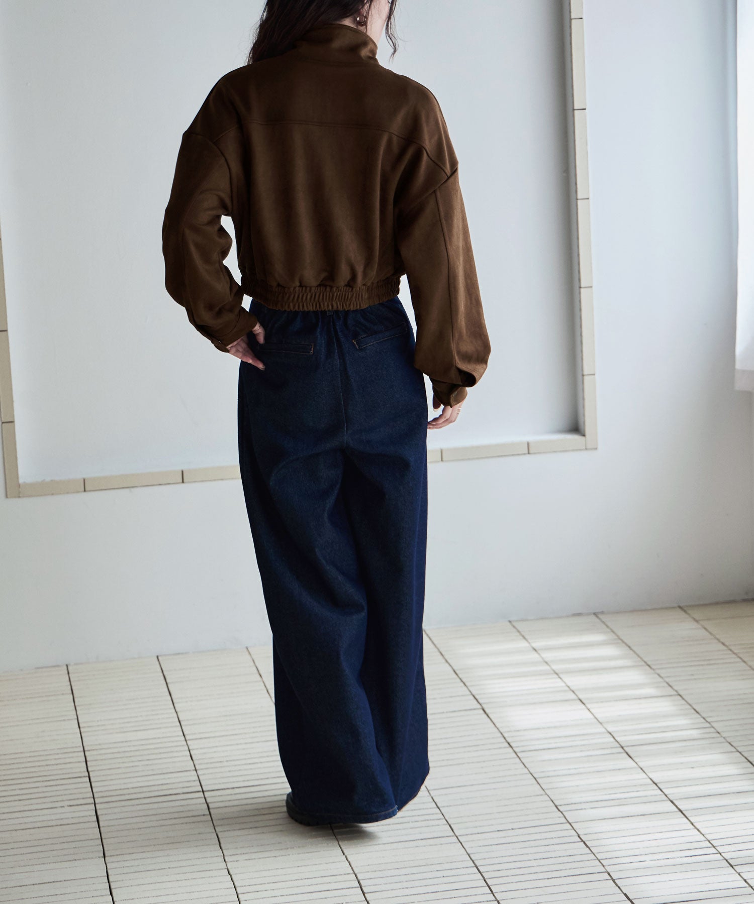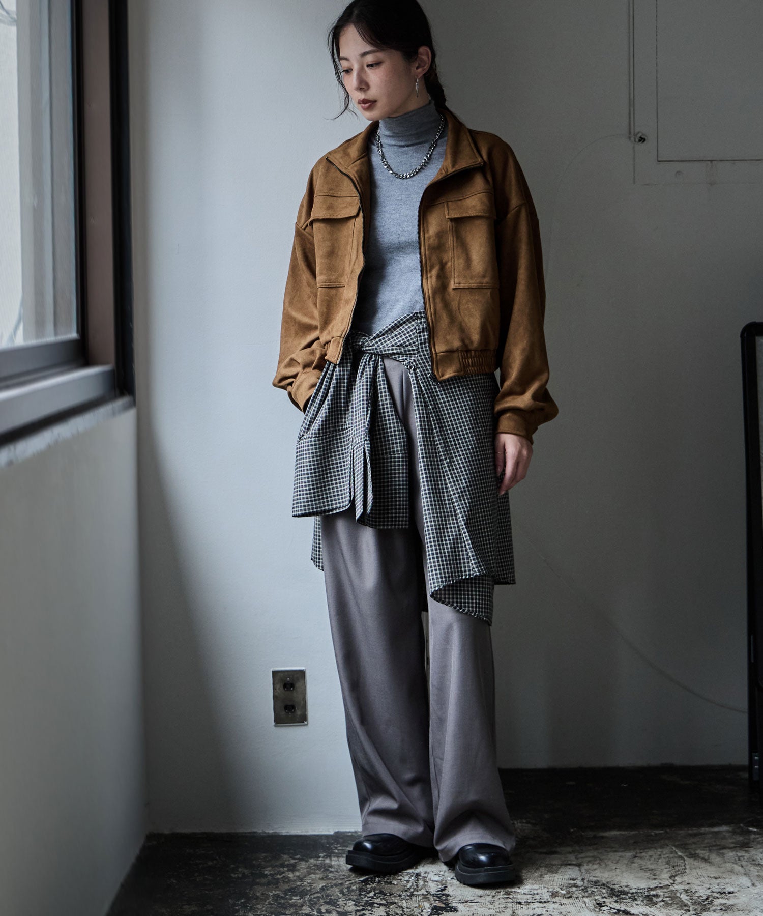 ハイセンスなスタンドネック、気軽に羽織れるくたっと感が魅力のスエード風素材。
