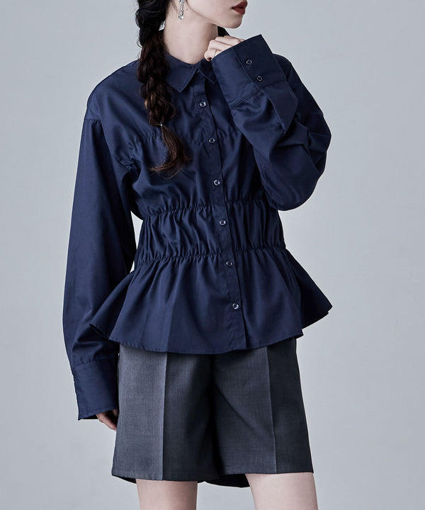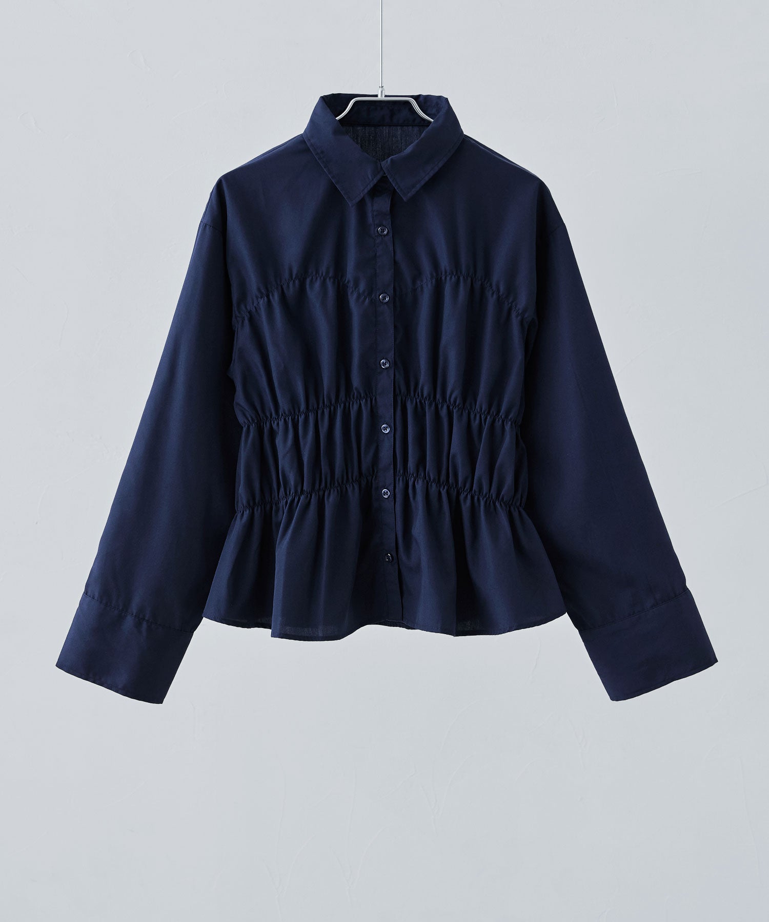 Rname ウエストシャーリングペプラムブラウス トップス シャツ ブラウス 長袖 綿 シャーリング ギャザー ハイネック レギュラーカラー ワイドスリーブ ペプラム フレア