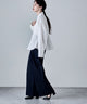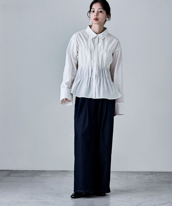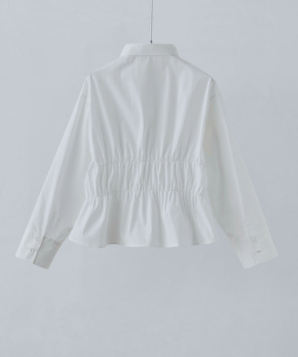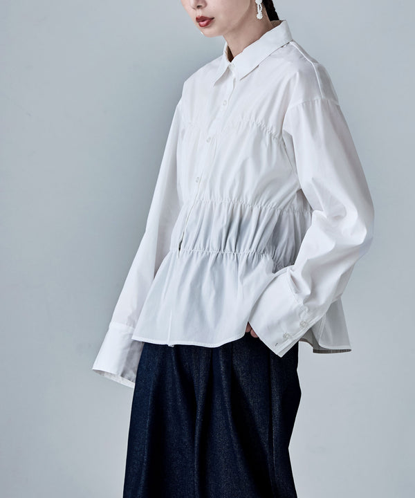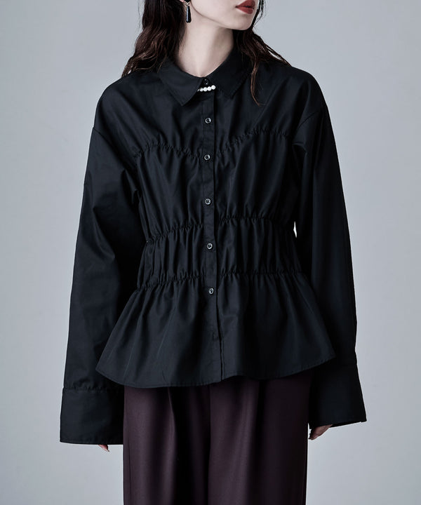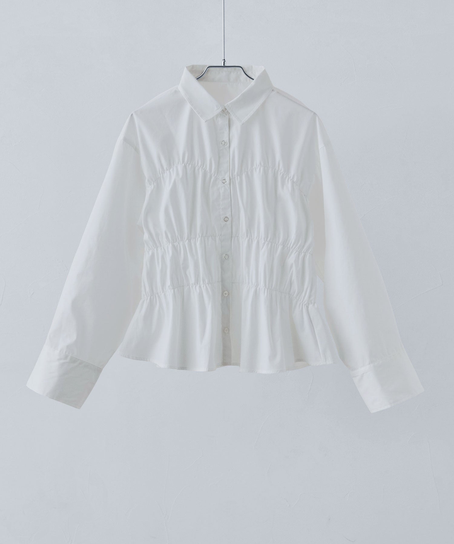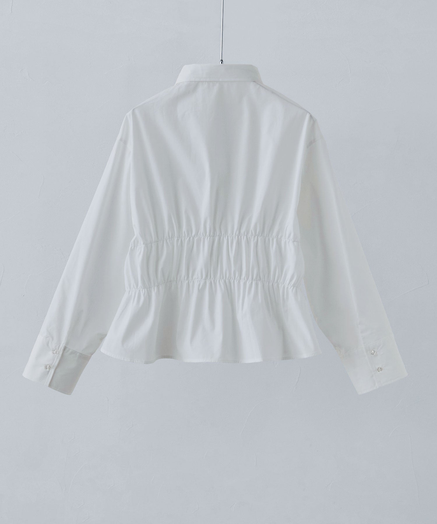 シャーリングとペプラムラインで甘さとモード感が目にとまるブラウス。