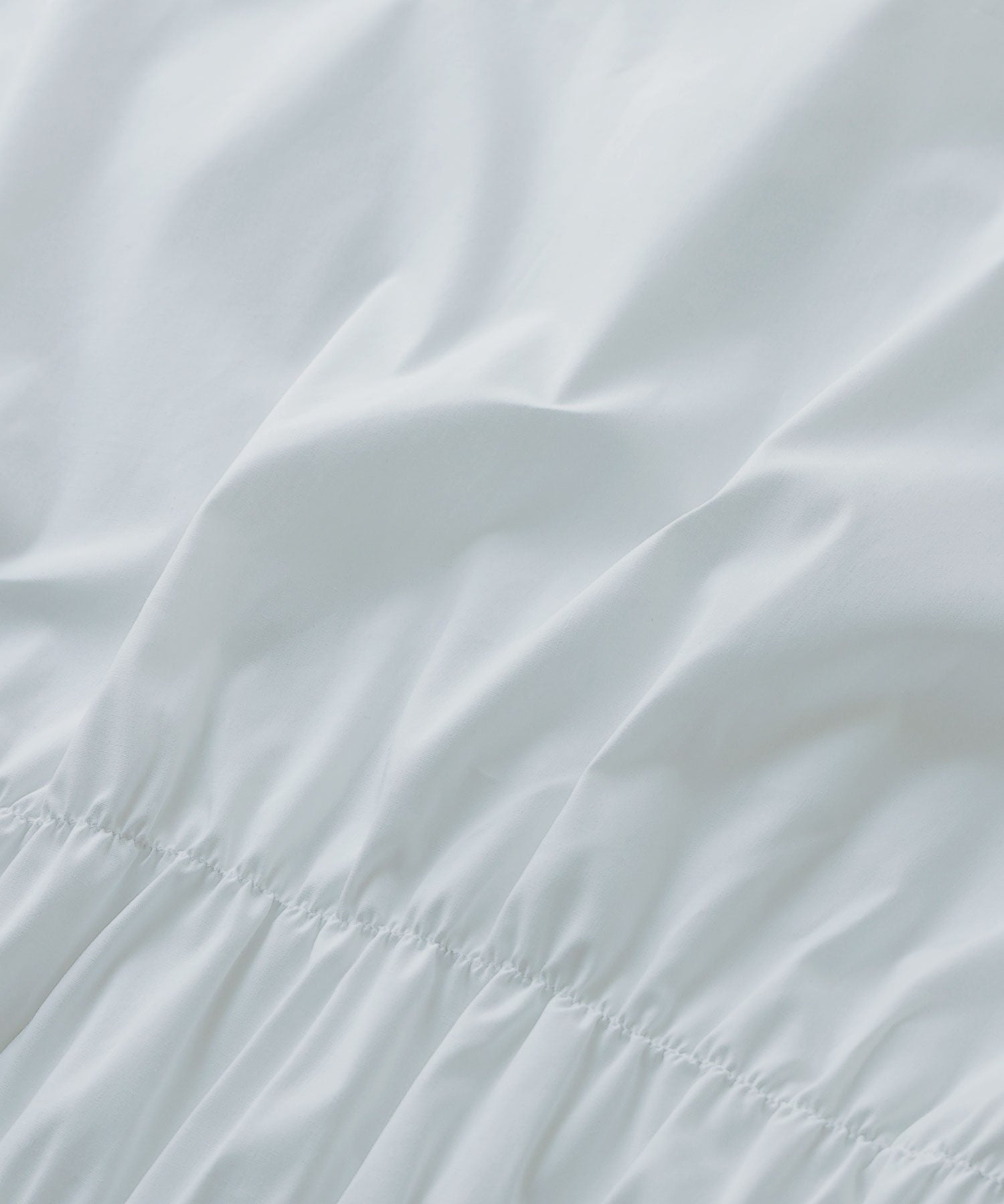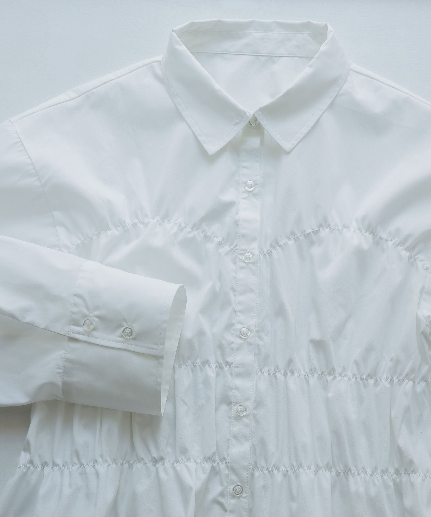 シャーリングの立体感、広がるフレア感が美しく、自然と女性らしいきれいなラインにまとまり、