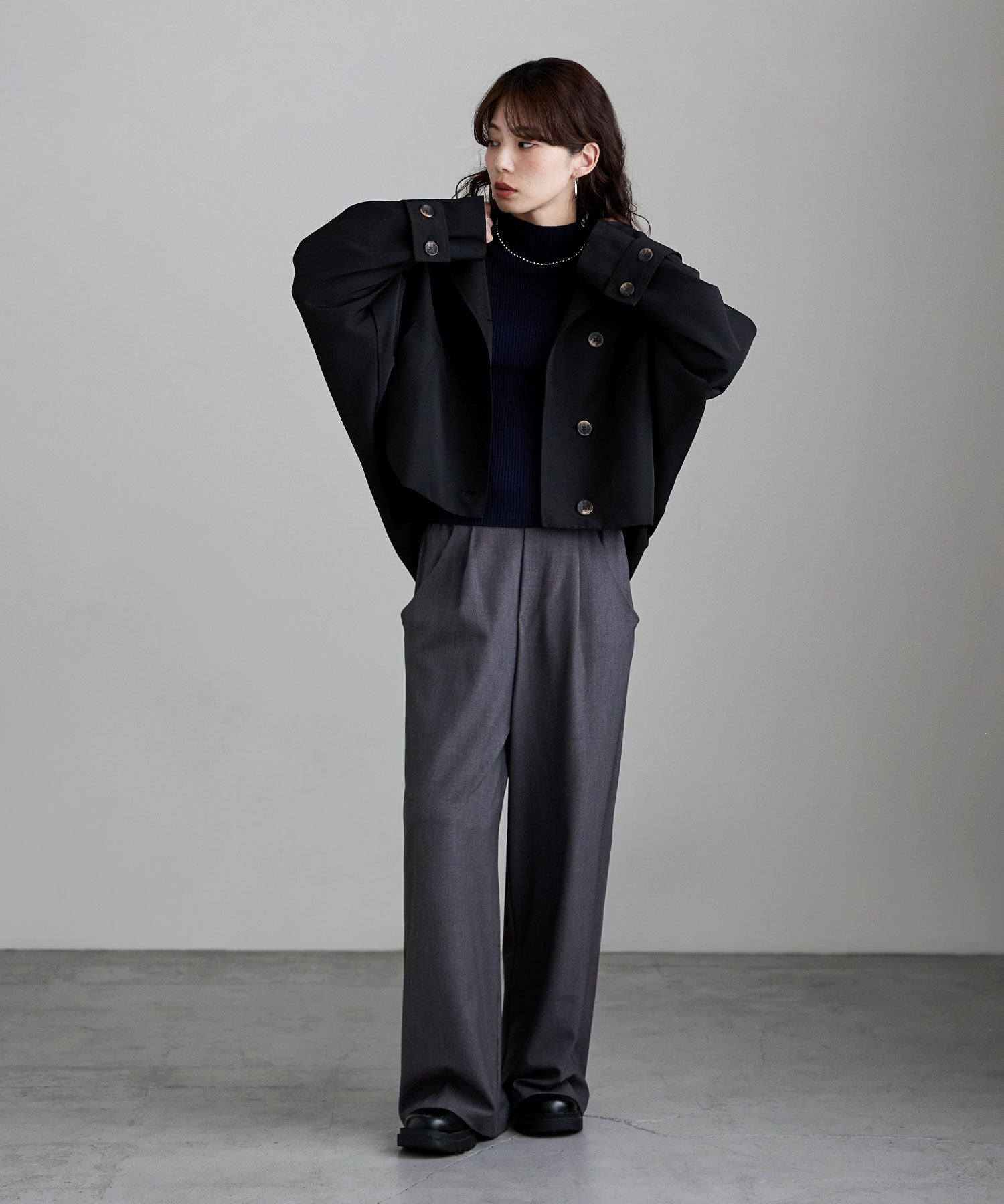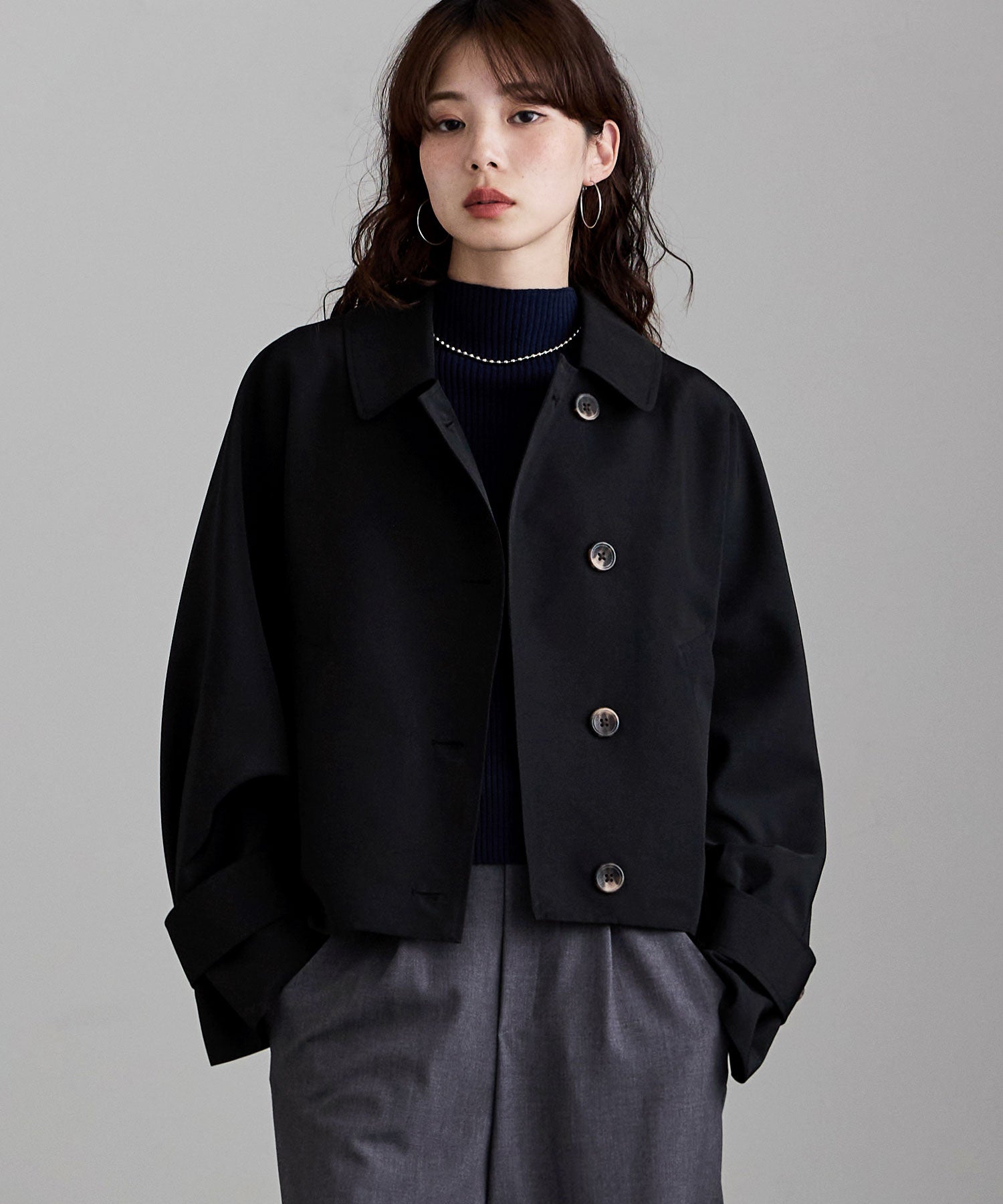 ステンカラーとシングルボタンの組み合わせが、クラシカルでマニッシュな雰囲気ながらも、